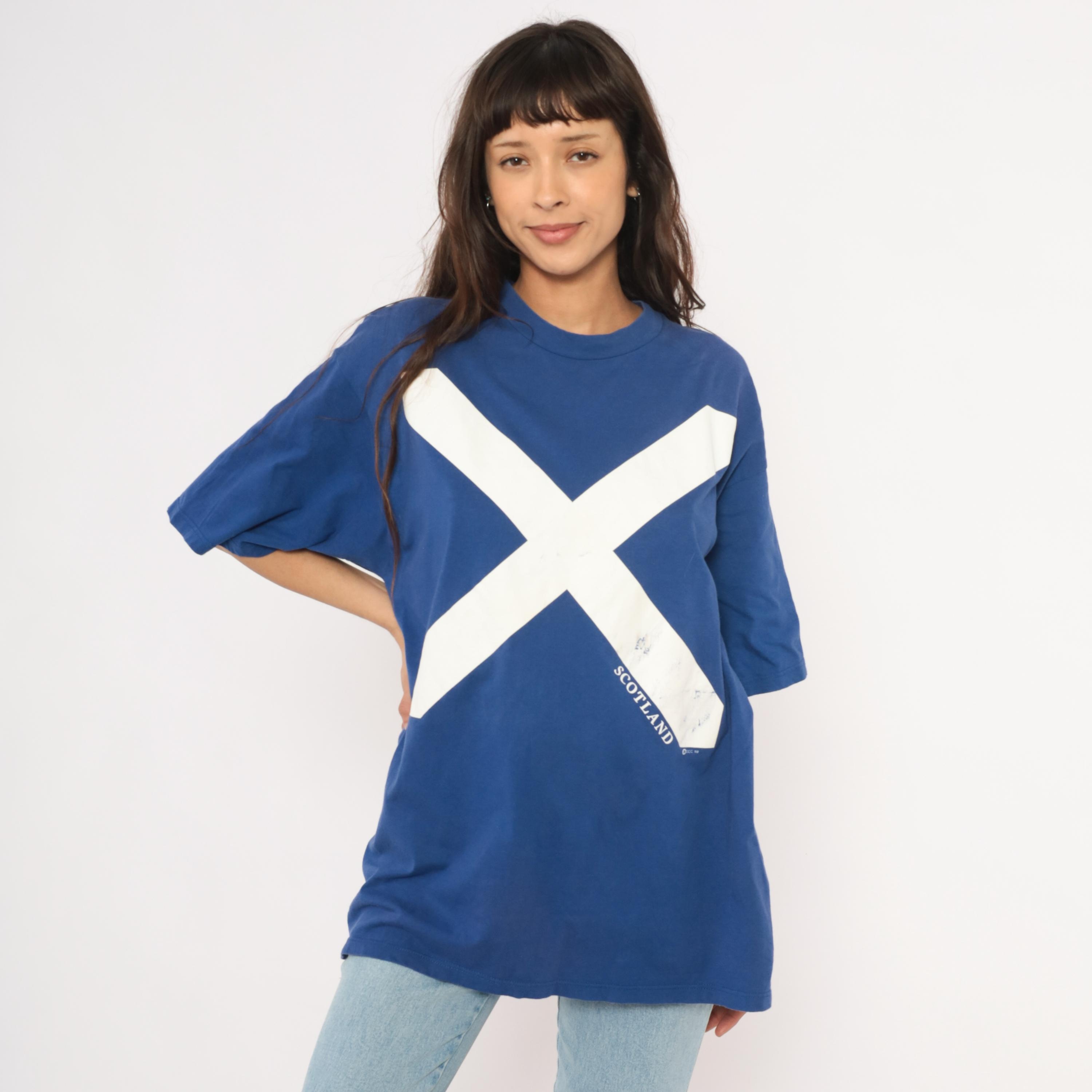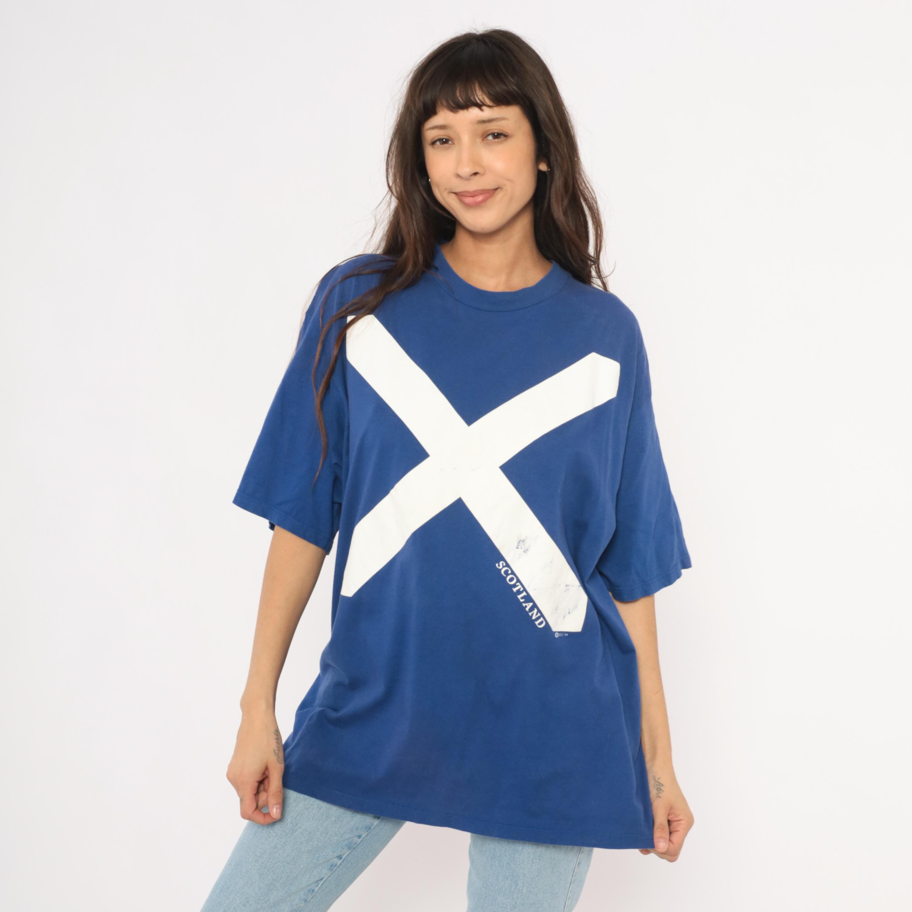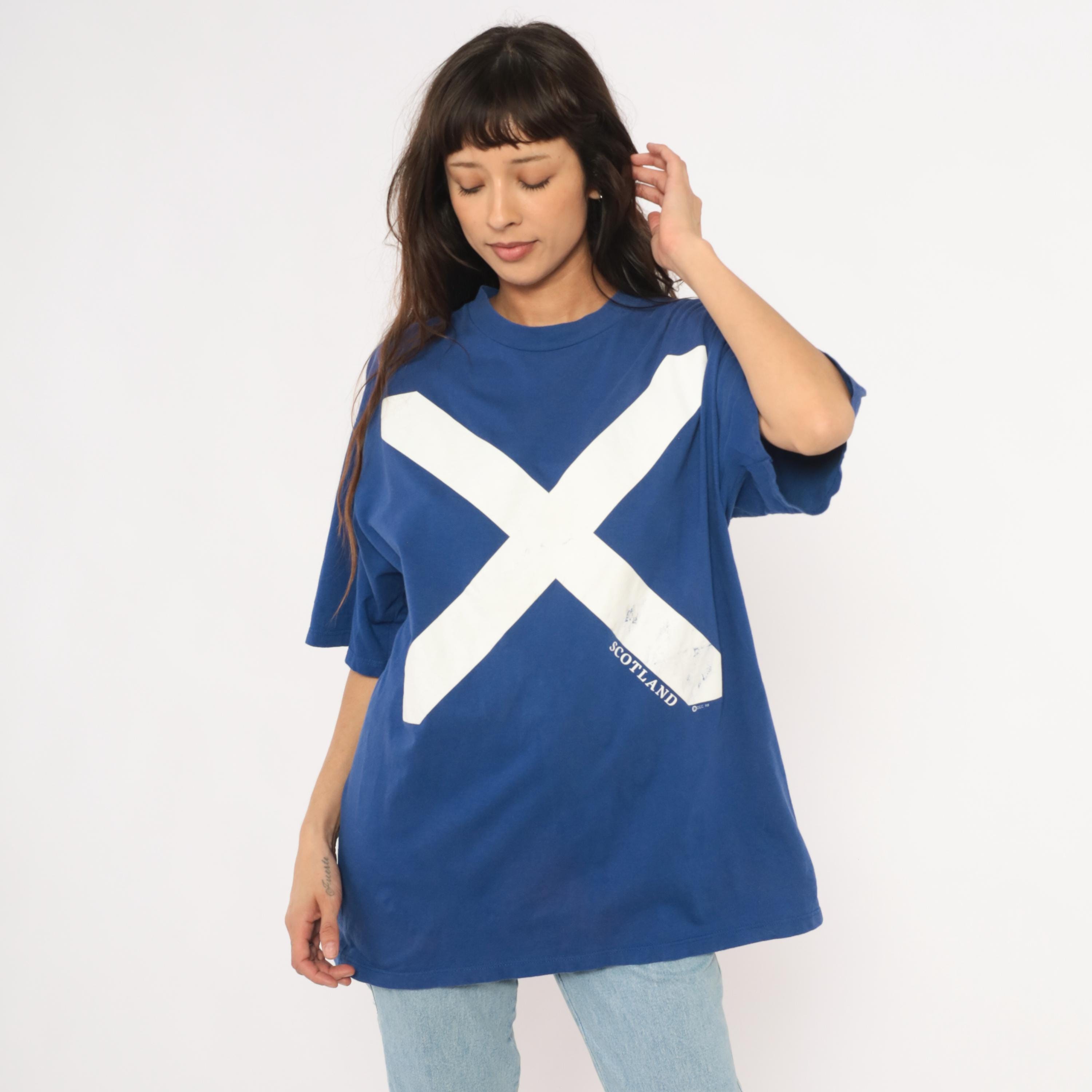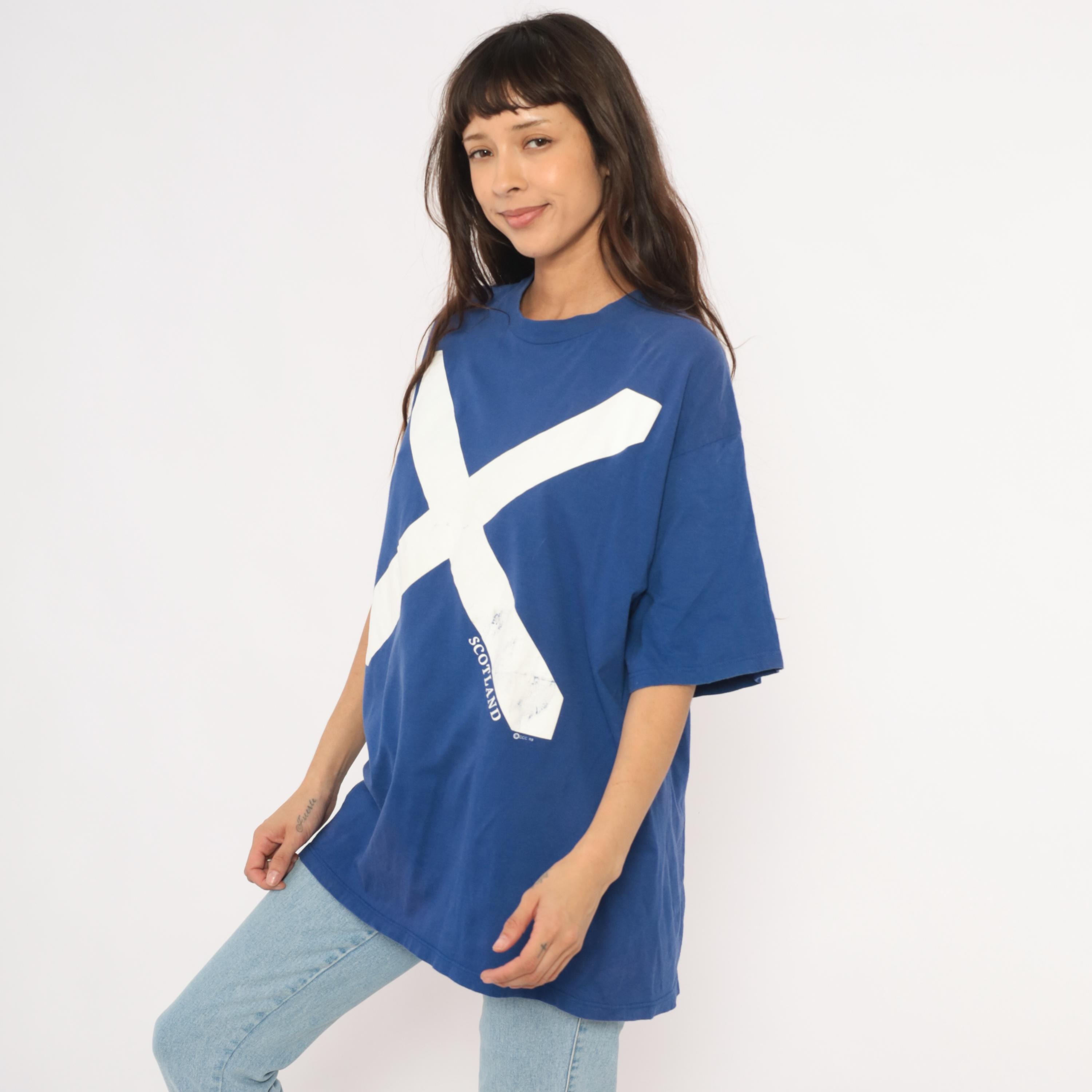 90s cobalt blue graphic tee from Jerzees with a large white saltire cross printed across the front, representing the Scottish flag. "SCOTLAND" text printed along the lower right diagonal of the cross. Crew neck, short sleeves, and a boxy relaxed silhouette with a plain back.