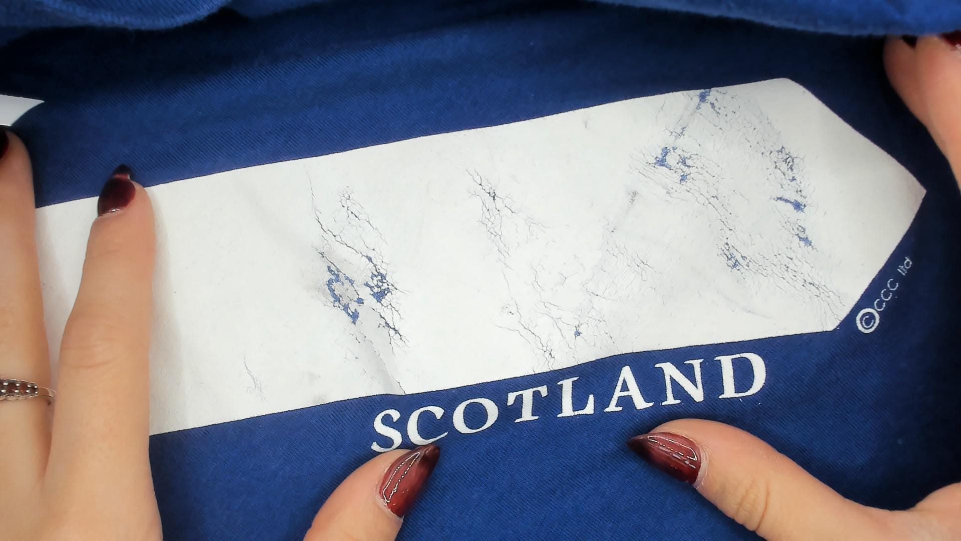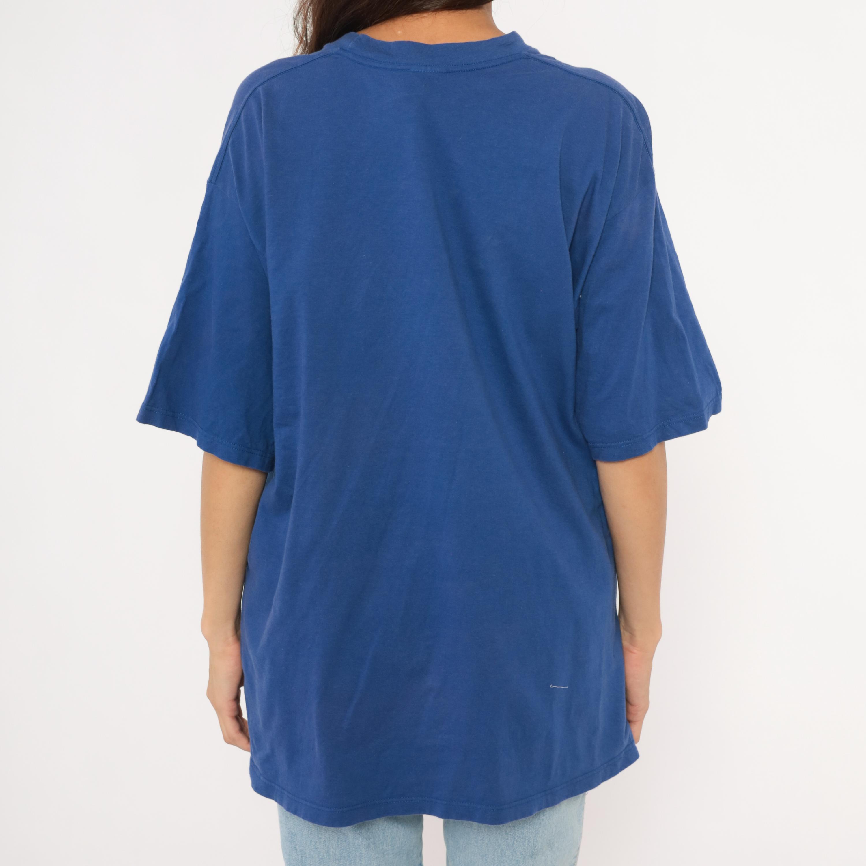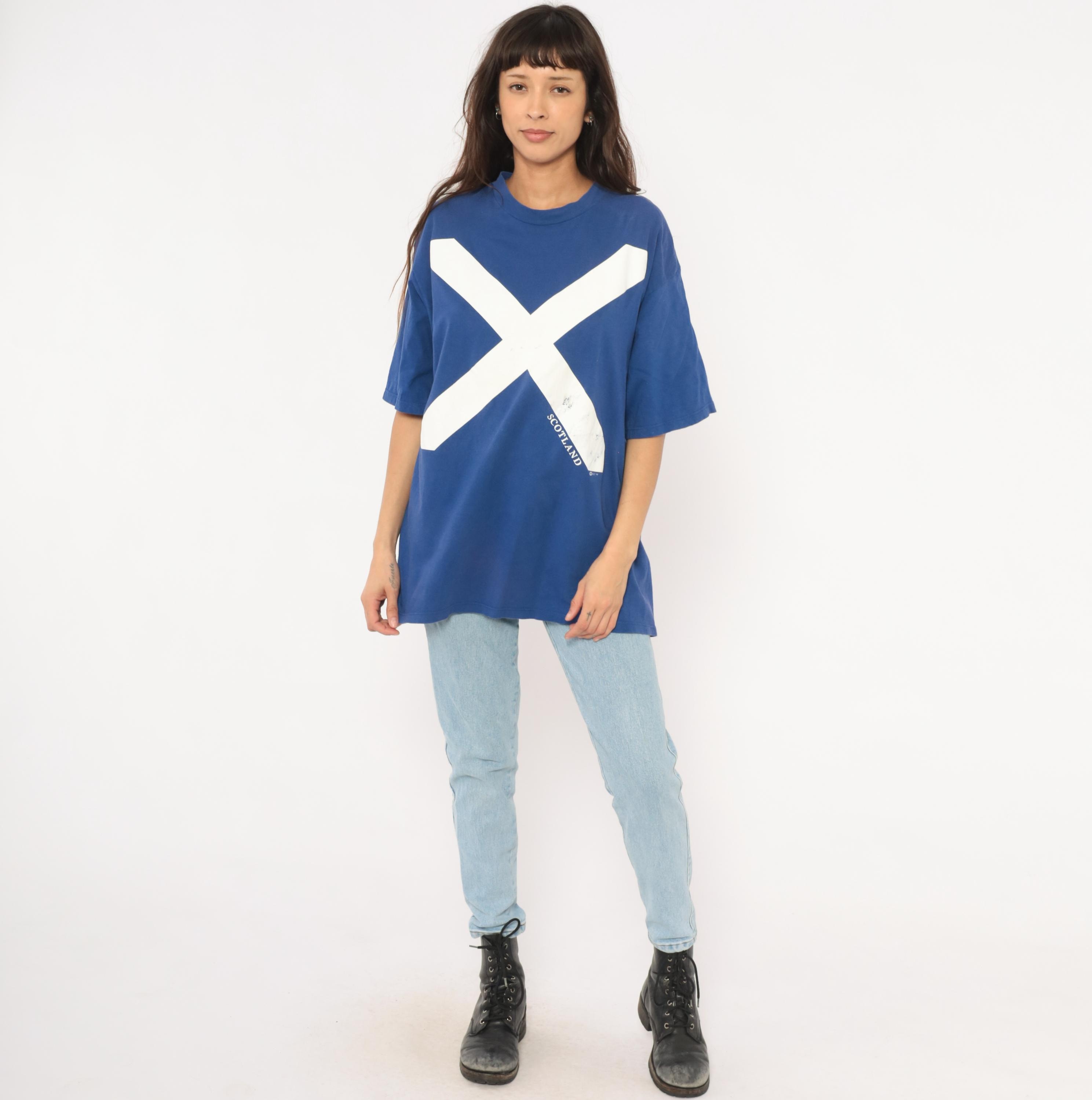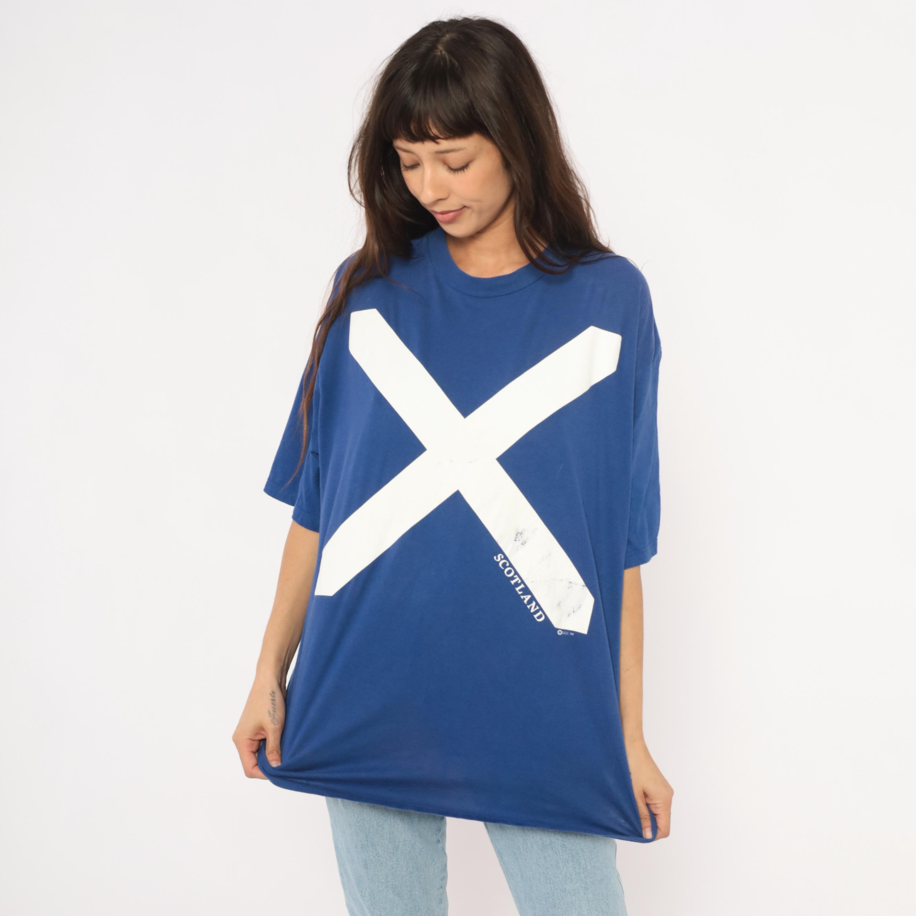 90s cobalt blue graphic tee from Jerzees with a large white saltire cross printed across the front, representing the Scottish flag. "SCOTLAND" text printed along the lower right diagonal of the cross. Crew neck, short sleeves, and a boxy relaxed silhouette with a plain back.