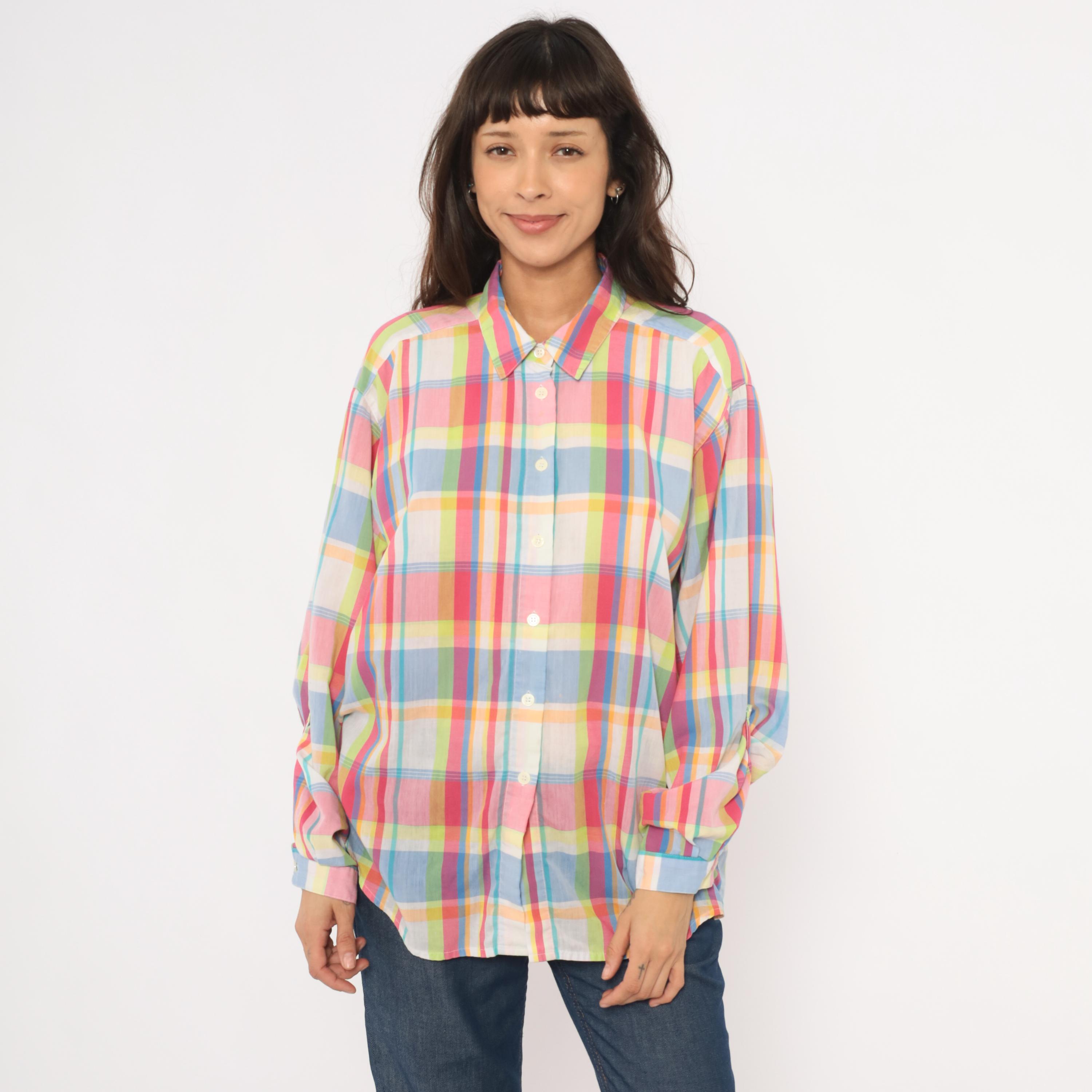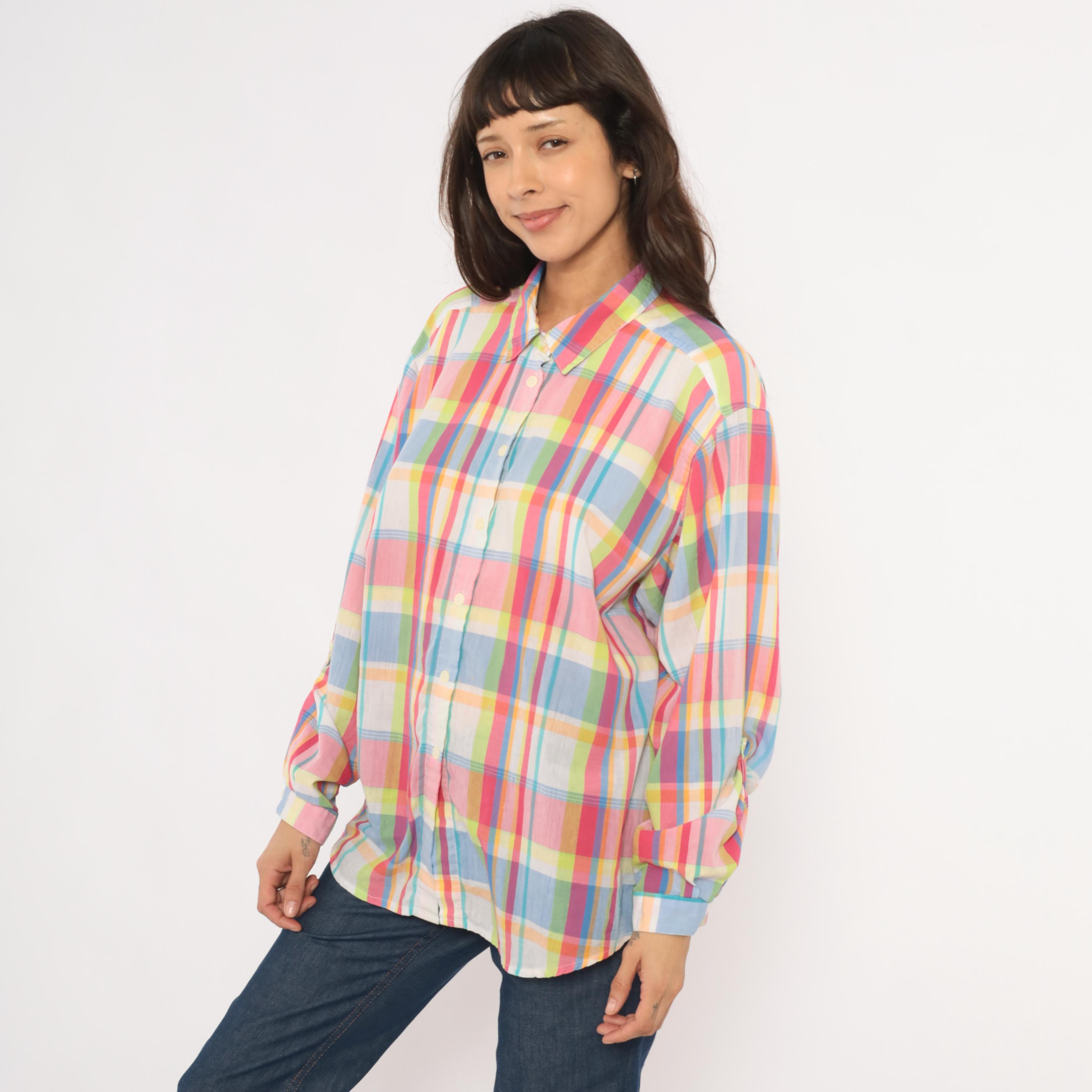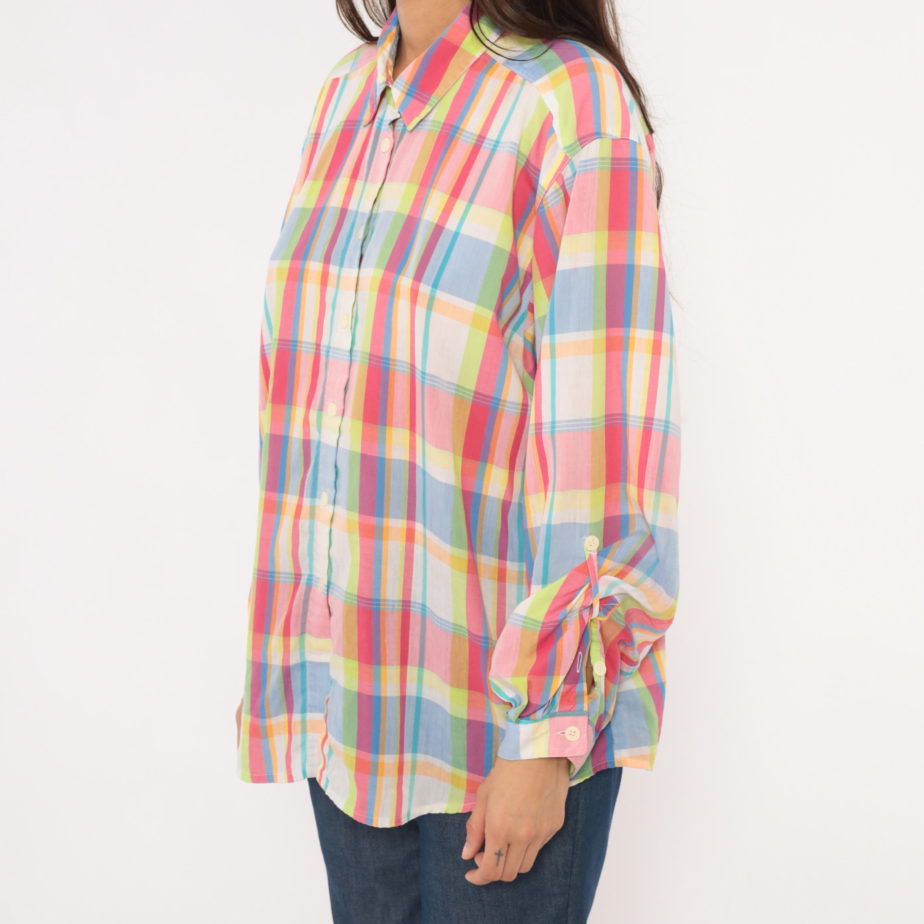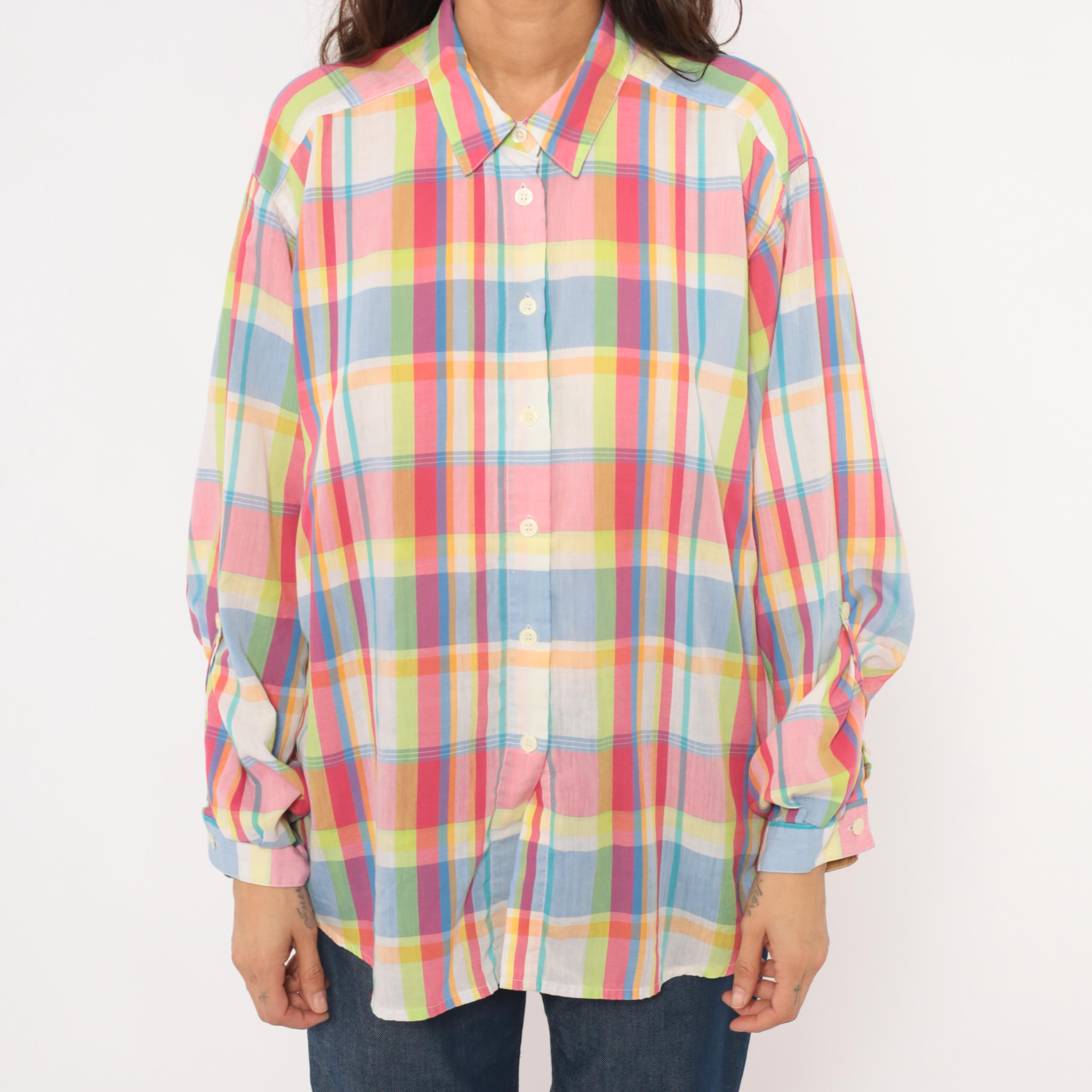 90s rainbow madras plaid button front shirt from Koret Francisca with pink, blue, yellow, and green check pattern. Pointed collar, front button closure, and long sleeves with button cuffs. Semi-sheer cotton-blend fabric in a relaxed fit with no pockets.