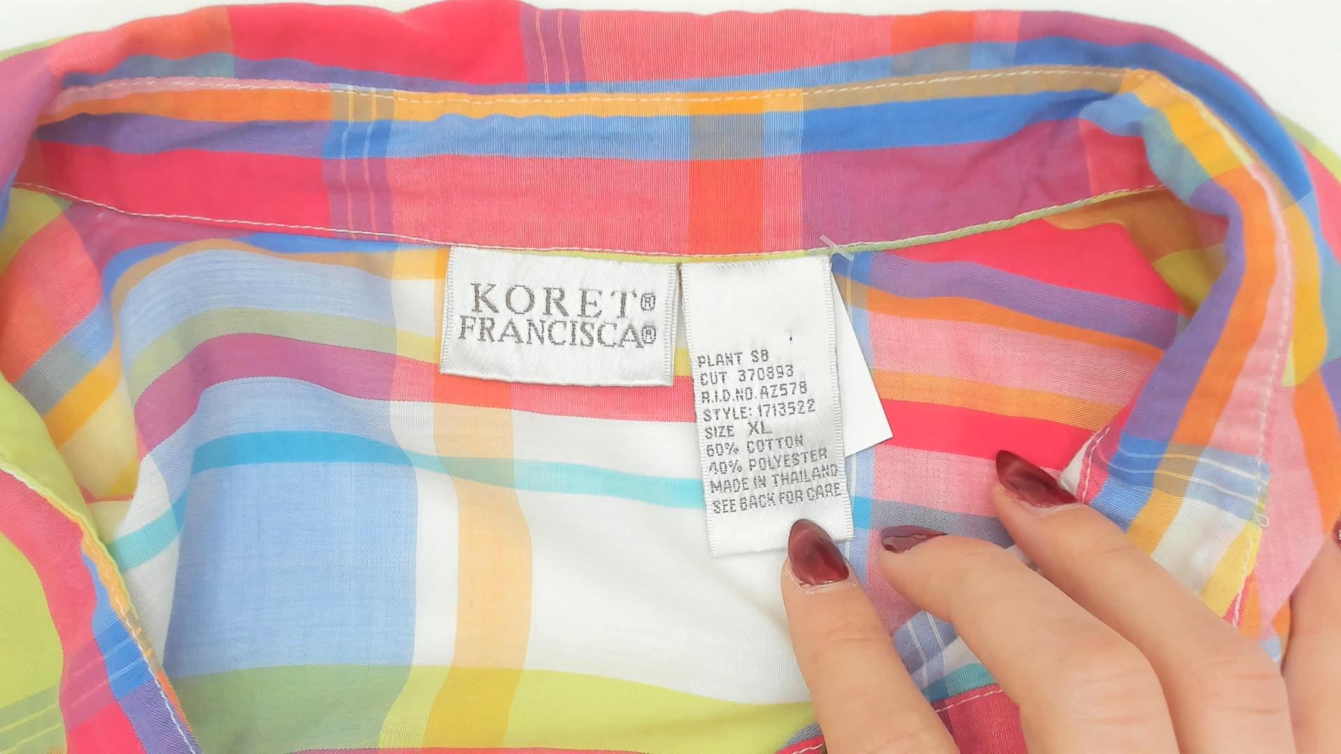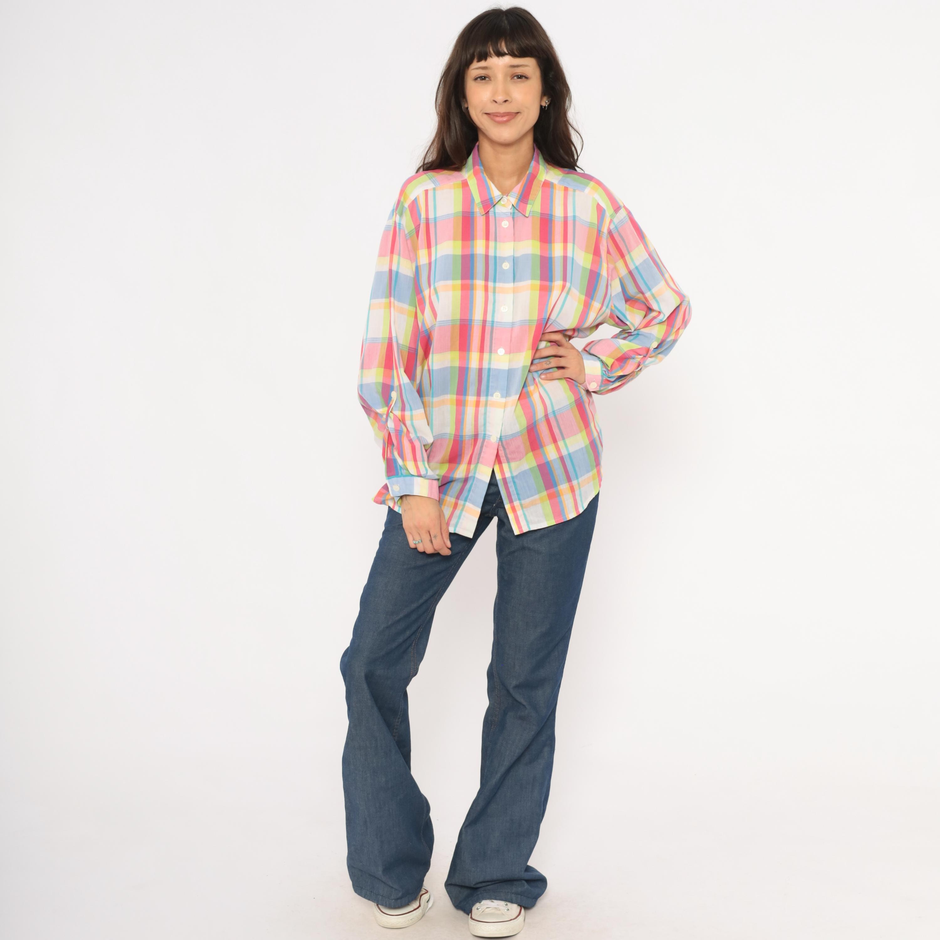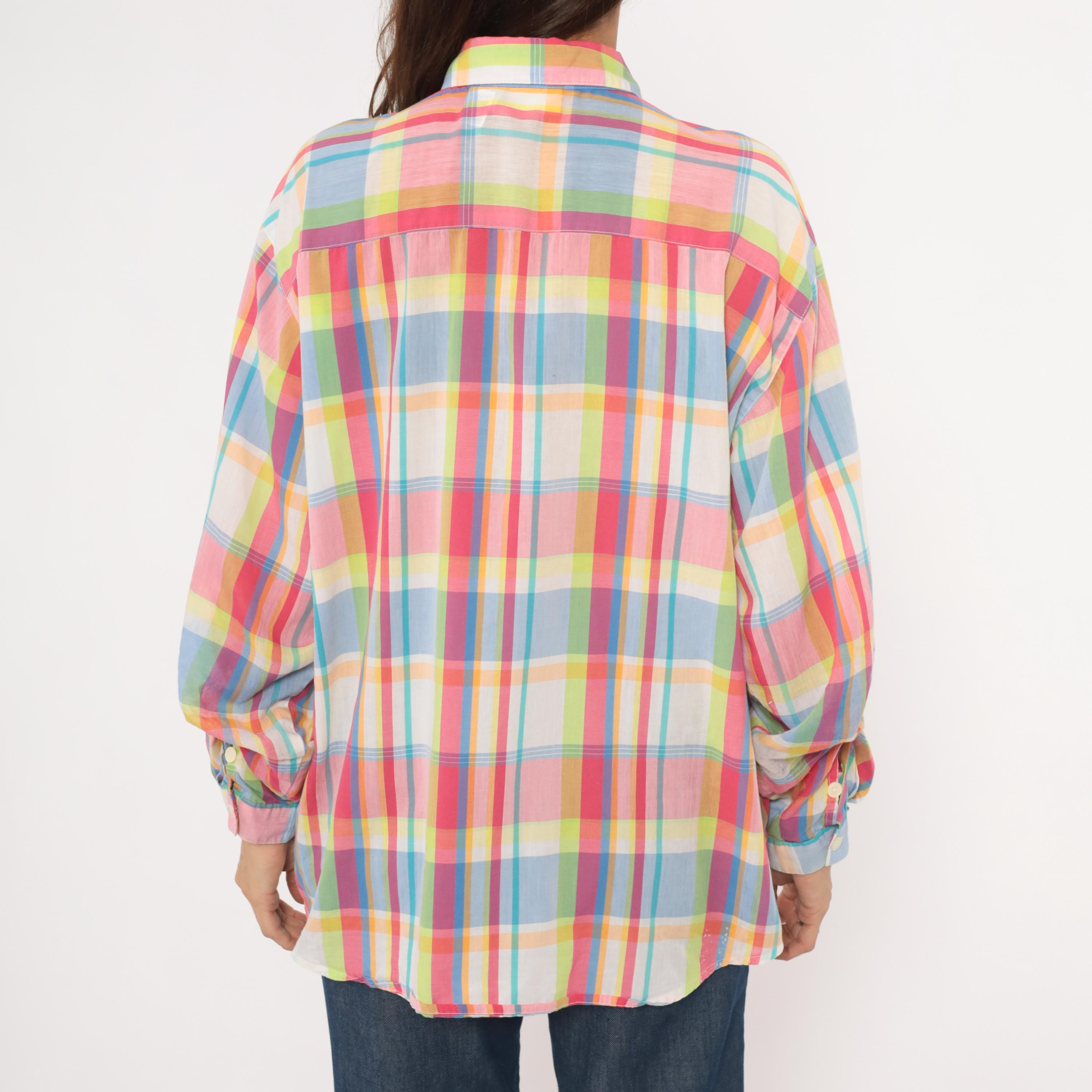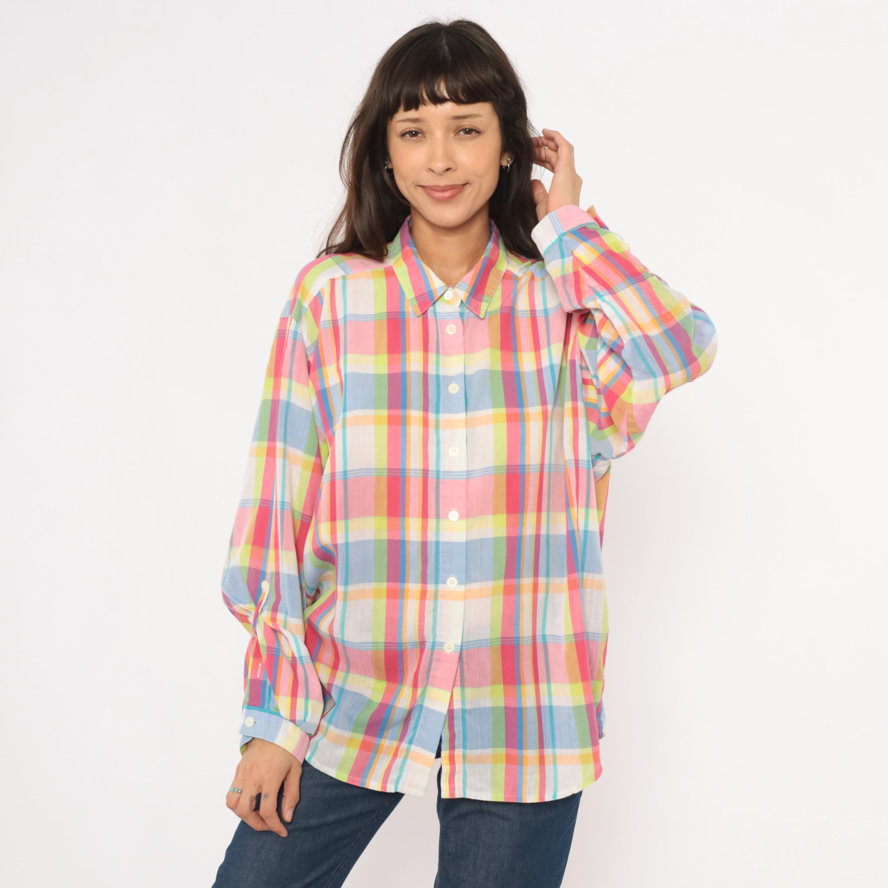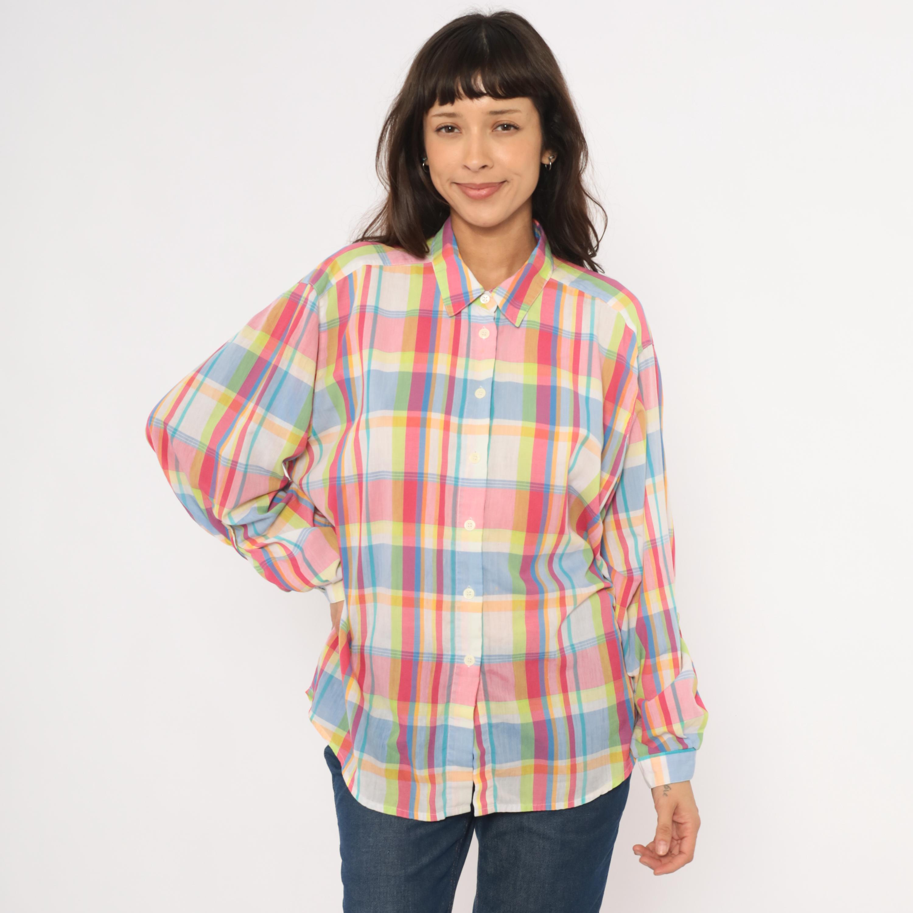 90s rainbow madras plaid button front shirt from Koret Francisca with pink, blue, yellow, and green check pattern. Pointed collar, front button closure, and long sleeves with button cuffs. Semi-sheer cotton-blend fabric in a relaxed fit with no pockets.