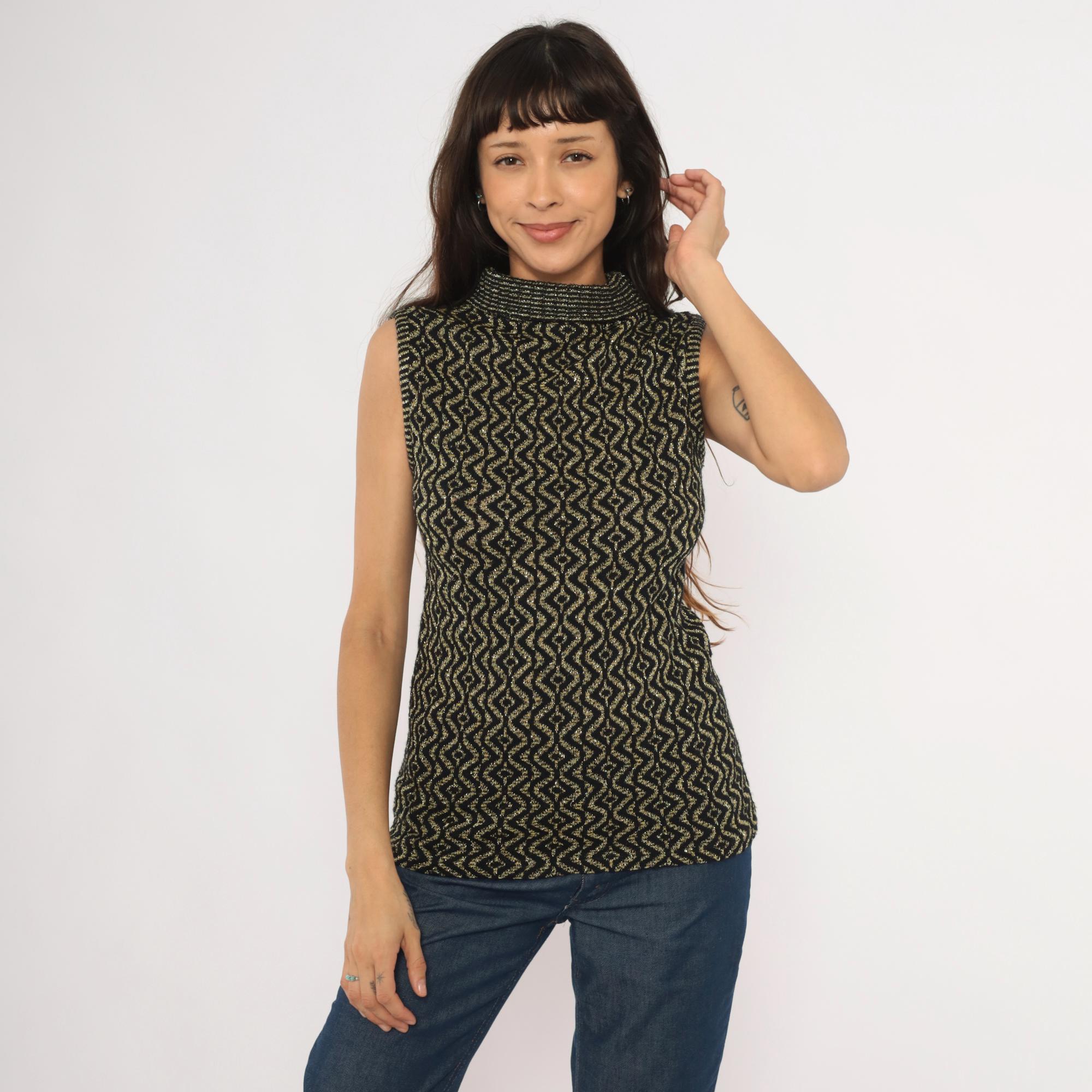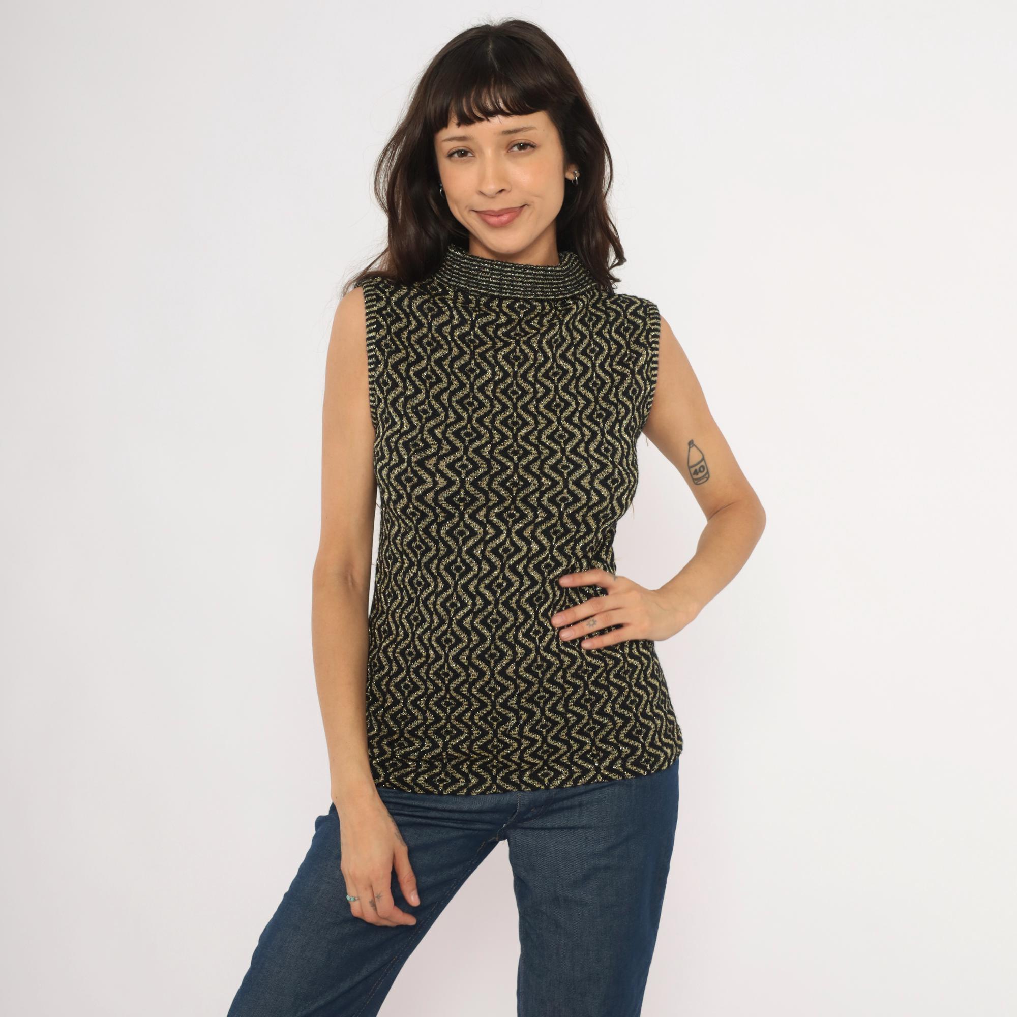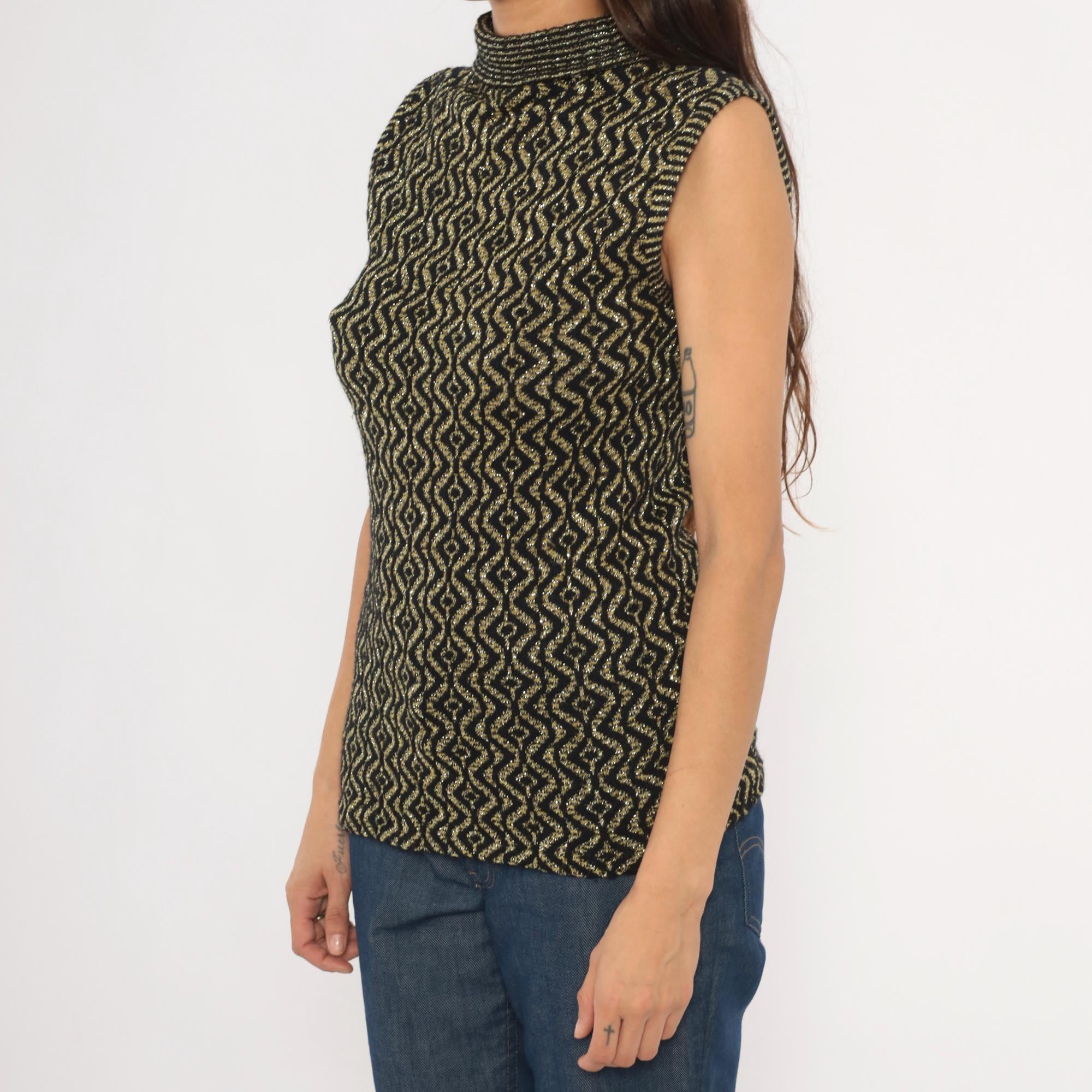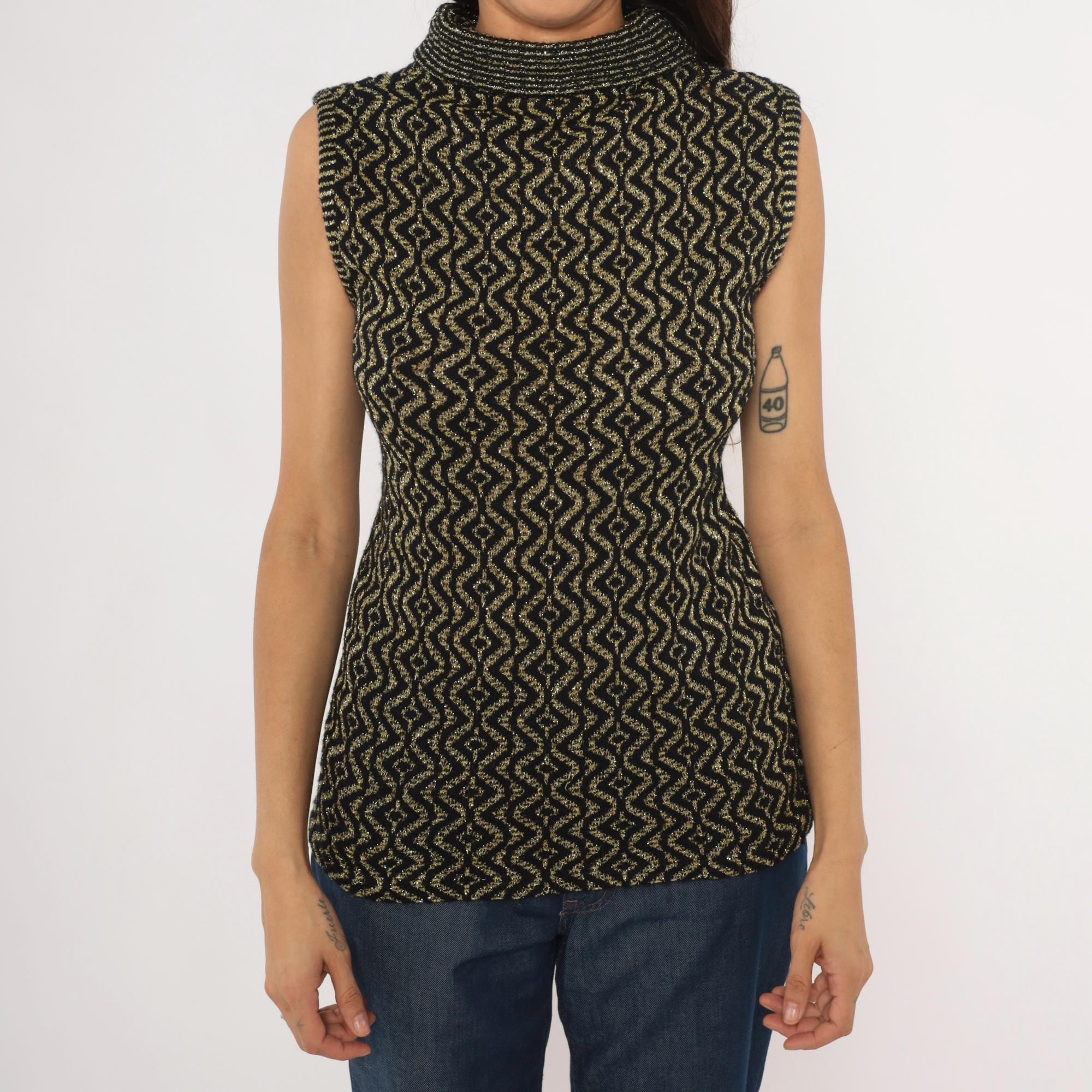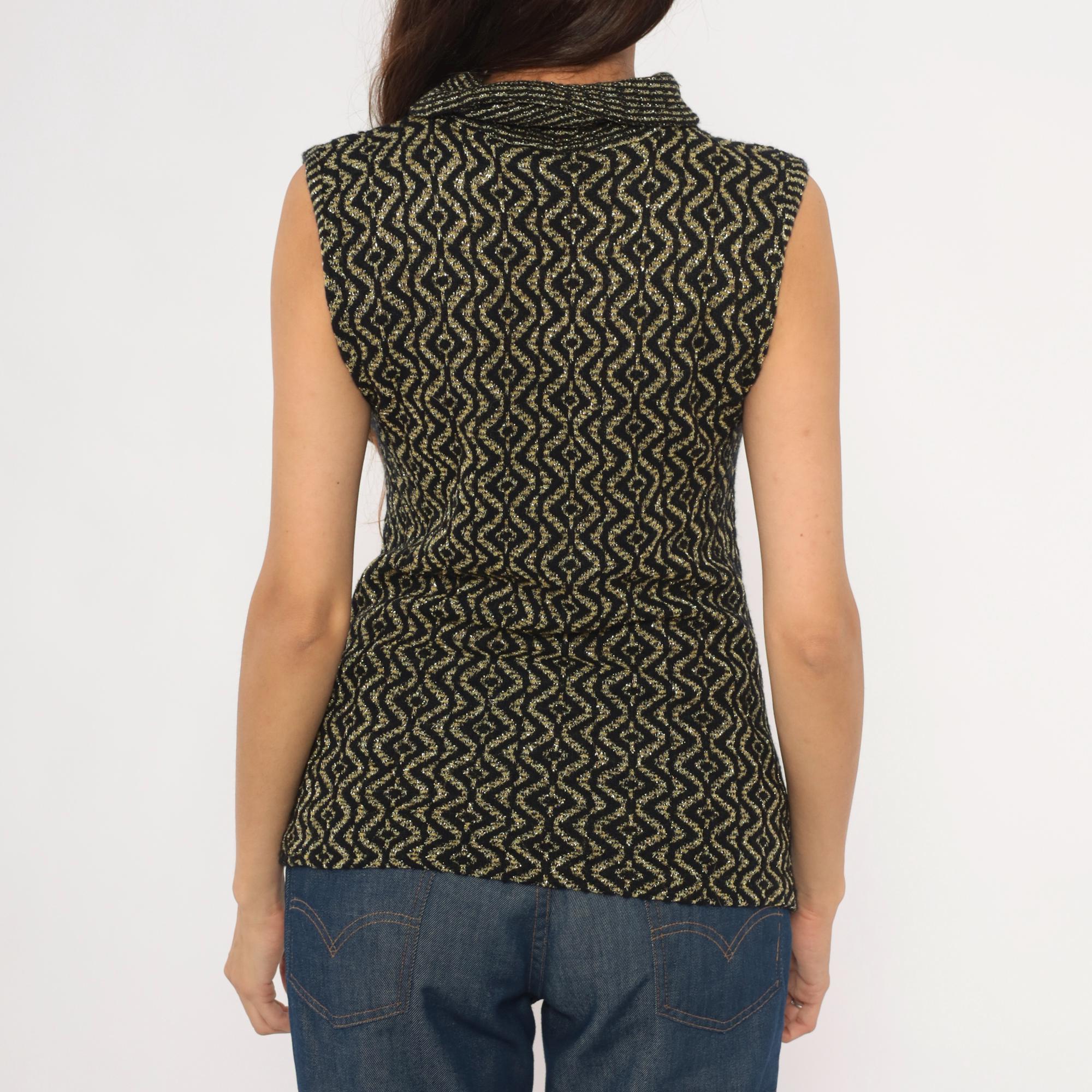 90s sleeveless mock neck knit top in black with an allover gold metallic geometric diamond and wave pattern. Fitted pullover silhouette with a ribbed rolled turtleneck collar and ribbed armhole trim.