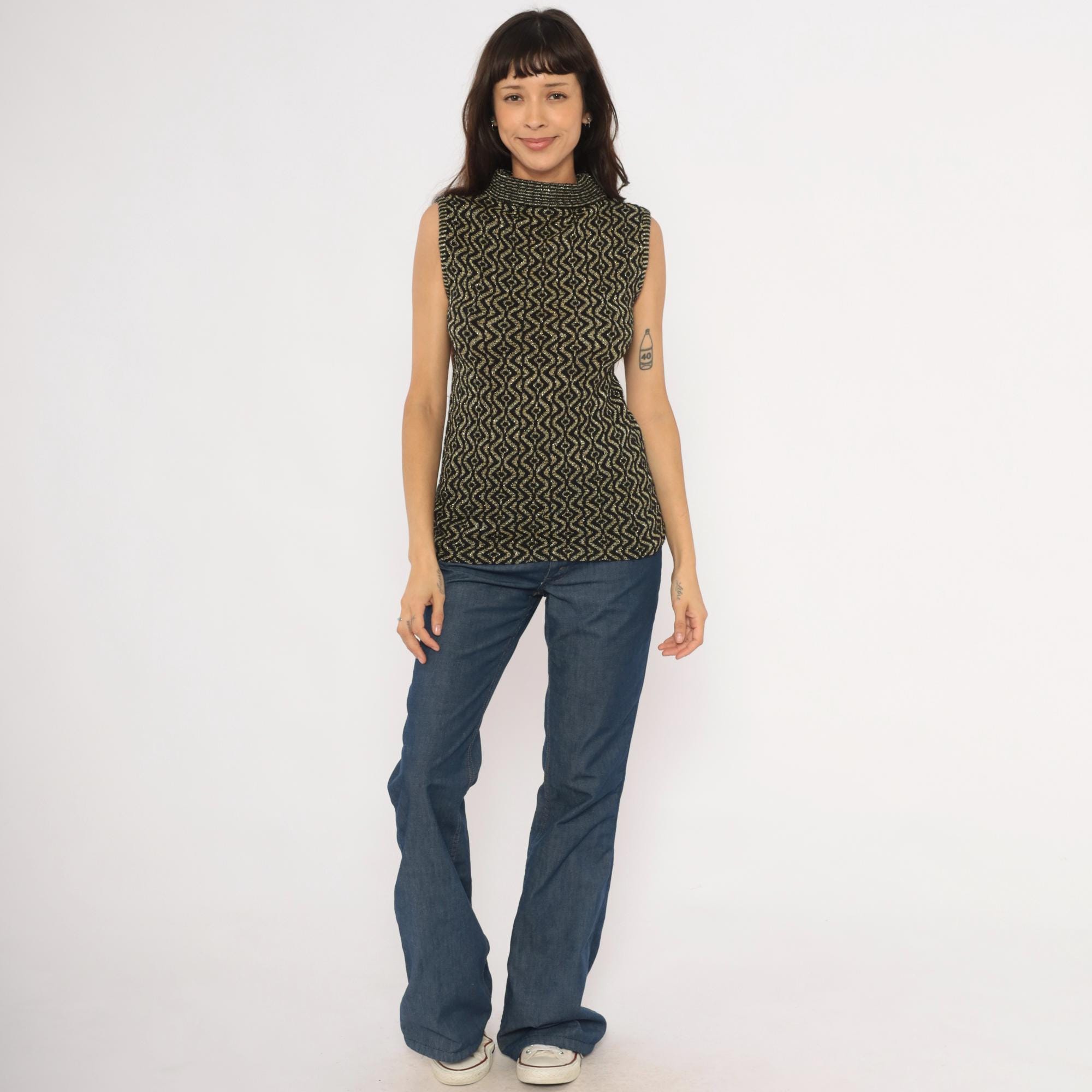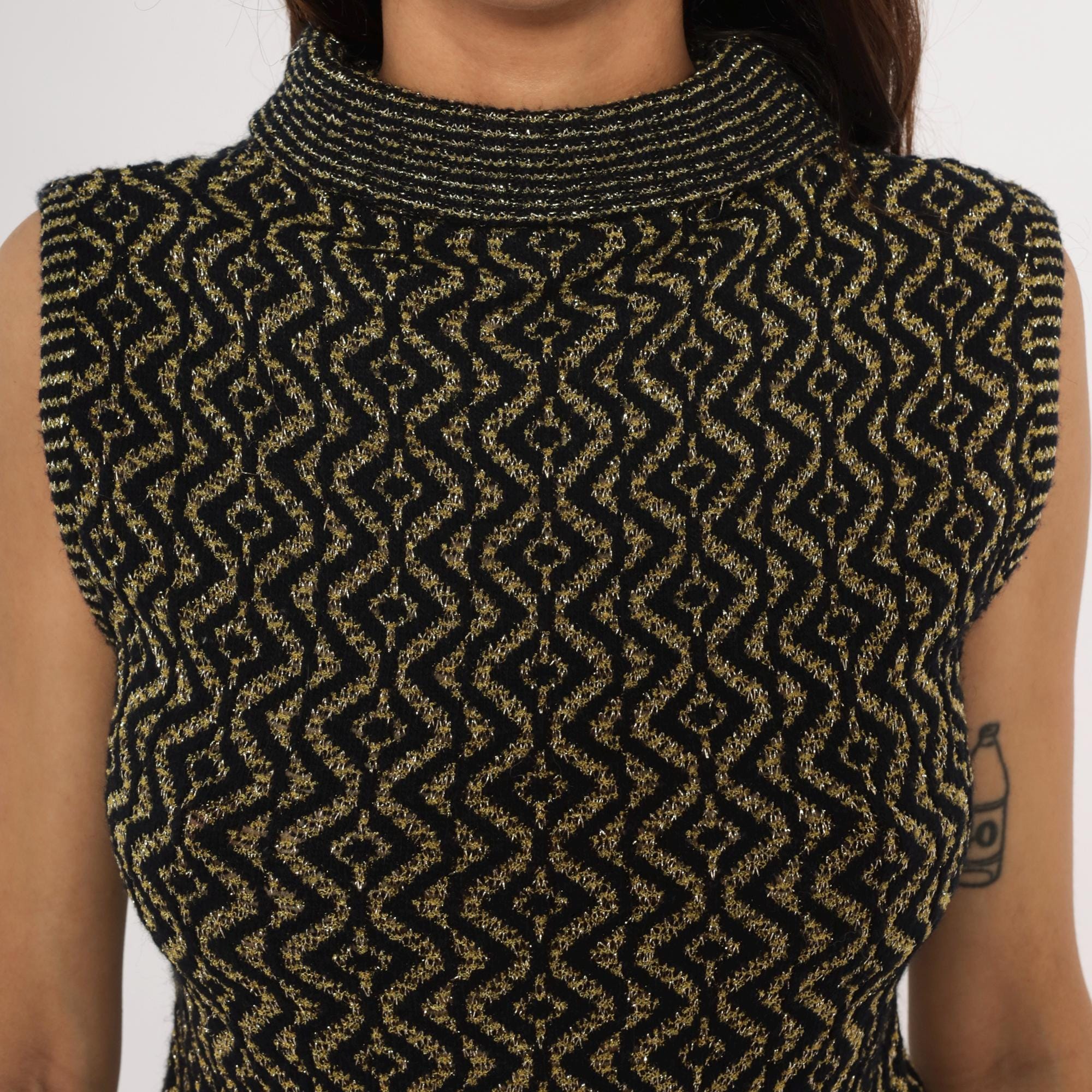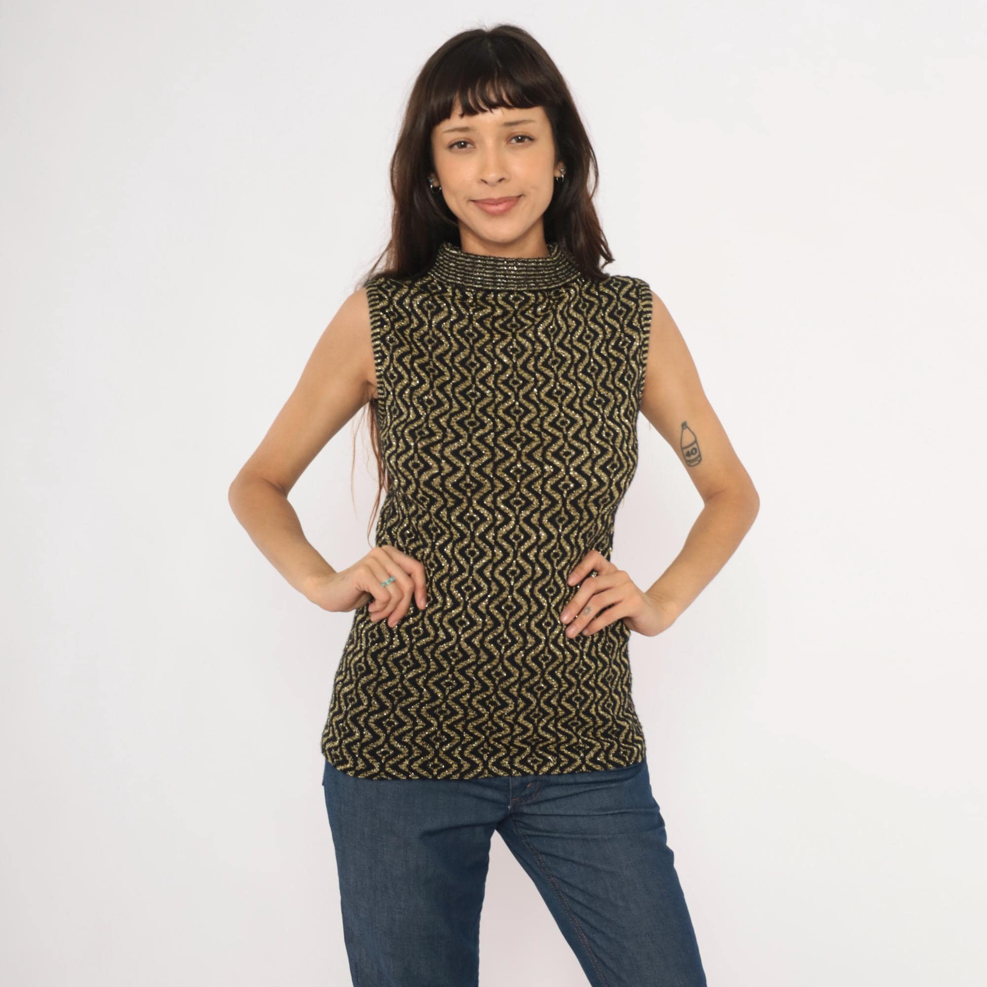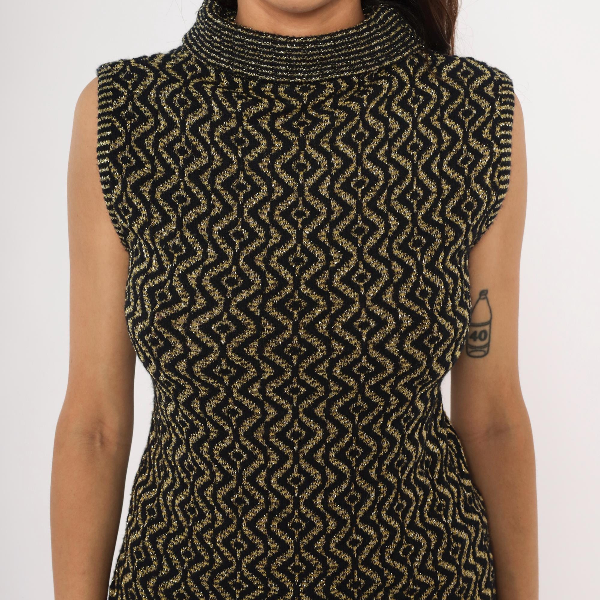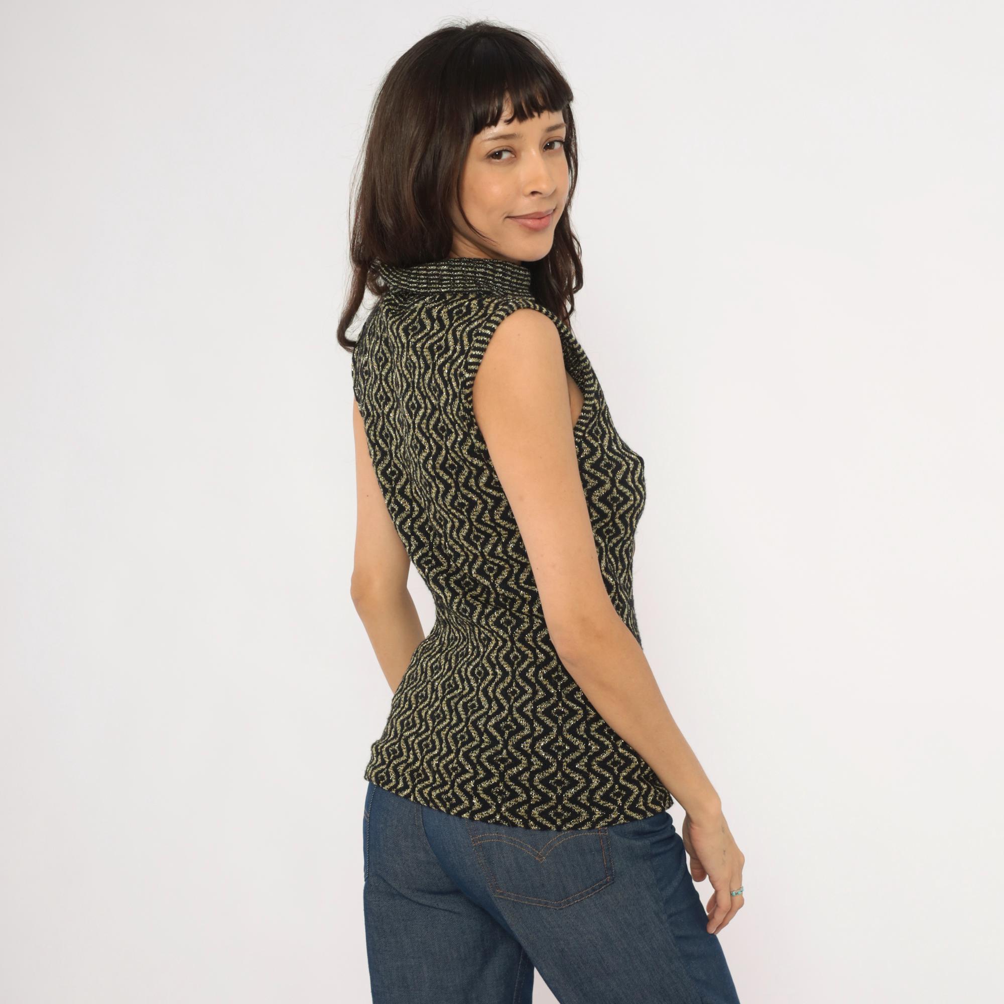 90s sleeveless mock neck knit top in black with an allover gold metallic geometric diamond and wave pattern. Fitted pullover silhouette with a ribbed rolled turtleneck collar and ribbed armhole trim.