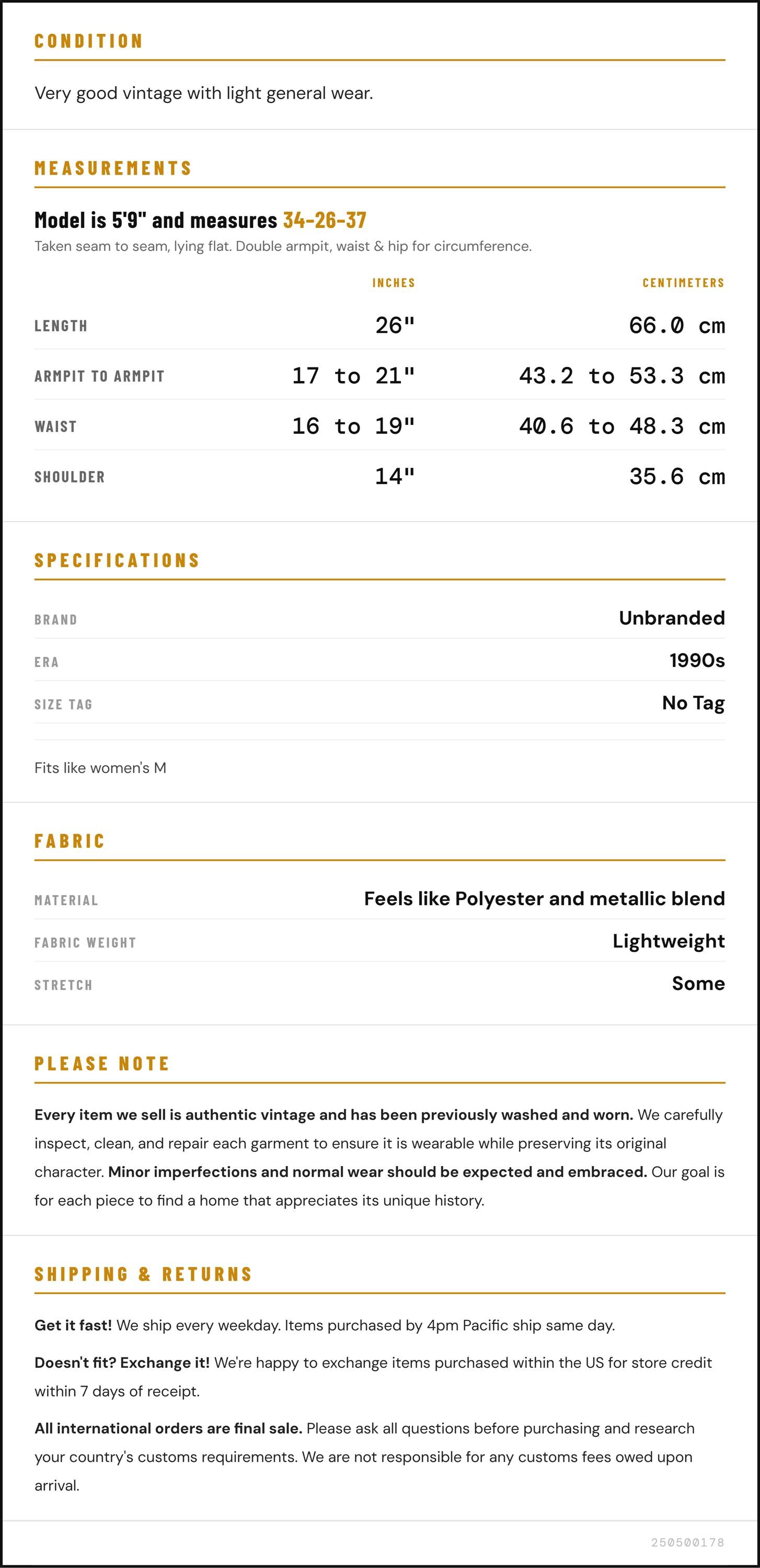 Measurements are taken laying flat and should be doubled where applicable. The "best fits" size is just an estimate, and vintage sizing can vary from modern sizing. Please use measurements to ensure proper fit. The best thing to do is measure a similar item of your own, and compare. When an item has stretch, we will list the unstretched dimensions with the stretched measurement afterwards.