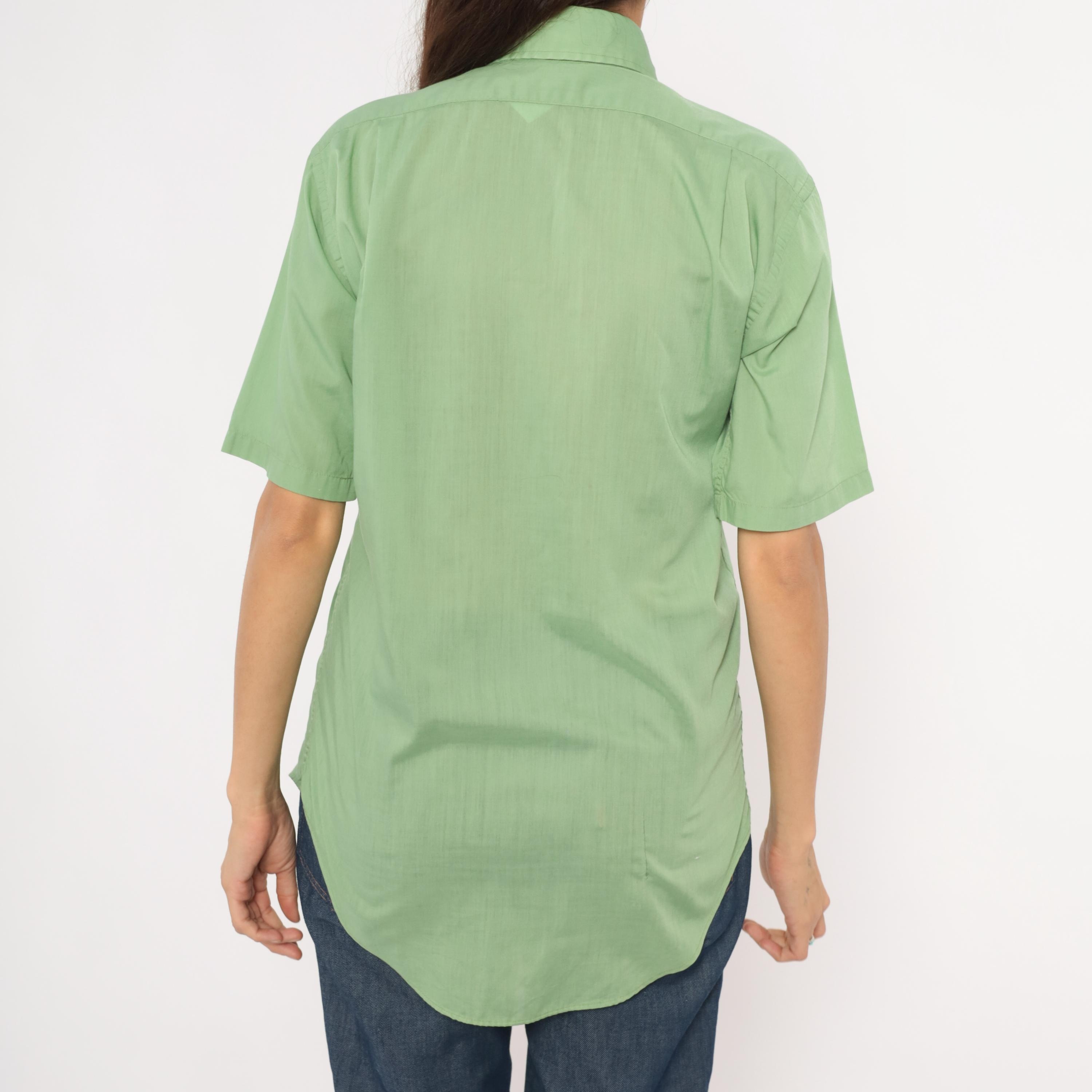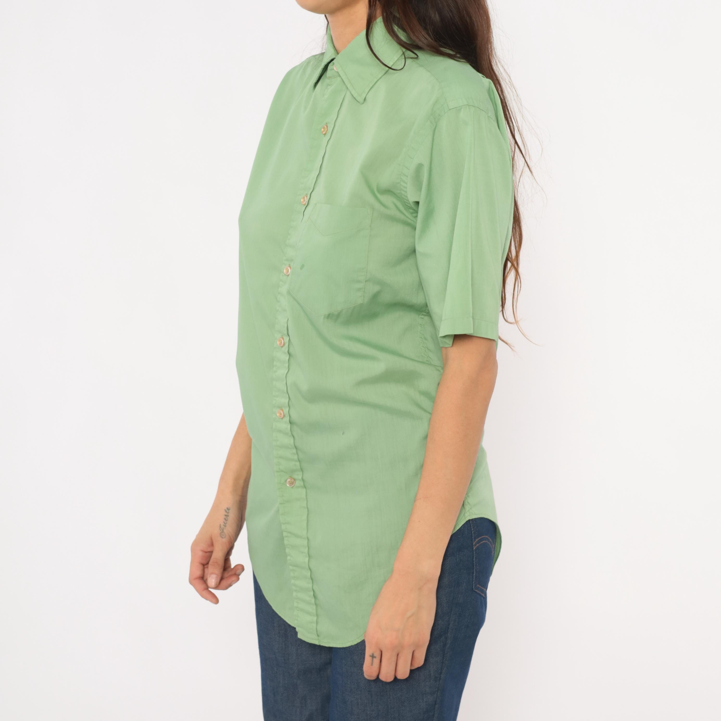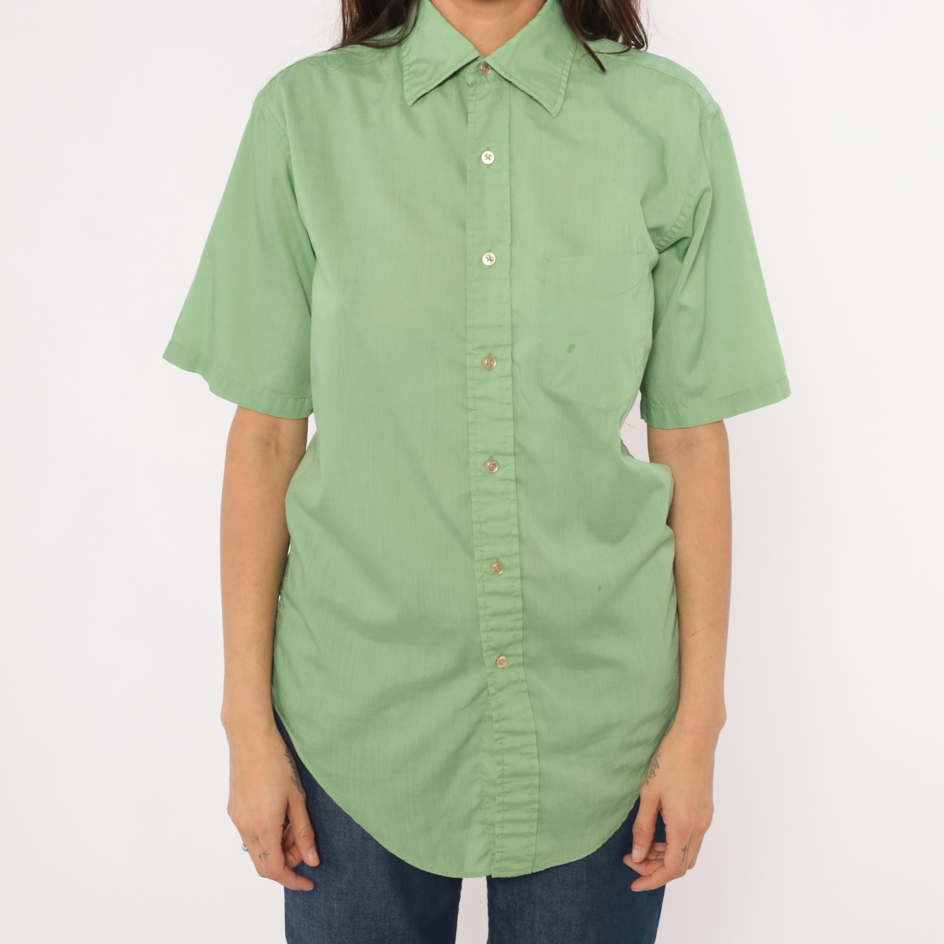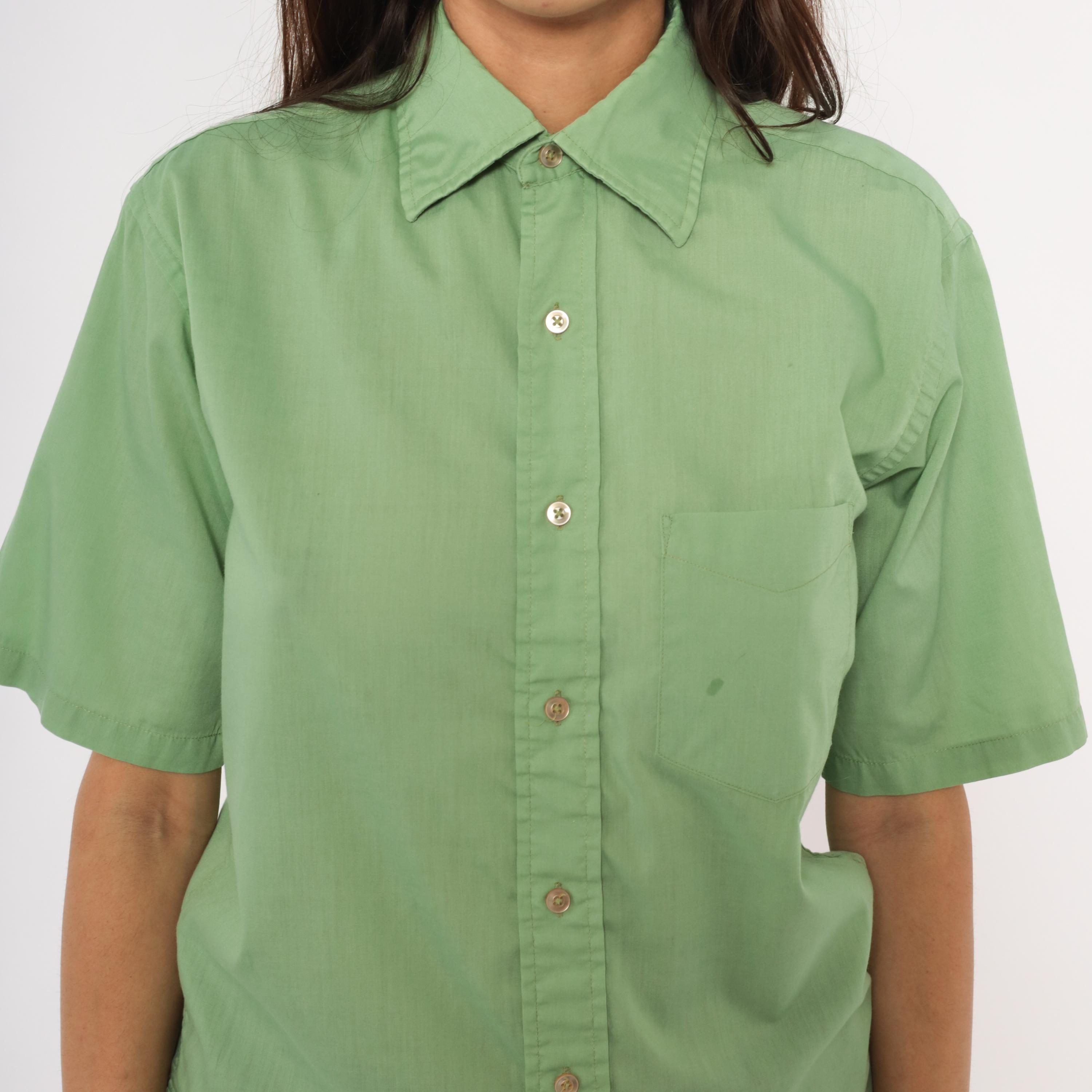 70s sage green short sleeve button-down shirt from Mossini with a pointed collar and full button front closure. Single chest pocket on the left side, with a relaxed straight body and curved hem. Olive and moss tones throughout with a smooth, matte finish.