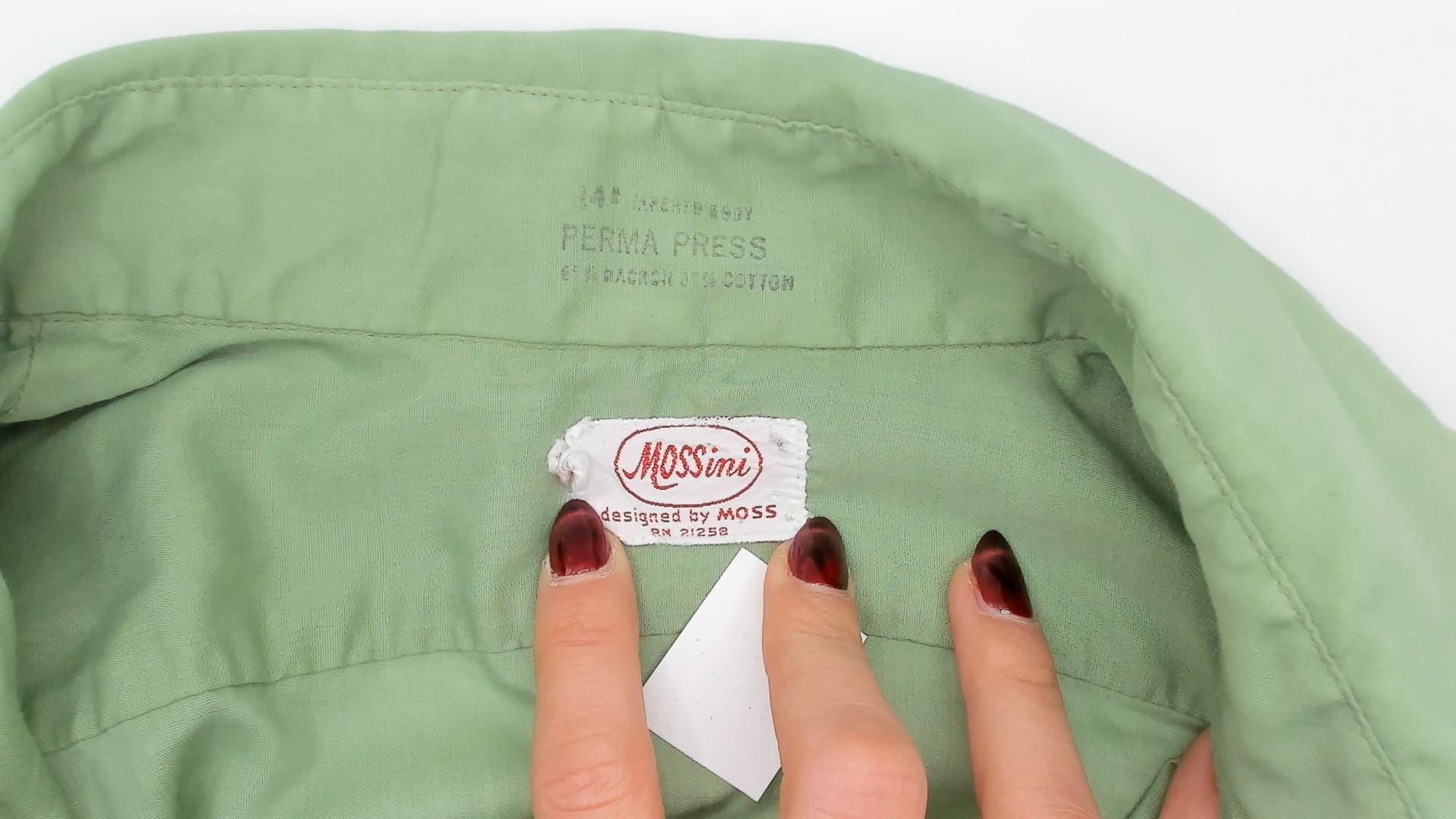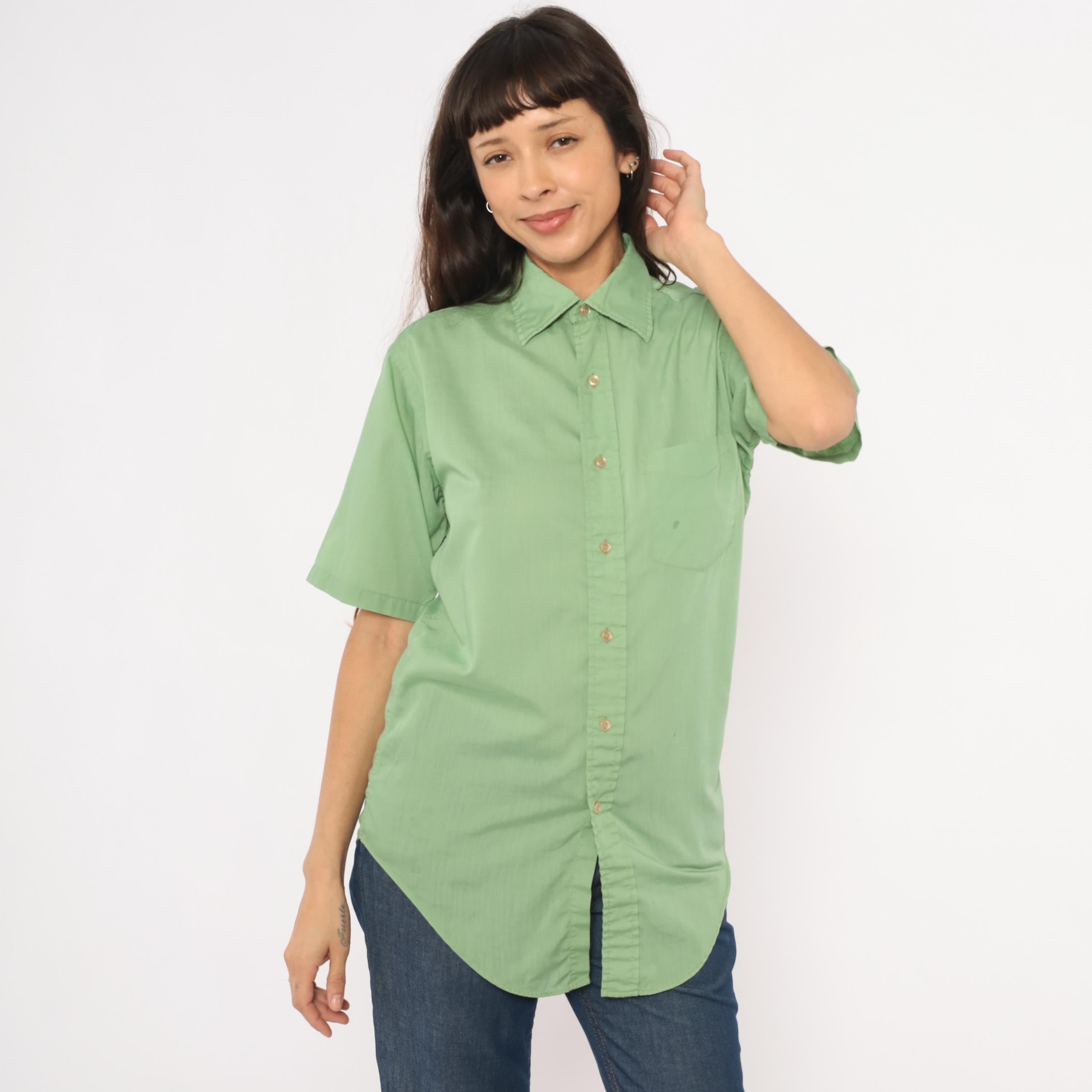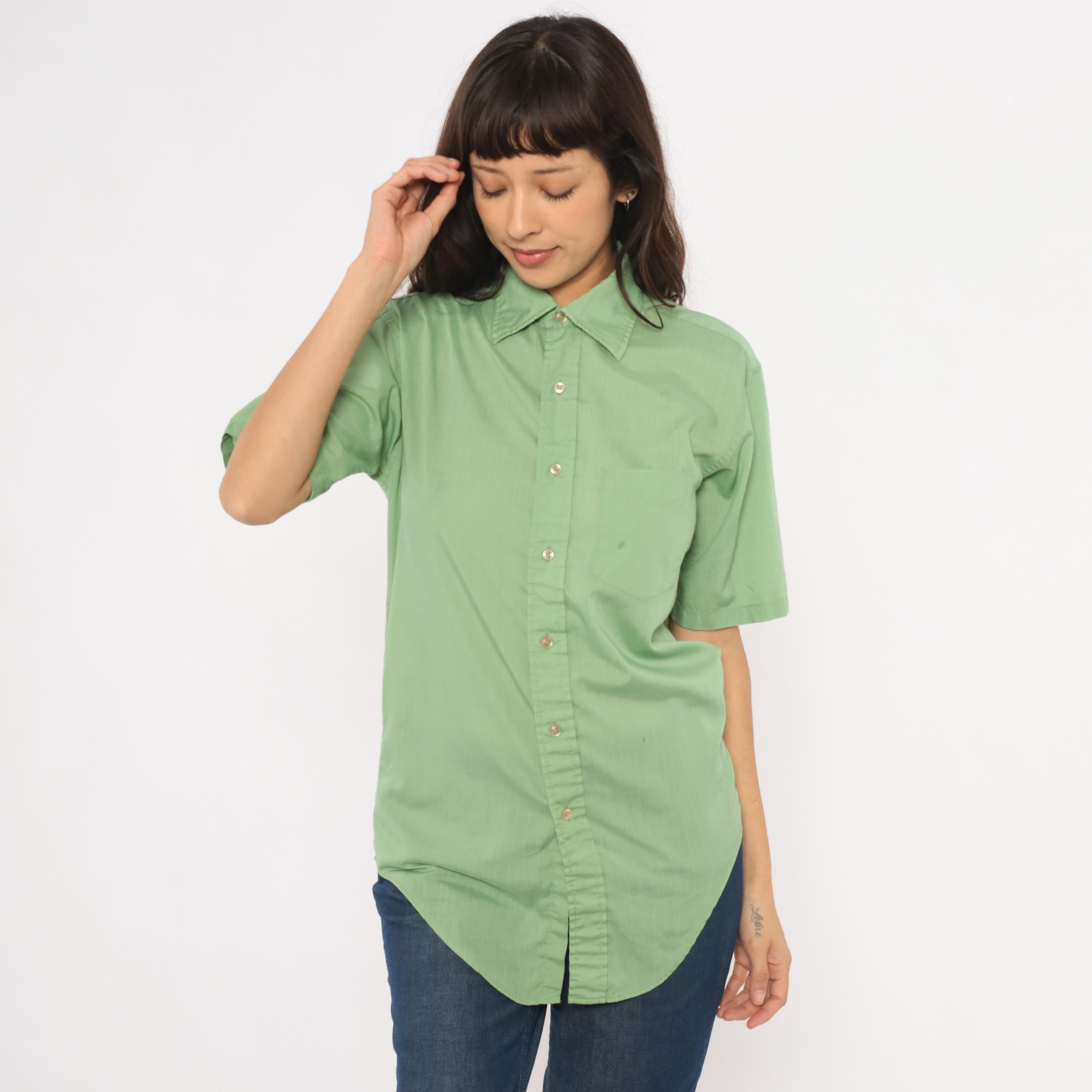 70s sage green short sleeve button-down shirt from Mossini with a pointed collar and full button front closure. Single chest pocket on the left side, with a relaxed straight body and curved hem. Olive and moss tones throughout with a smooth, matte finish.