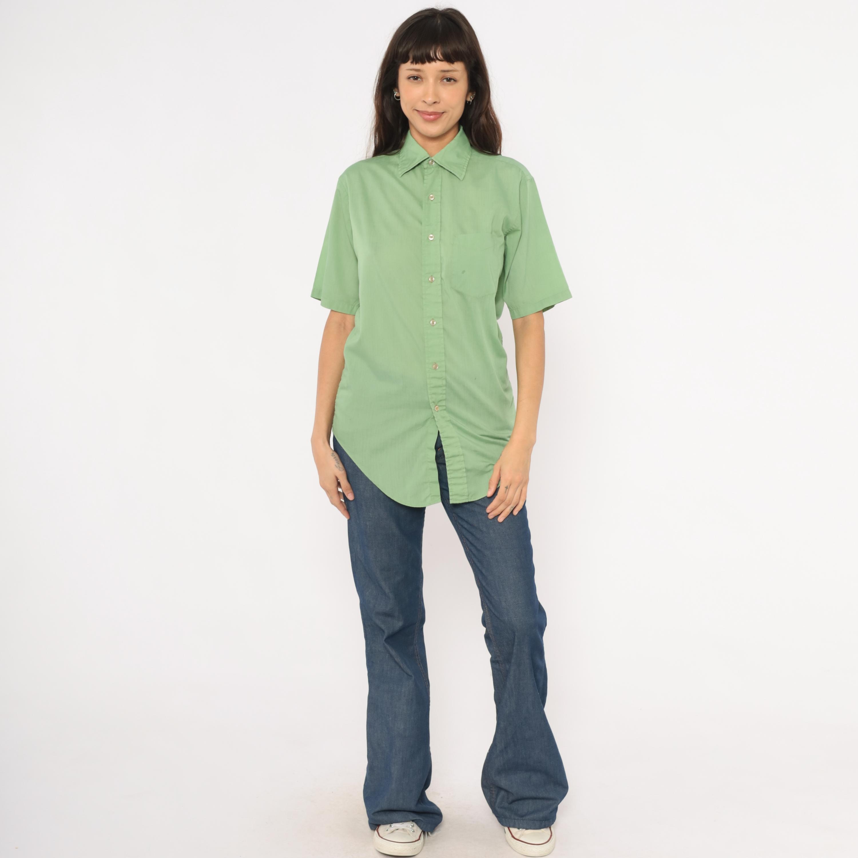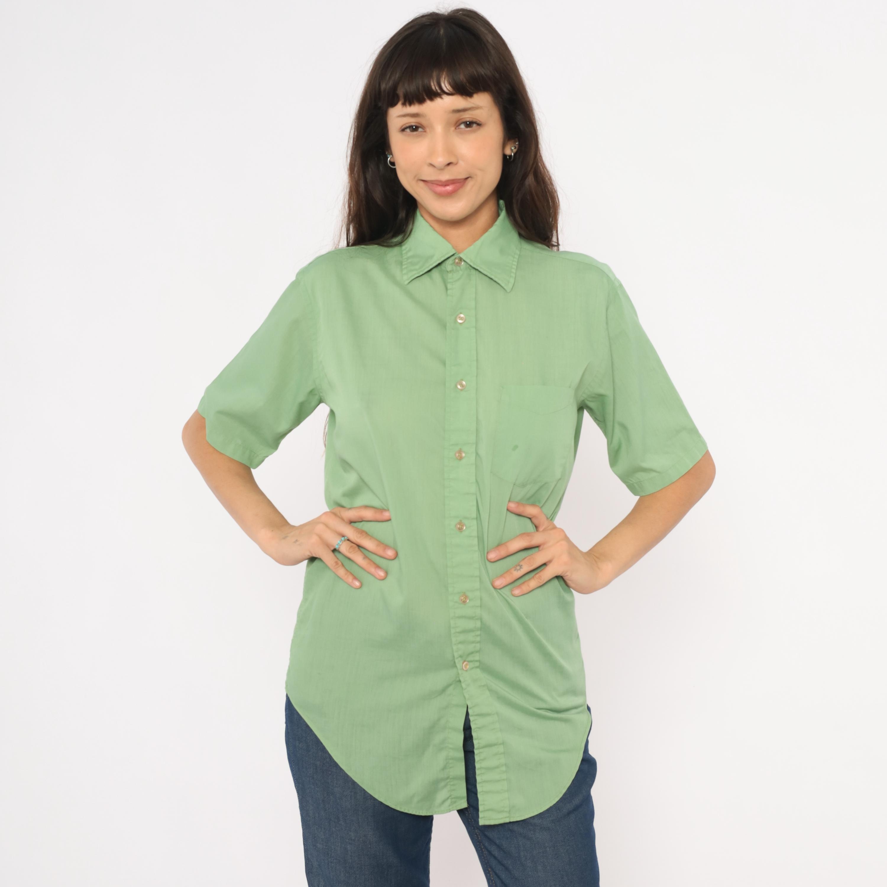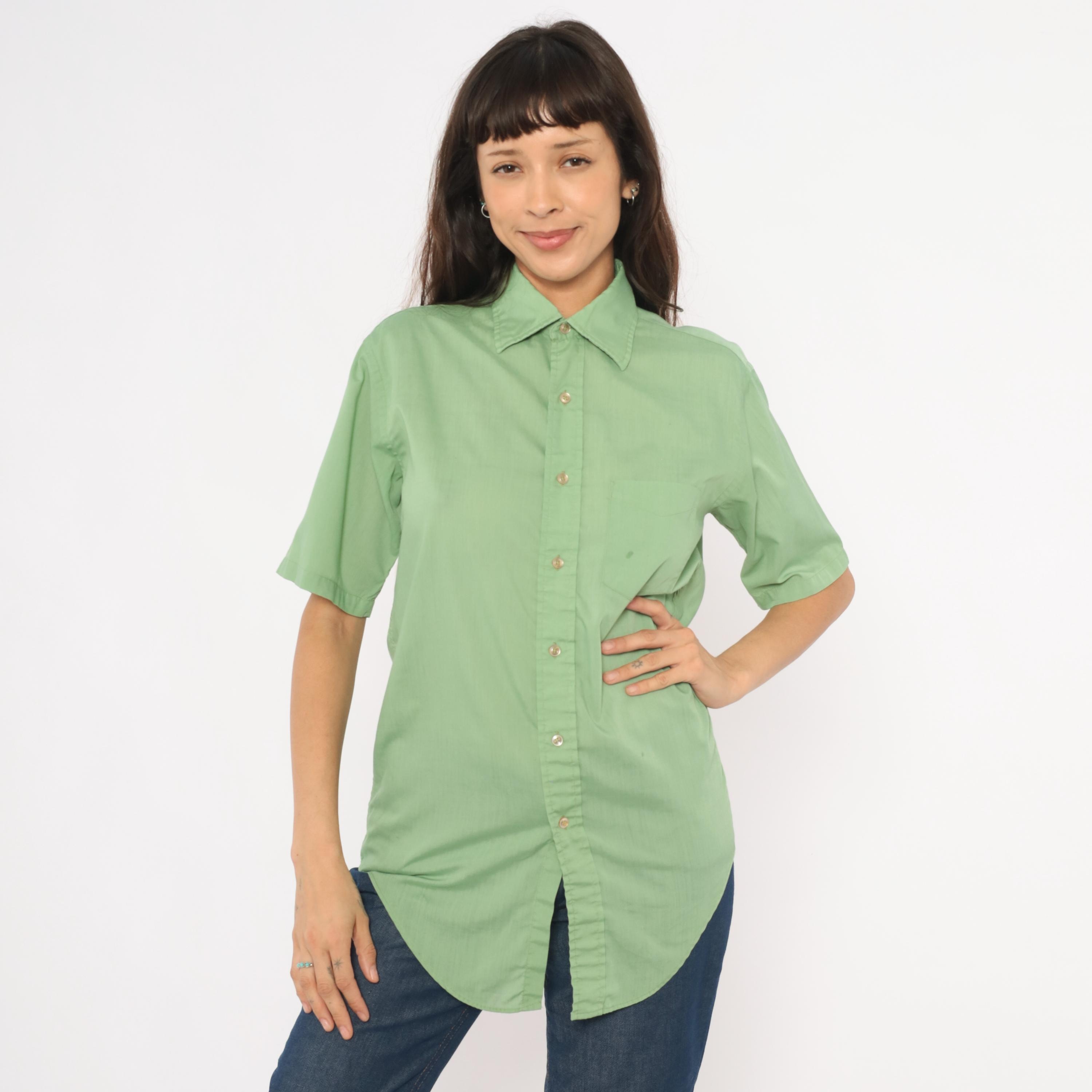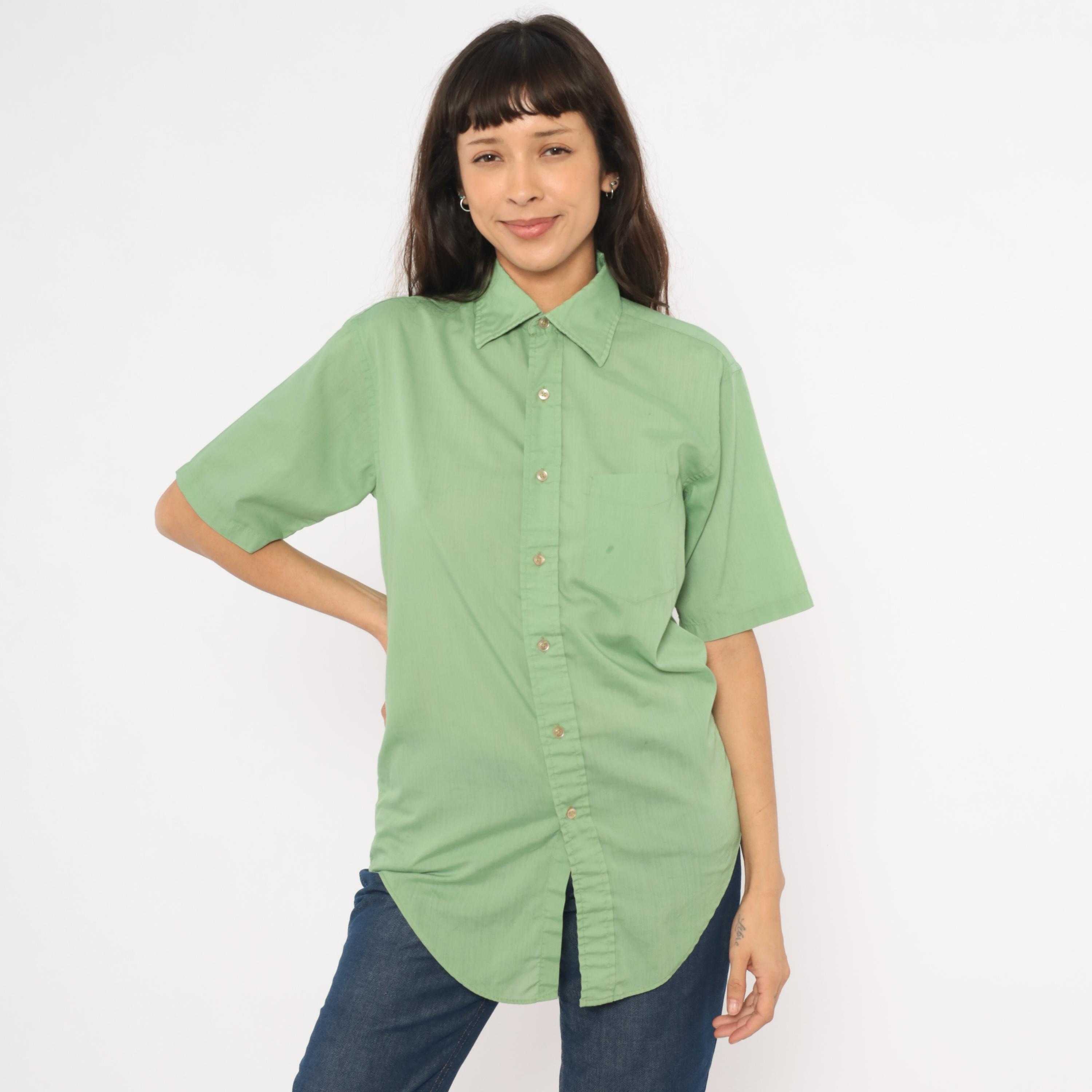 70s sage green short sleeve button-down shirt from Mossini with a pointed collar and full button front closure. Single chest pocket on the left side, with a relaxed straight body and curved hem. Olive and moss tones throughout with a smooth, matte finish.