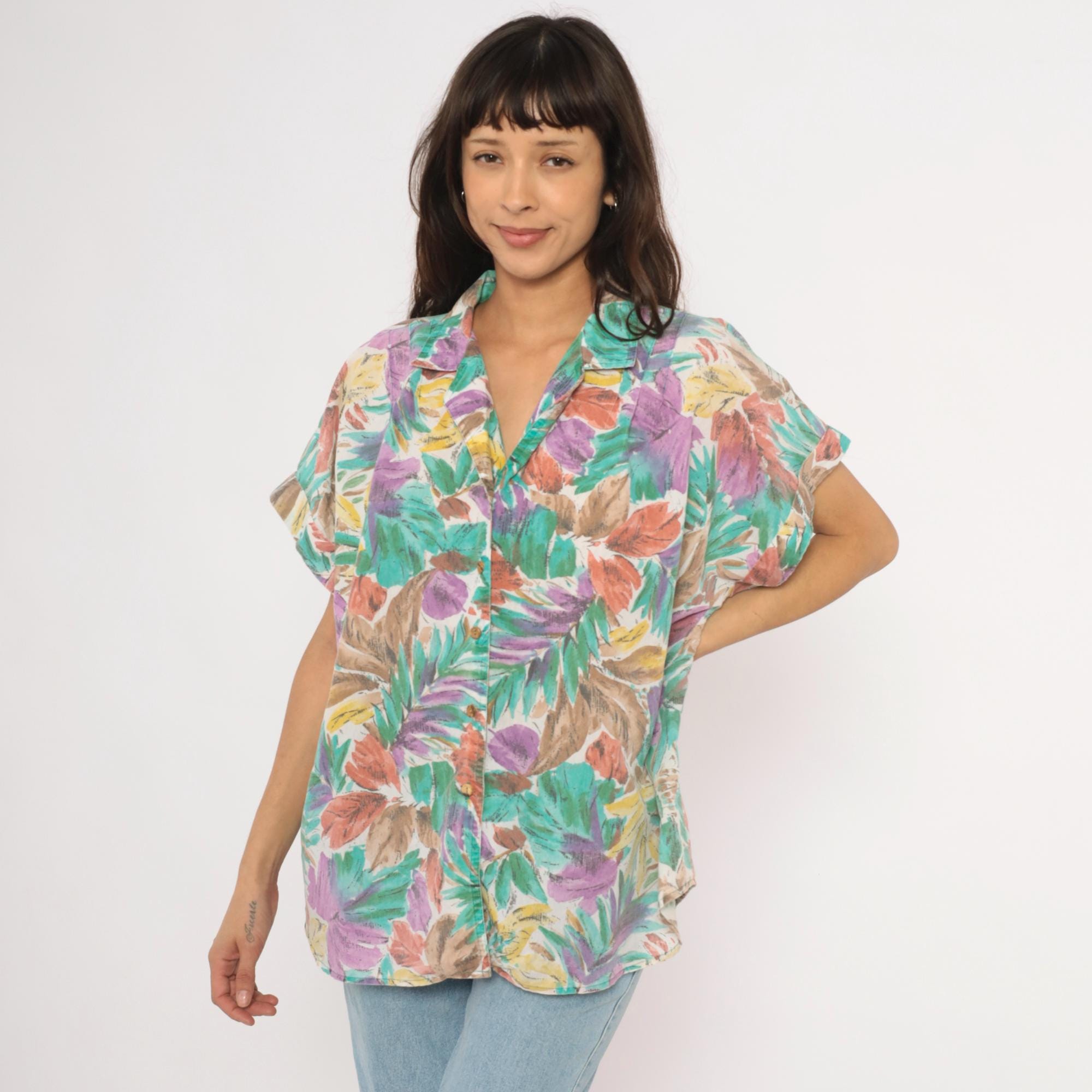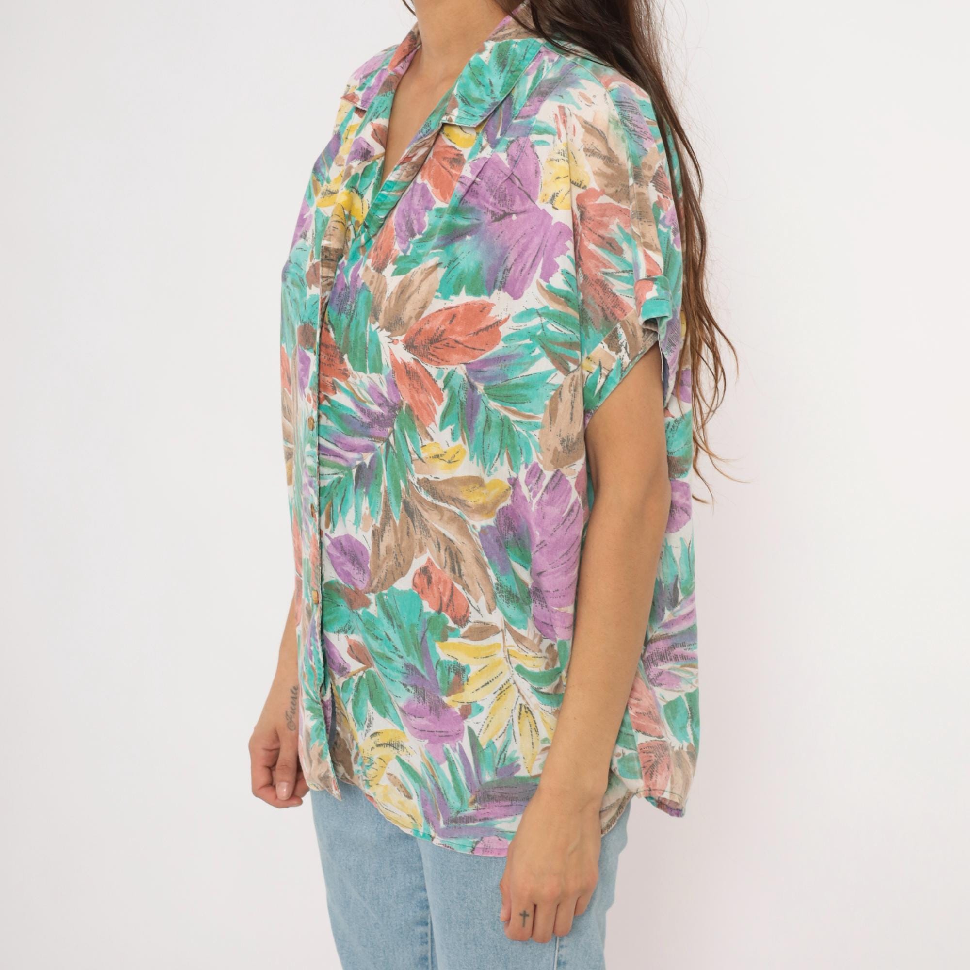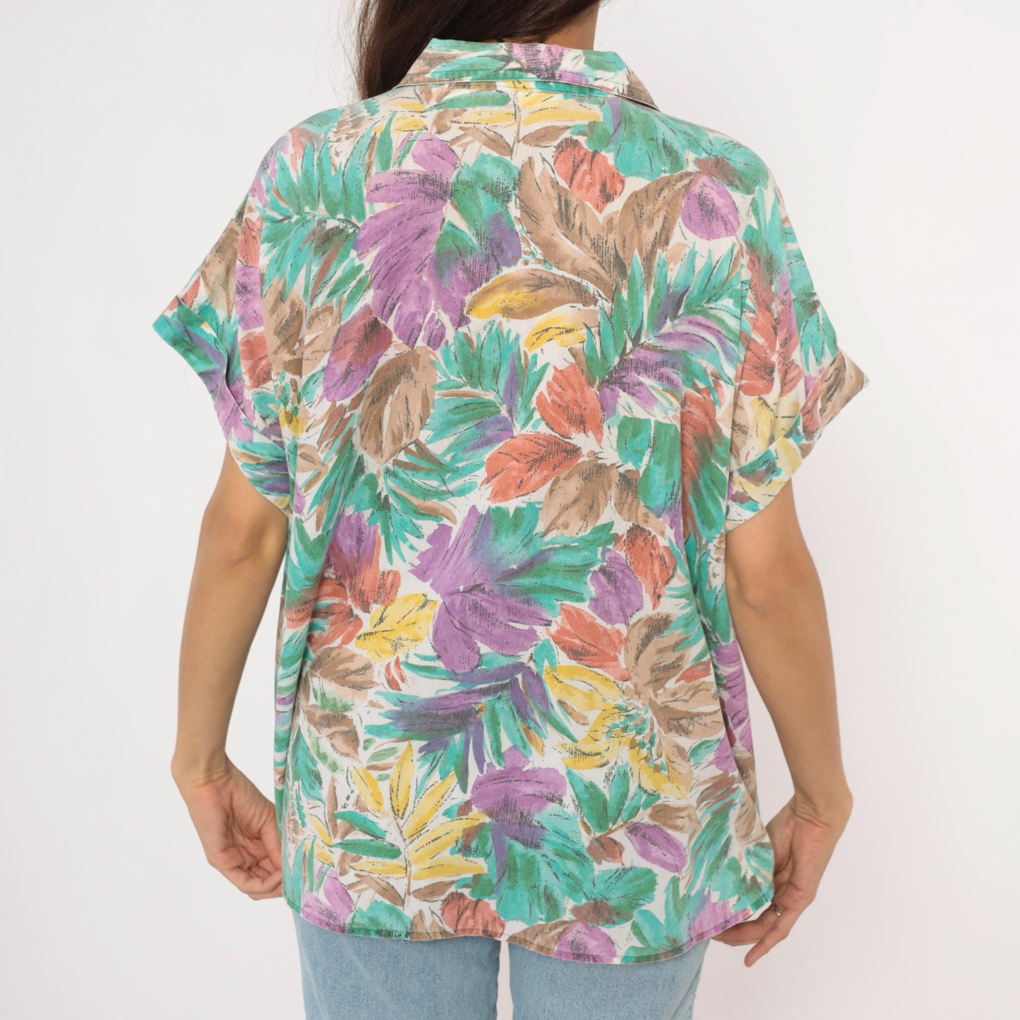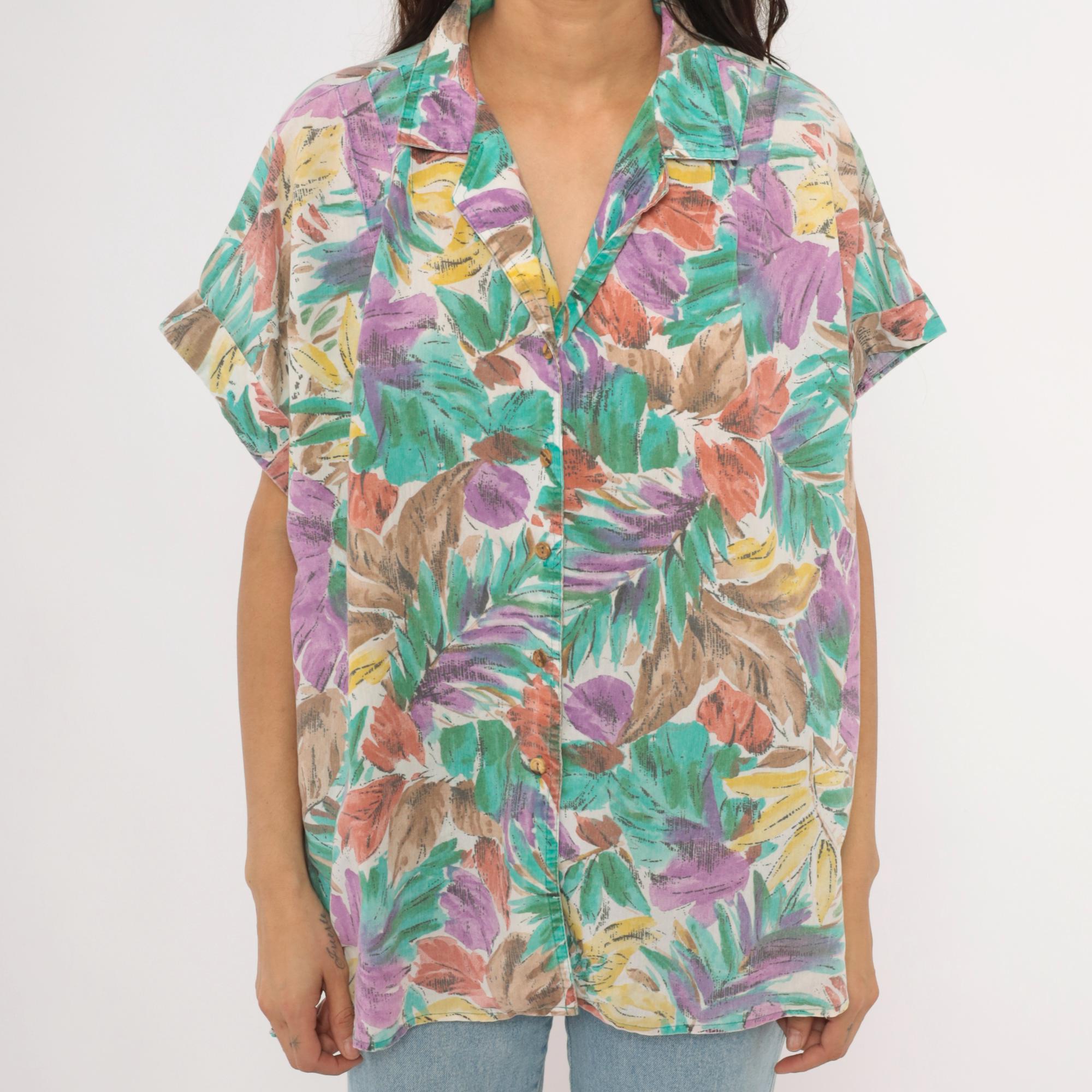 90s tropical leaf print button front shirt from Cabrais with a camp collar and short cuffed sleeves. Painterly brushstroke leaves in teal, purple, coral, gold, and brown cover the entire garment against a cream background. Boxy silhouette with a straight hem and no pockets.
