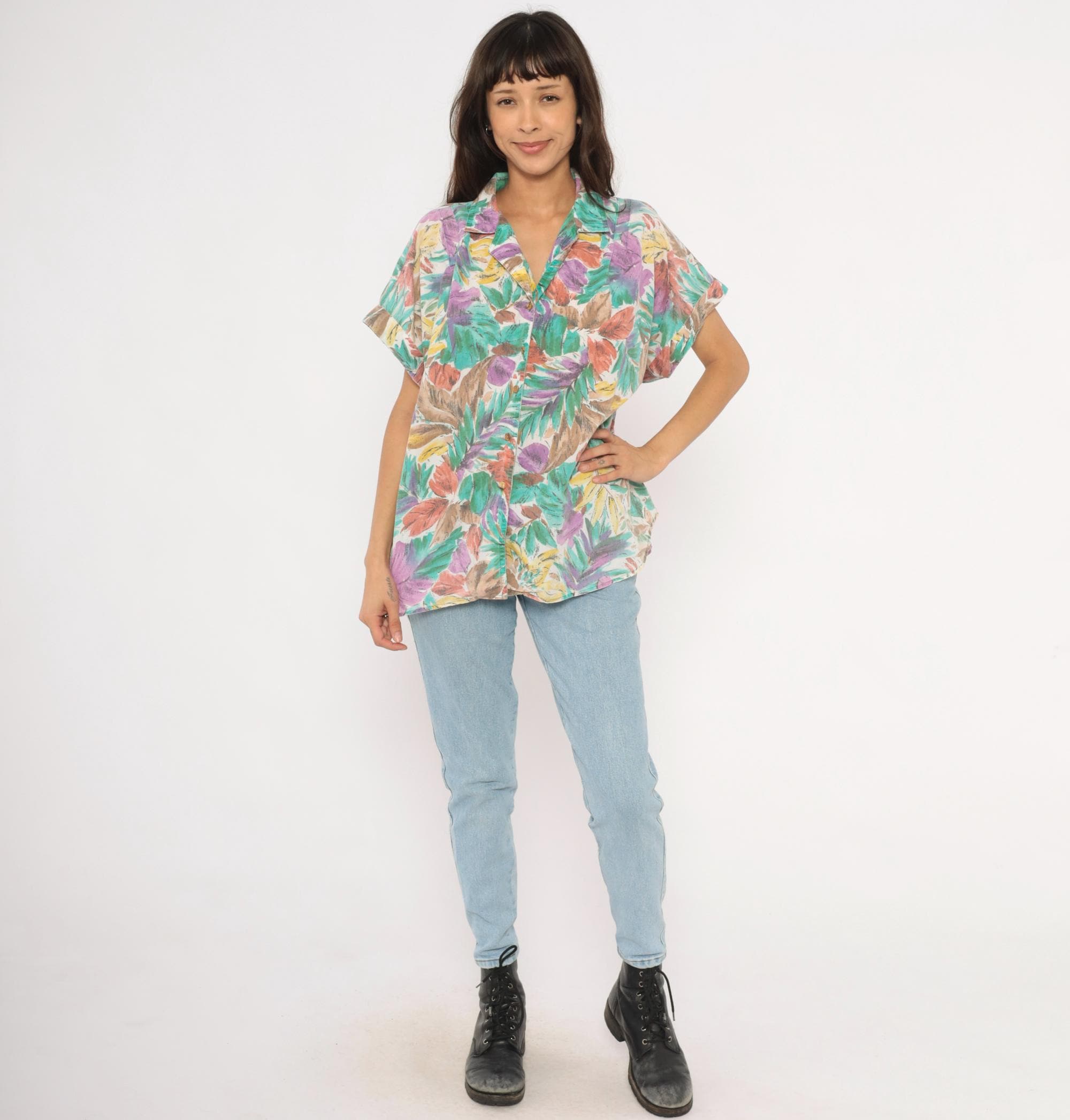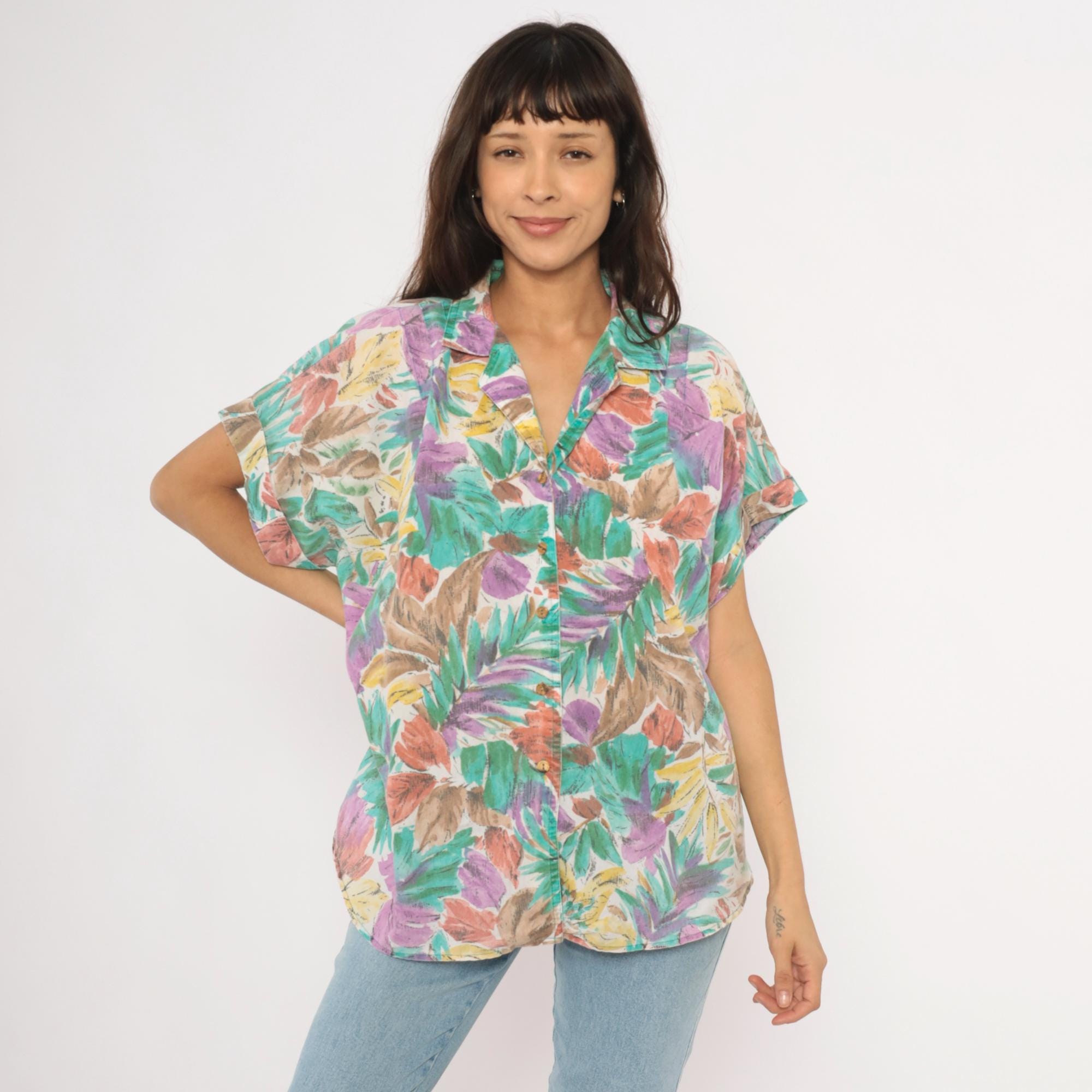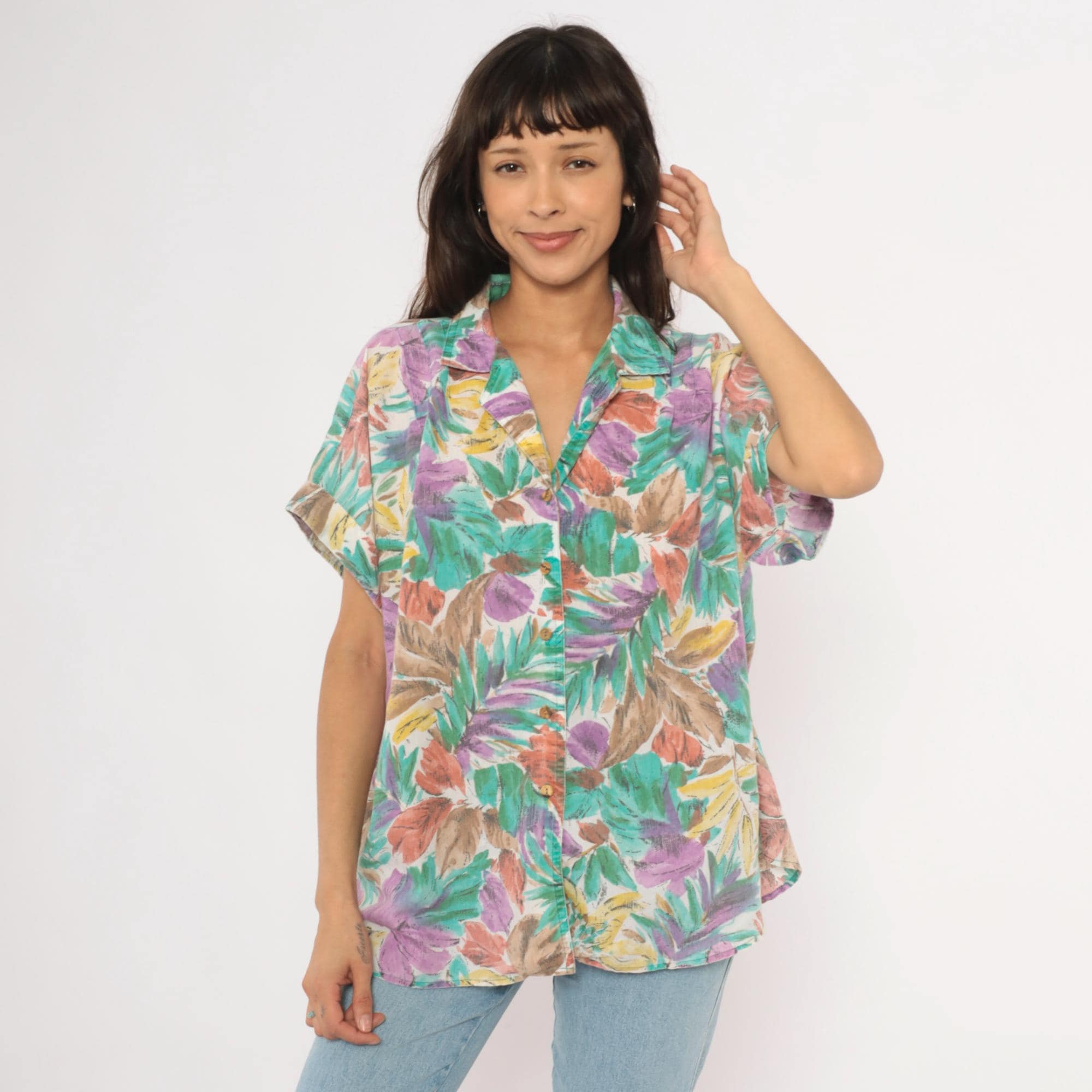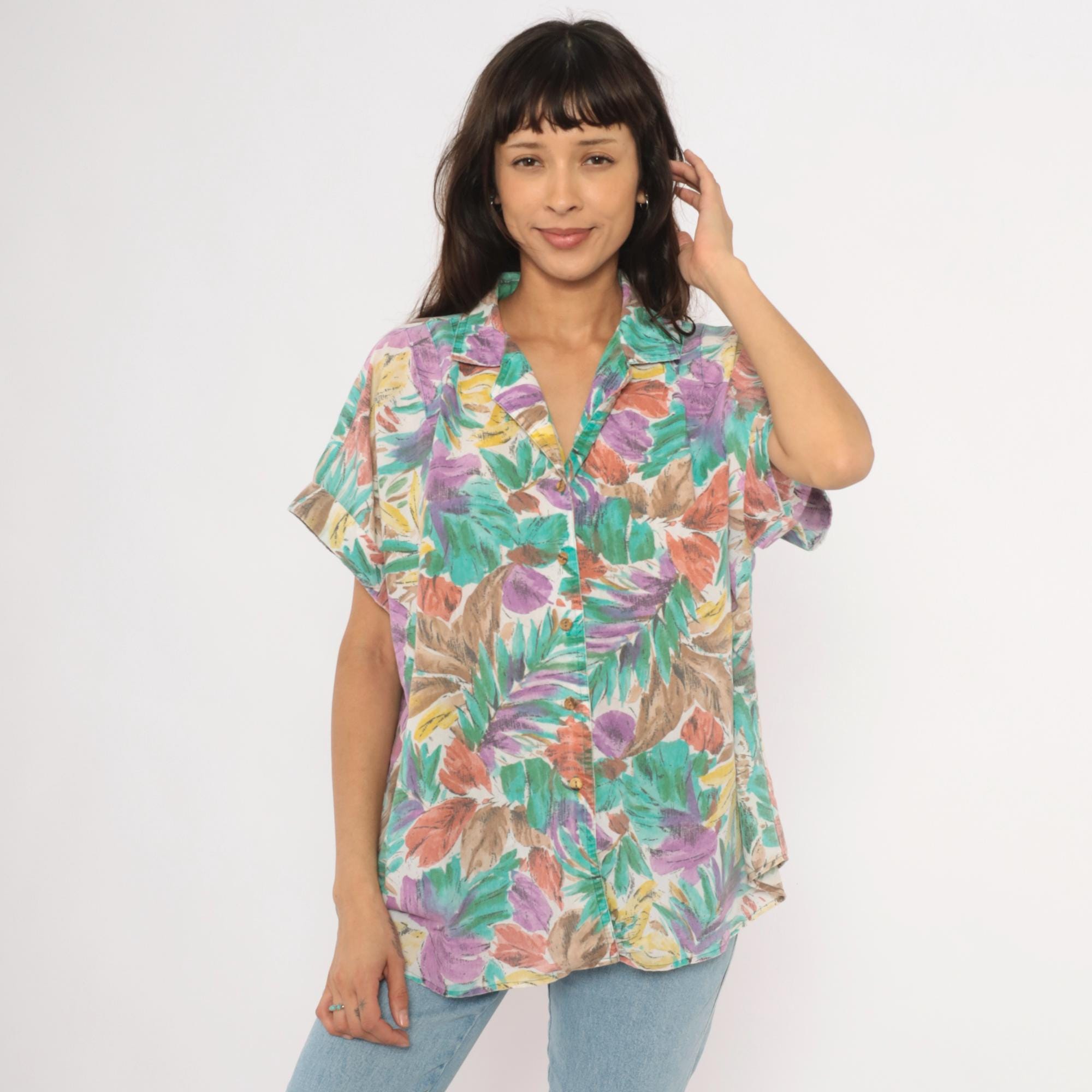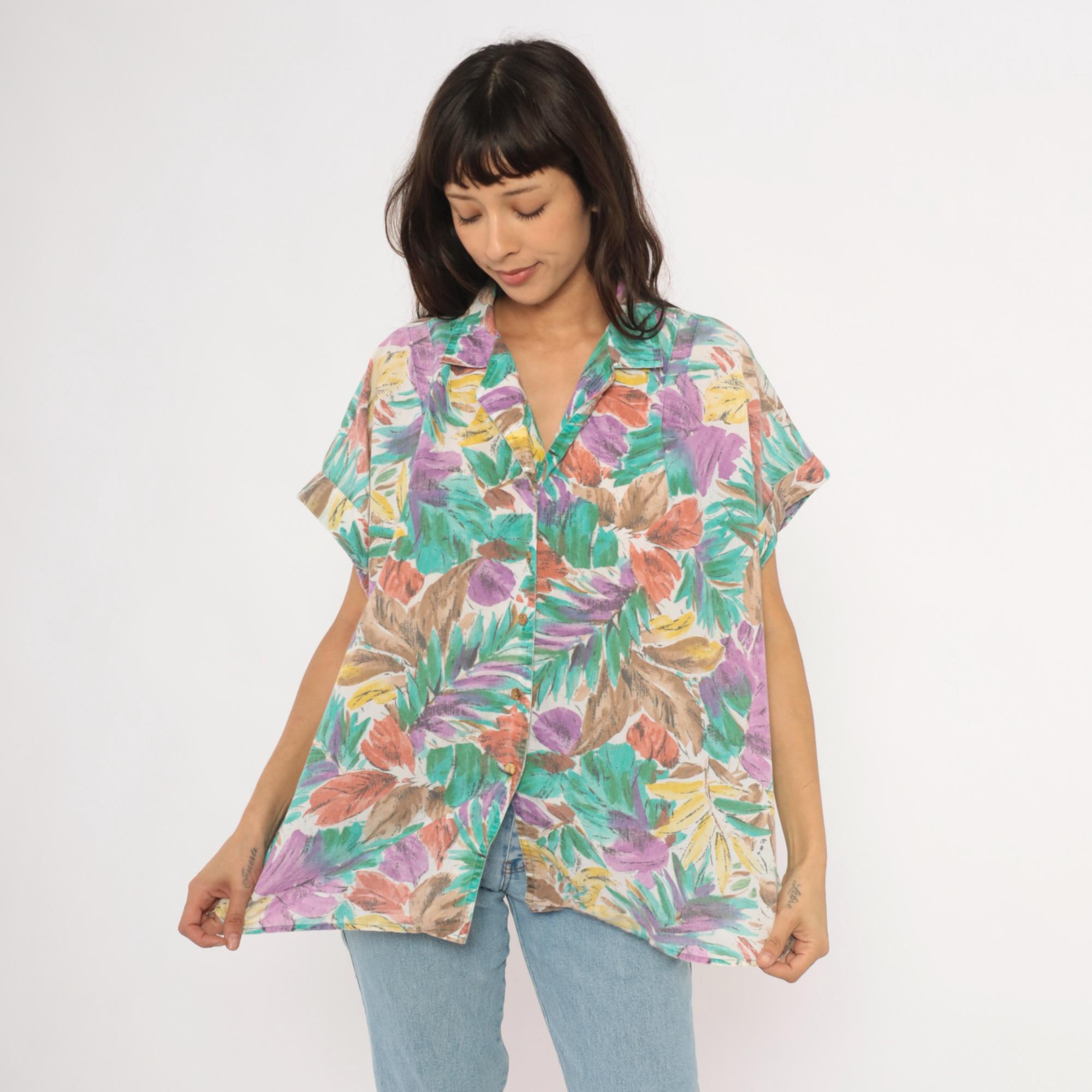 90s tropical leaf print button front shirt from Cabrais with a camp collar and short cuffed sleeves. Painterly brushstroke leaves in teal, purple, coral, gold, and brown cover the entire garment against a cream background. Boxy silhouette with a straight hem and no pockets.