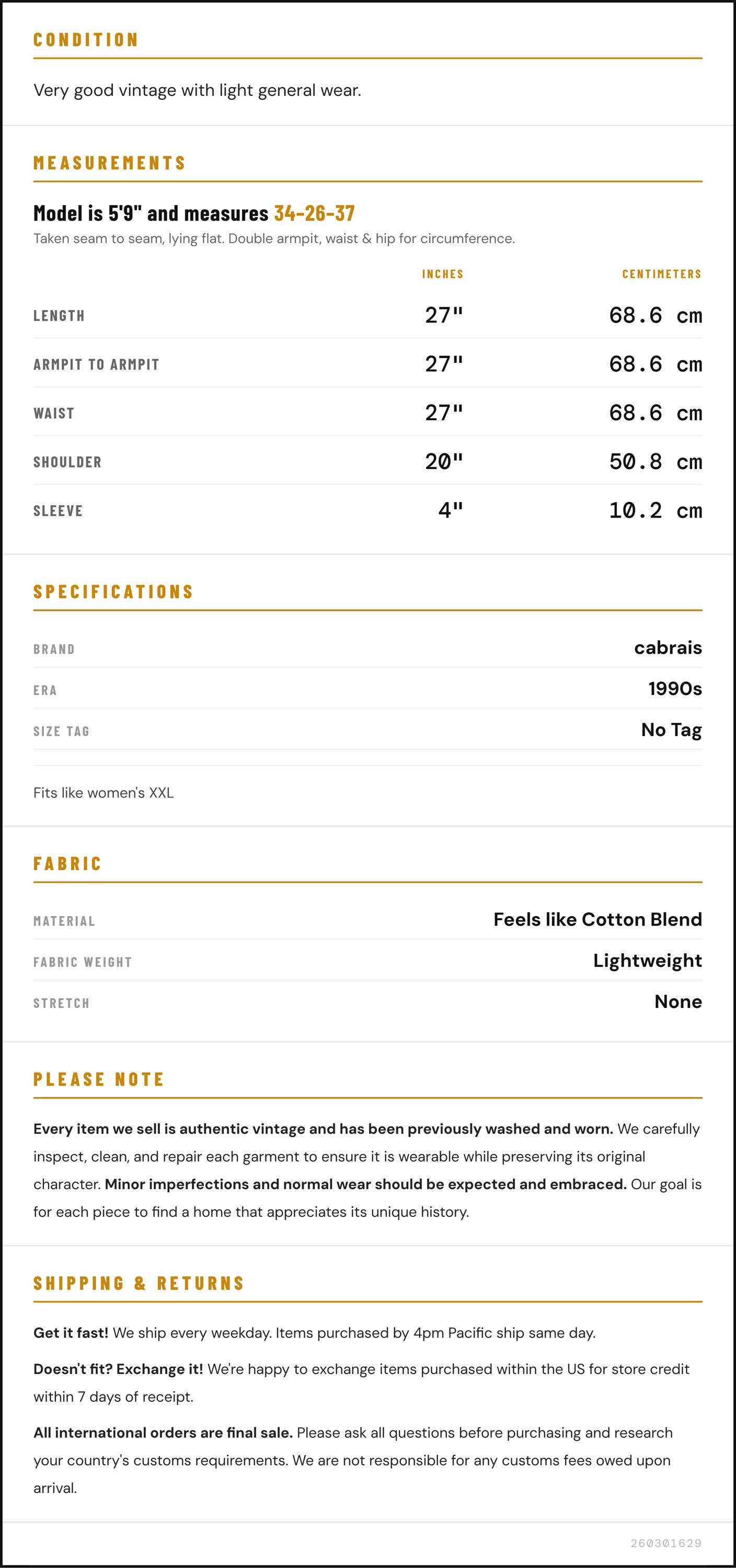 Armpit to Armpit: 27" / 68.6 cm