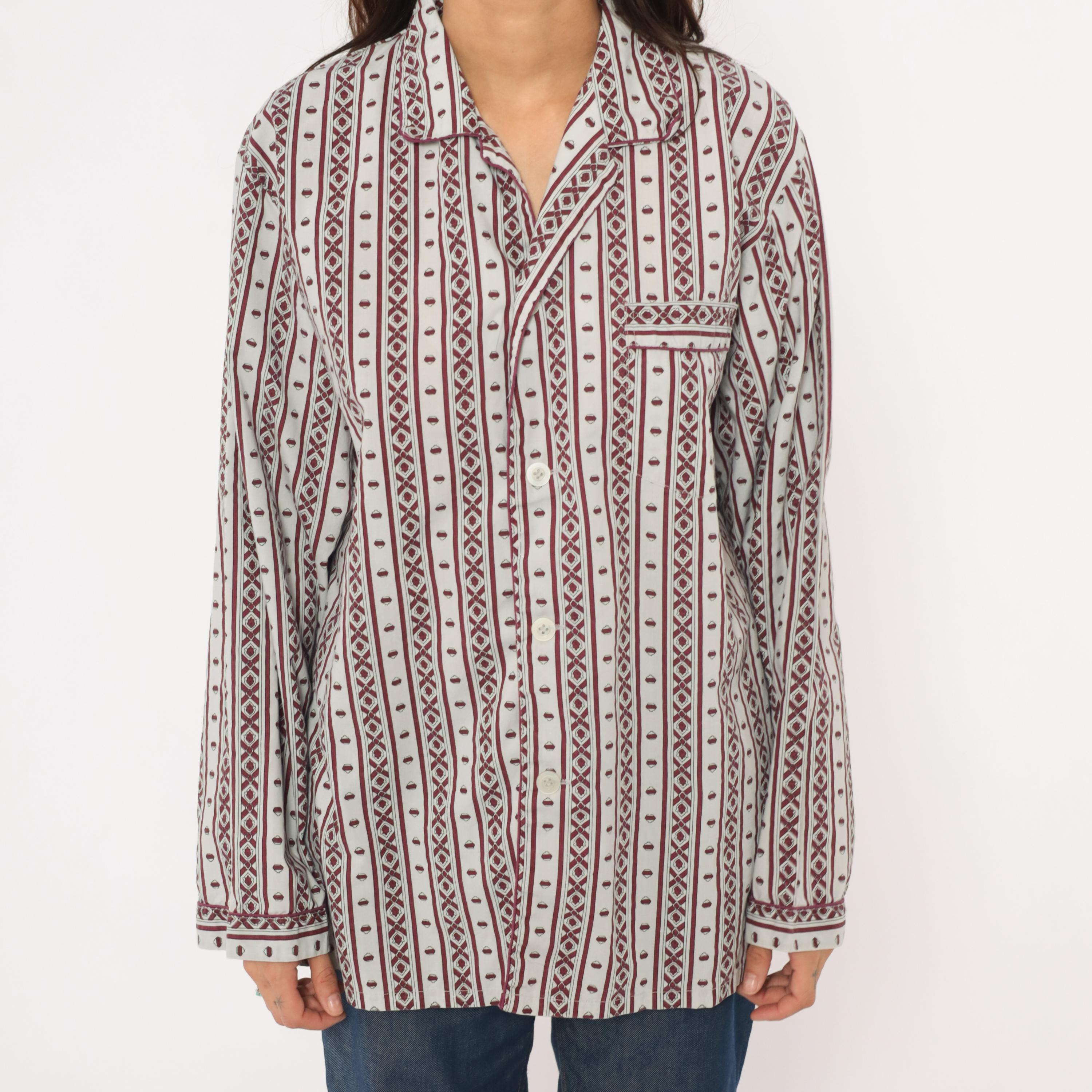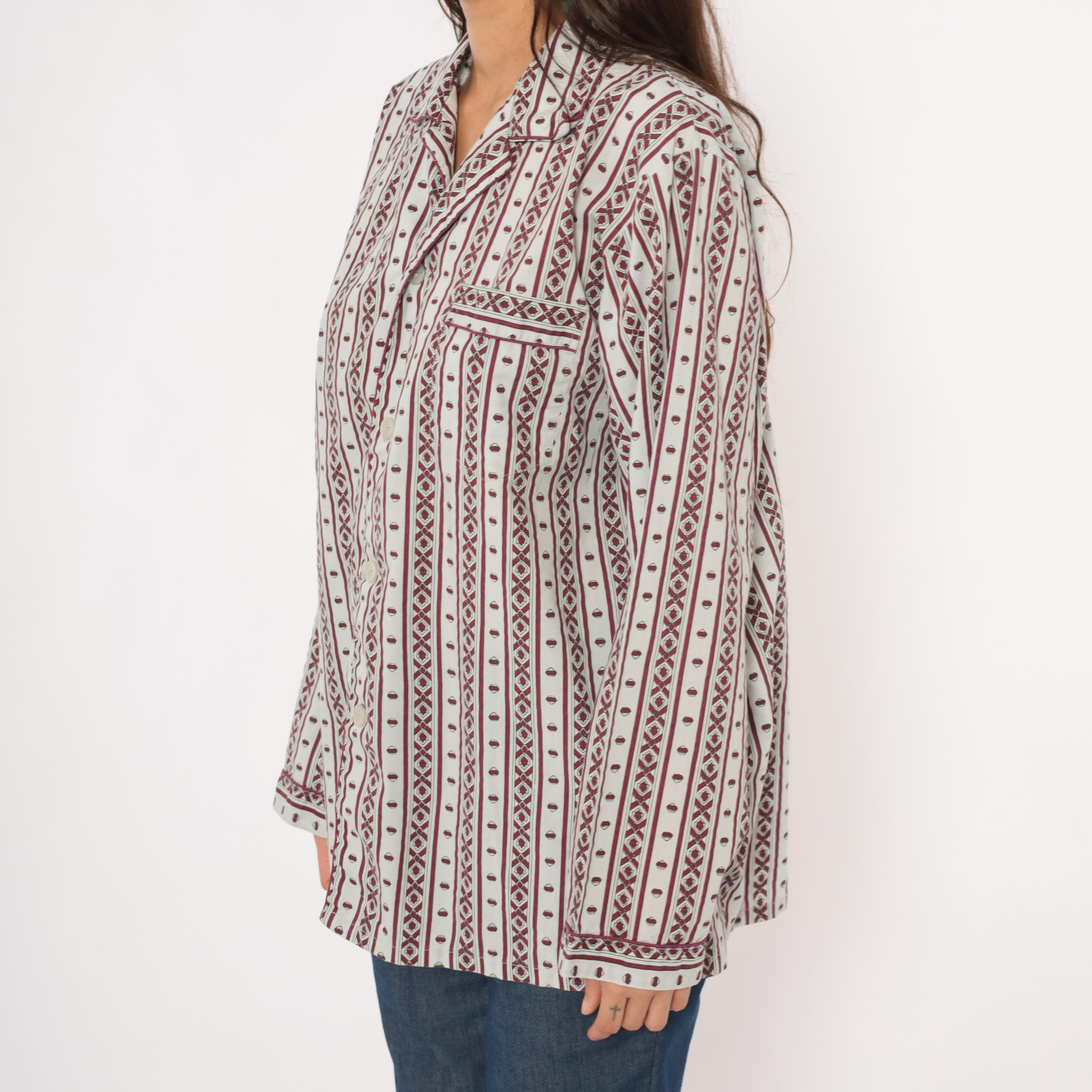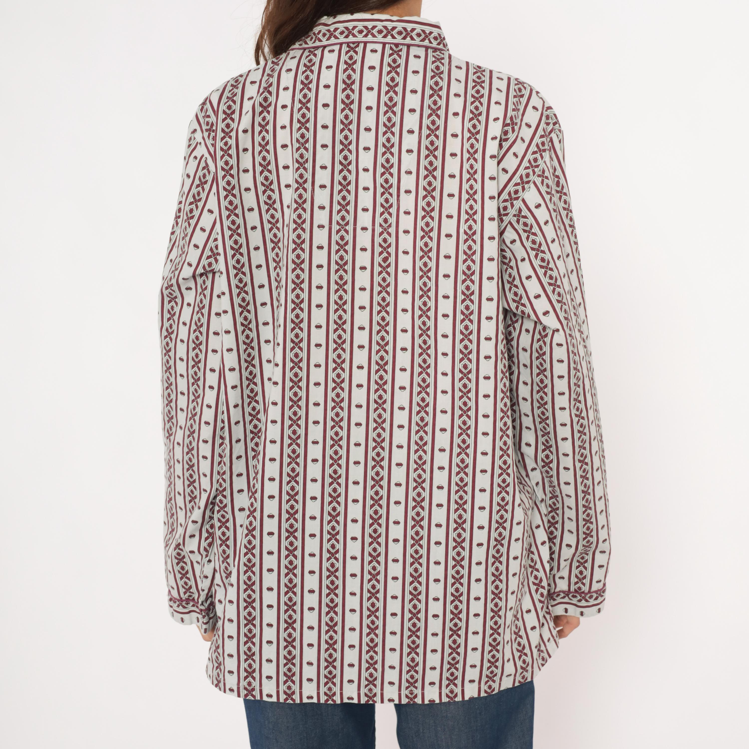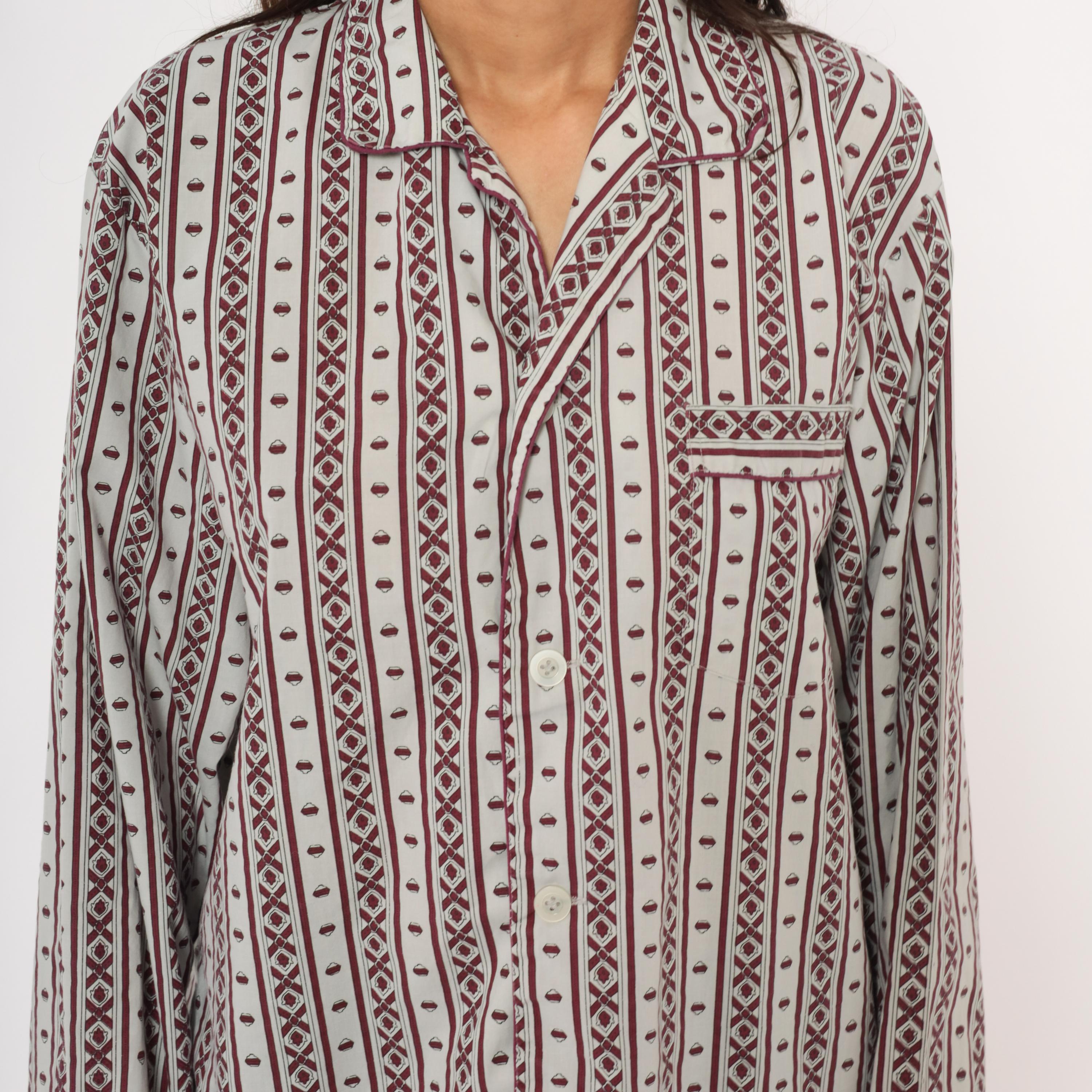 80s pajama-style shirt from MTL Classics with a grey and burgundy geometric stripe pattern, alternating vertical bands of diamond motifs and small medallion shapes. Notched lapel collar, button front closure, and a single chest pocket with piped trim.