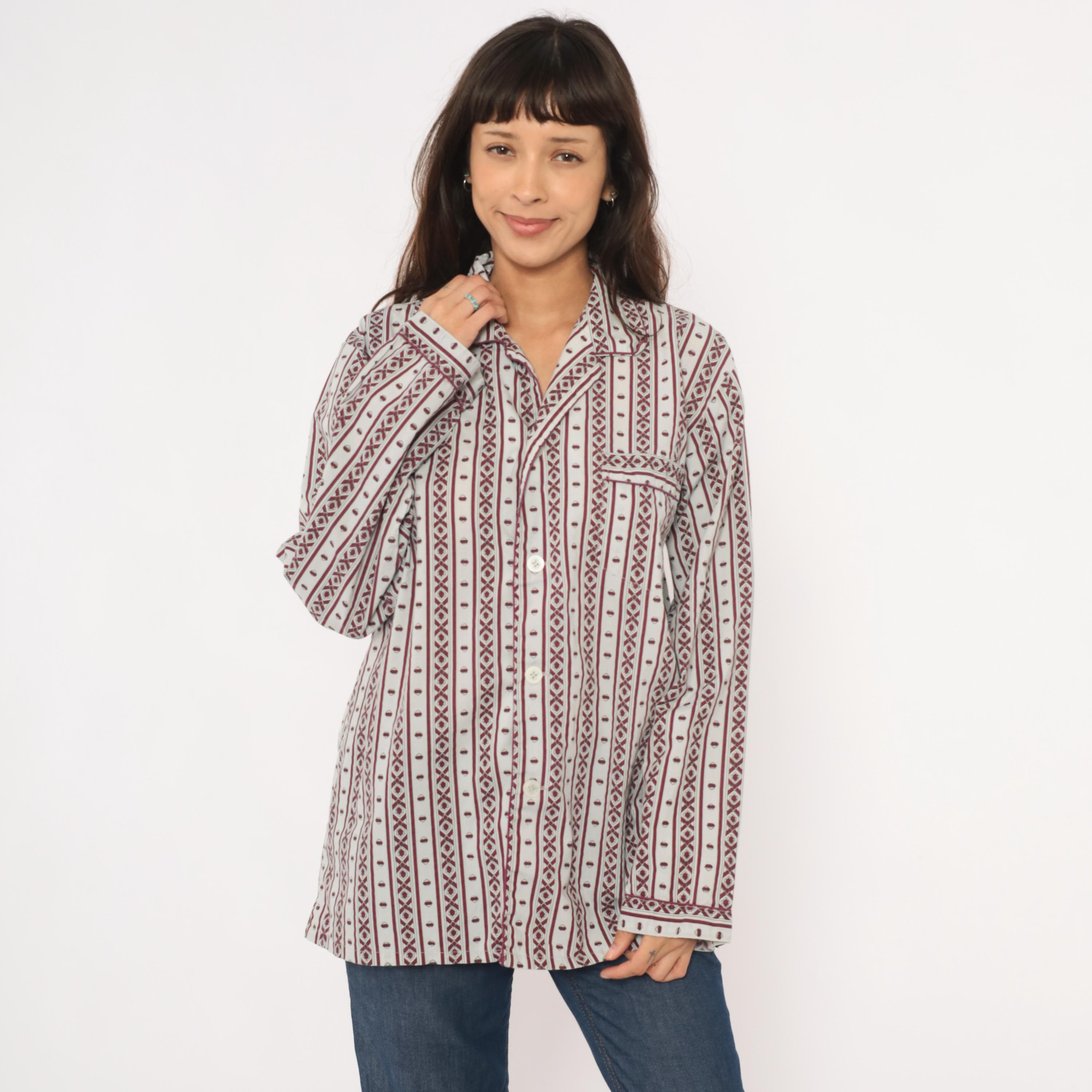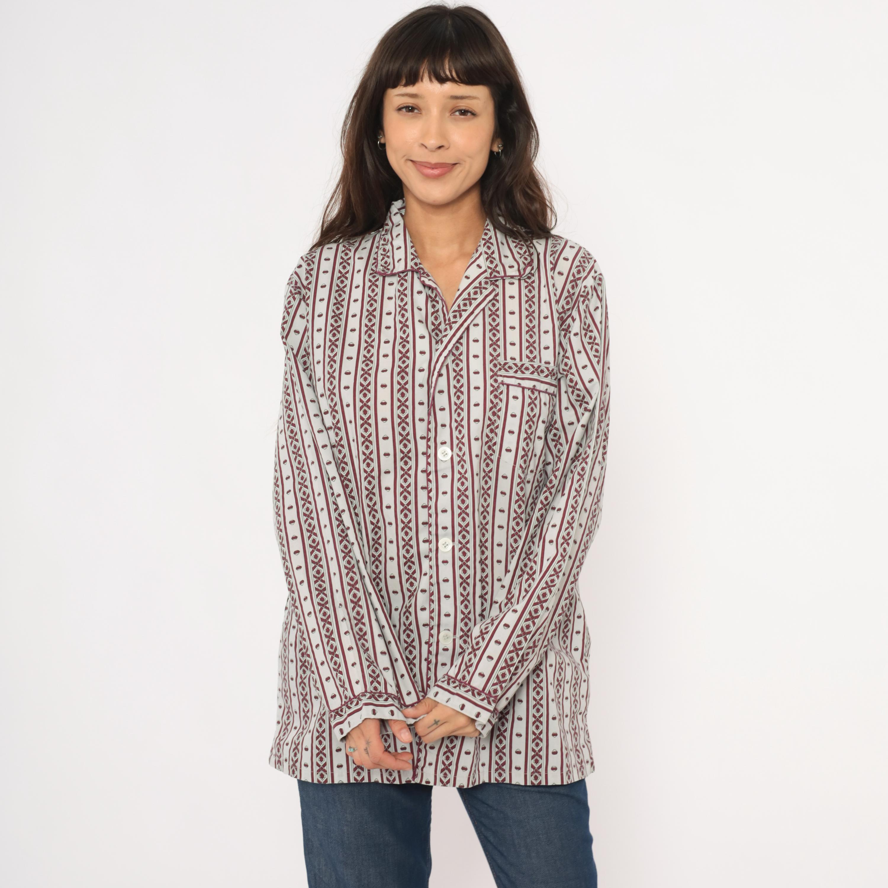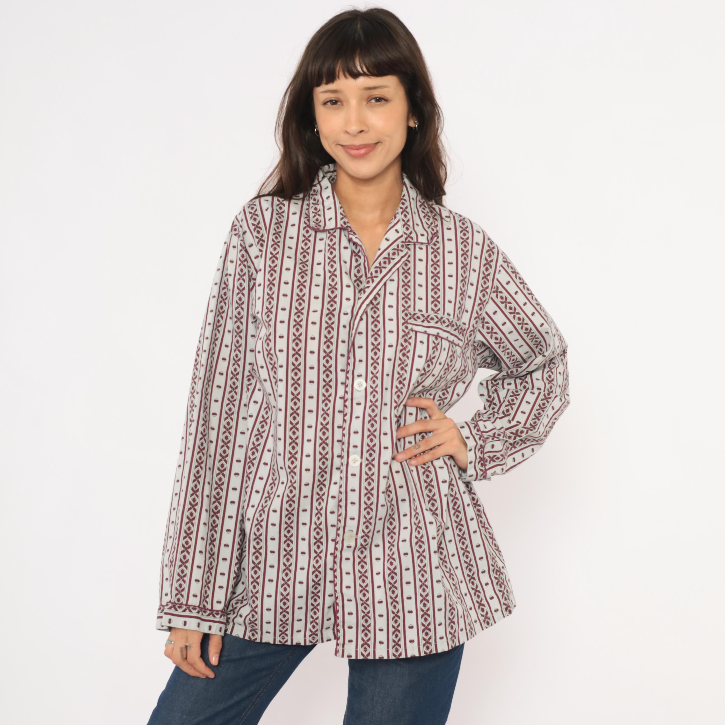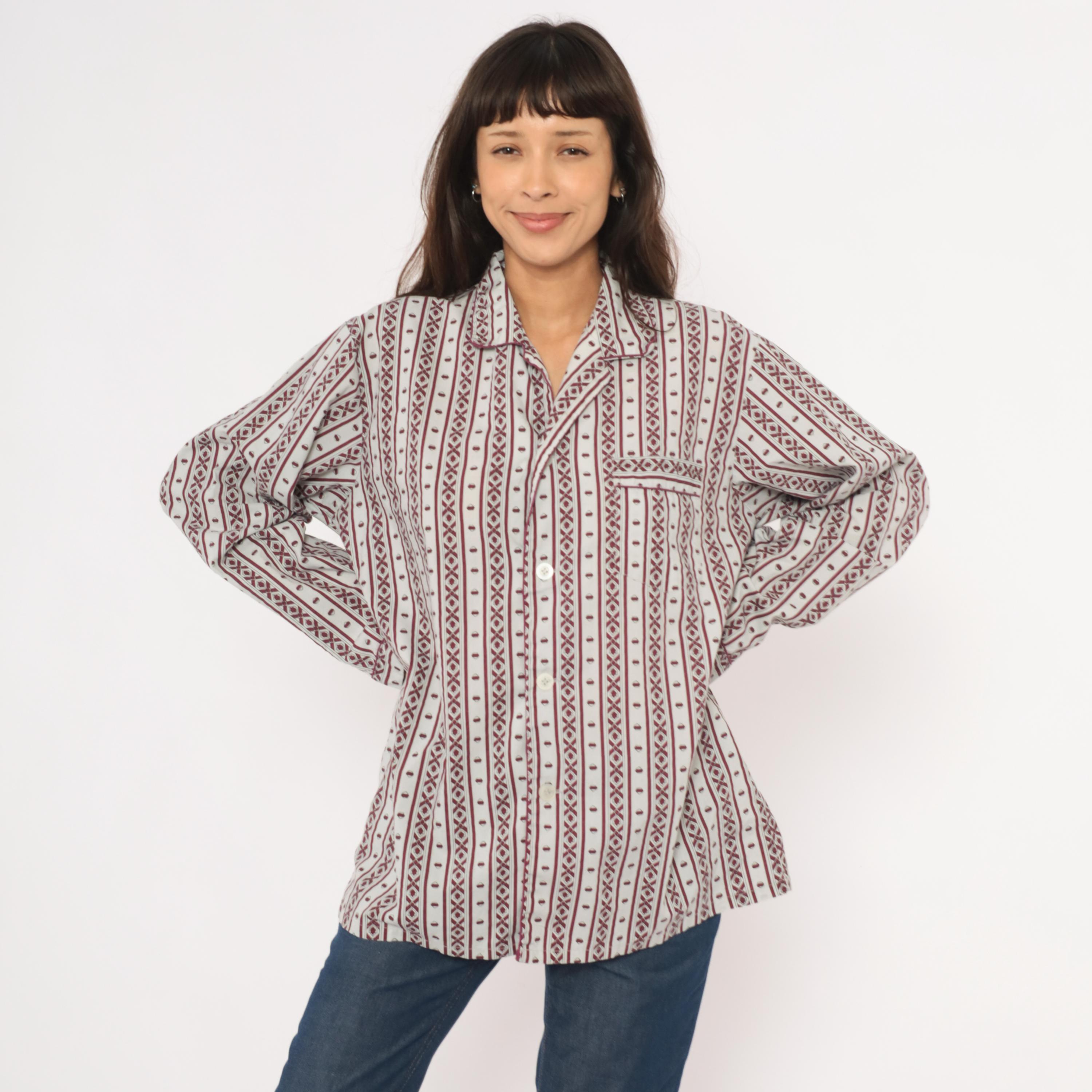 80s pajama-style shirt from MTL Classics with a grey and burgundy geometric stripe pattern, alternating vertical bands of diamond motifs and small medallion shapes. Notched lapel collar, button front closure, and a single chest pocket with piped trim.
