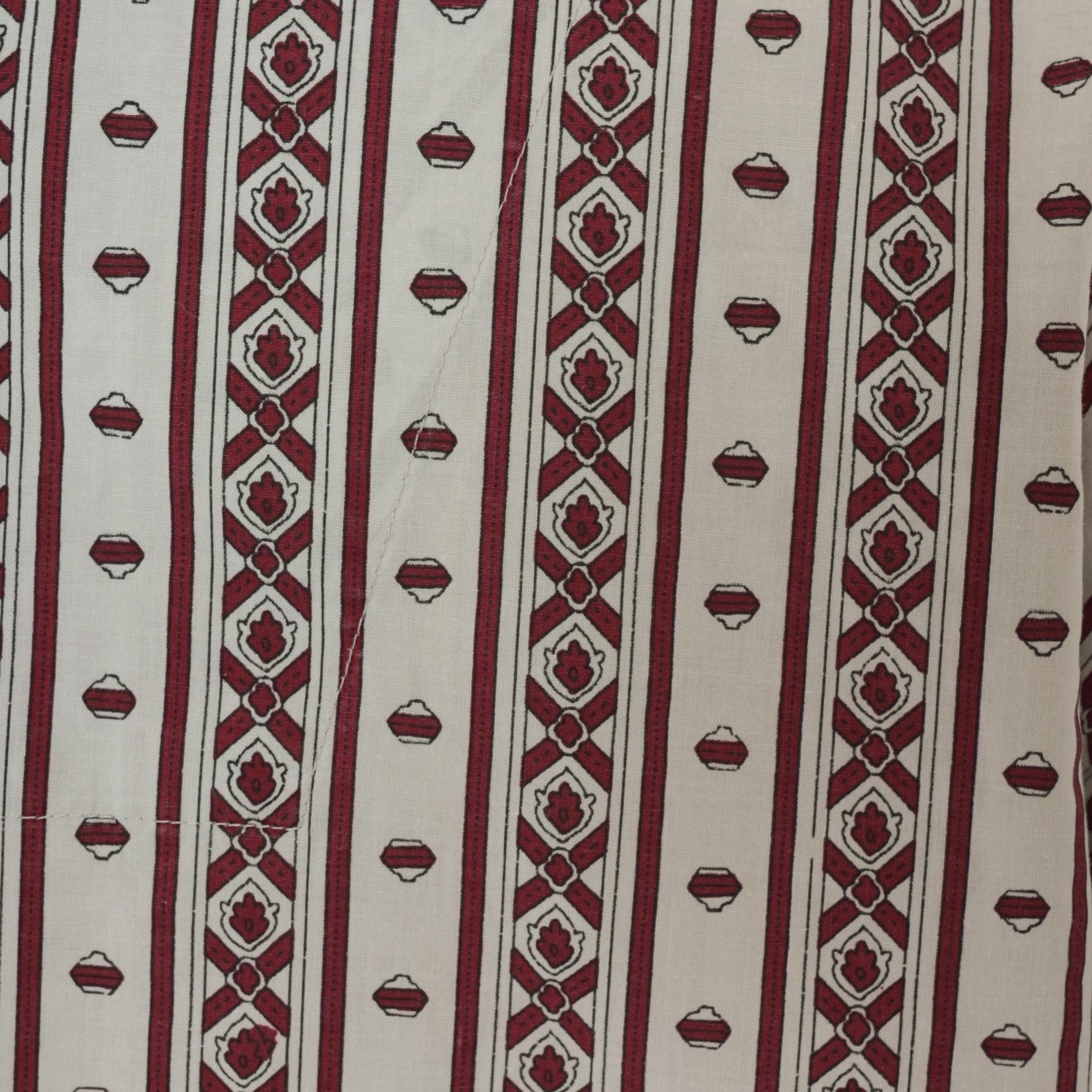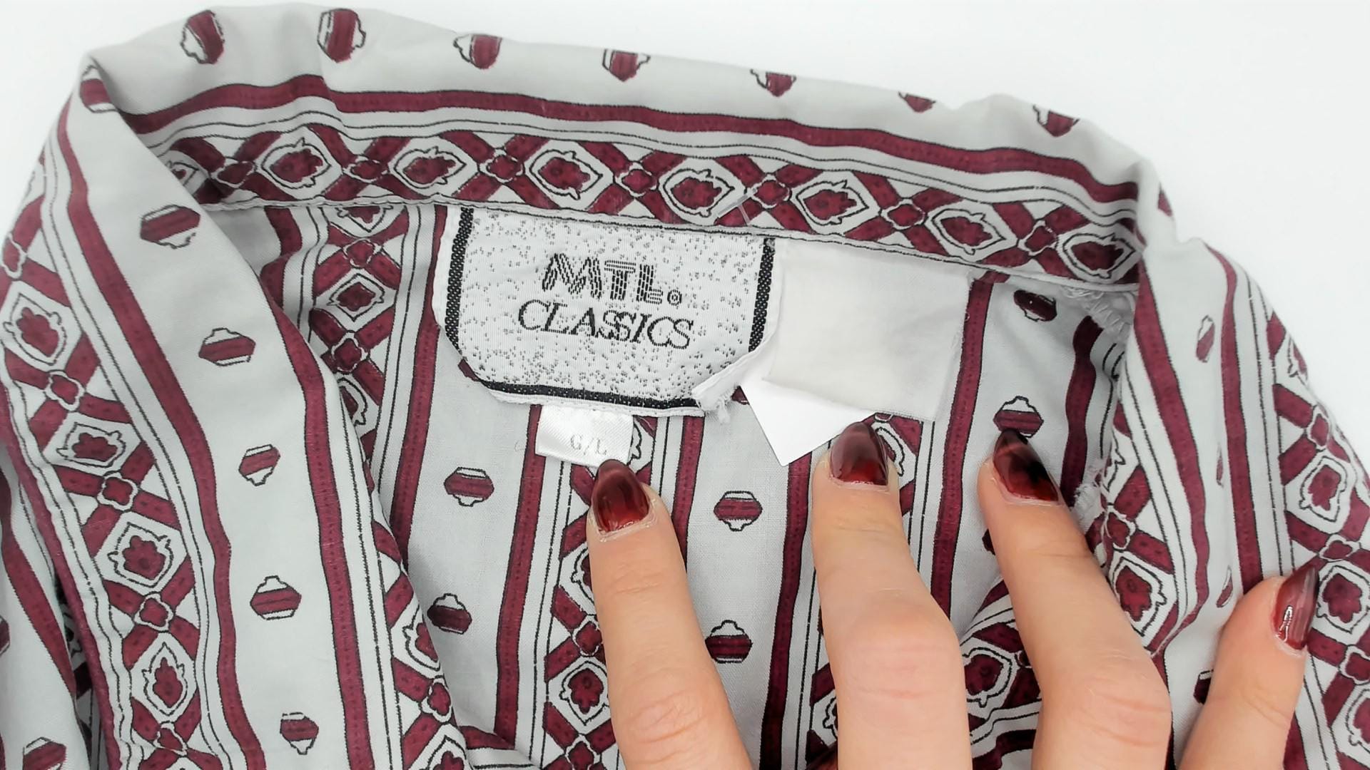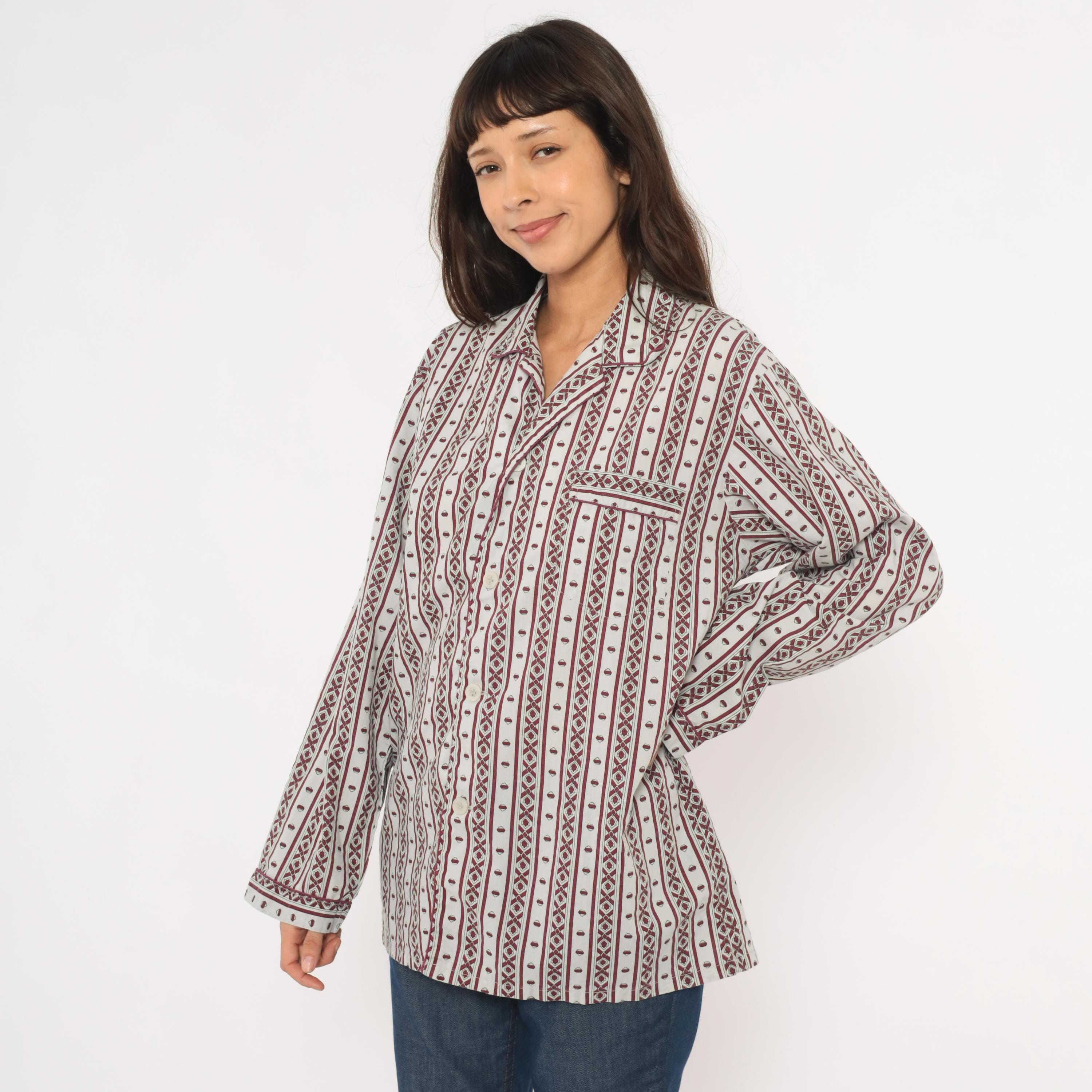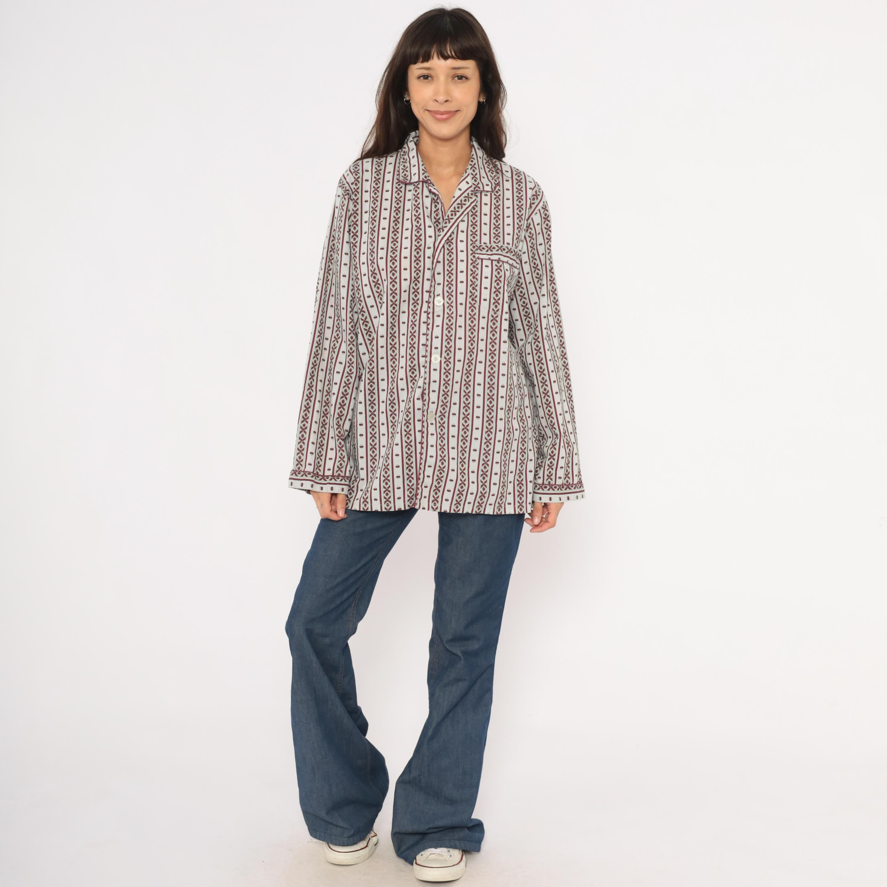 80s pajama-style shirt from MTL Classics with a grey and burgundy geometric stripe pattern, alternating vertical bands of diamond motifs and small medallion shapes. Notched lapel collar, button front closure, and a single chest pocket with piped trim.