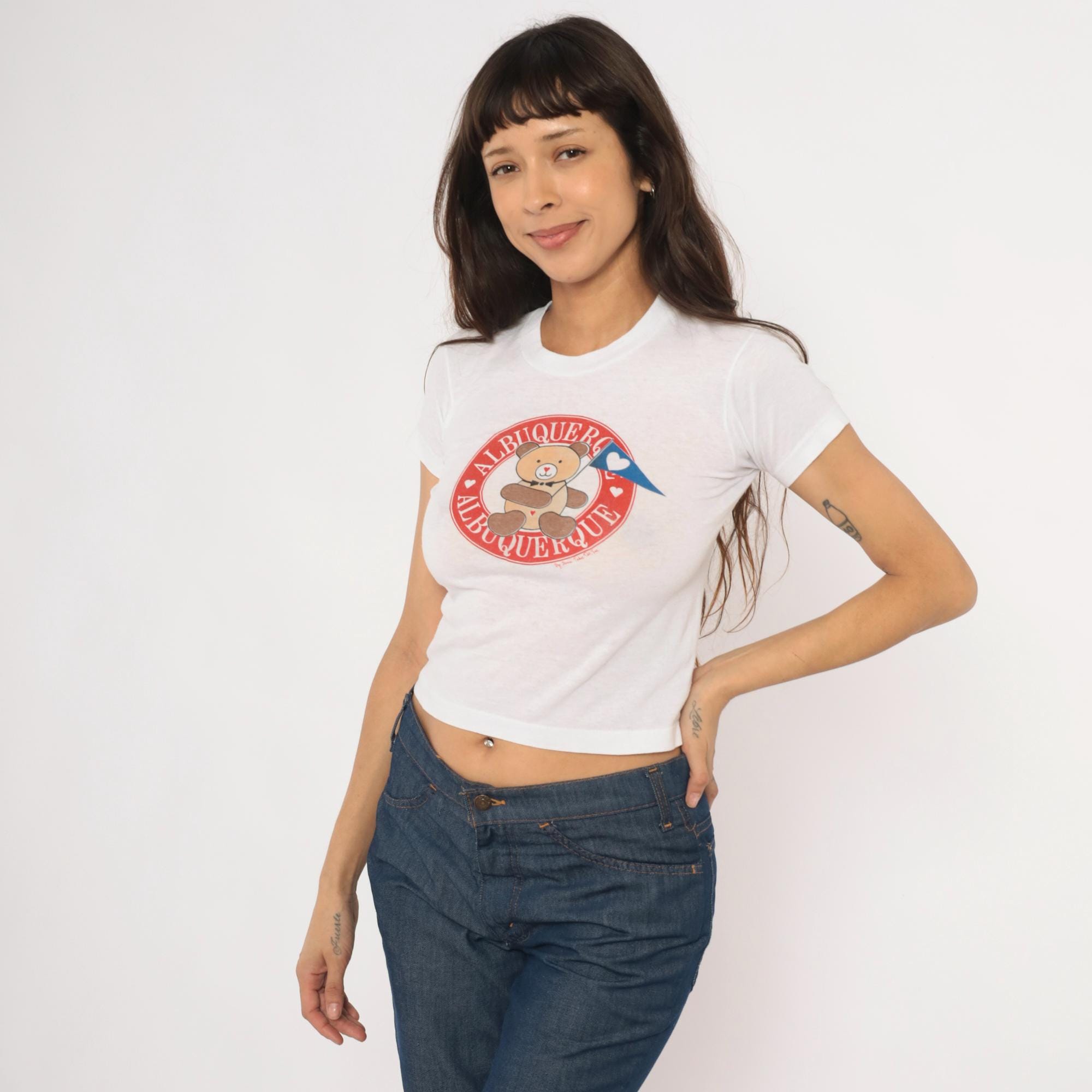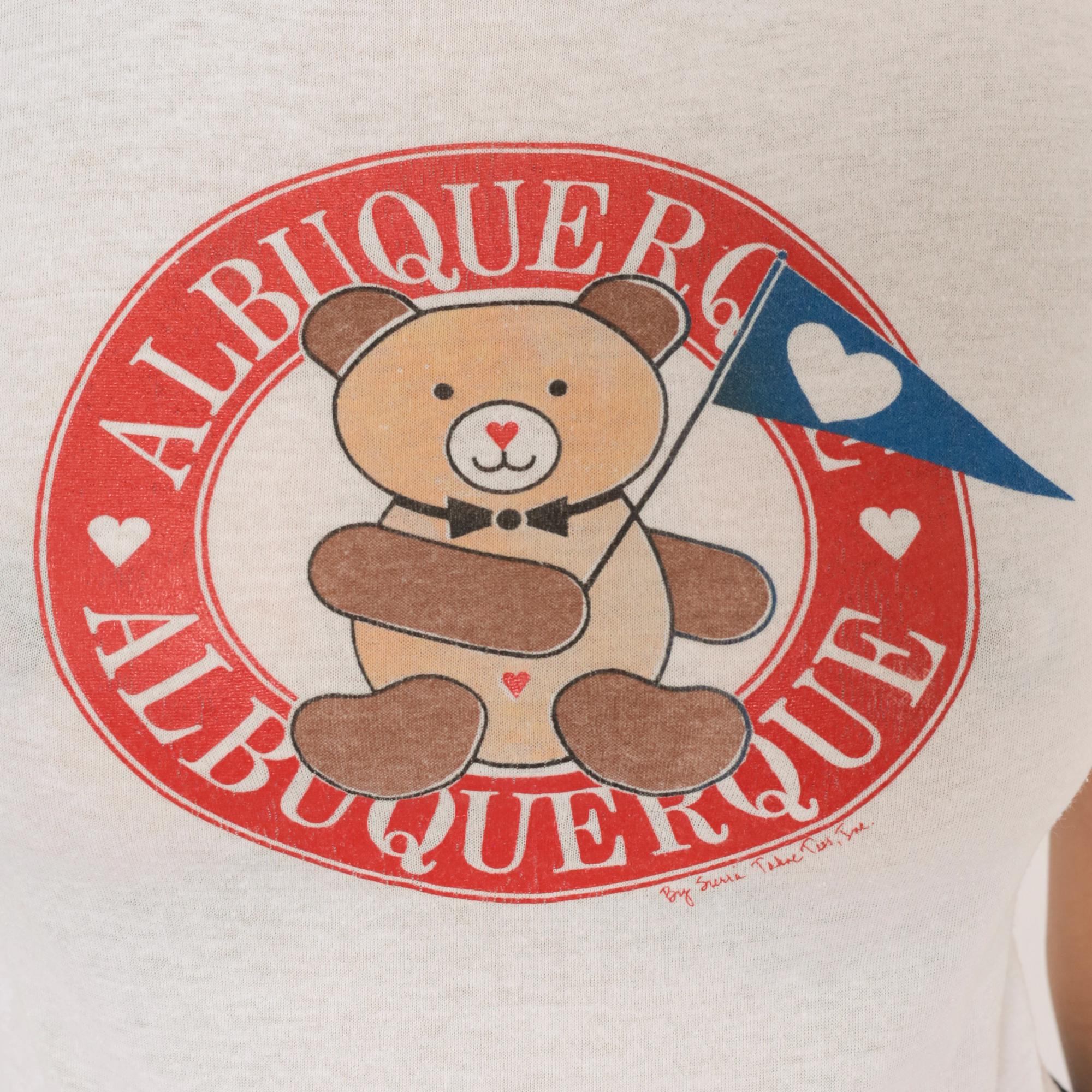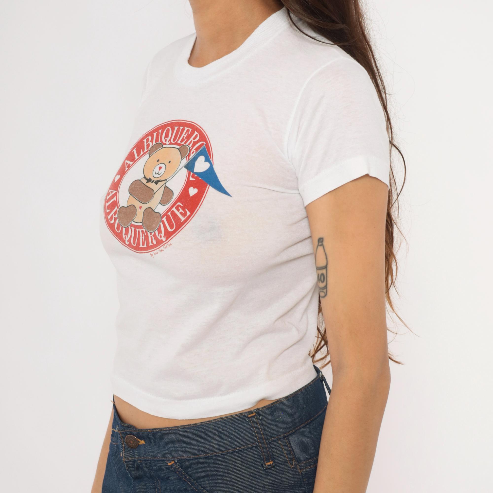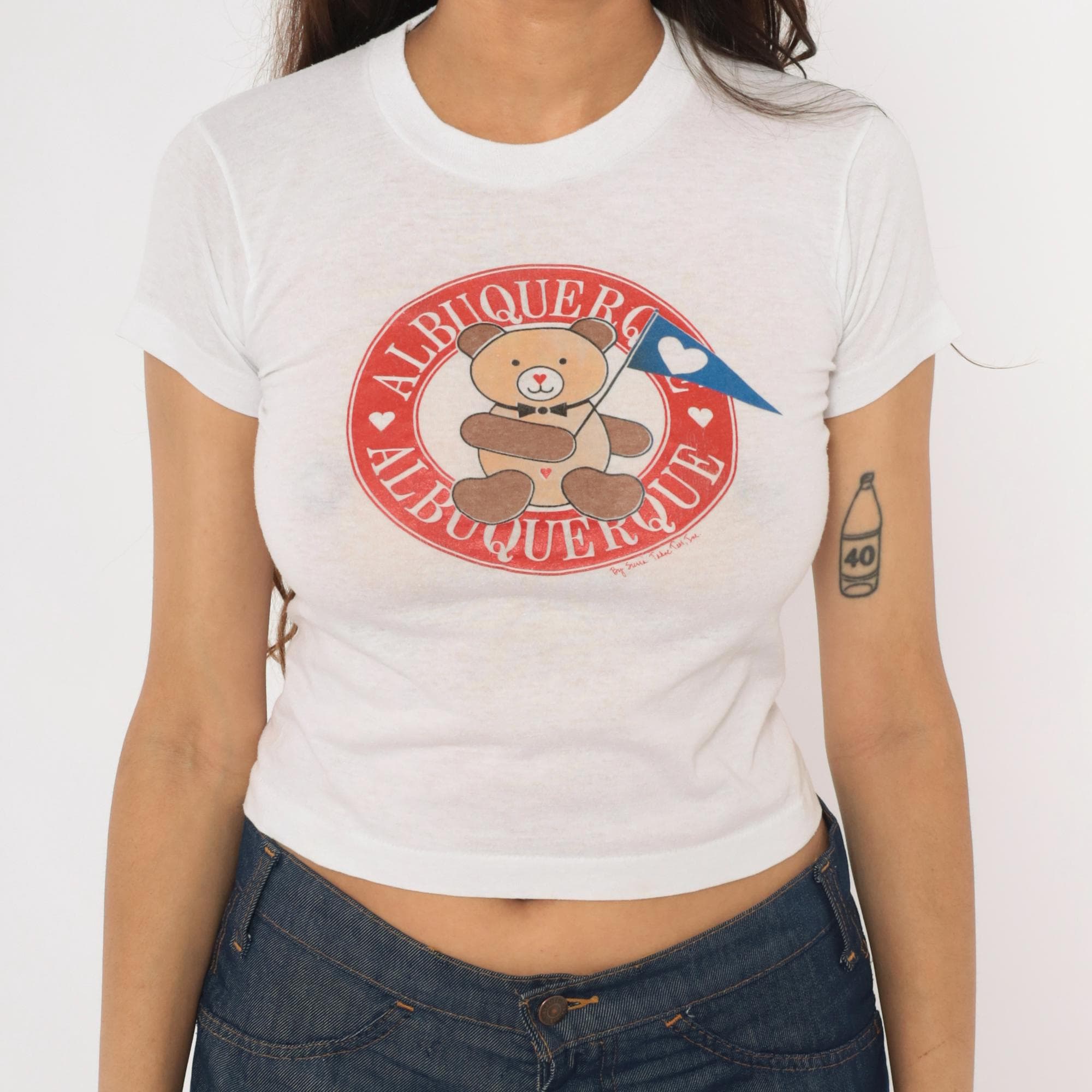 80s white cropped baby tee with a circular red Albuquerque graphic on the front, centered around a teddy bear holding a blue pennant flag with a heart. The bear wears a bow tie and sits within a round badge bordered by hearts and red lettering.