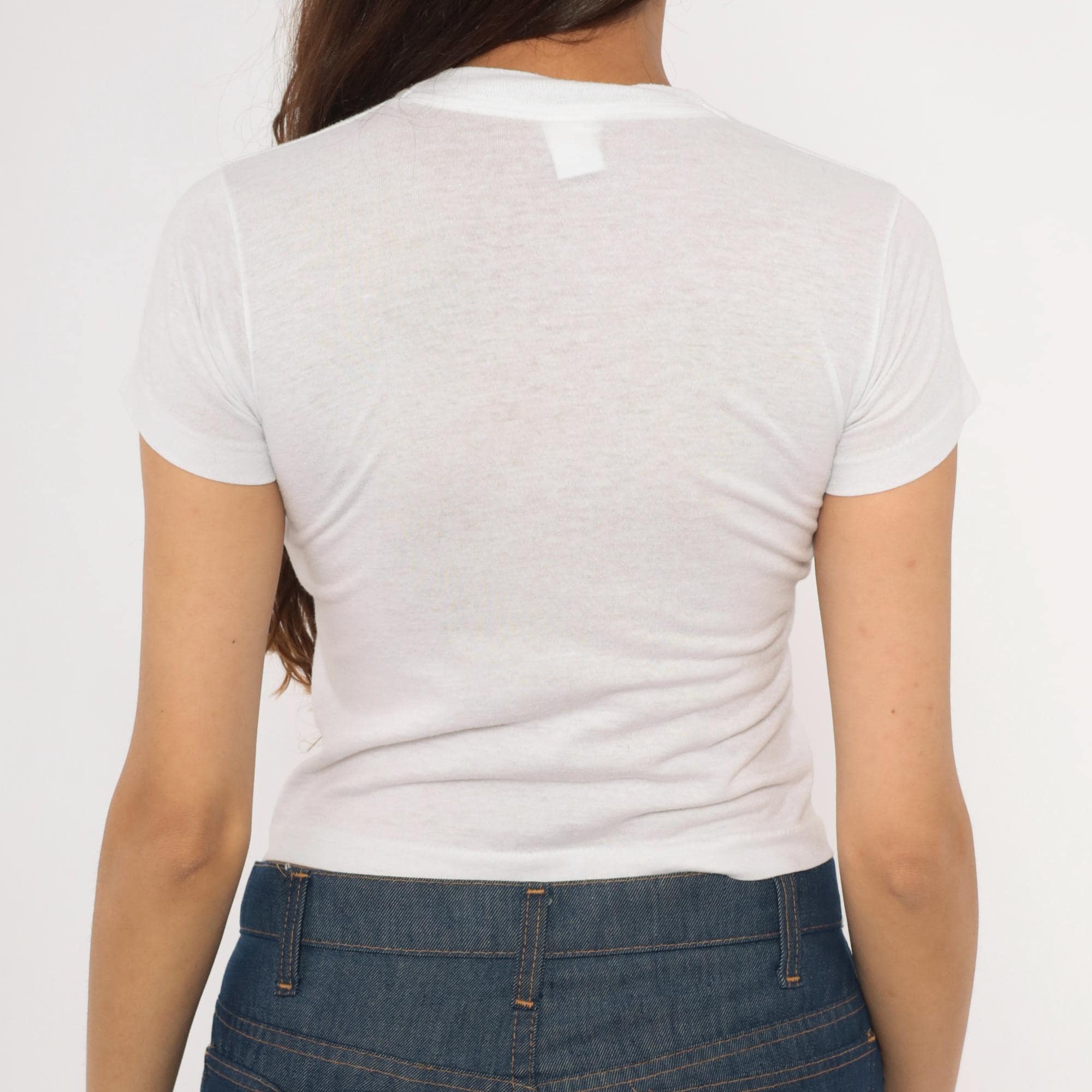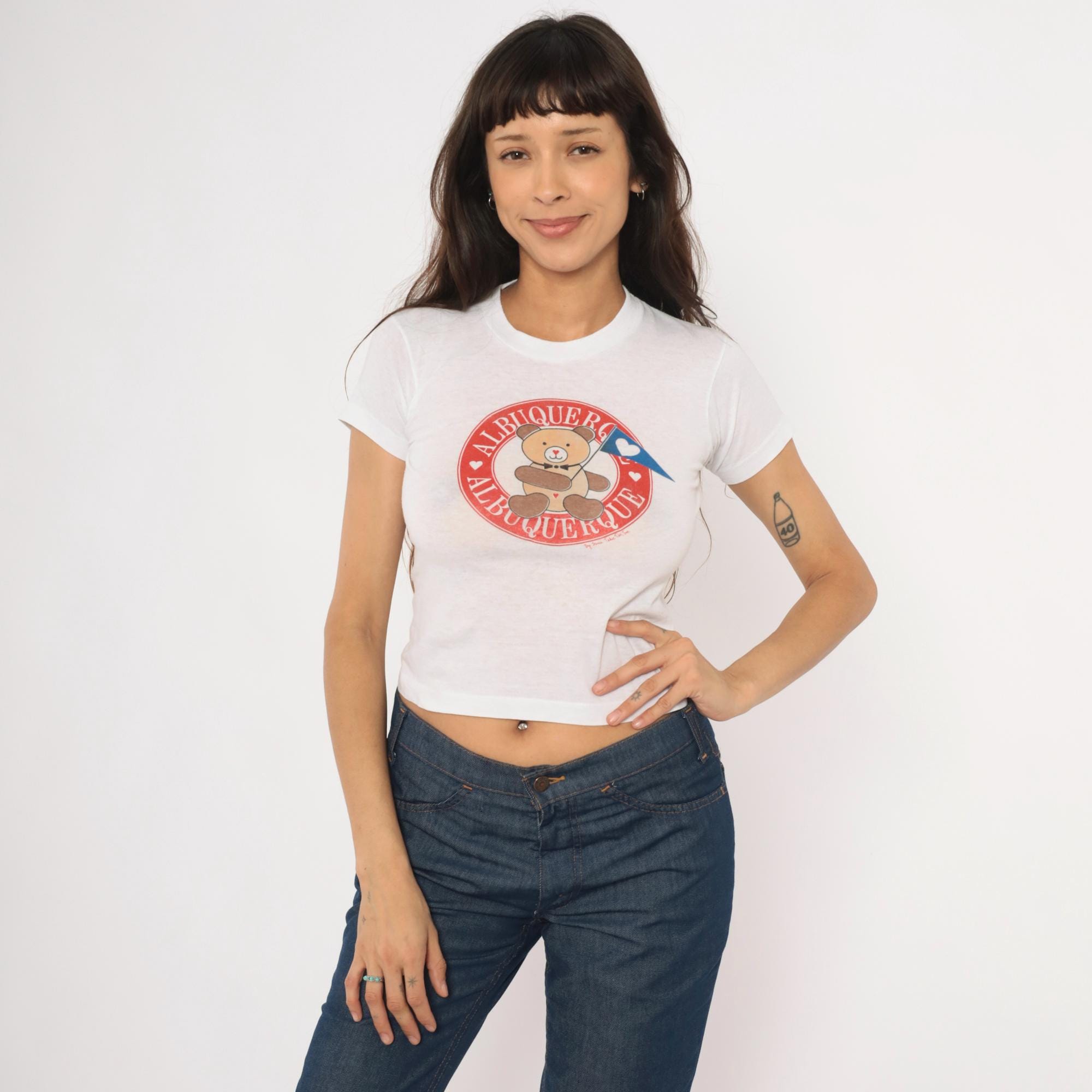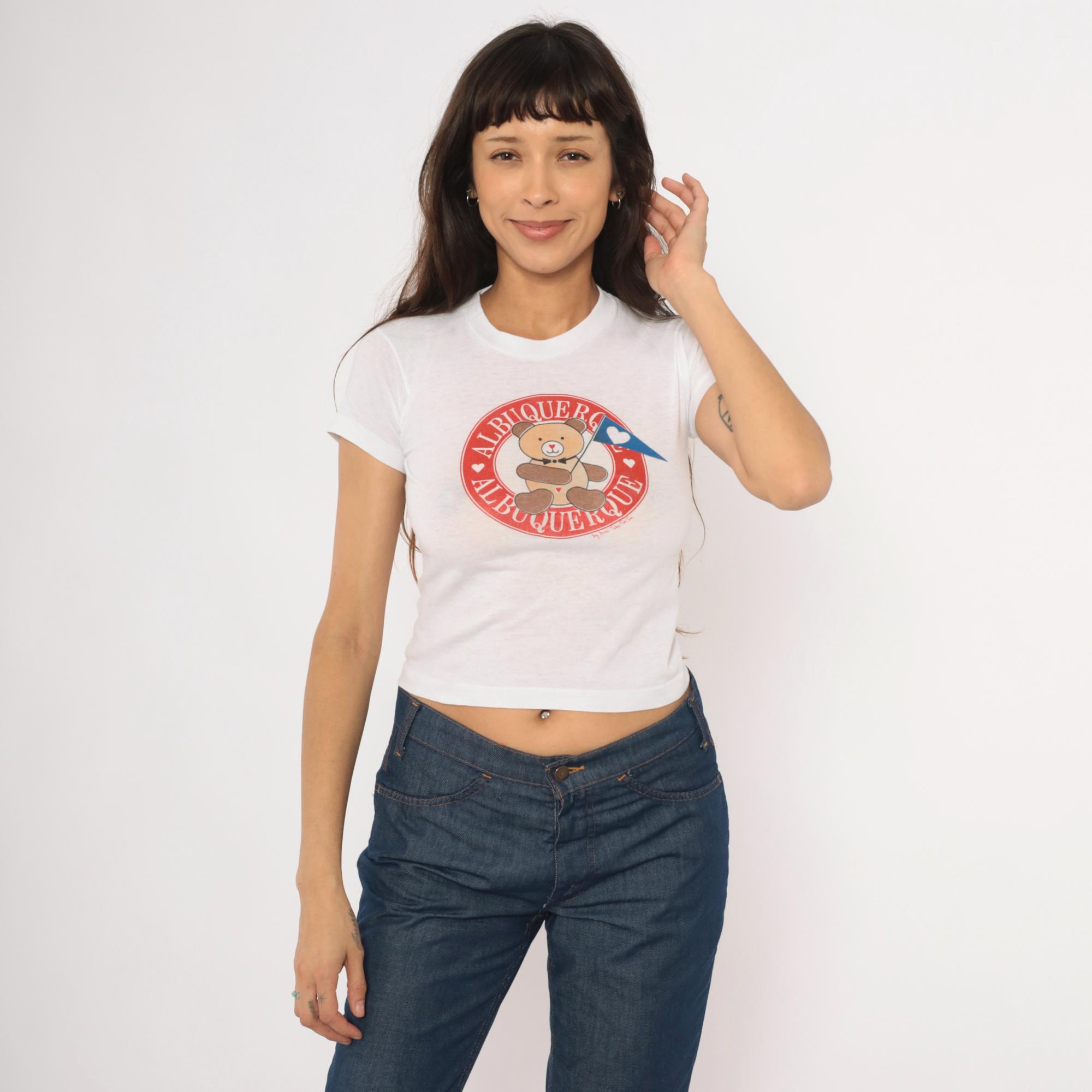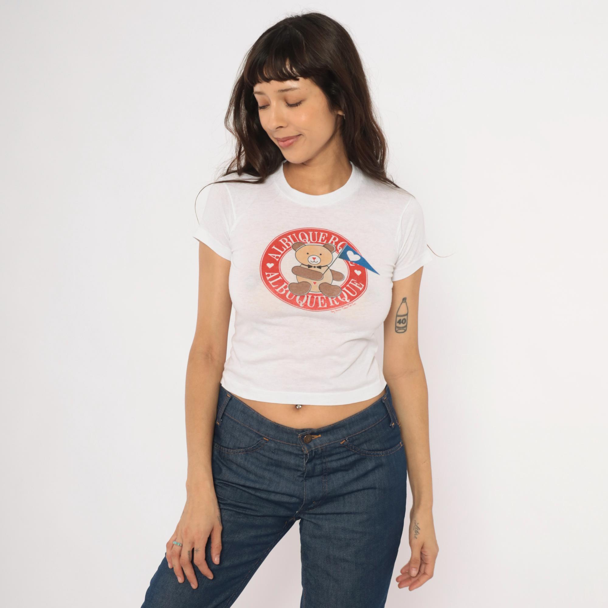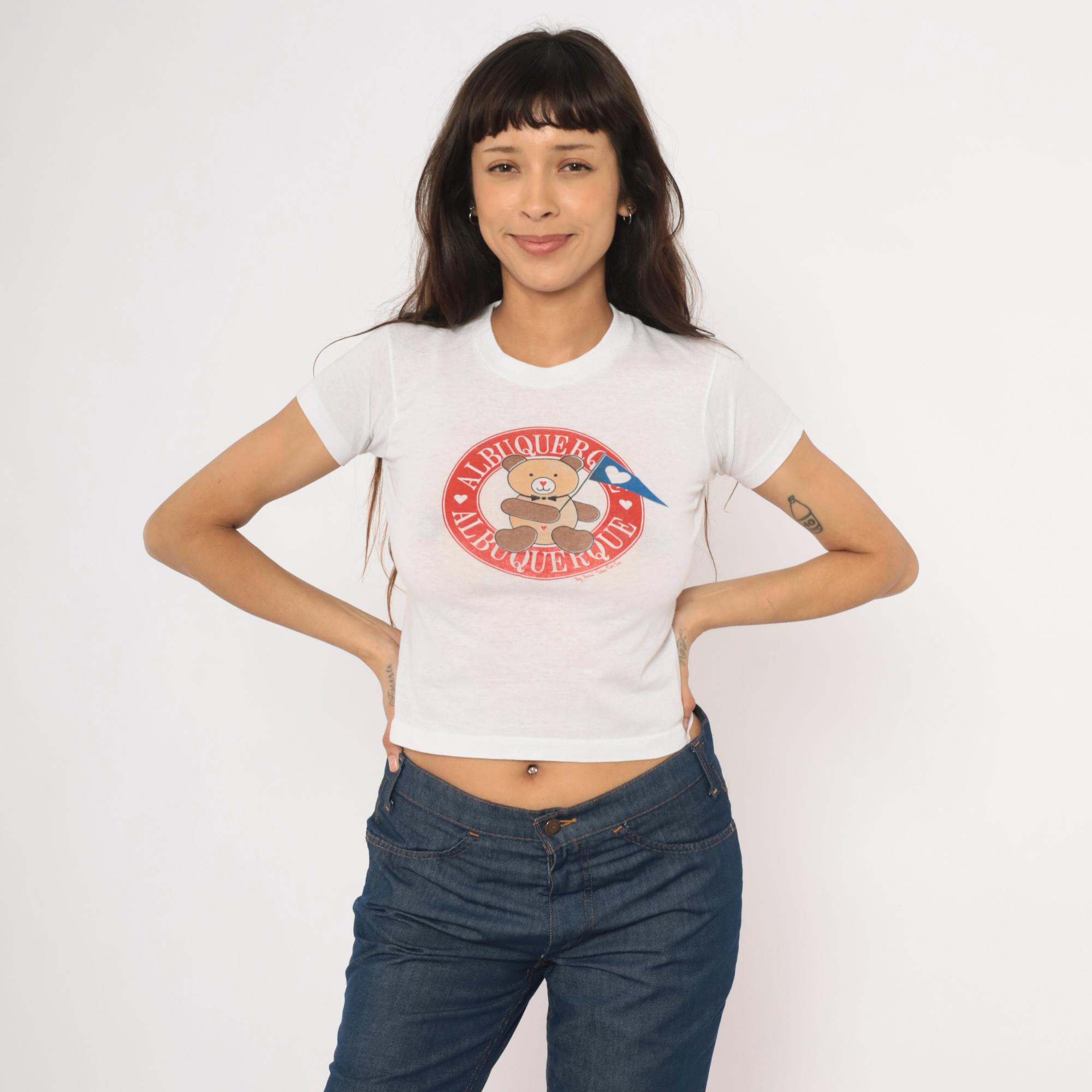 80s white cropped baby tee with a circular red Albuquerque graphic on the front, centered around a teddy bear holding a blue pennant flag with a heart. The bear wears a bow tie and sits within a round badge bordered by hearts and red lettering.