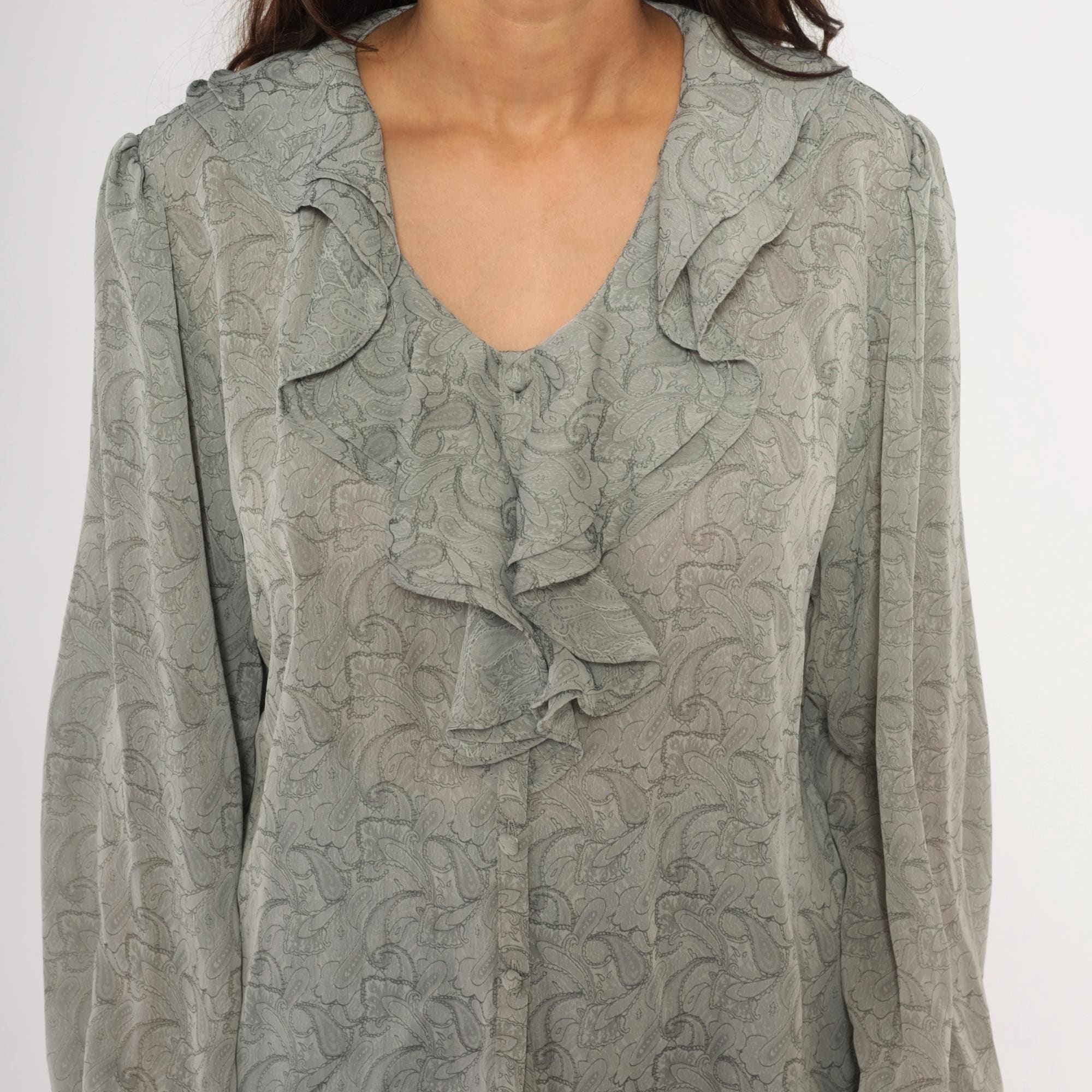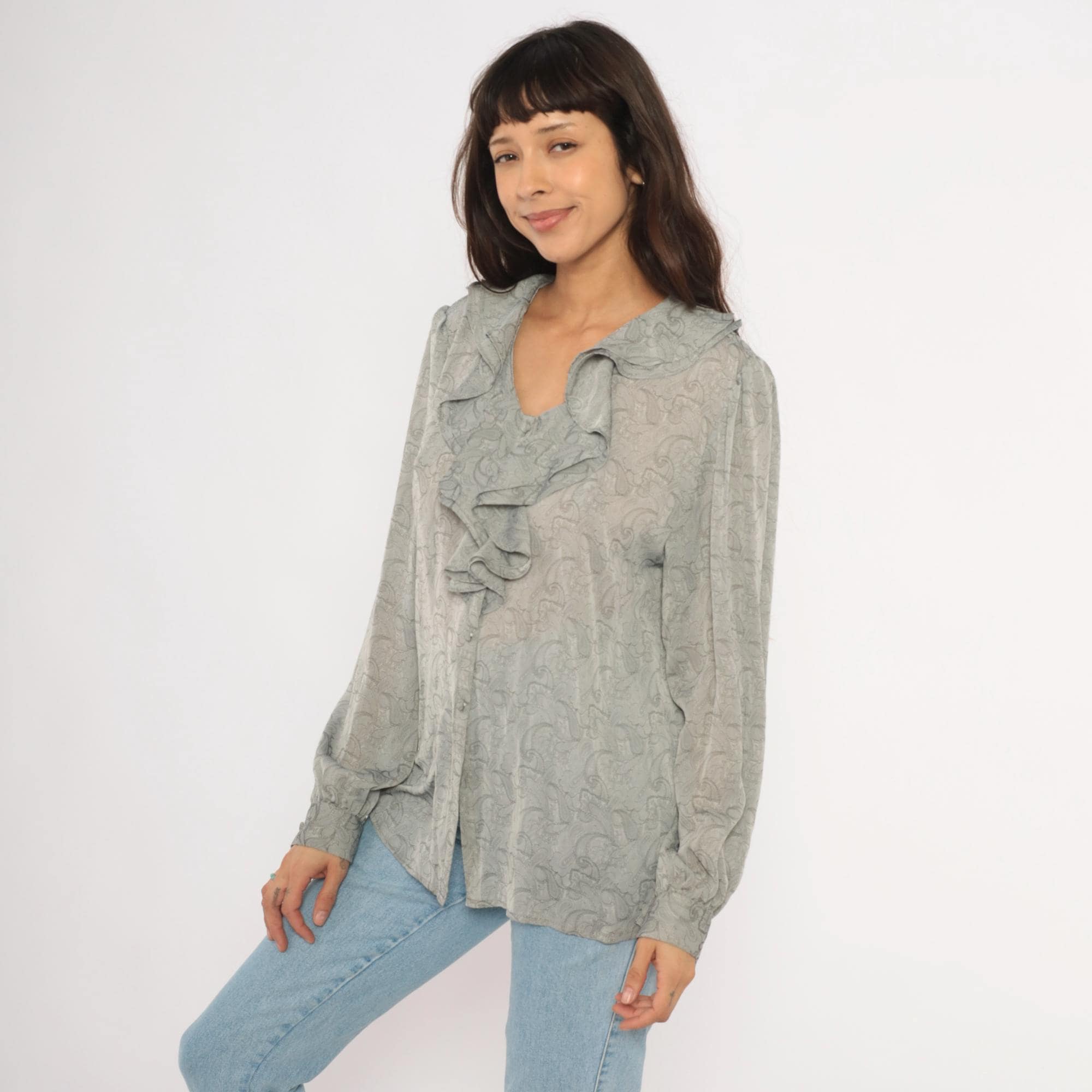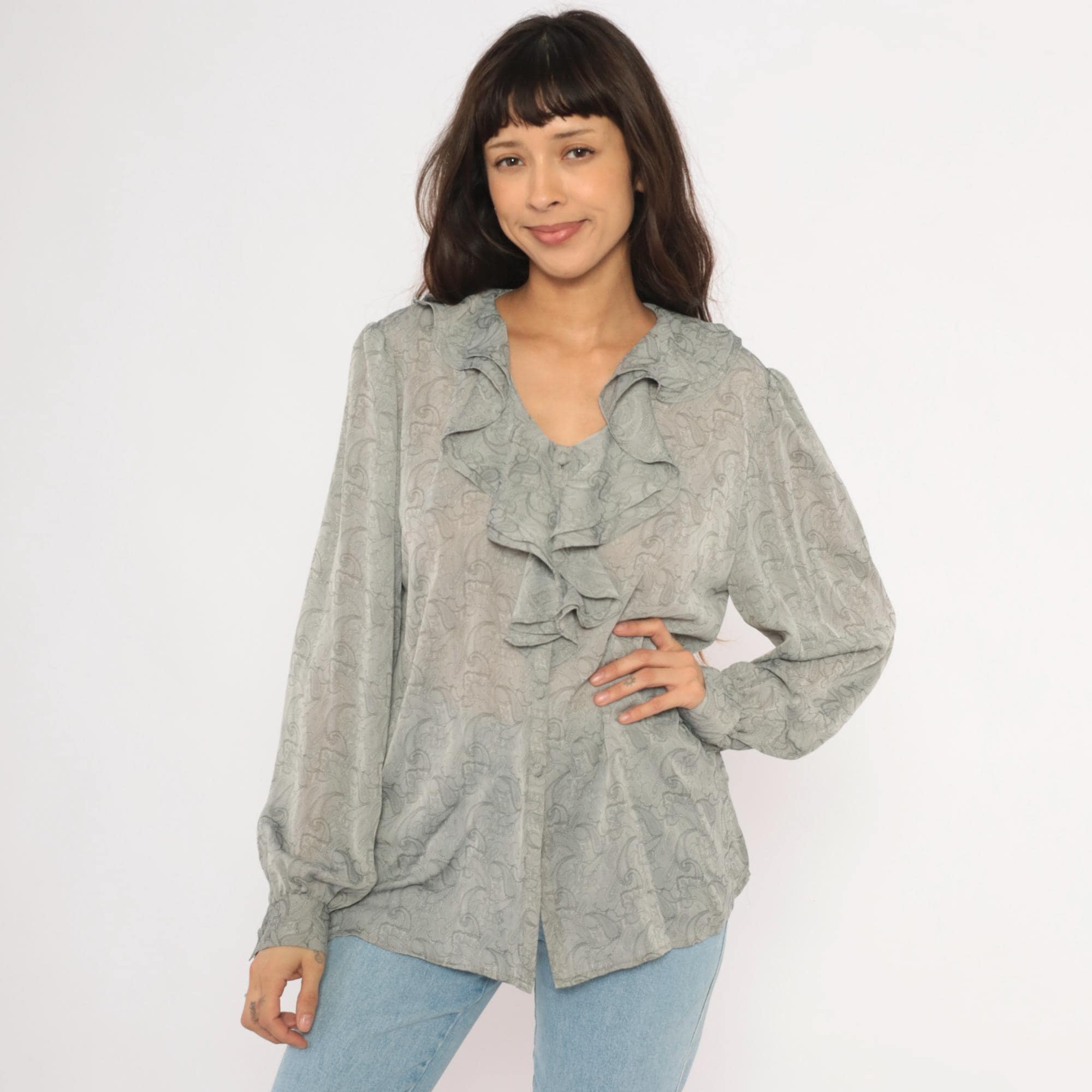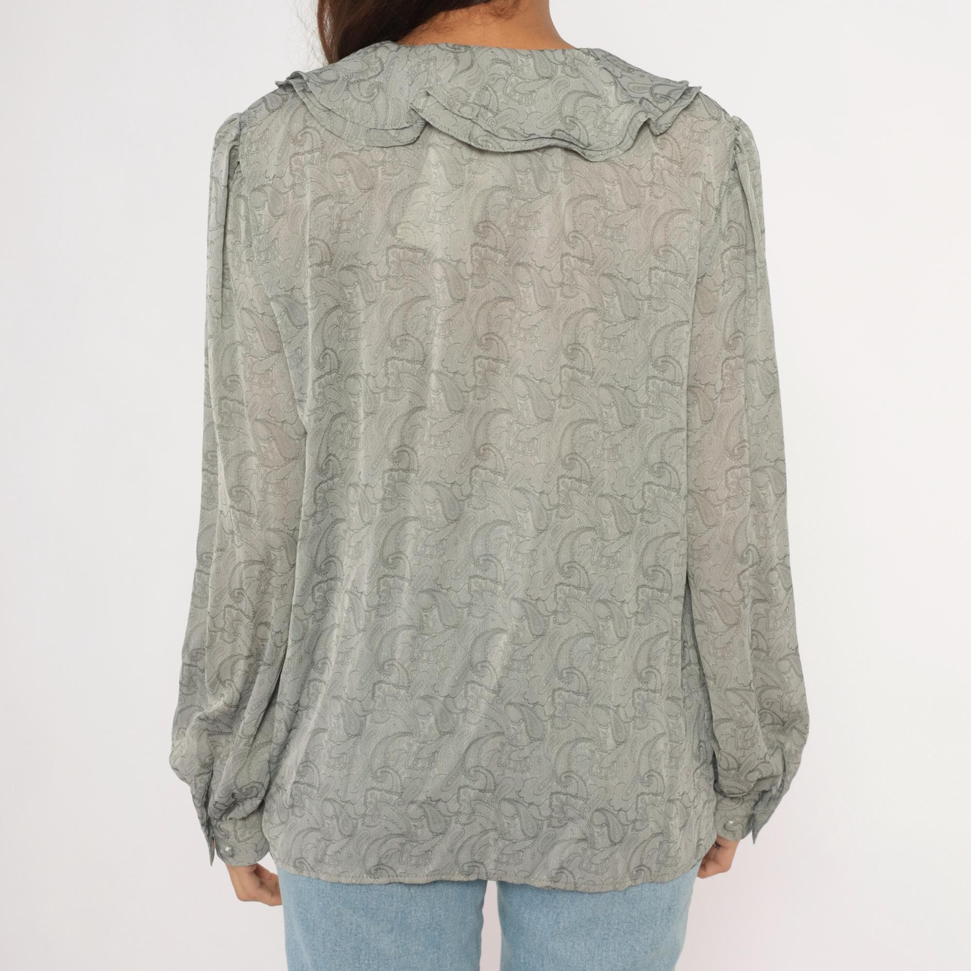 90s grey paisley blouse from Christie & Jill with cascading ruffle detail at the V-neckline. Button front closure with tone-on-tone paisley print in silver and ash tones across the entire garment. Long bishop-style sleeves with elasticized cuffs, and the ruffle extends from the neckline around to the back collar.