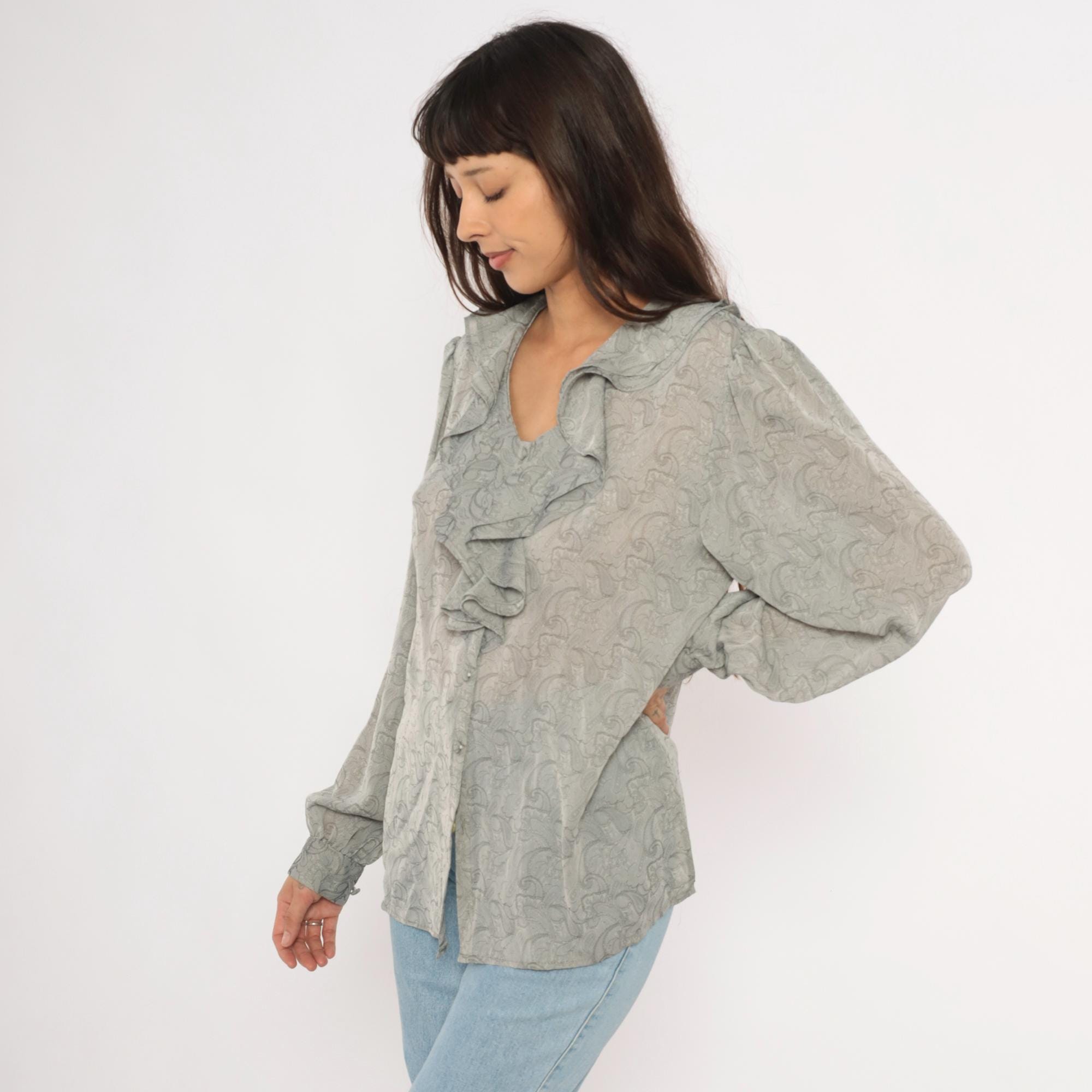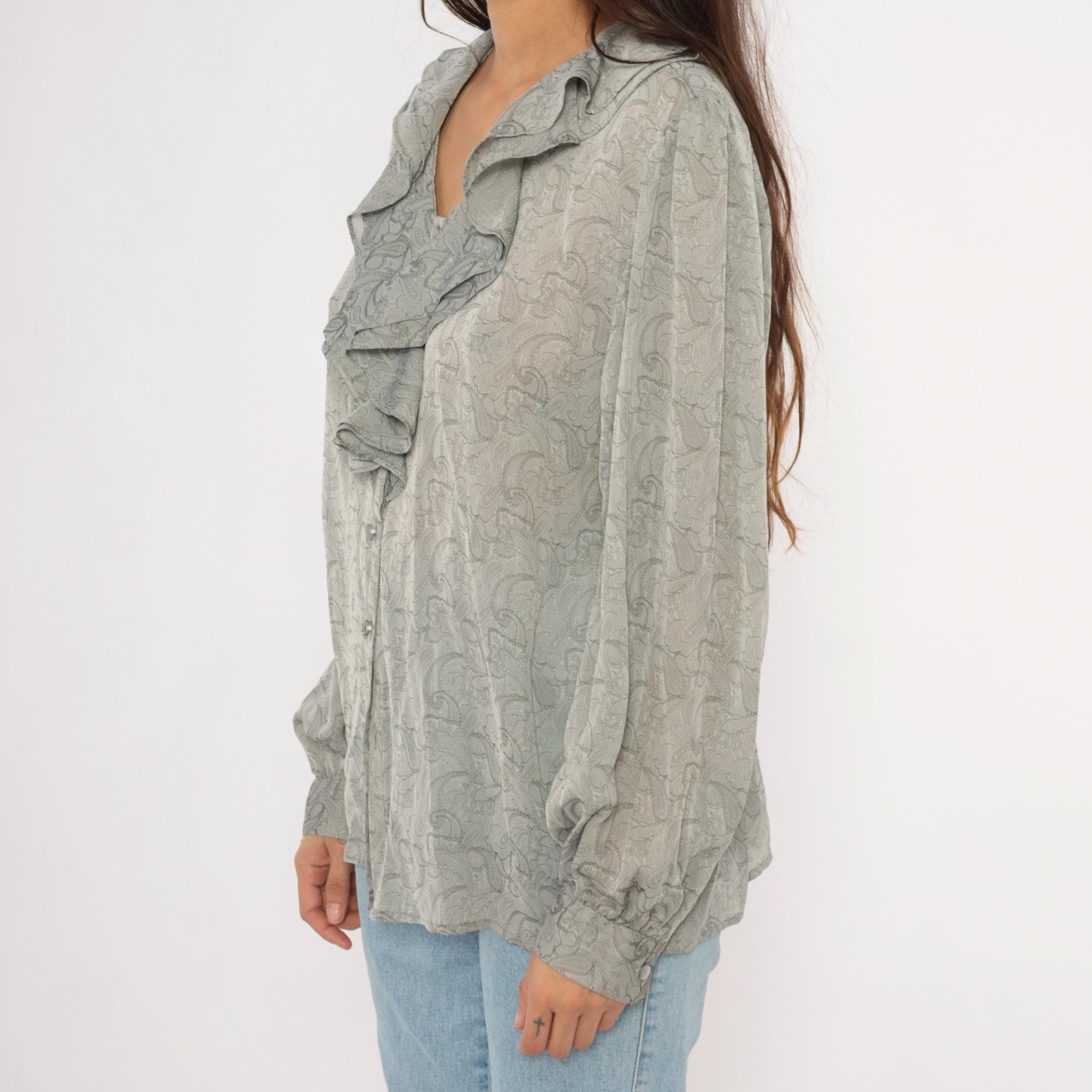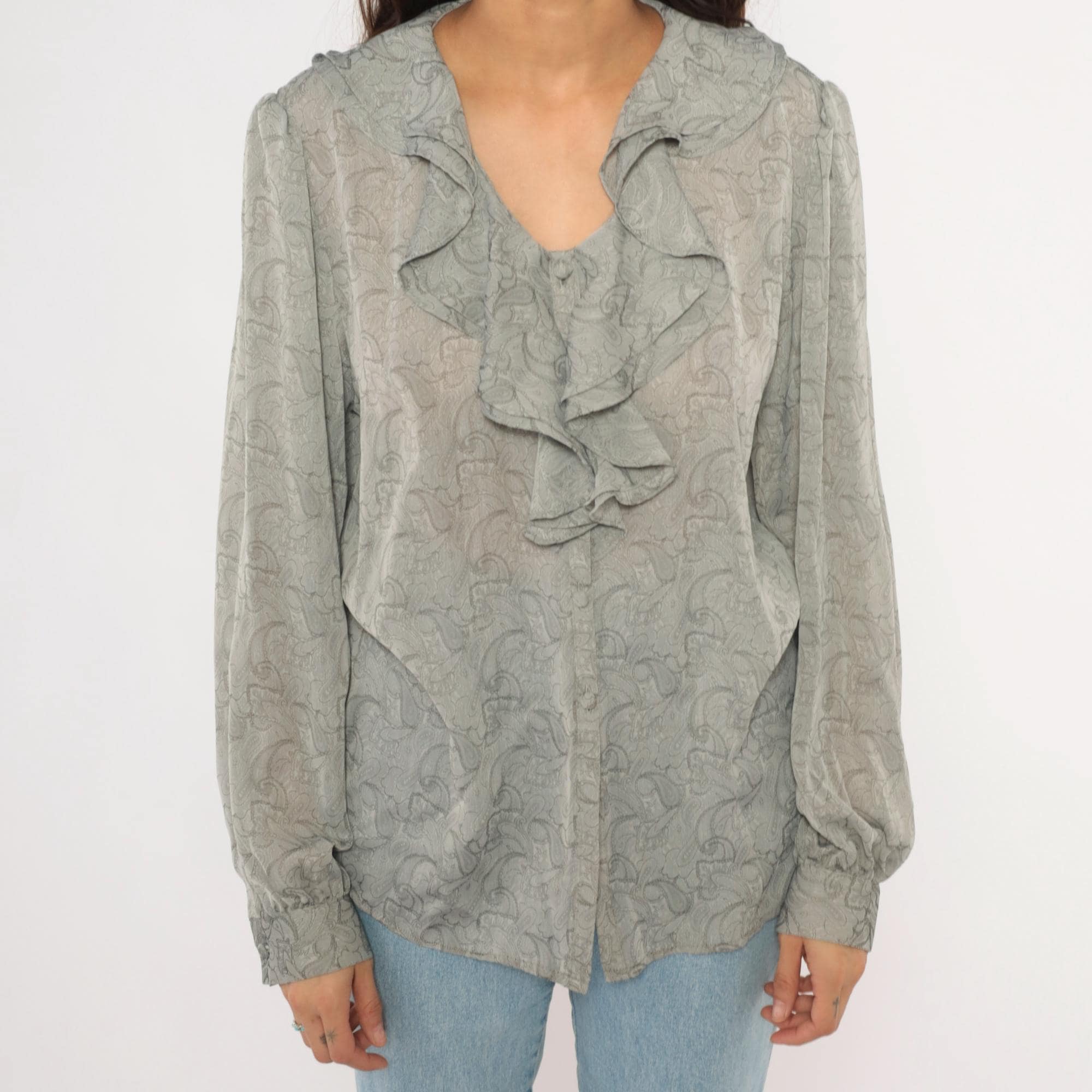 90s grey paisley blouse from Christie & Jill with cascading ruffle detail at the V-neckline. Button front closure with tone-on-tone paisley print in silver and ash tones across the entire garment. Long bishop-style sleeves with elasticized cuffs, and the ruffle extends from the neckline around to the back collar.