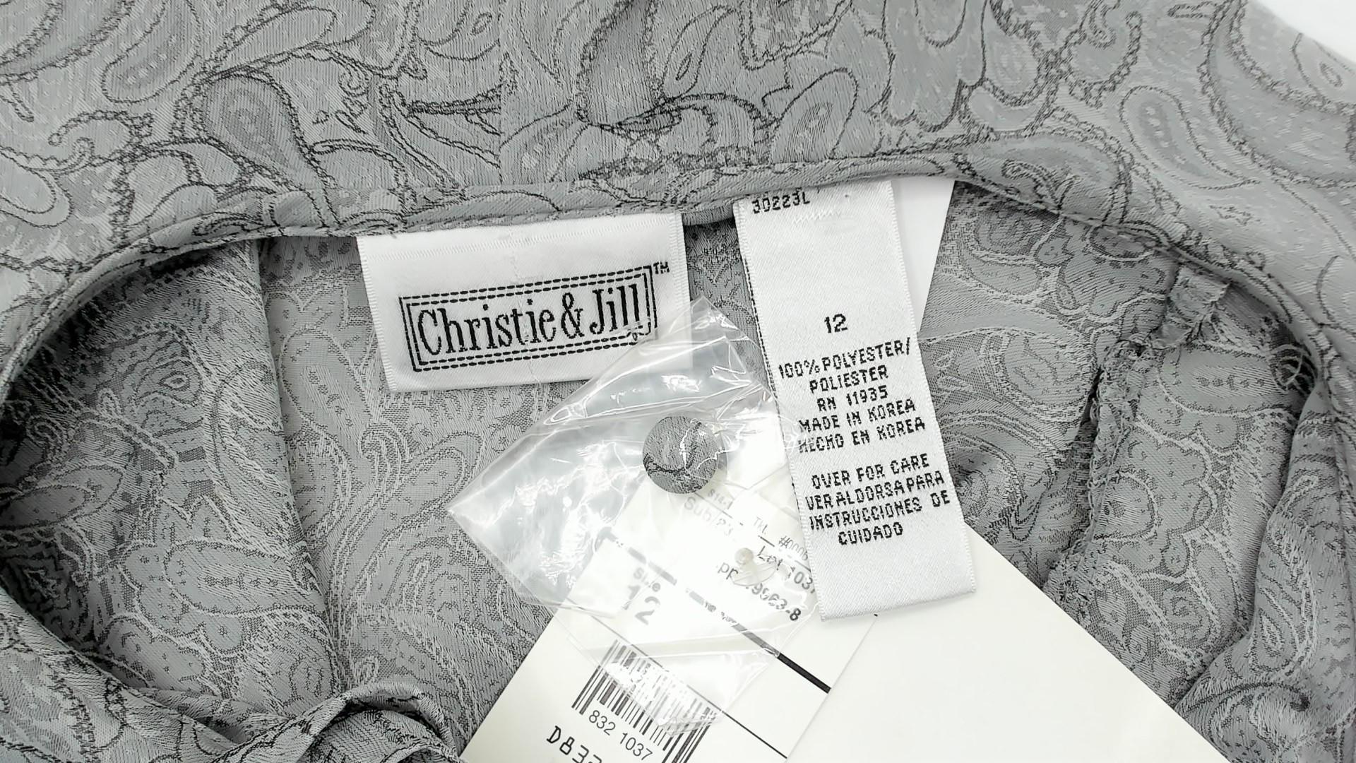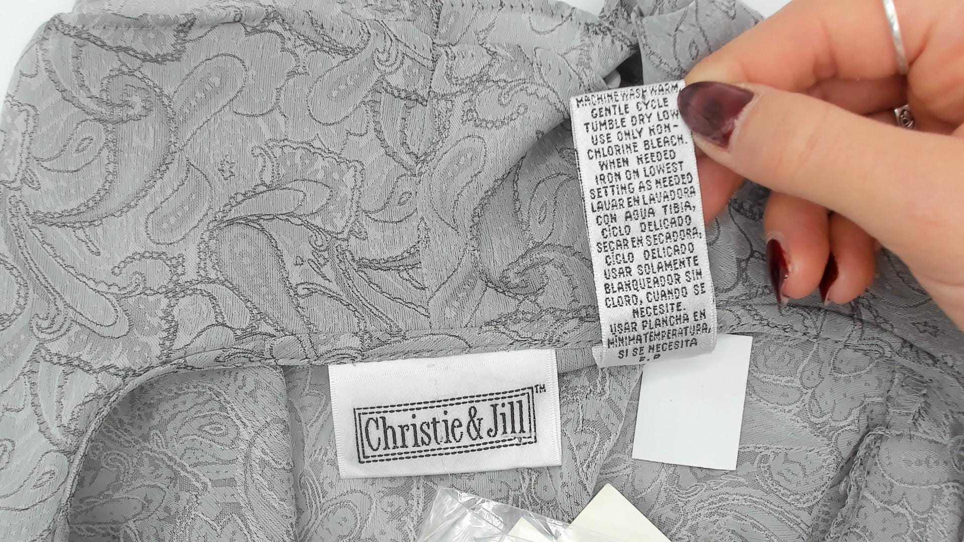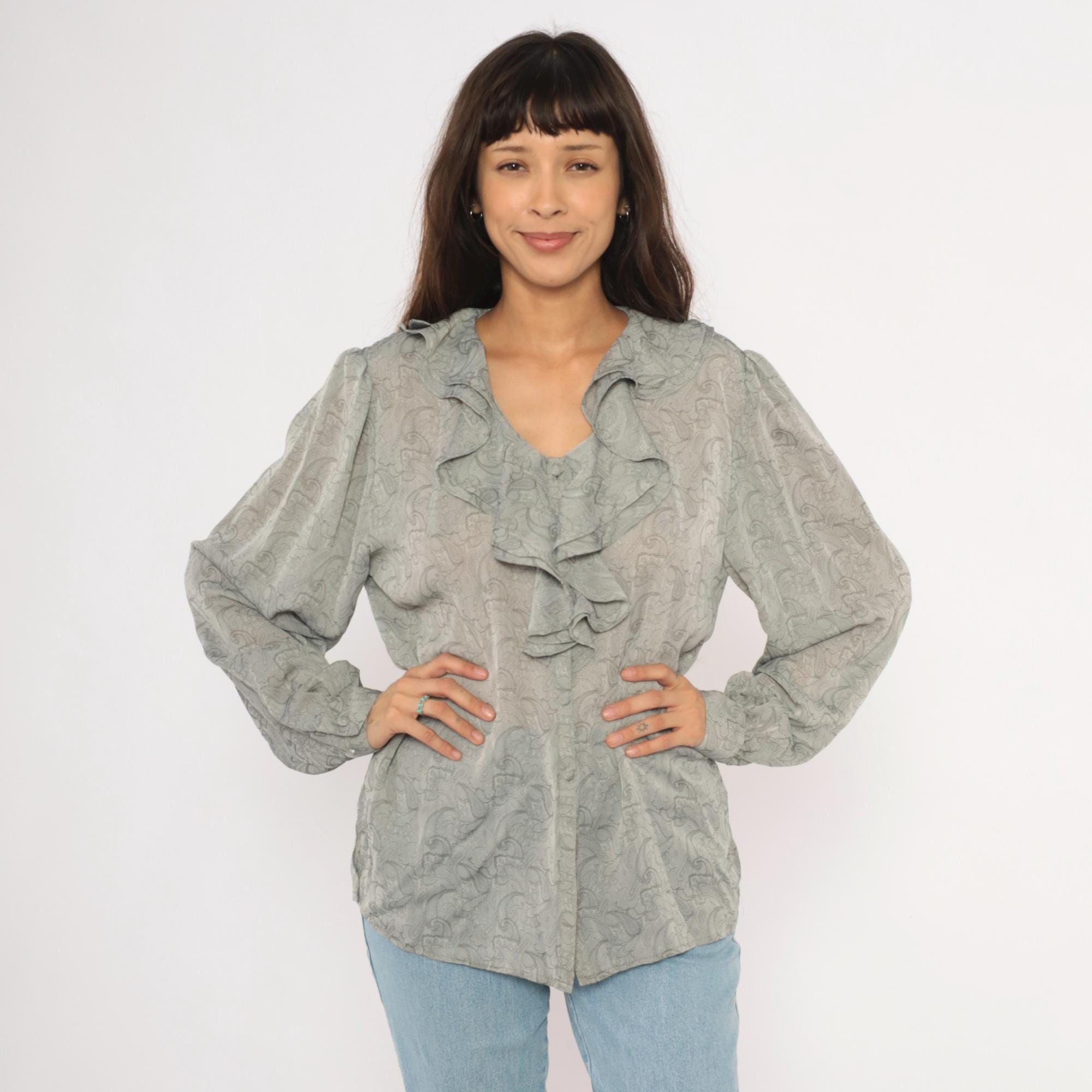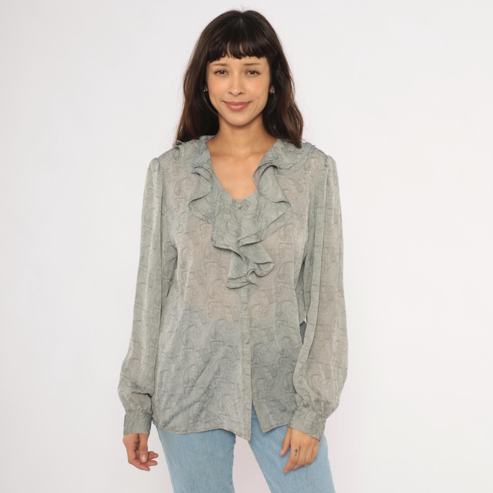 90s grey paisley blouse from Christie & Jill with cascading ruffle detail at the V-neckline. Button front closure with tone-on-tone paisley print in silver and ash tones across the entire garment. Long bishop-style sleeves with elasticized cuffs, and the ruffle extends from the neckline around to the back collar.