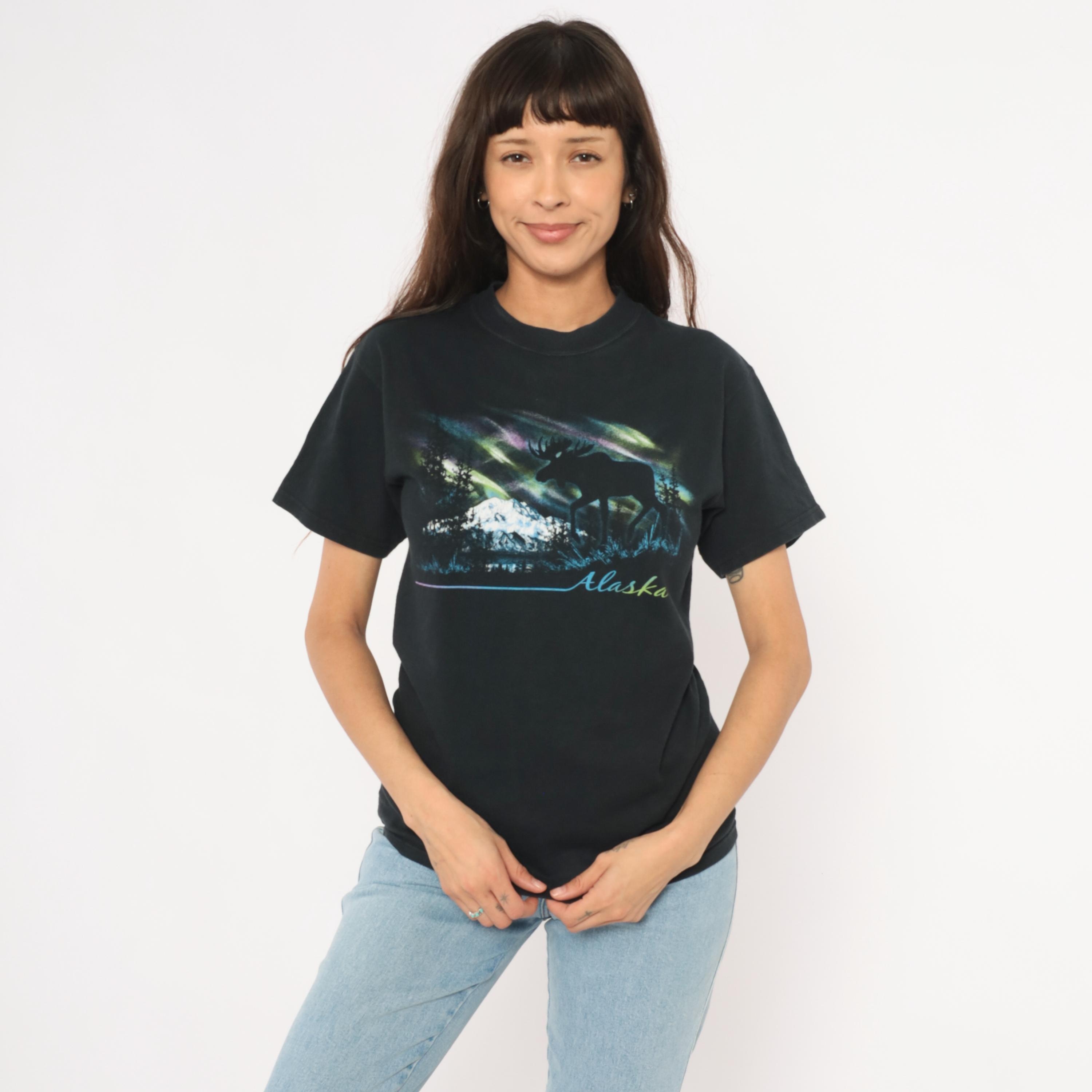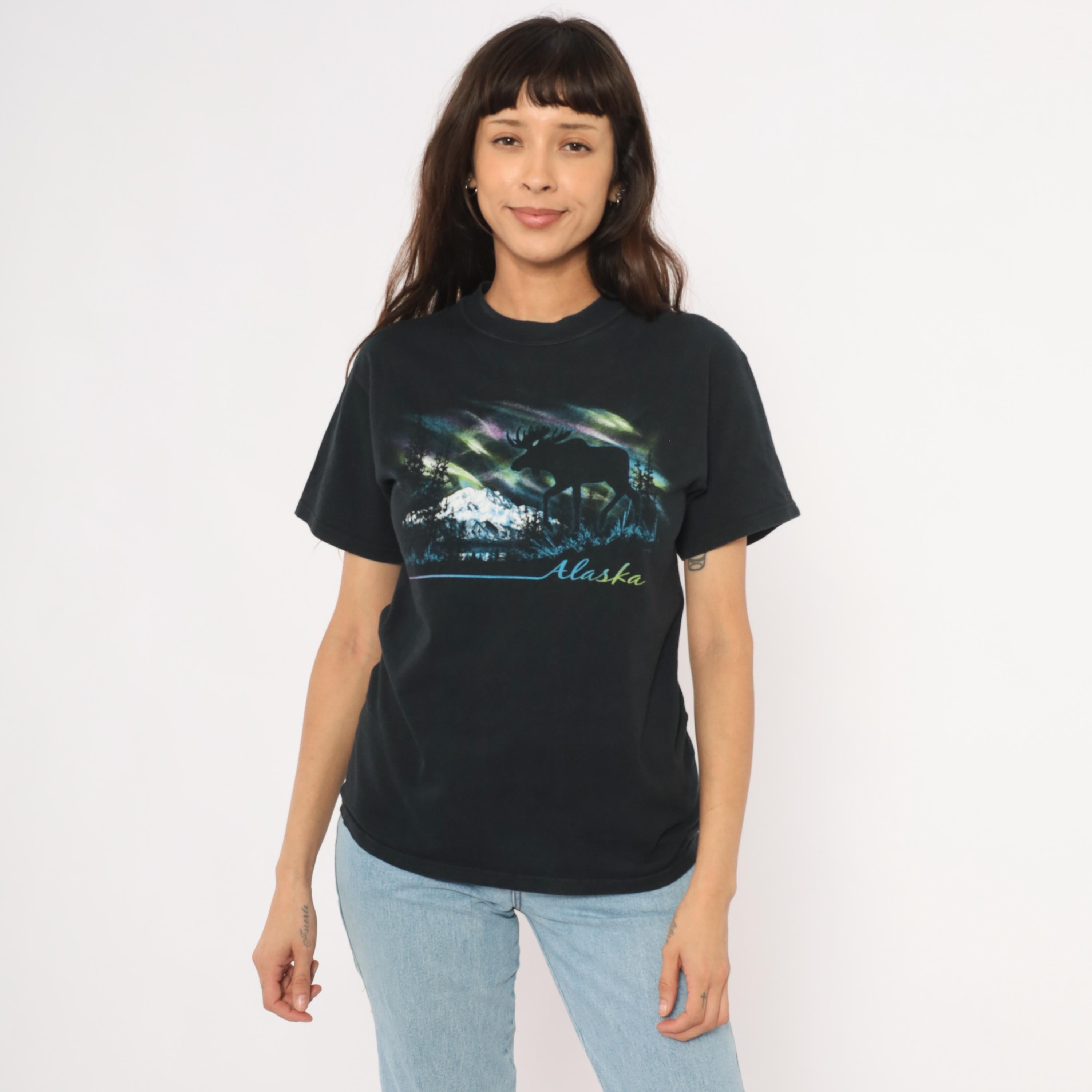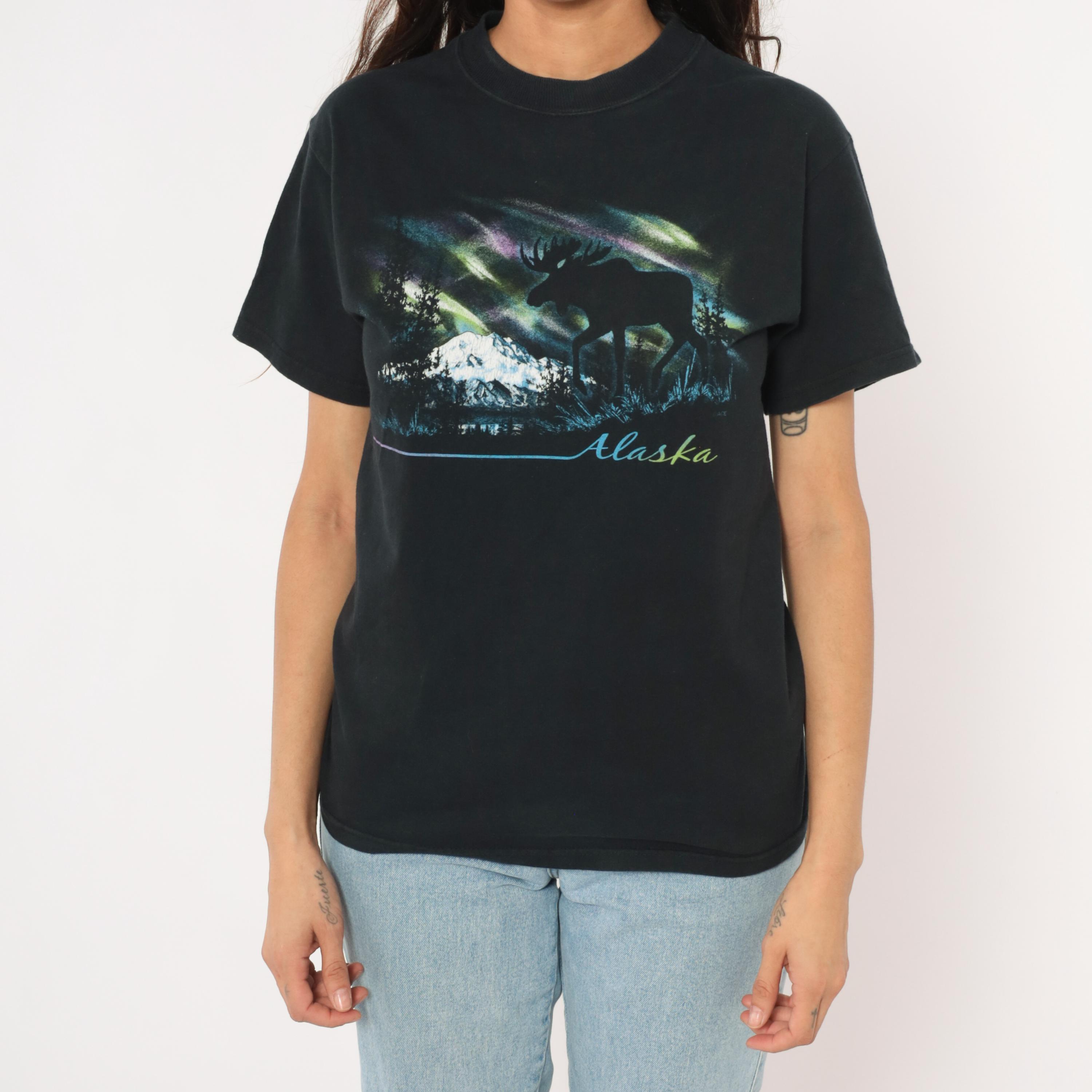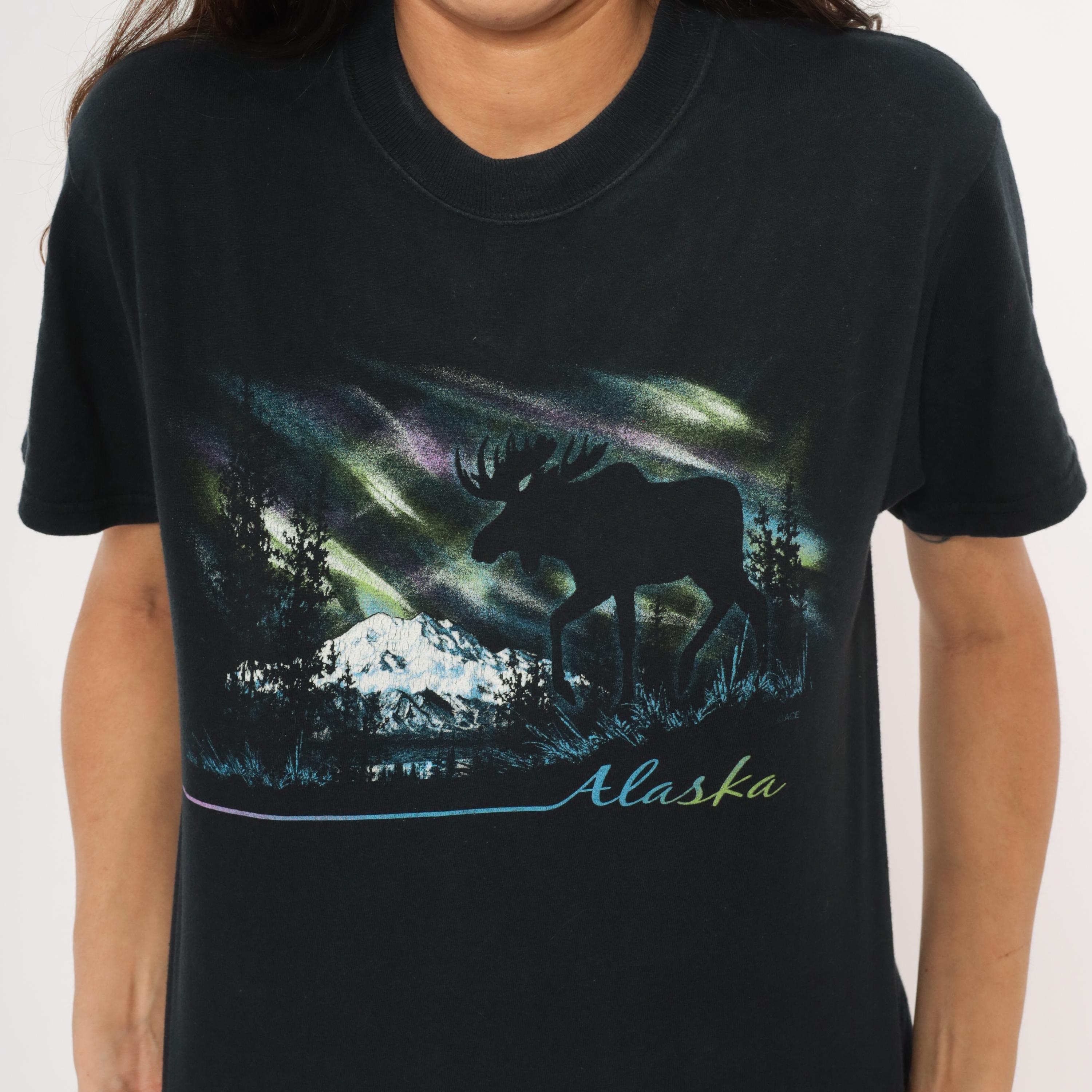 Black crew neck tee with a large front graphic depicting a moose silhouette against the aurora borealis, with snow-capped mountains, evergreen trees, and a lake reflection below. "Alaska" is printed in gradient script lettering beneath the scene, with a thin blue-to-pink horizontal line extending to the left.