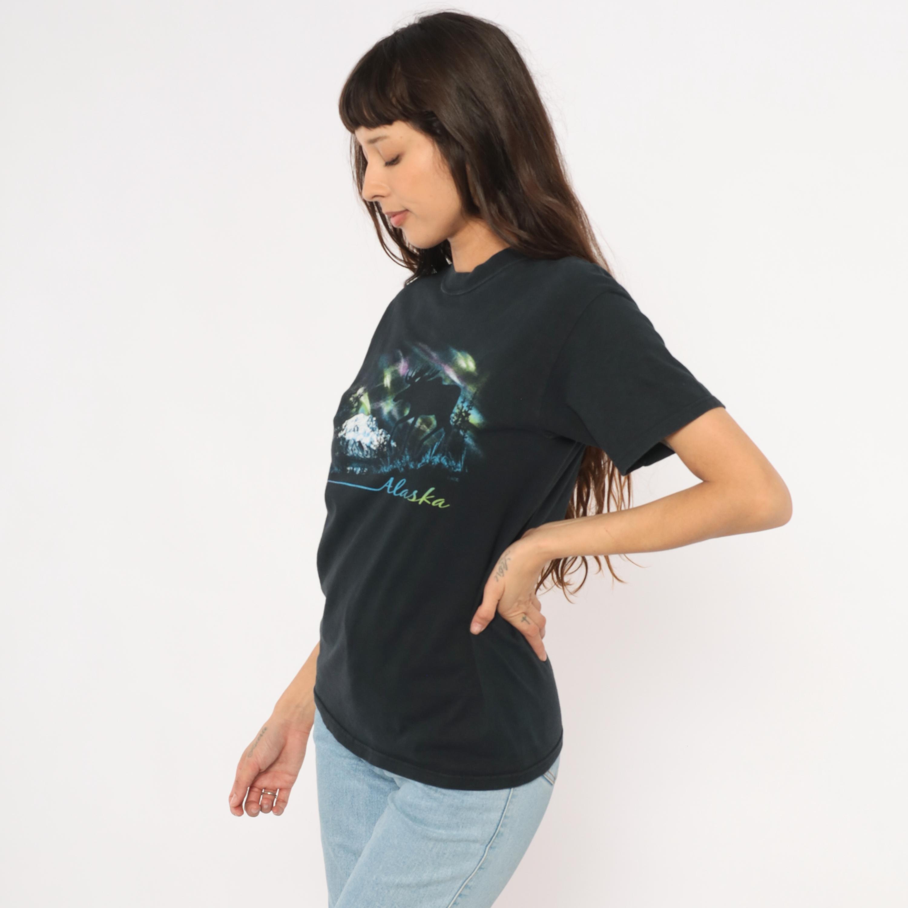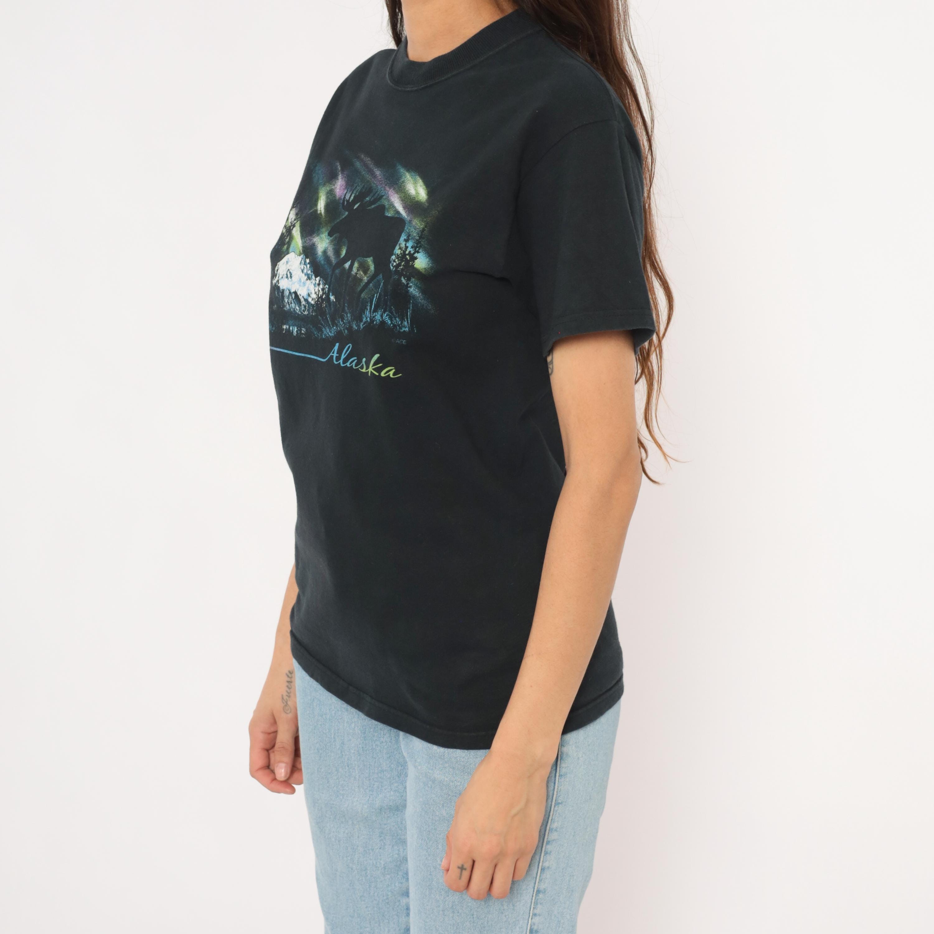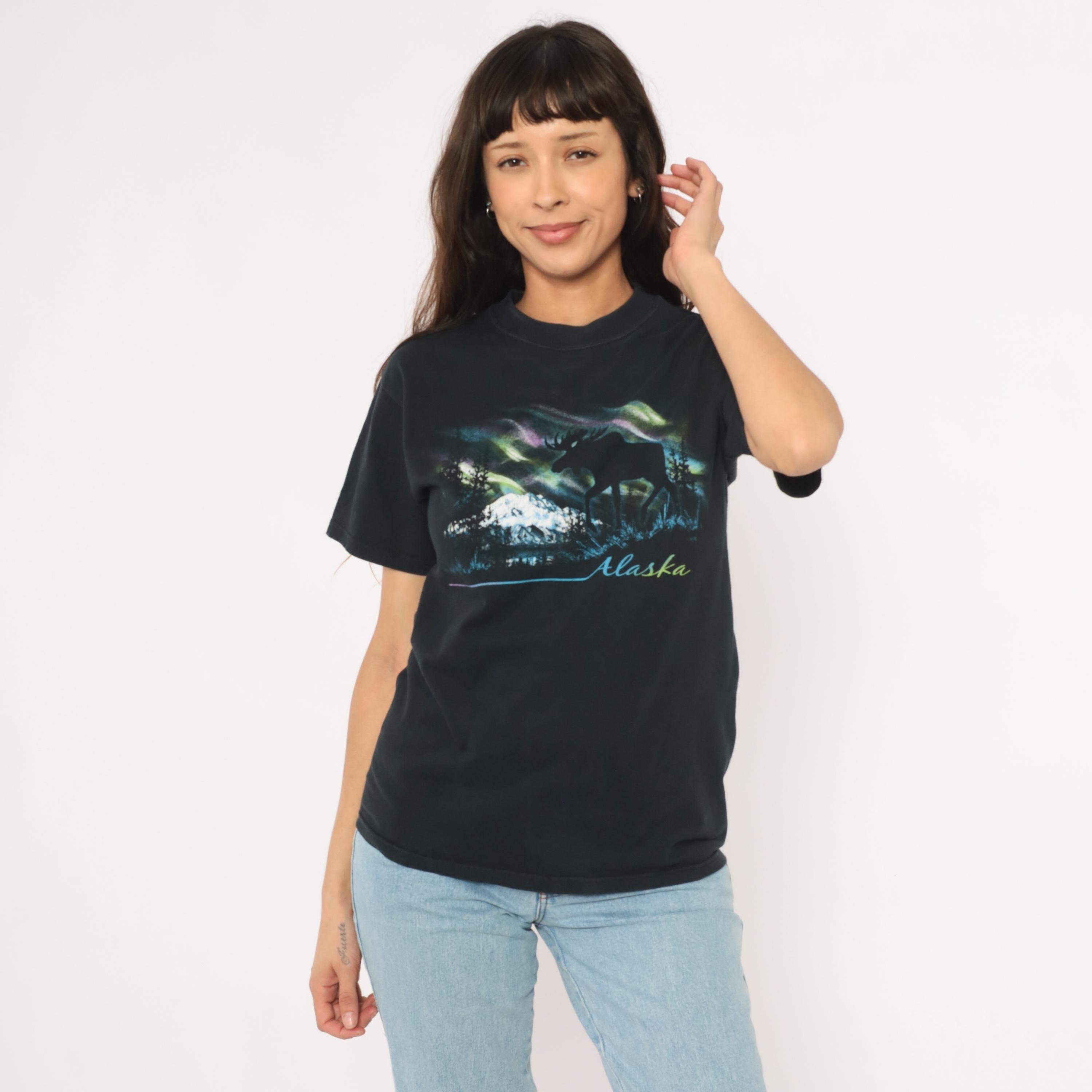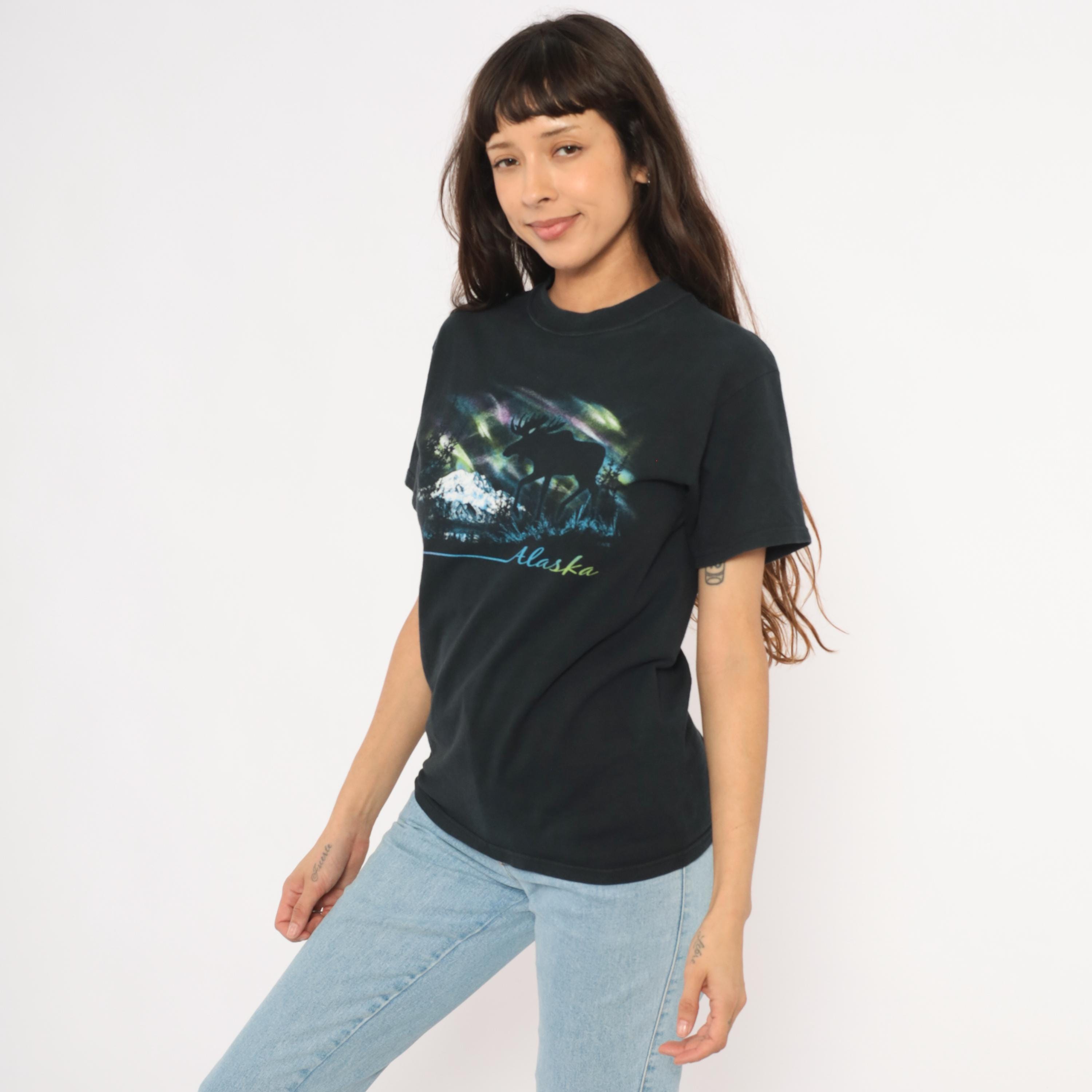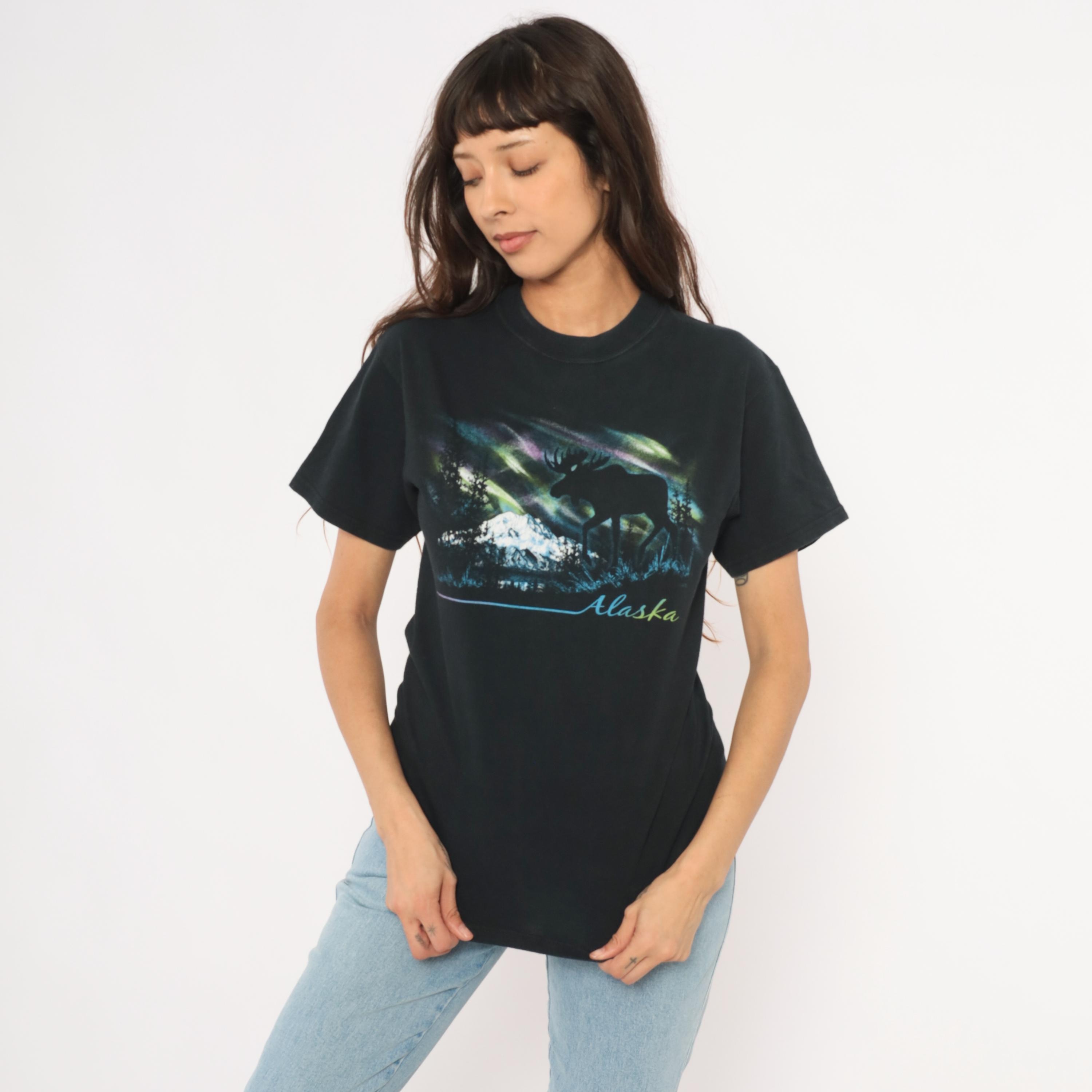 Black crew neck tee with a large front graphic depicting a moose silhouette against the aurora borealis, with snow-capped mountains, evergreen trees, and a lake reflection below. "Alaska" is printed in gradient script lettering beneath the scene, with a thin blue-to-pink horizontal line extending to the left.