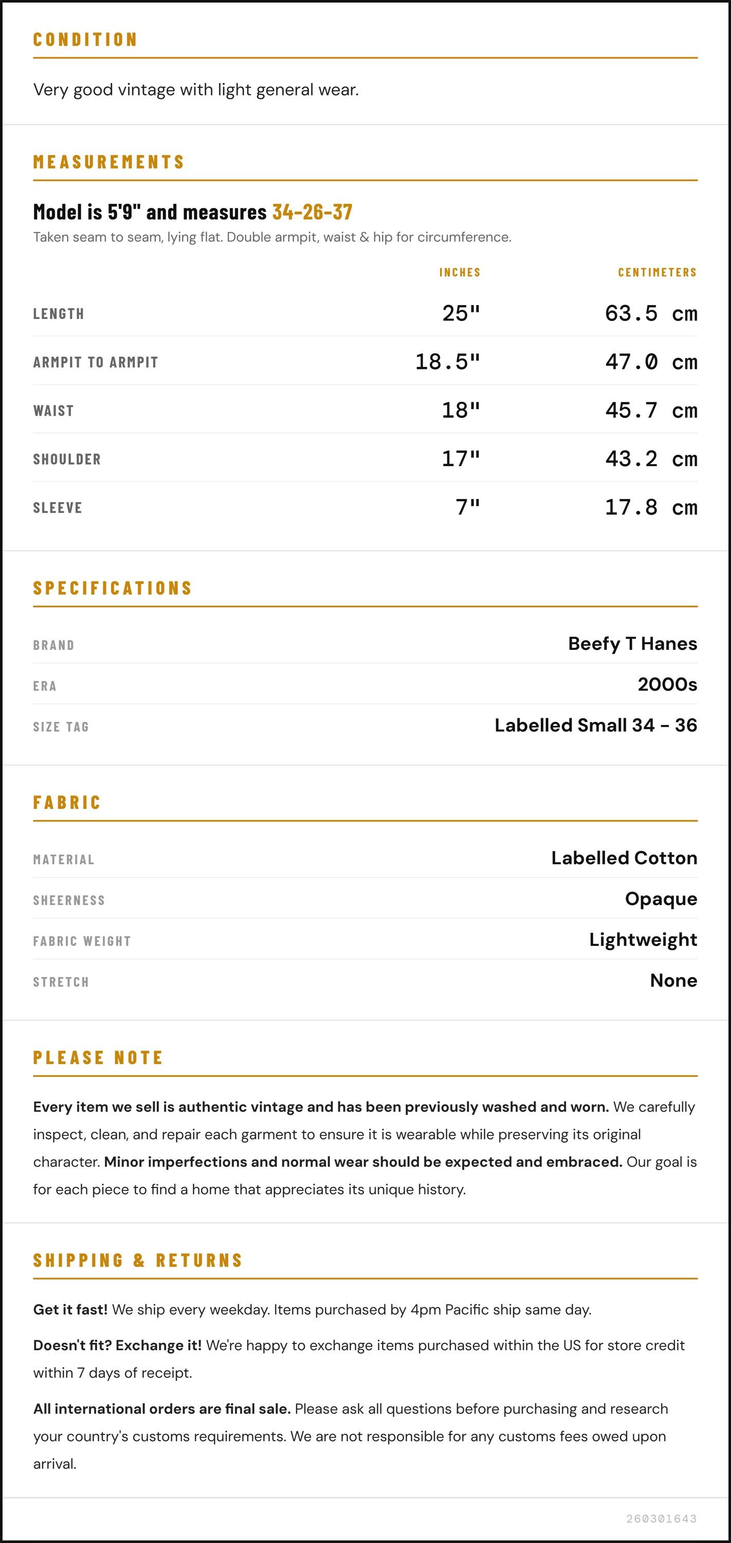 Vintage denim was usually made without any stretch, unlike modern jeans. Check the measurements to ensure proper fit, and remember to give yourself a little wiggle room in the waist and hips, depending on your preferred fit.