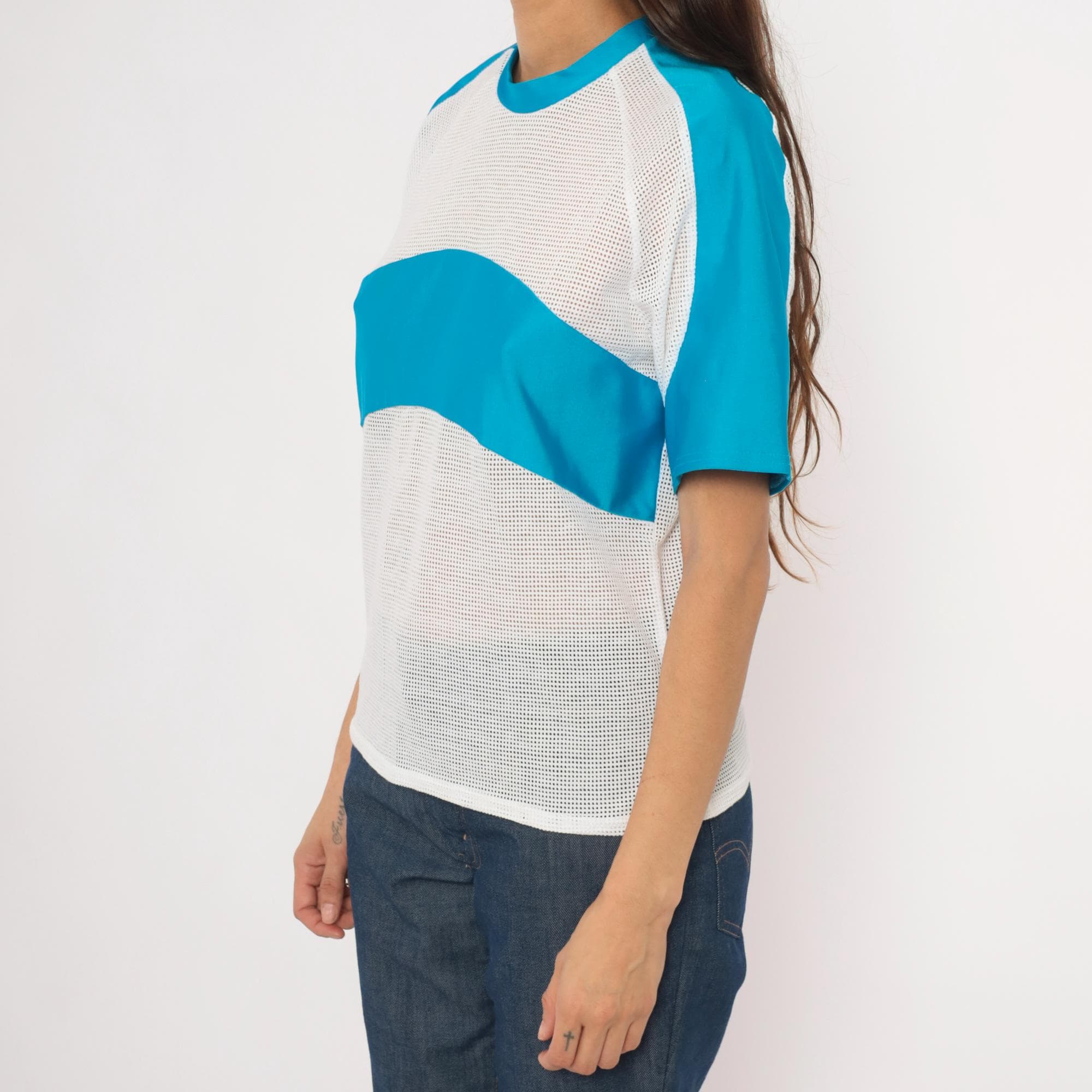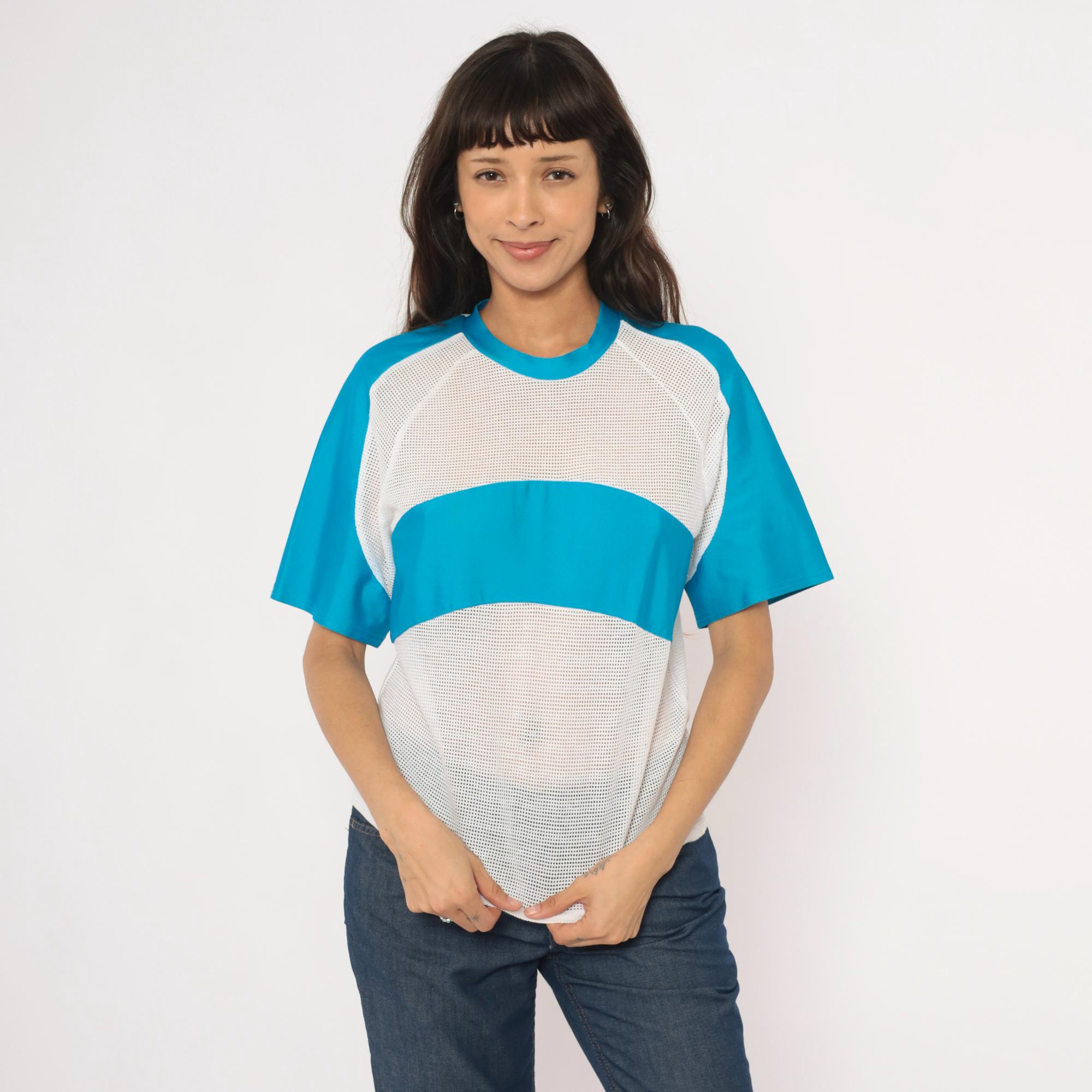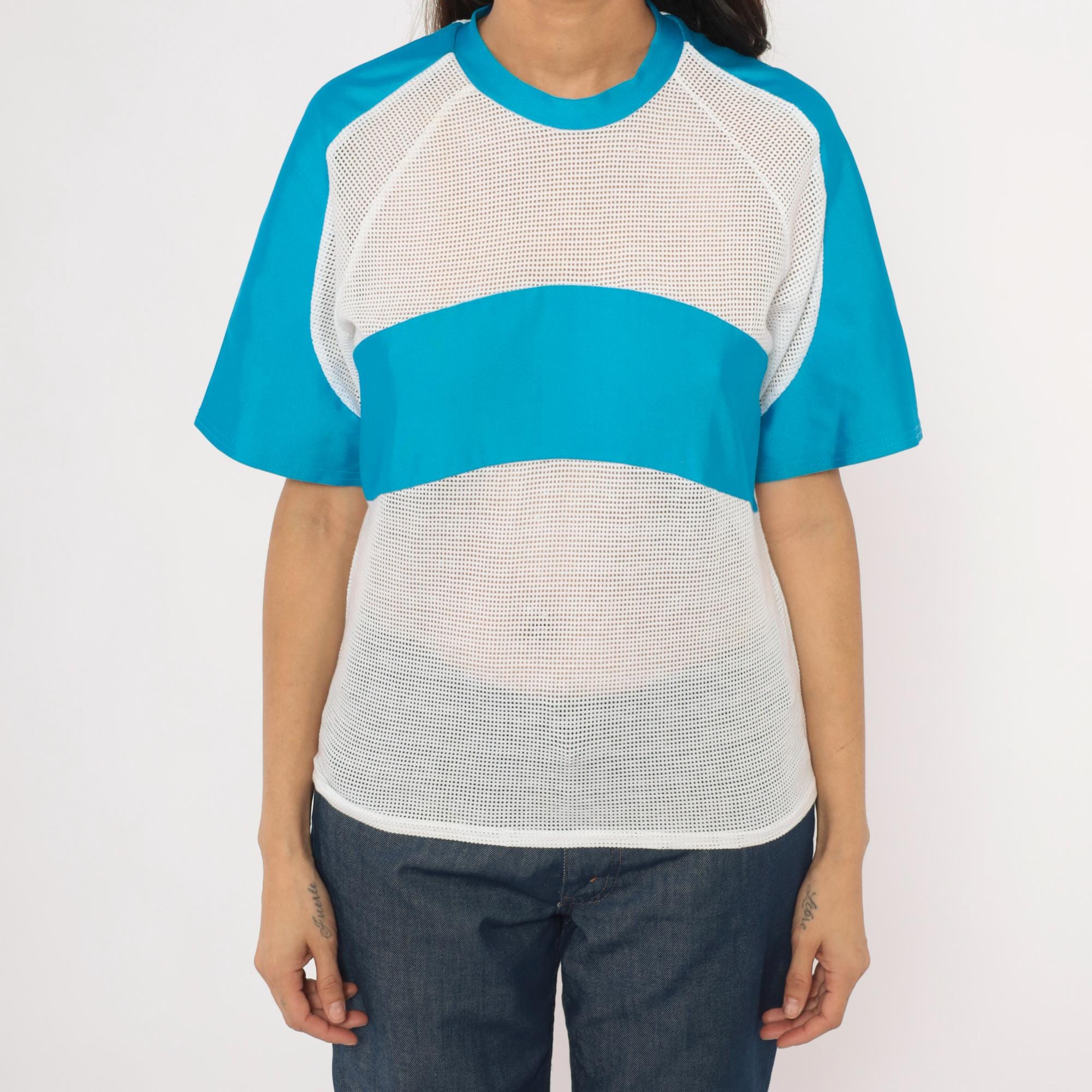 90s color block tee from Kanu with white mesh body panels and sky blue solid raglan sleeves. Crew neck with blue ribbed collar, a horizontal blue band across the chest breaking up the mesh sections. The back is entirely white mesh with raglan seam detailing and visible seam construction throughout.