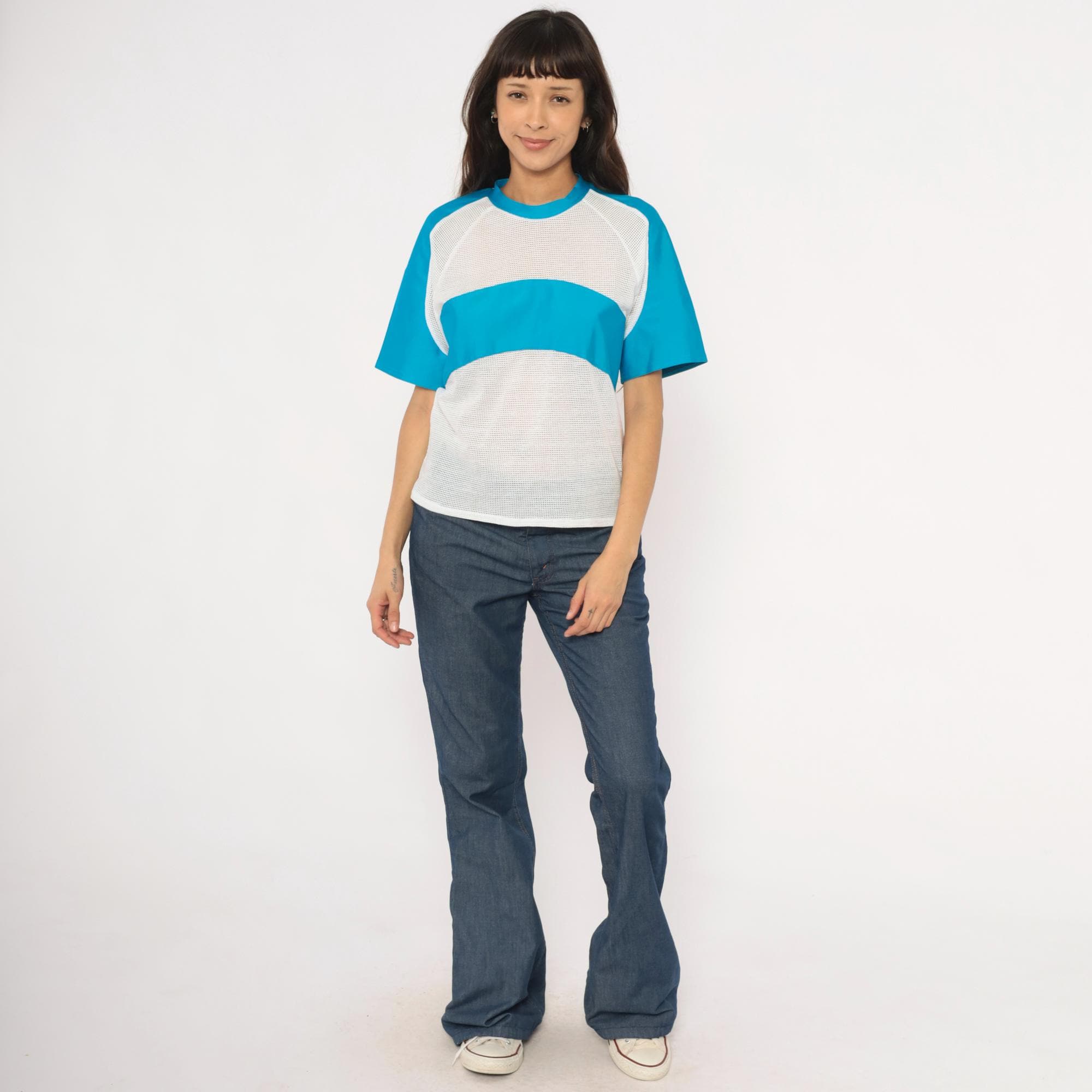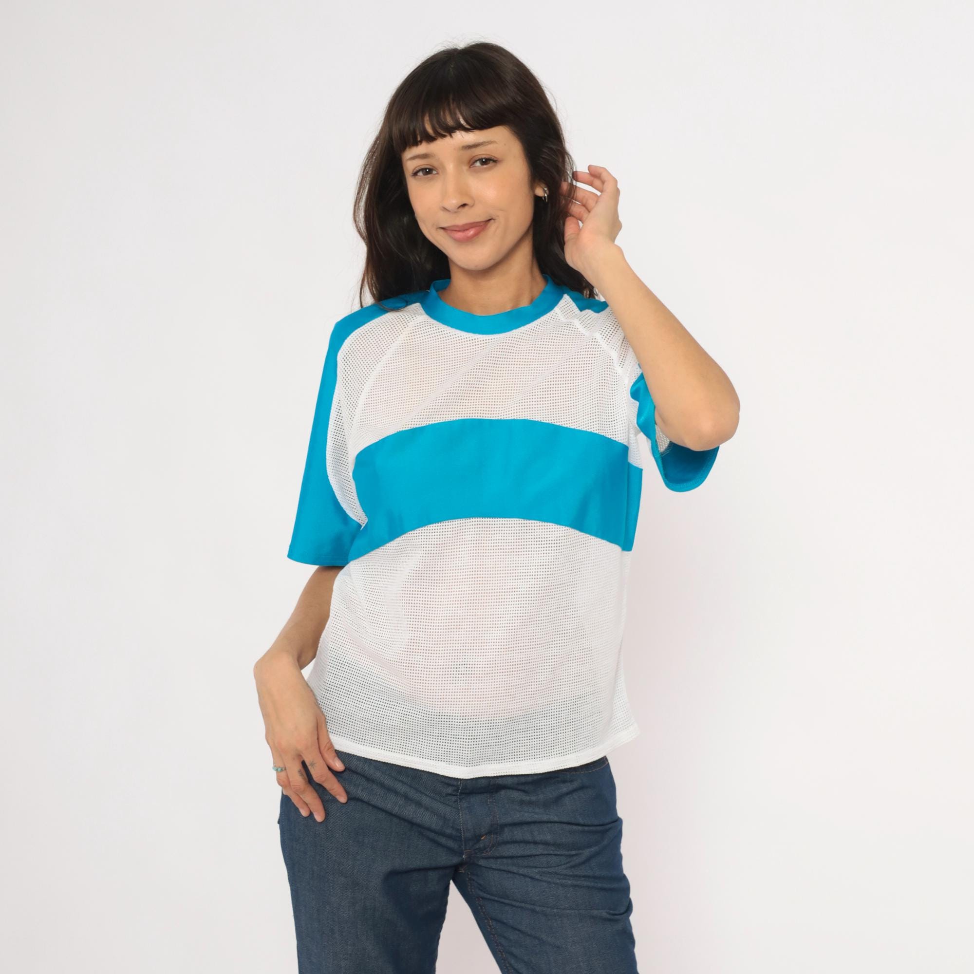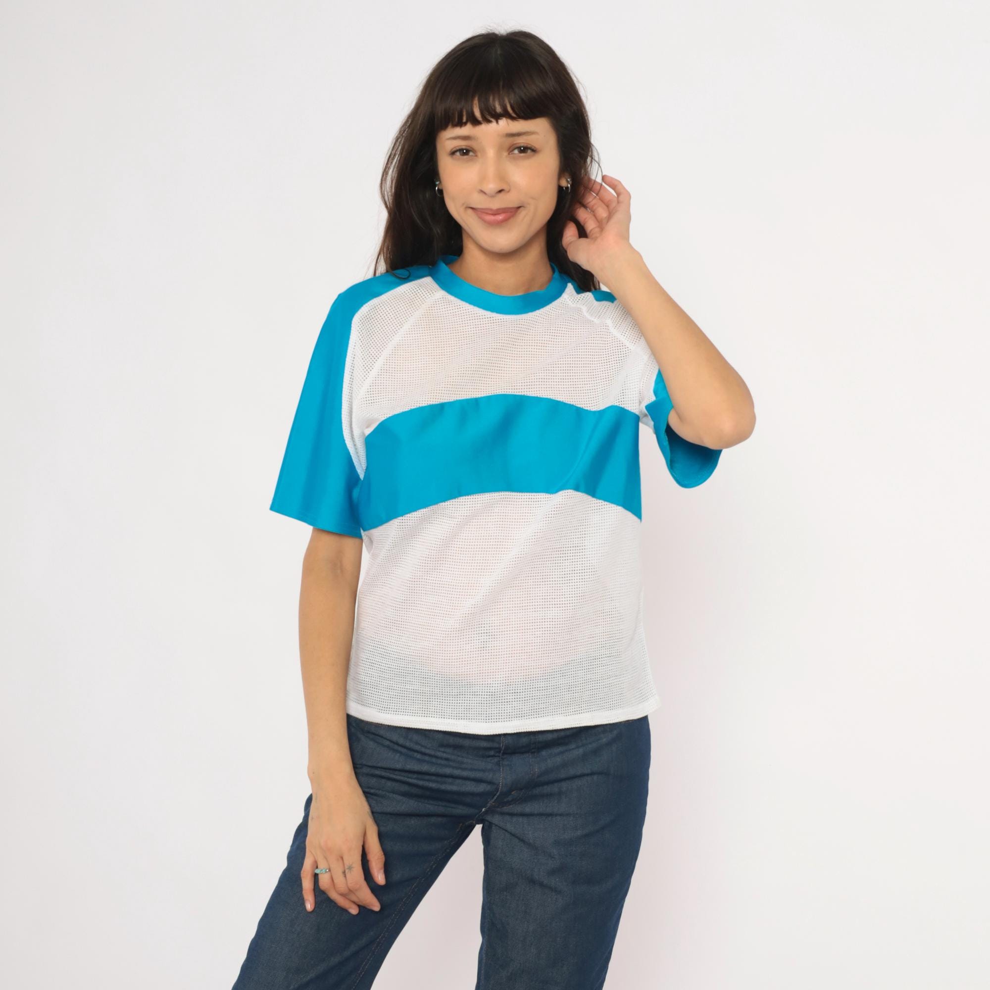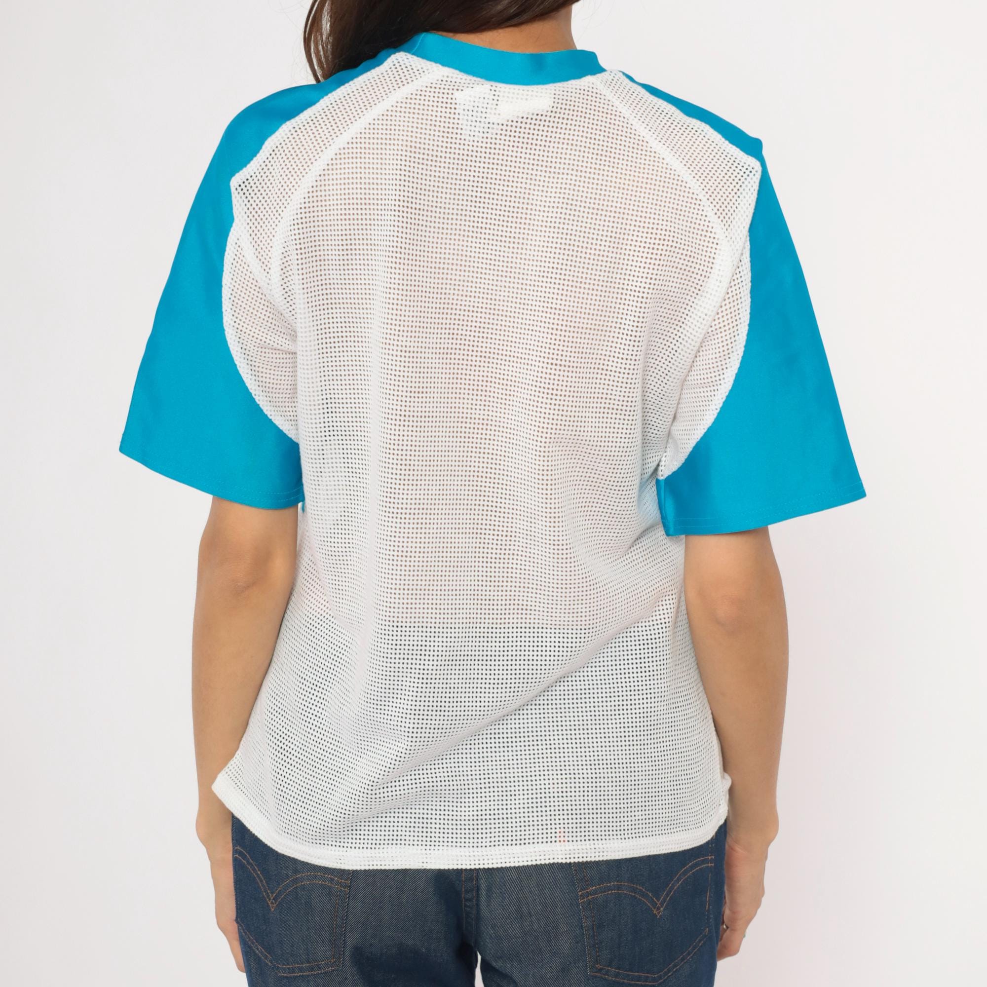 90s color block tee from Kanu with white mesh body panels and sky blue solid raglan sleeves. Crew neck with blue ribbed collar, a horizontal blue band across the chest breaking up the mesh sections. The back is entirely white mesh with raglan seam detailing and visible seam construction throughout.