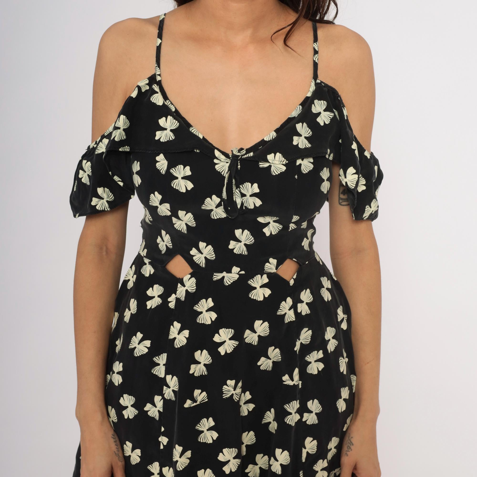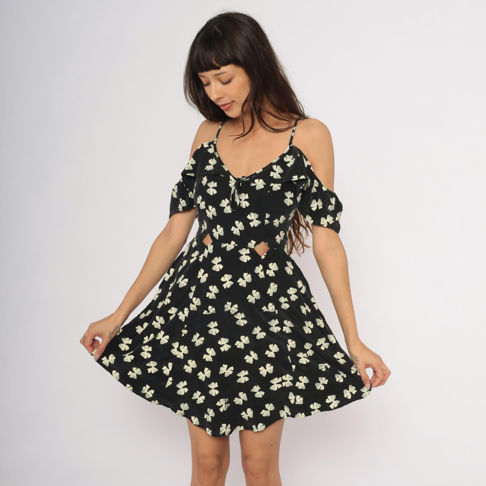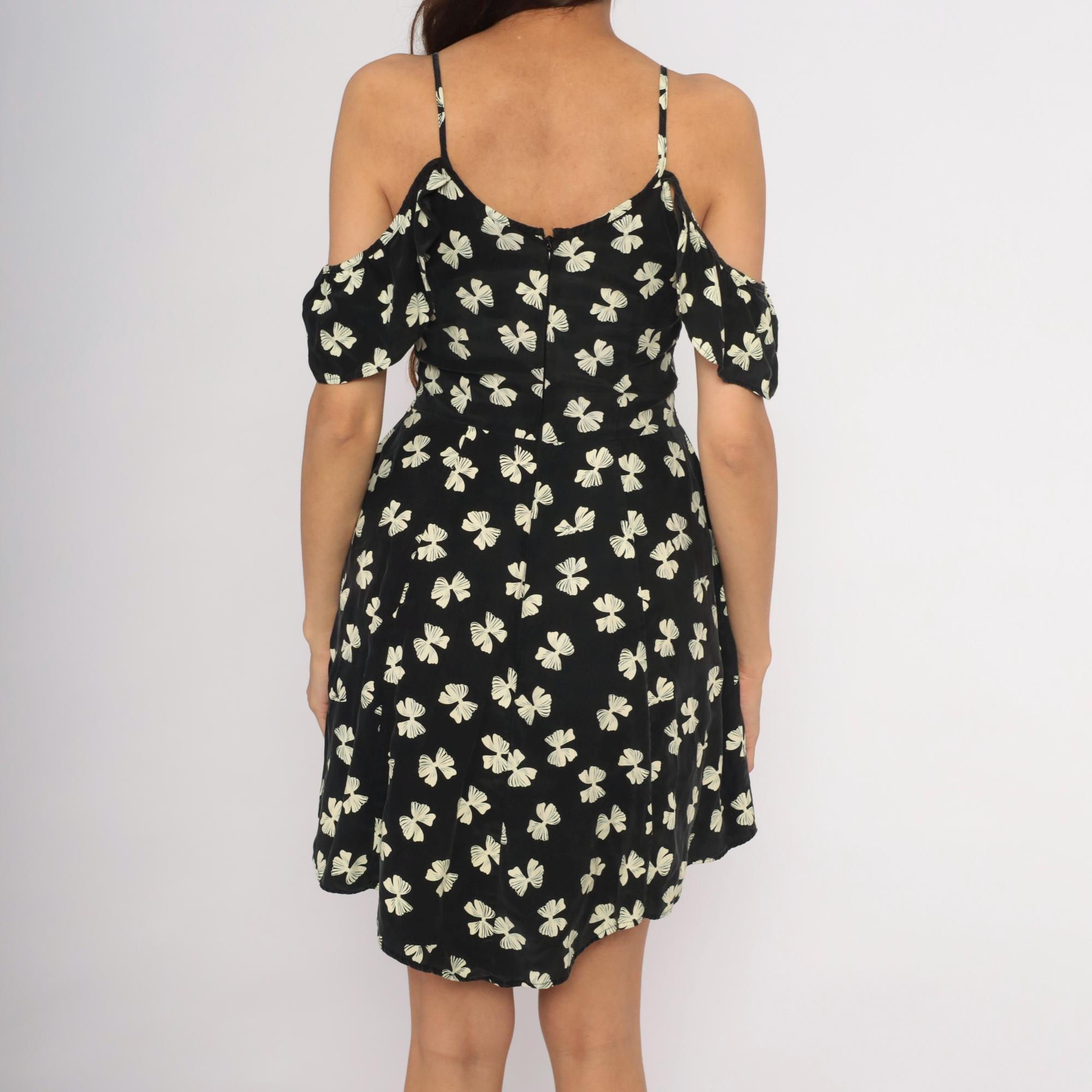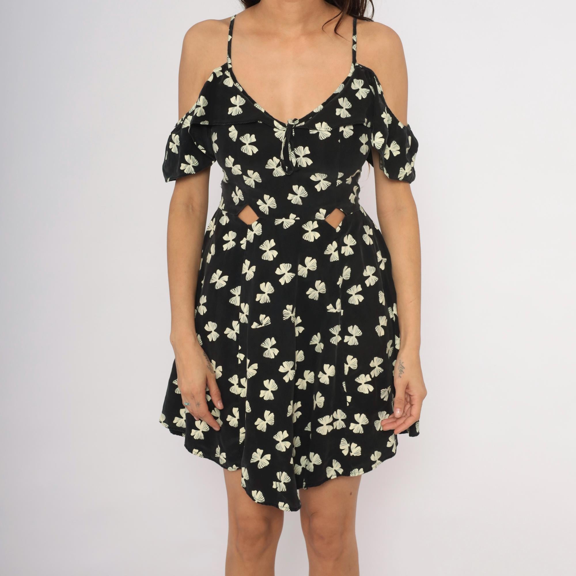 2000s black and cream bow print mini dress from The Books with V-neckline, spaghetti straps, and cold shoulder sleeves with draped ruffle detail. Small cutouts at the waist on both sides and a fitted bodice with a flared A-line skirt. Back zipper closure, all-over ivory bow-like motif scattered across the black base.