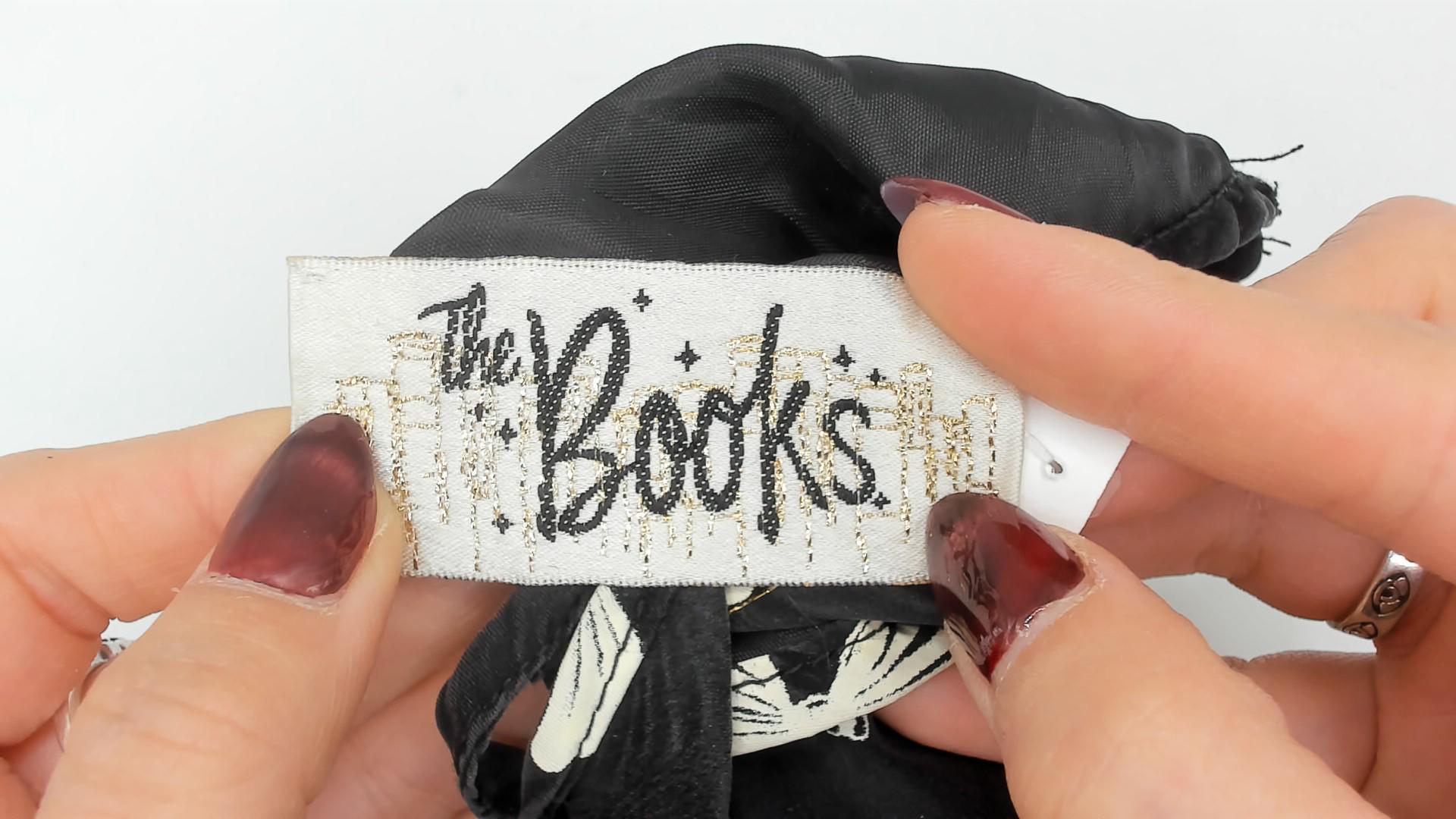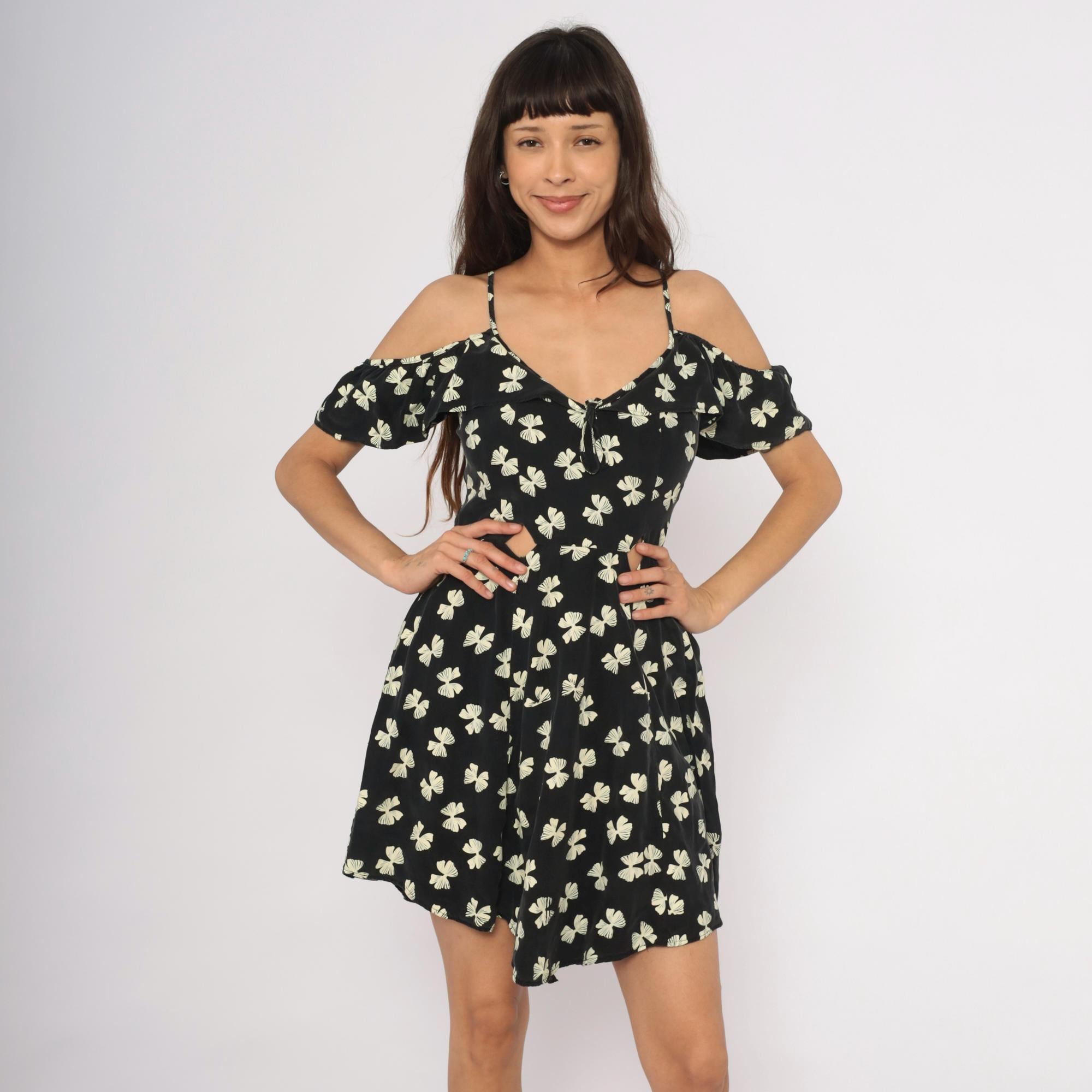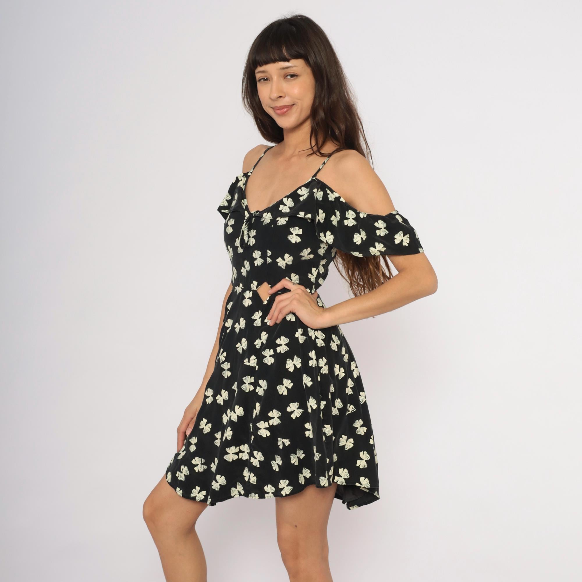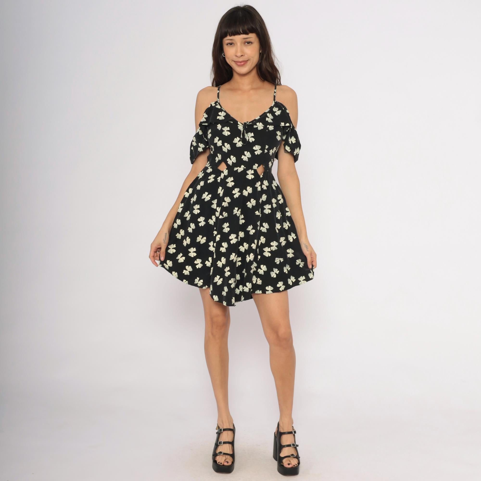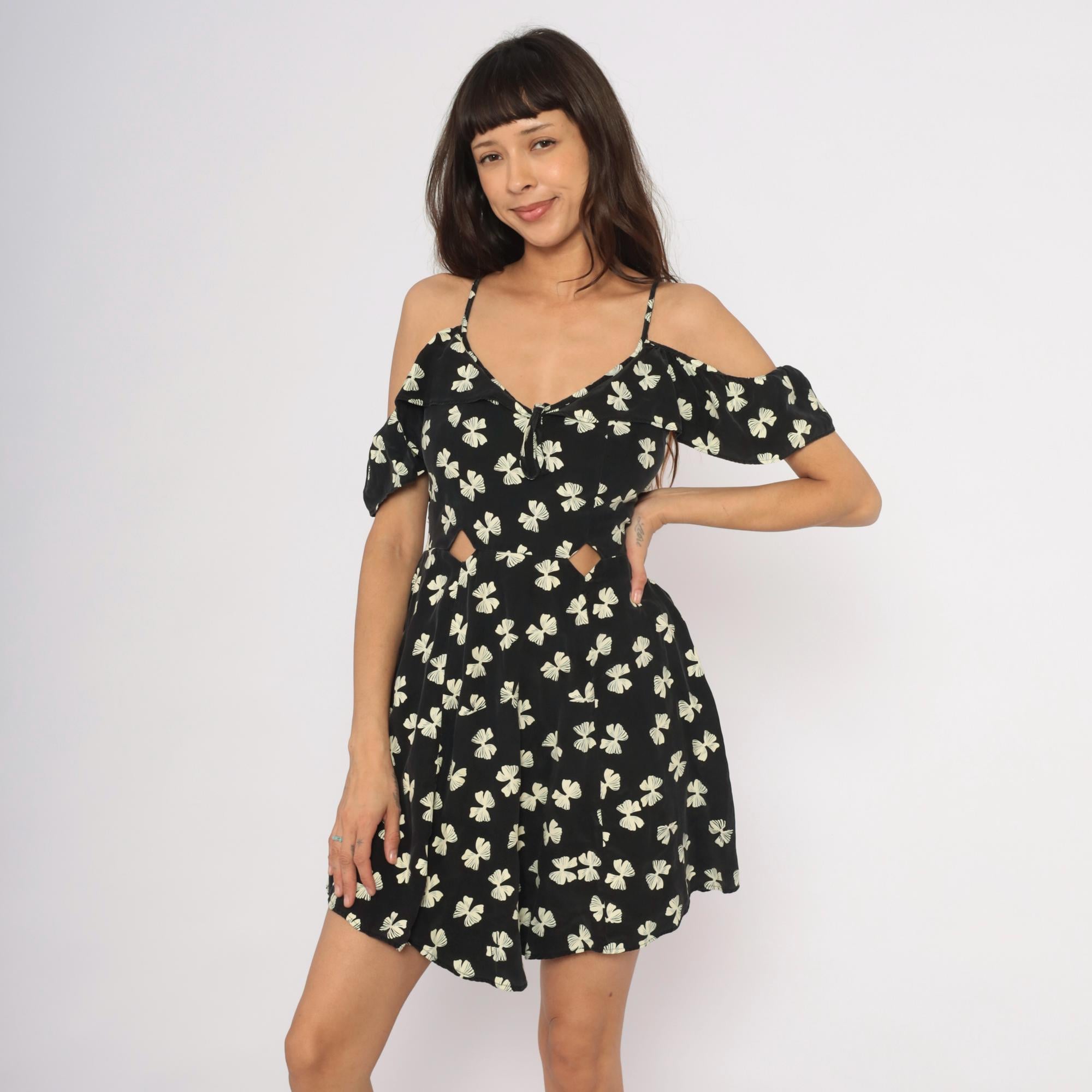 2000s black and cream bow print mini dress from The Books with V-neckline, spaghetti straps, and cold shoulder sleeves with draped ruffle detail. Small cutouts at the waist on both sides and a fitted bodice with a flared A-line skirt. Back zipper closure, all-over ivory bow-like motif scattered across the black base.