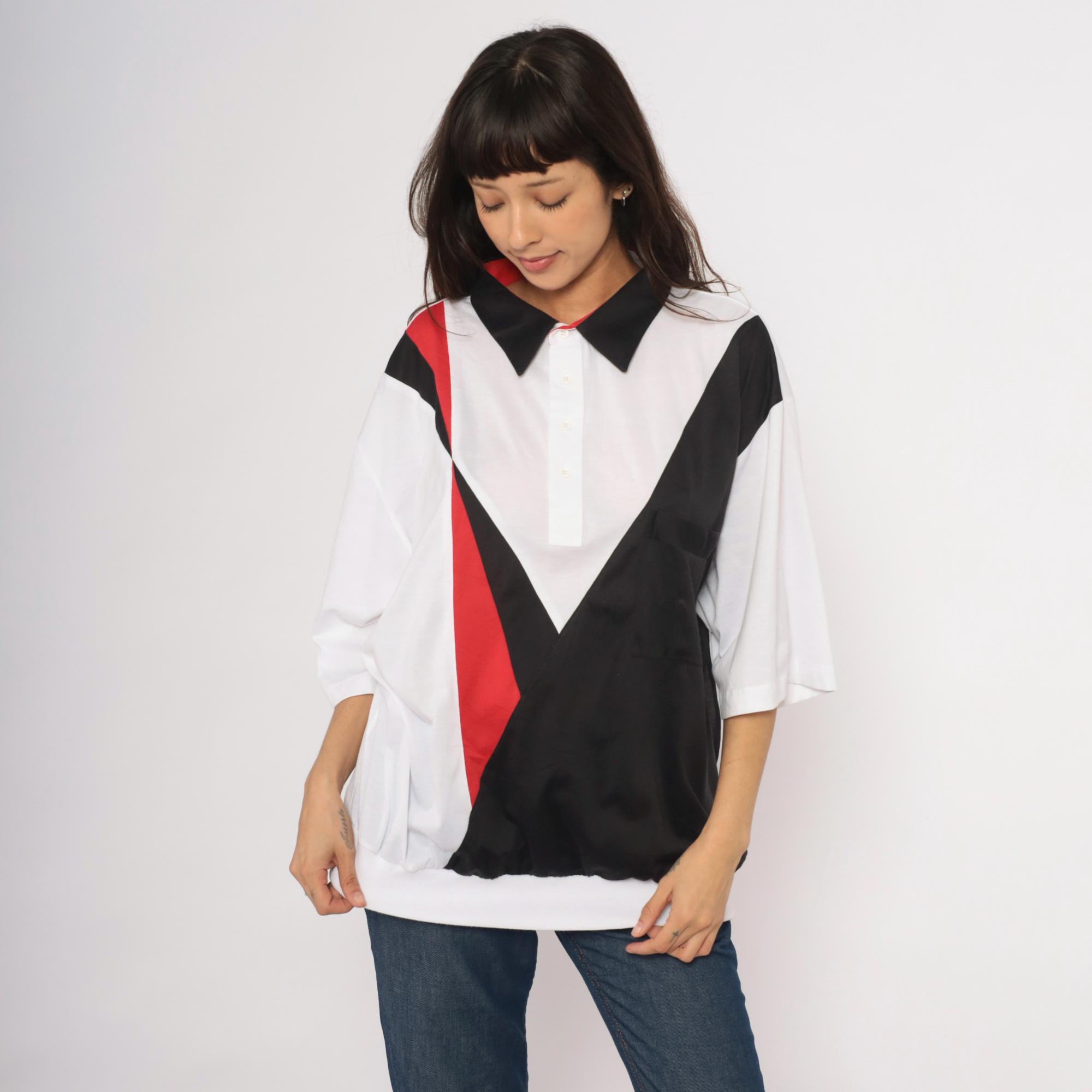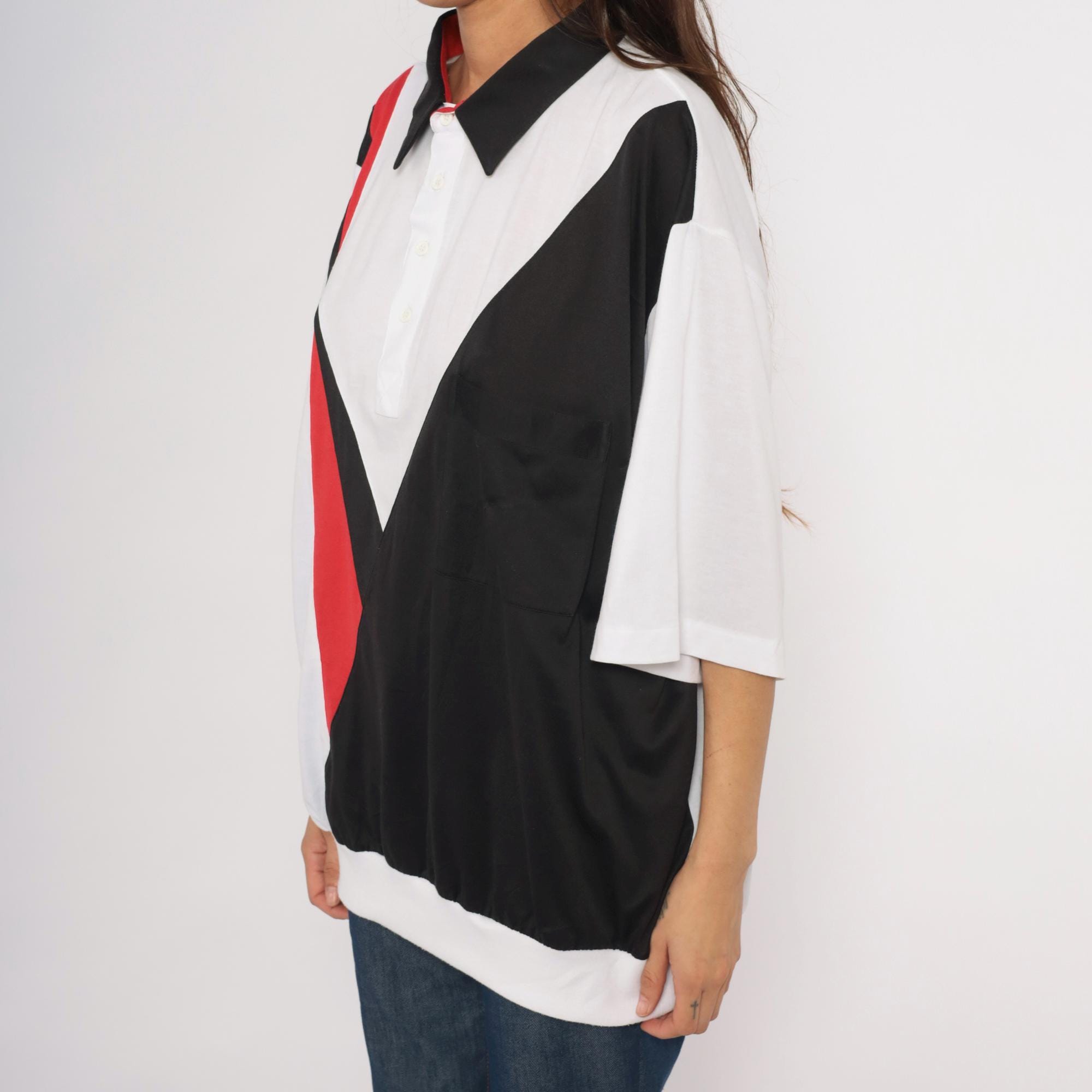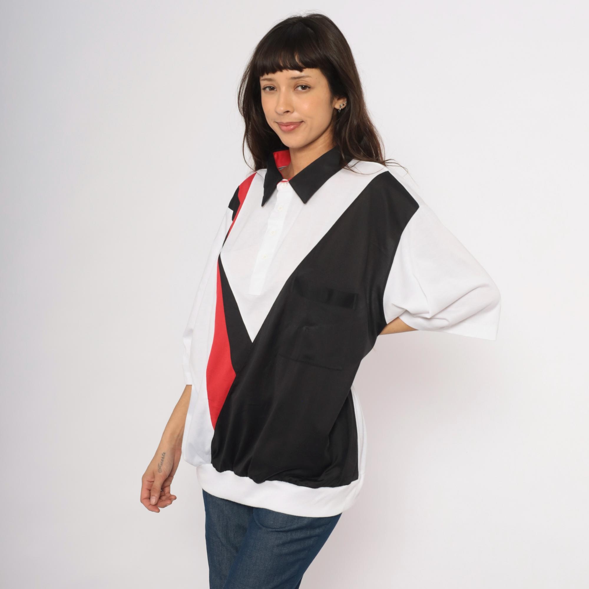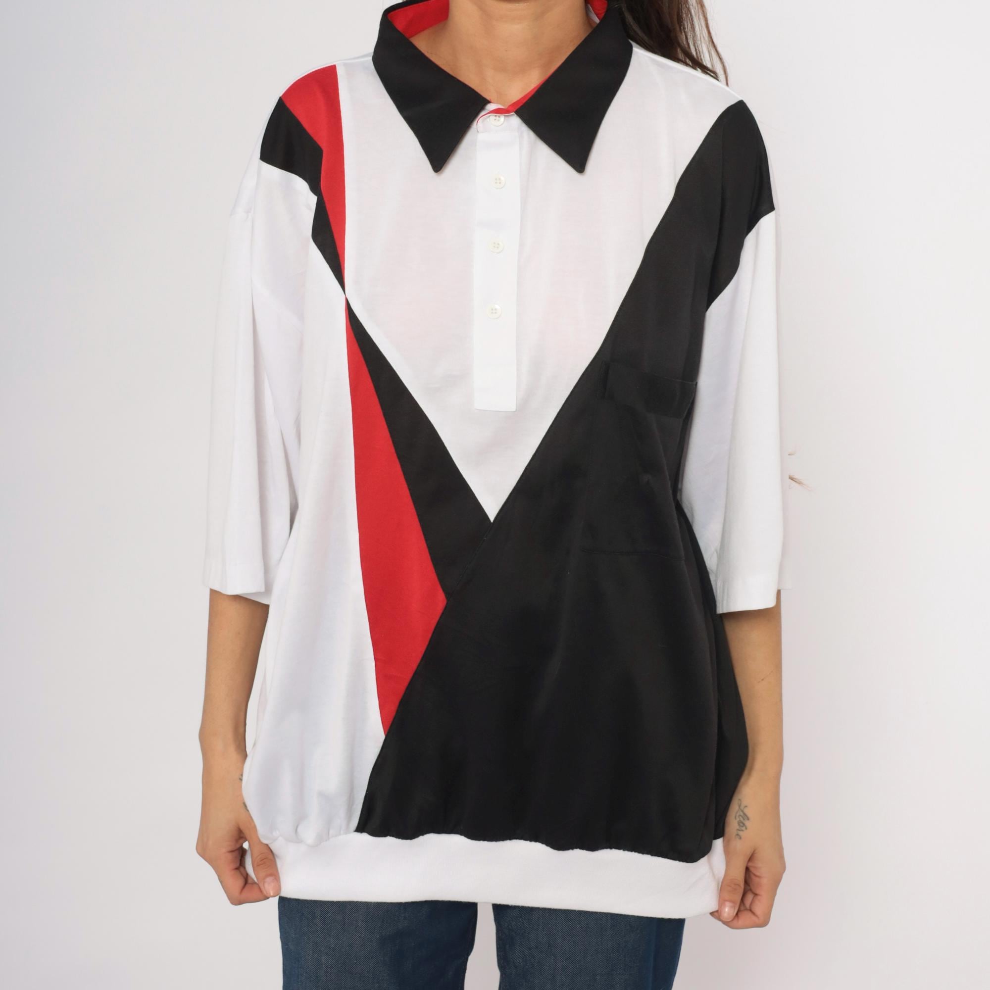 80s color block polo shirt from Envoy with a black pointed collar and partial button placket. White, black, and red chevron V-shaped pattern across the front, with a plain white back. Three-quarter length sleeves, banded hem, and a small chest pocket on the left side. The back of the collar shows red contrast lining.