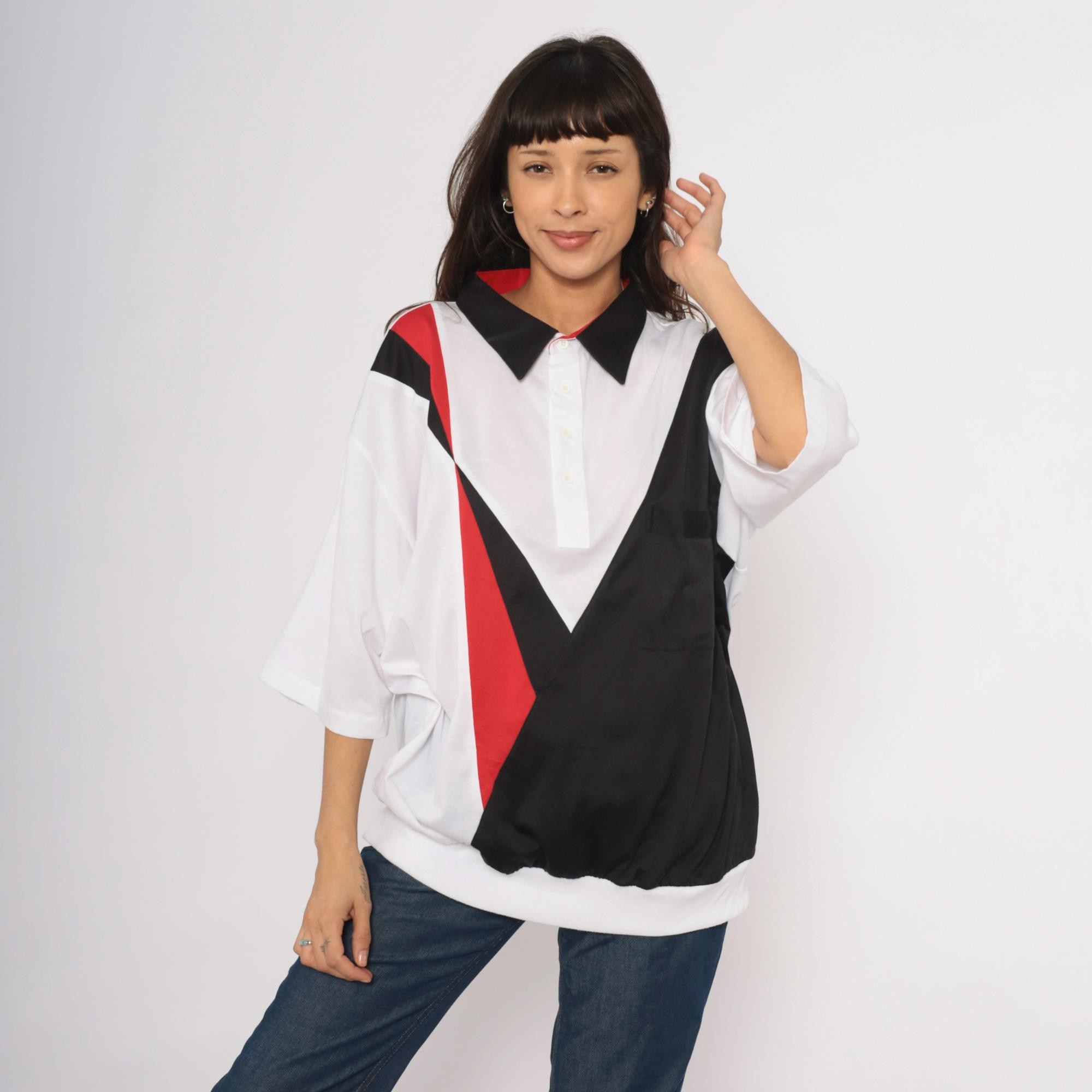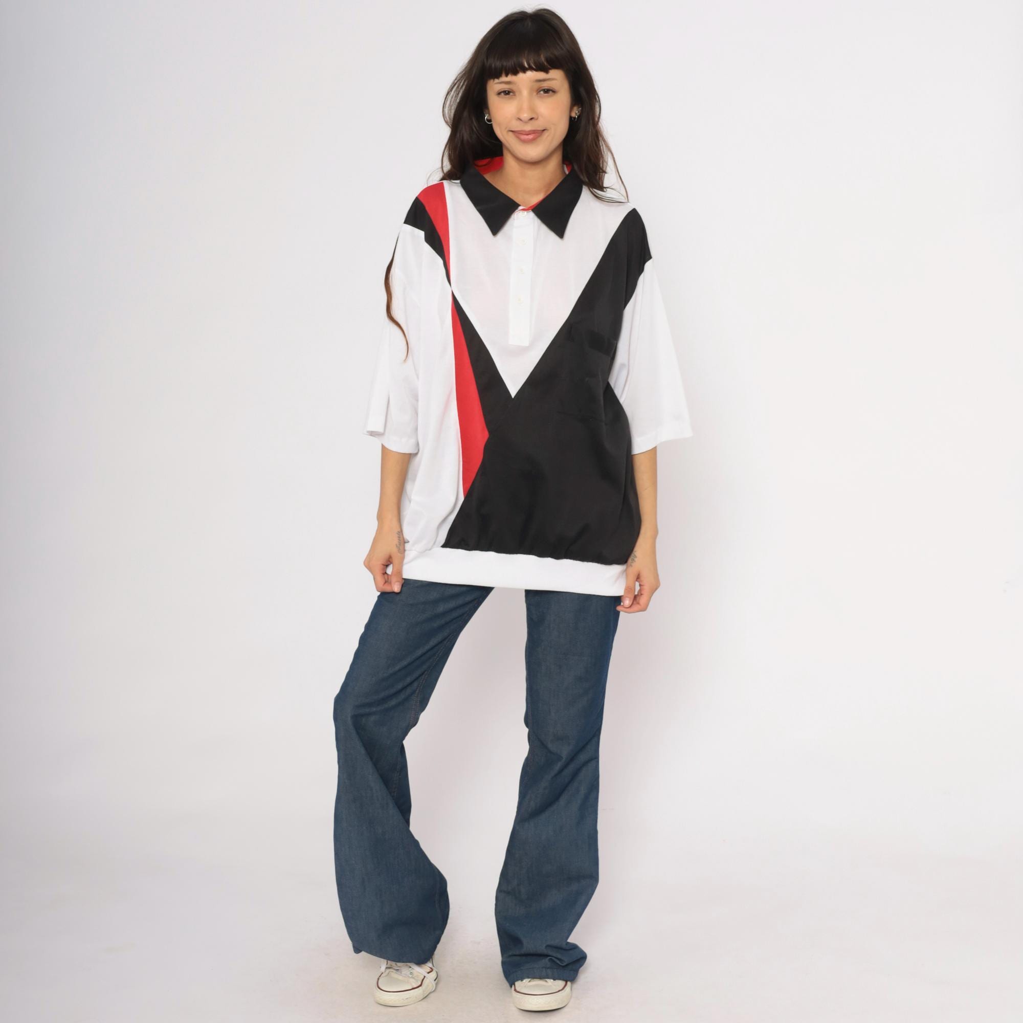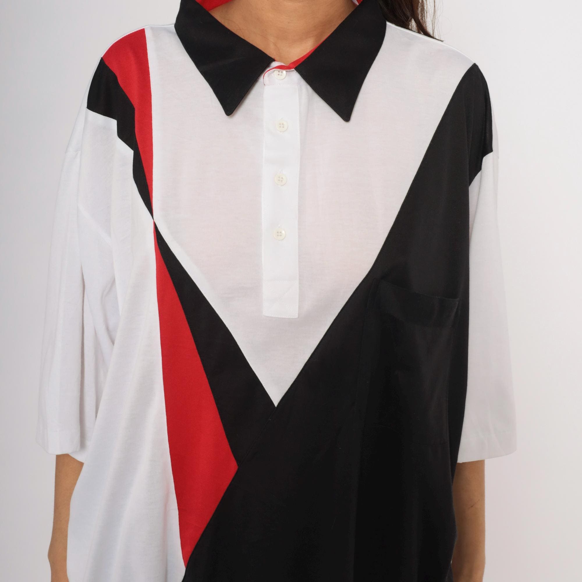 80s color block polo shirt from Envoy with a black pointed collar and partial button placket. White, black, and red chevron V-shaped pattern across the front, with a plain white back. Three-quarter length sleeves, banded hem, and a small chest pocket on the left side. The back of the collar shows red contrast lining.