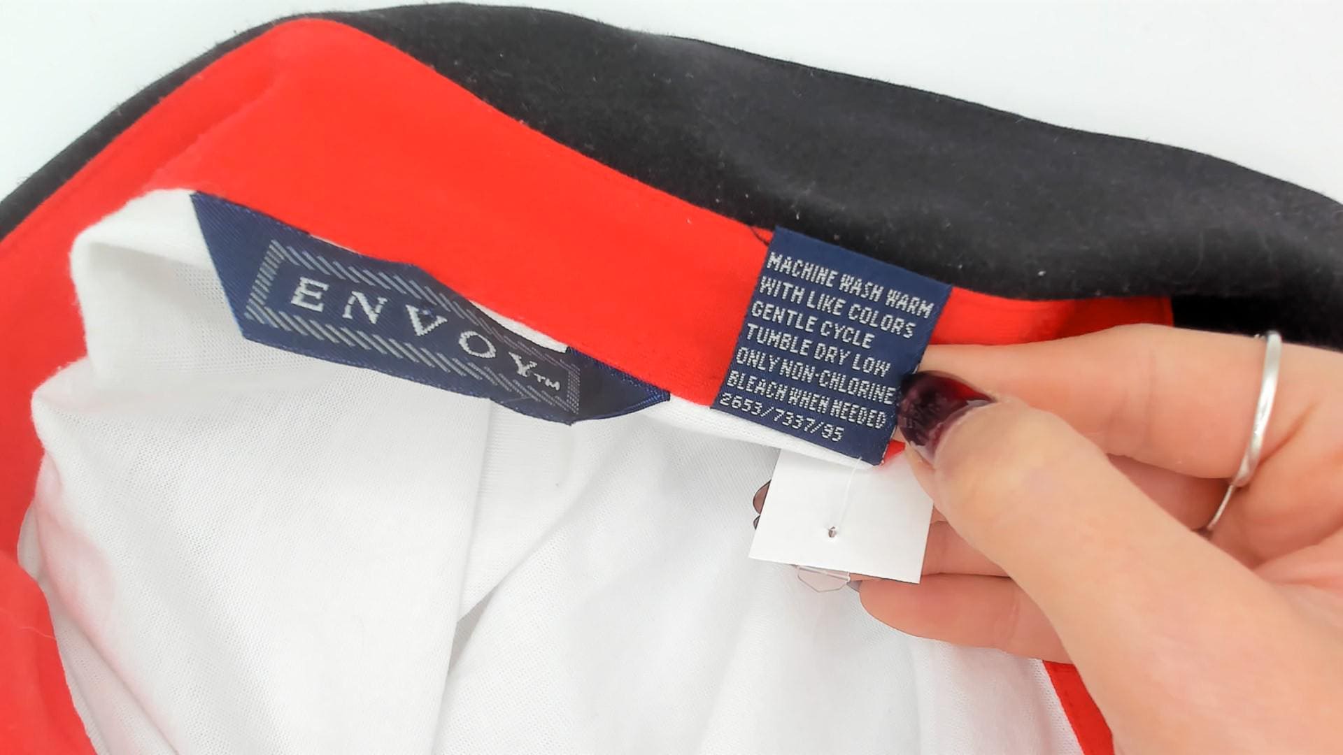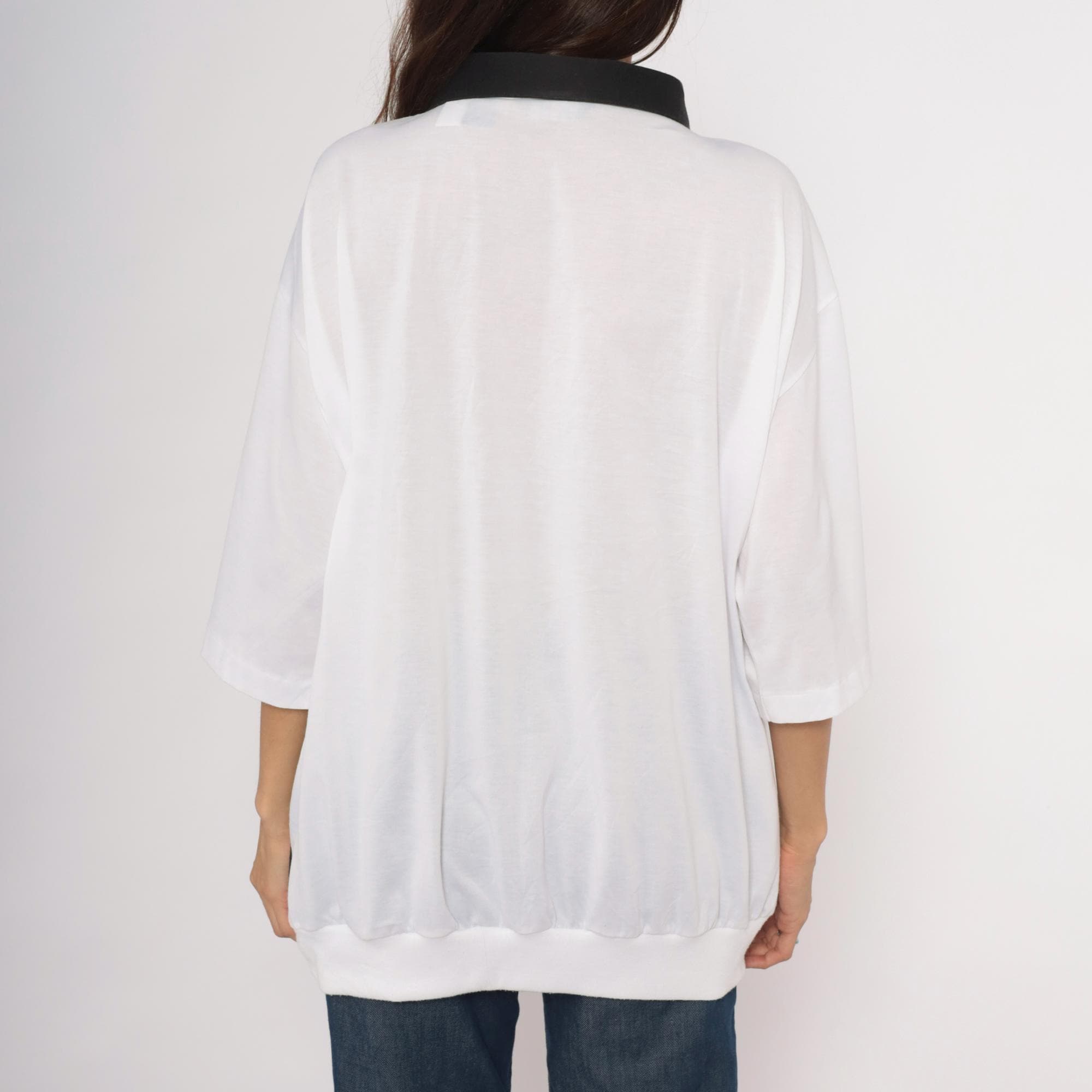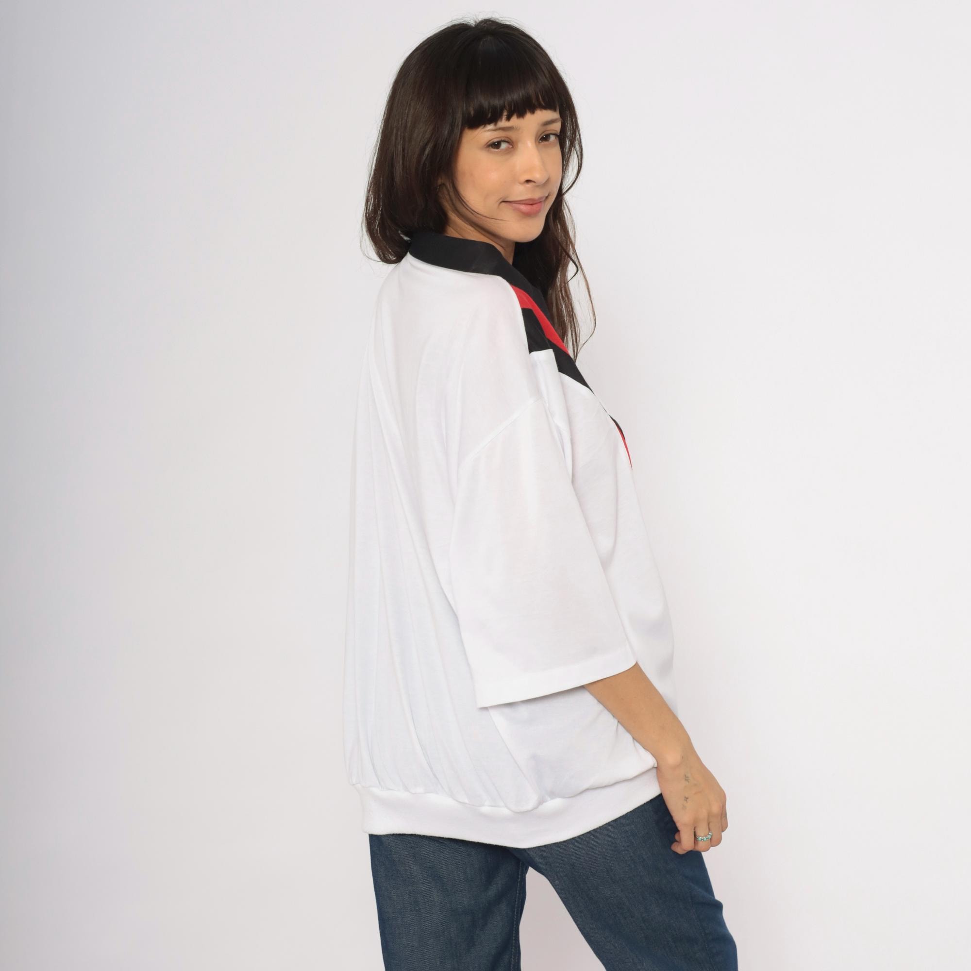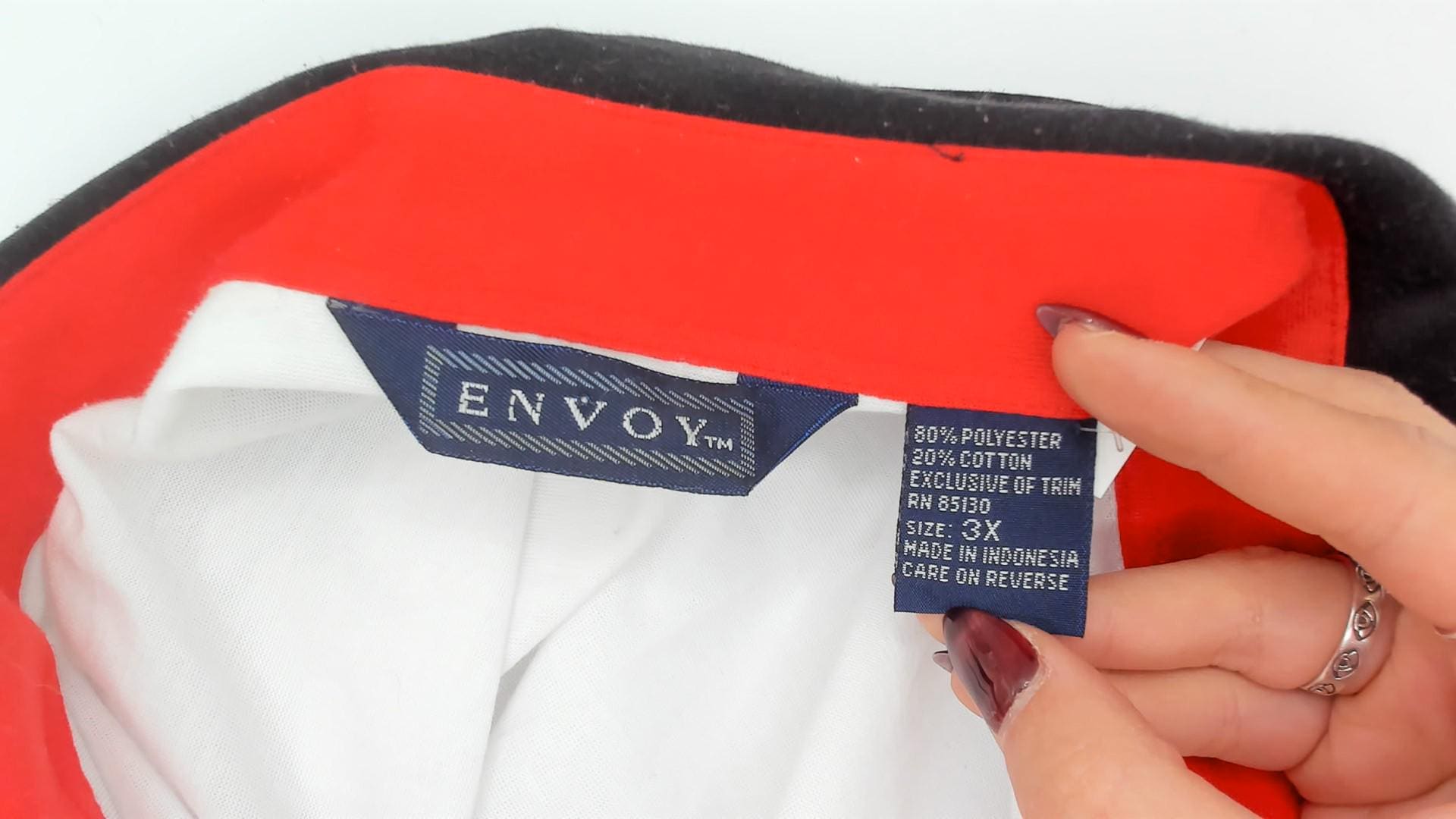 80s color block polo shirt from Envoy with a black pointed collar and partial button placket. White, black, and red chevron V-shaped pattern across the front, with a plain white back. Three-quarter length sleeves, banded hem, and a small chest pocket on the left side. The back of the collar shows red contrast lining.