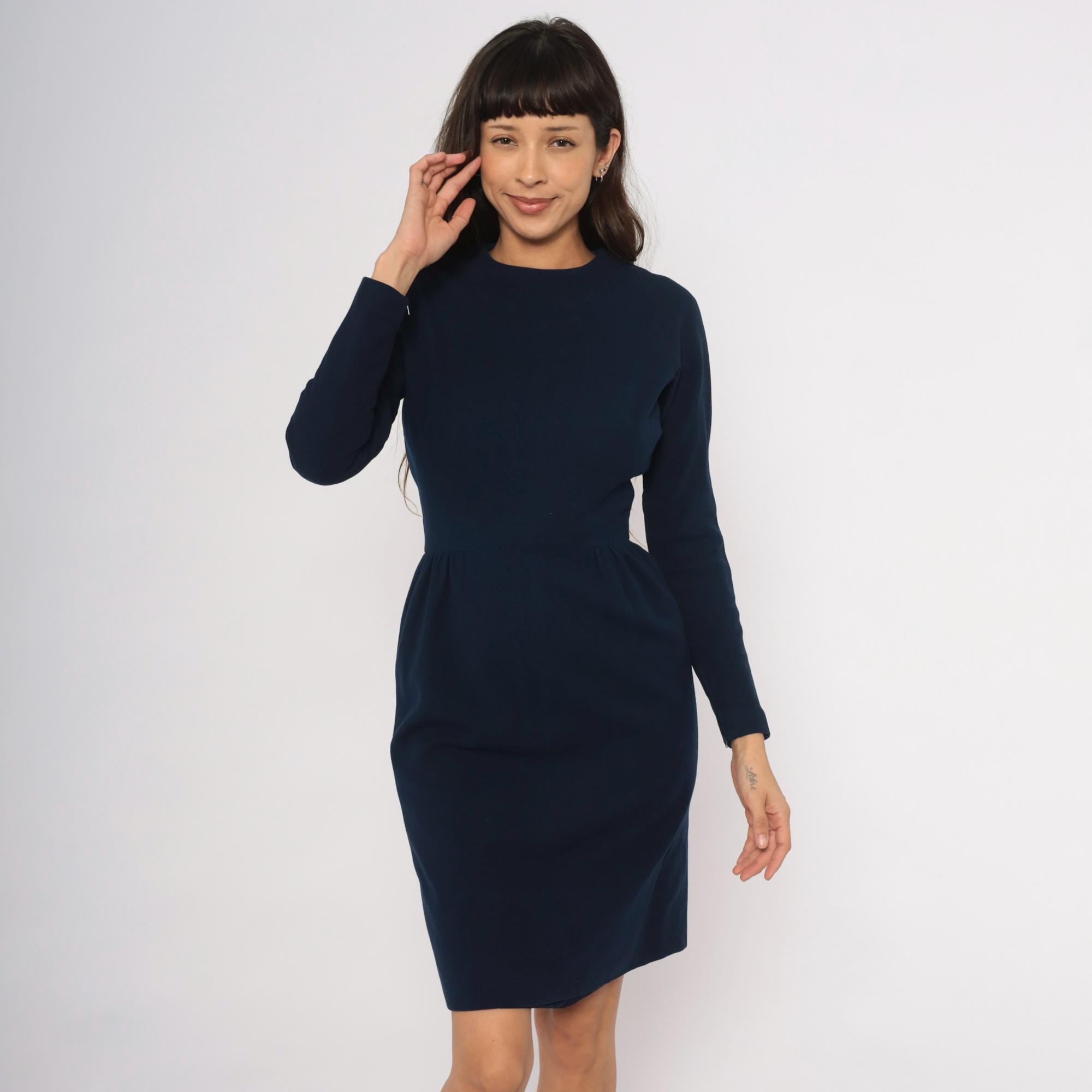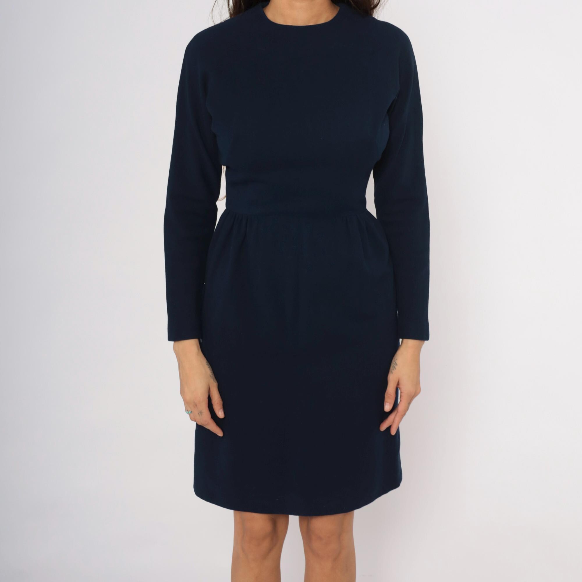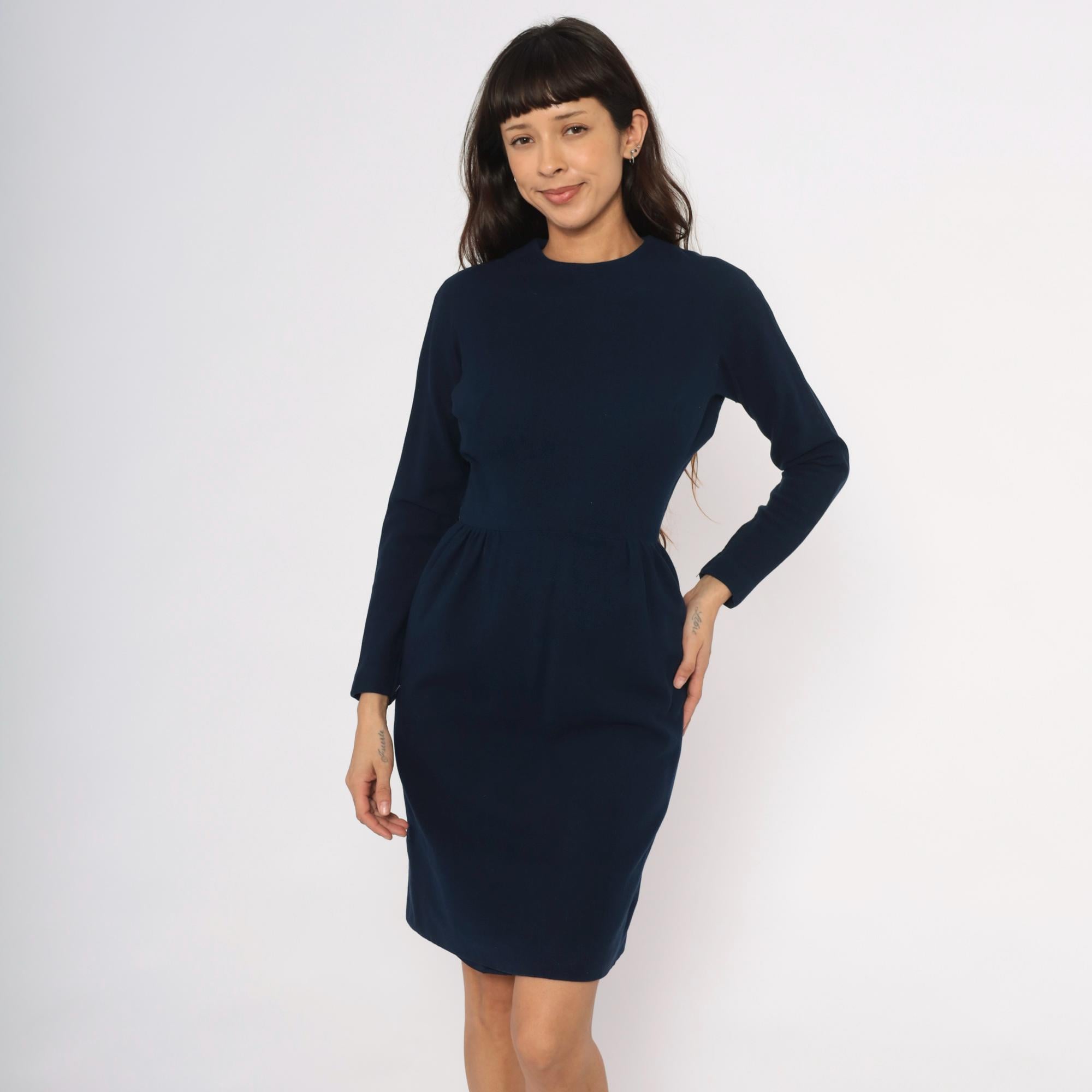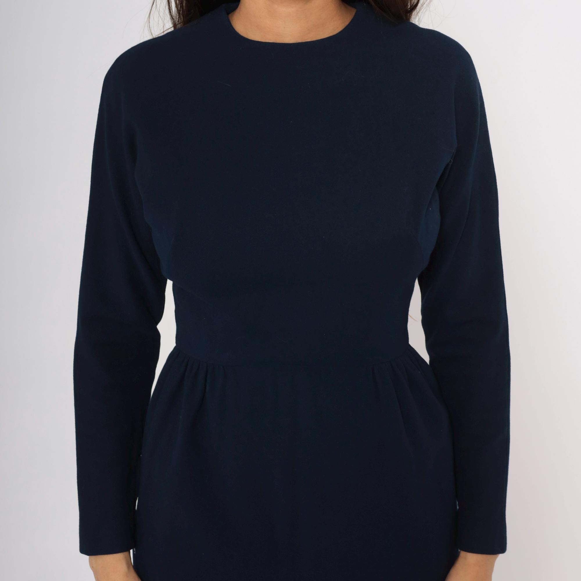 50s navy dress from Junior Sophisticates with a crew neckline, long sleeves, and a fitted bodice with gathered waist. The skirt has soft gathers at the front and a smoother, more tailored back panel.