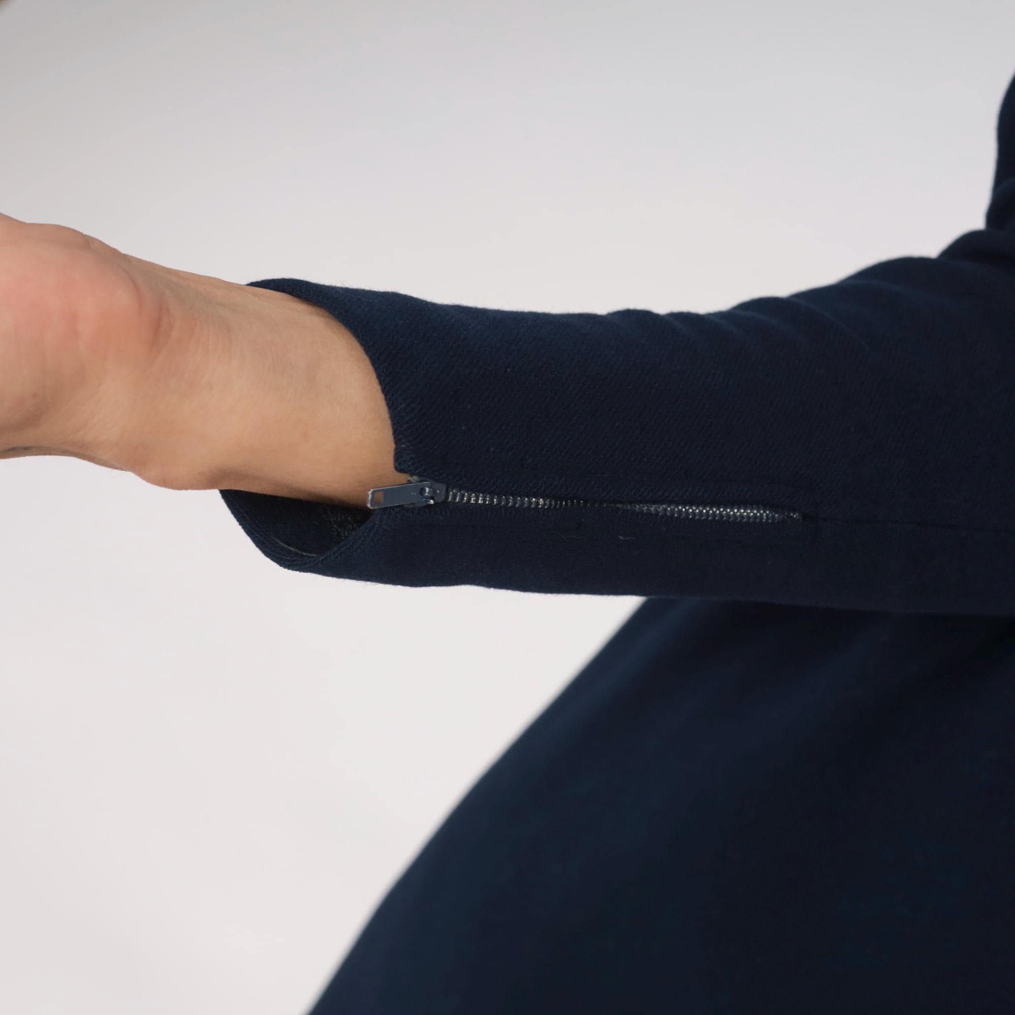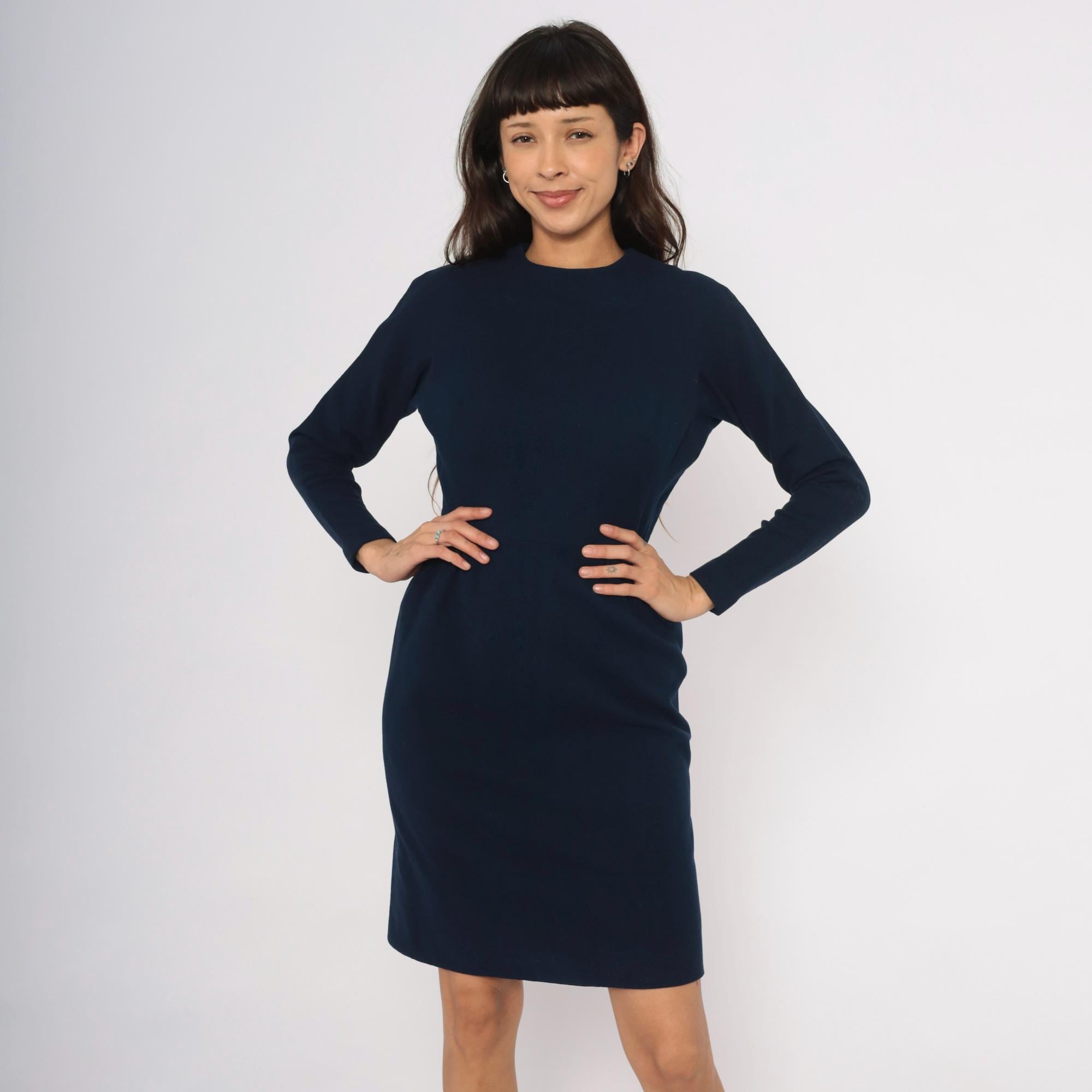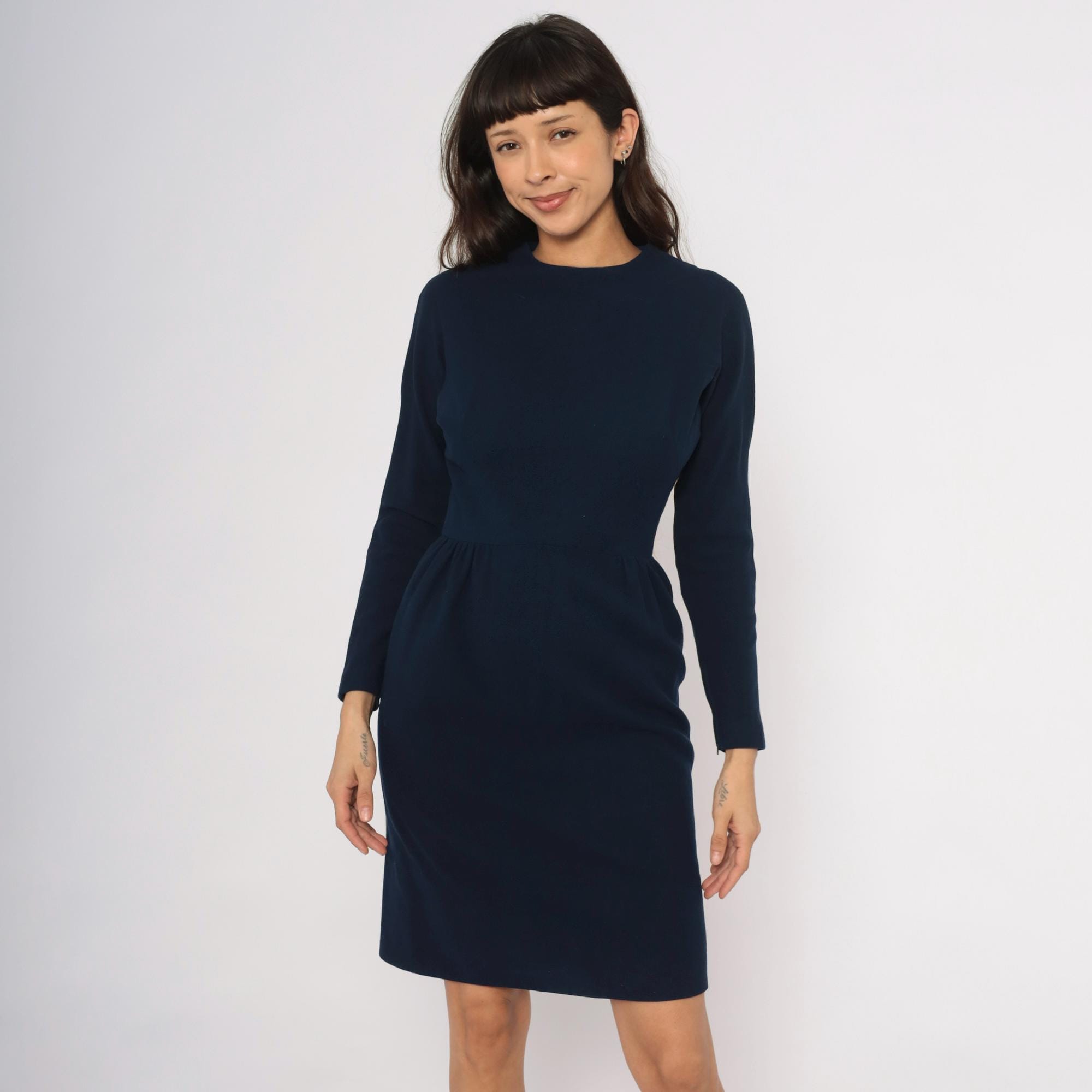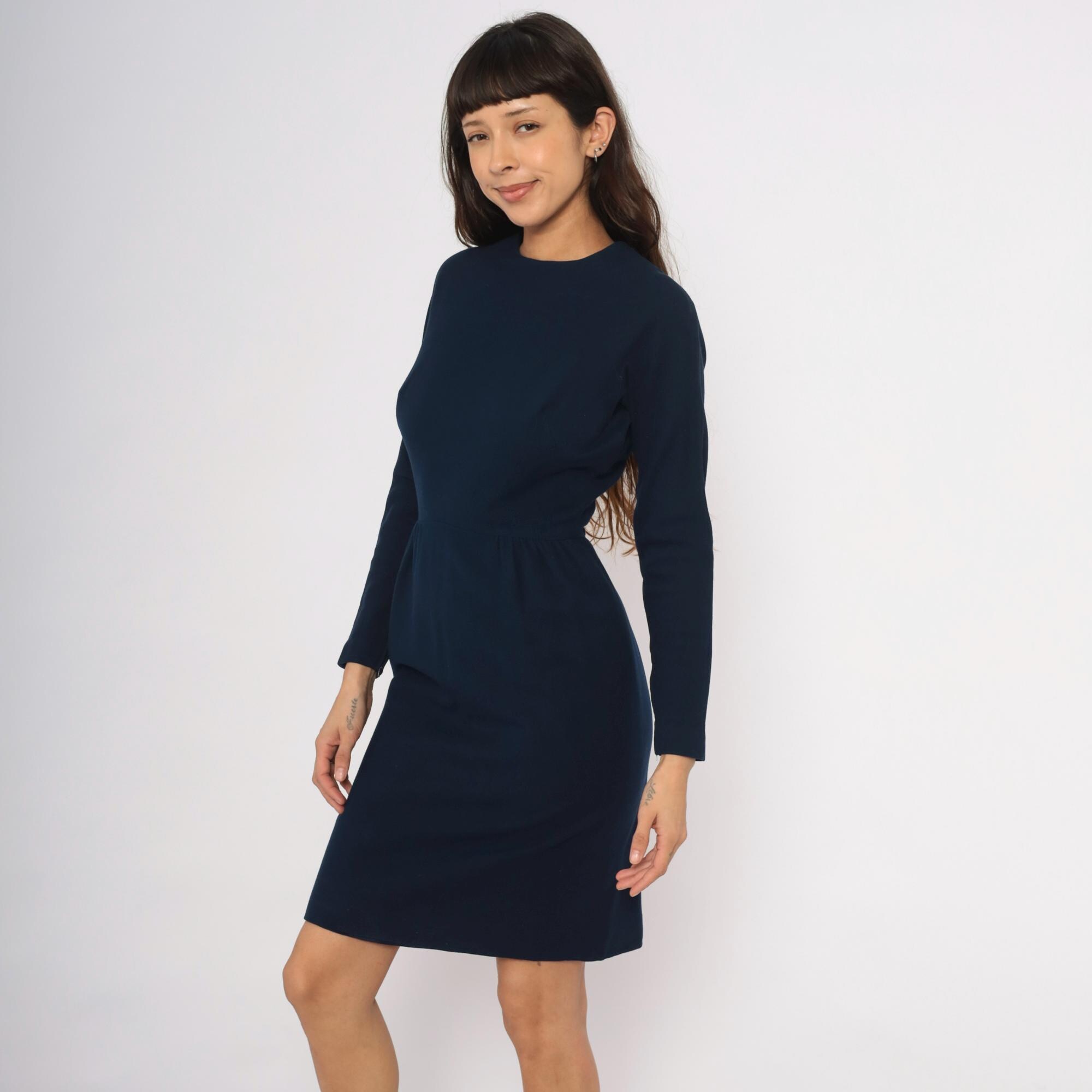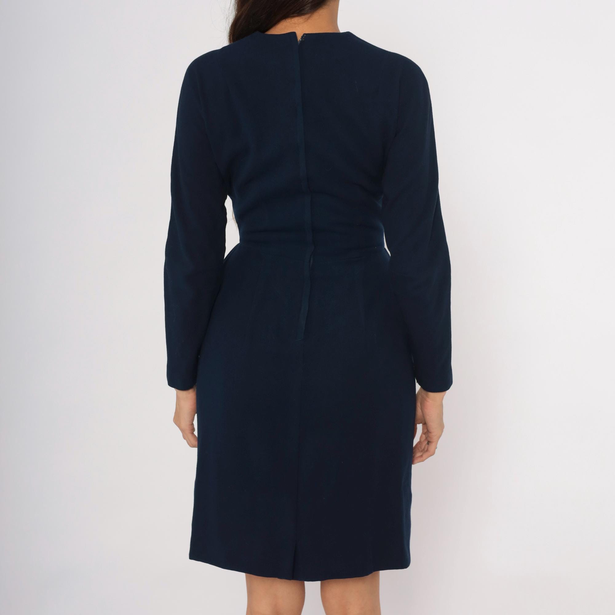 50s navy dress from Junior Sophisticates with a crew neckline, long sleeves, and a fitted bodice with gathered waist. The skirt has soft gathers at the front and a smoother, more tailored back panel.