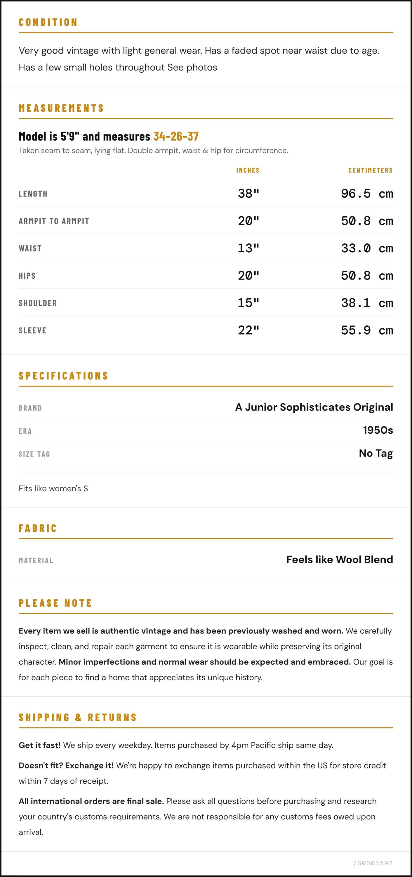 Condition: Very good vintage with light general wear. Has a faded spot near waist due to age. Has a few small holes throughout See photos