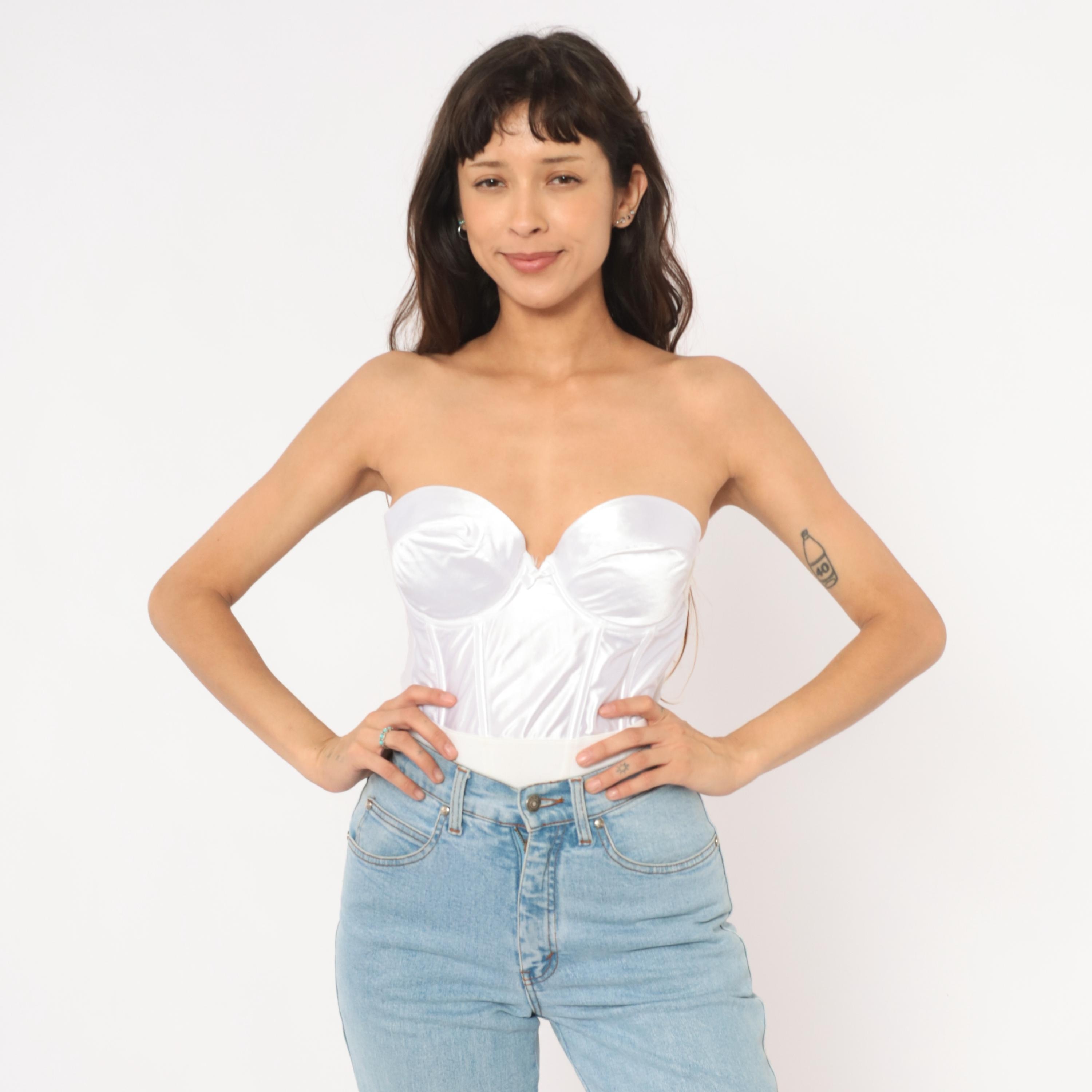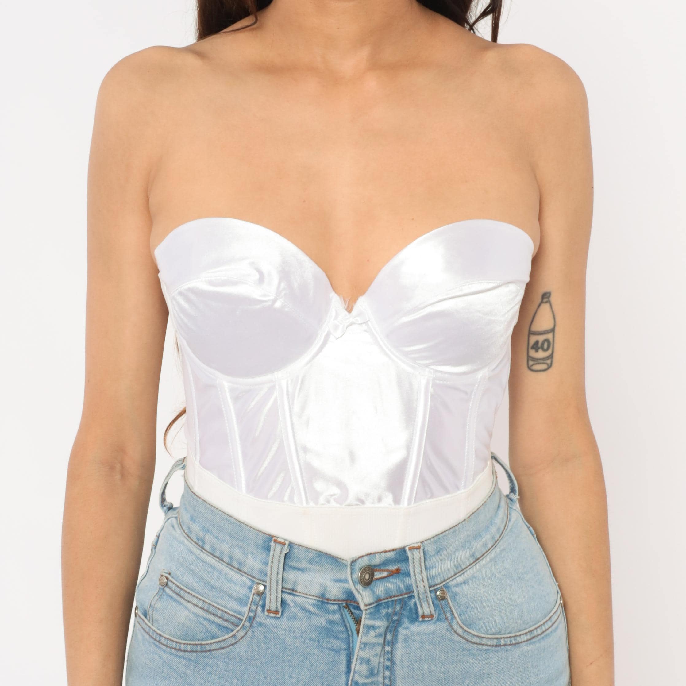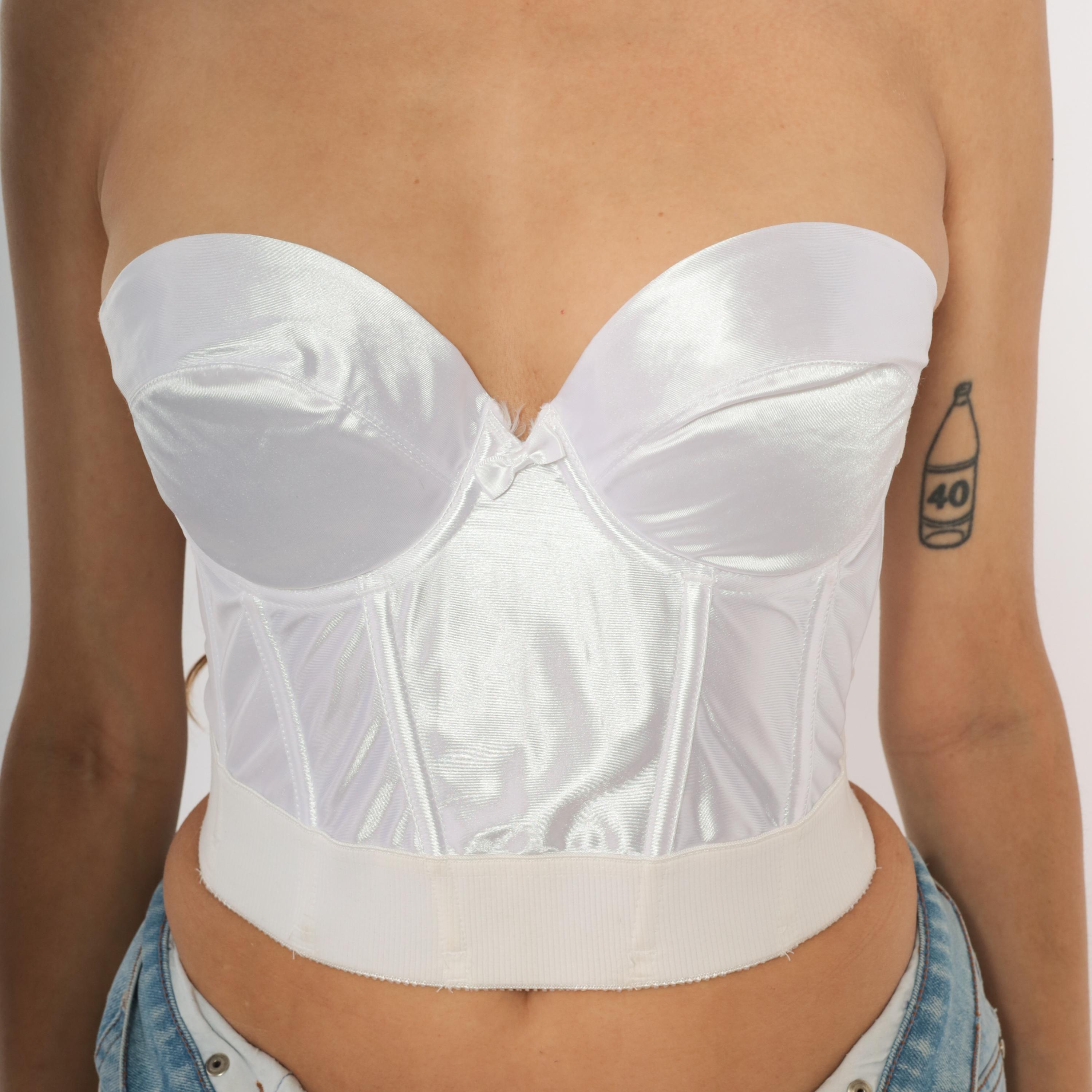 90s white satin bustier from Wonderbra with molded sweetheart cups and a small bow detail at center front. Boned construction with vertical seaming throughout the bodice and a wide elastic band at the hem. Hook and eye back closure, strapless silhouette, and cropped length hitting above the waist.