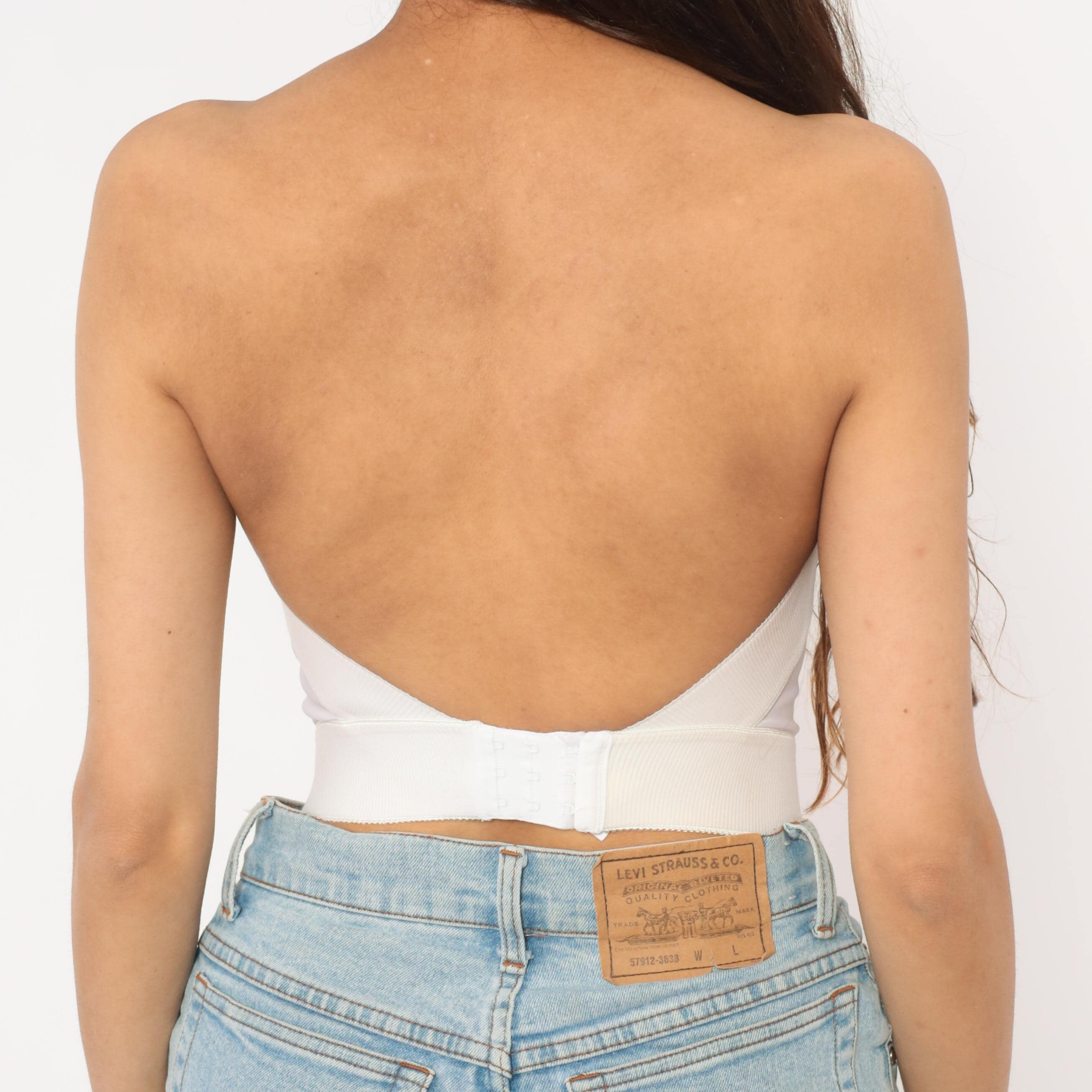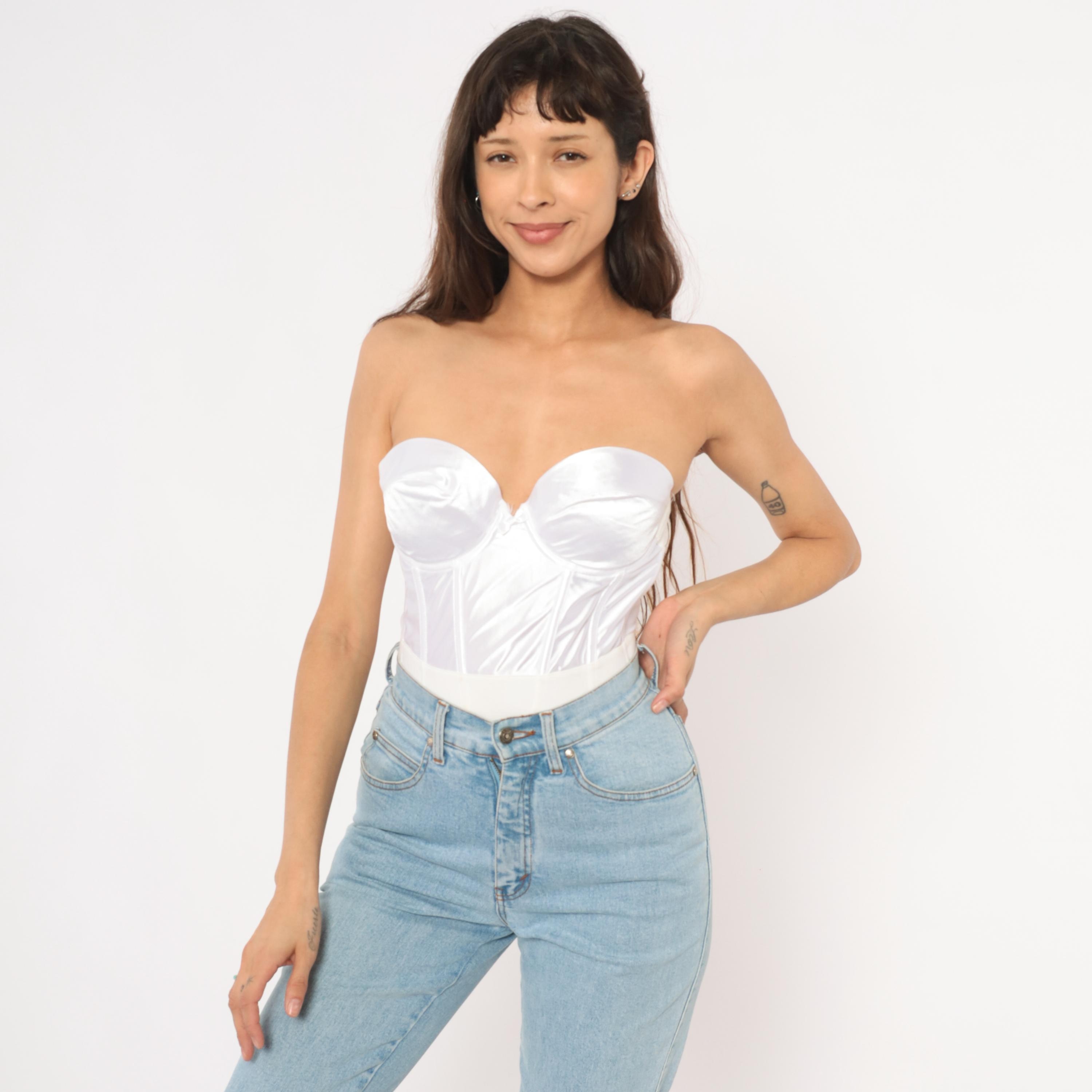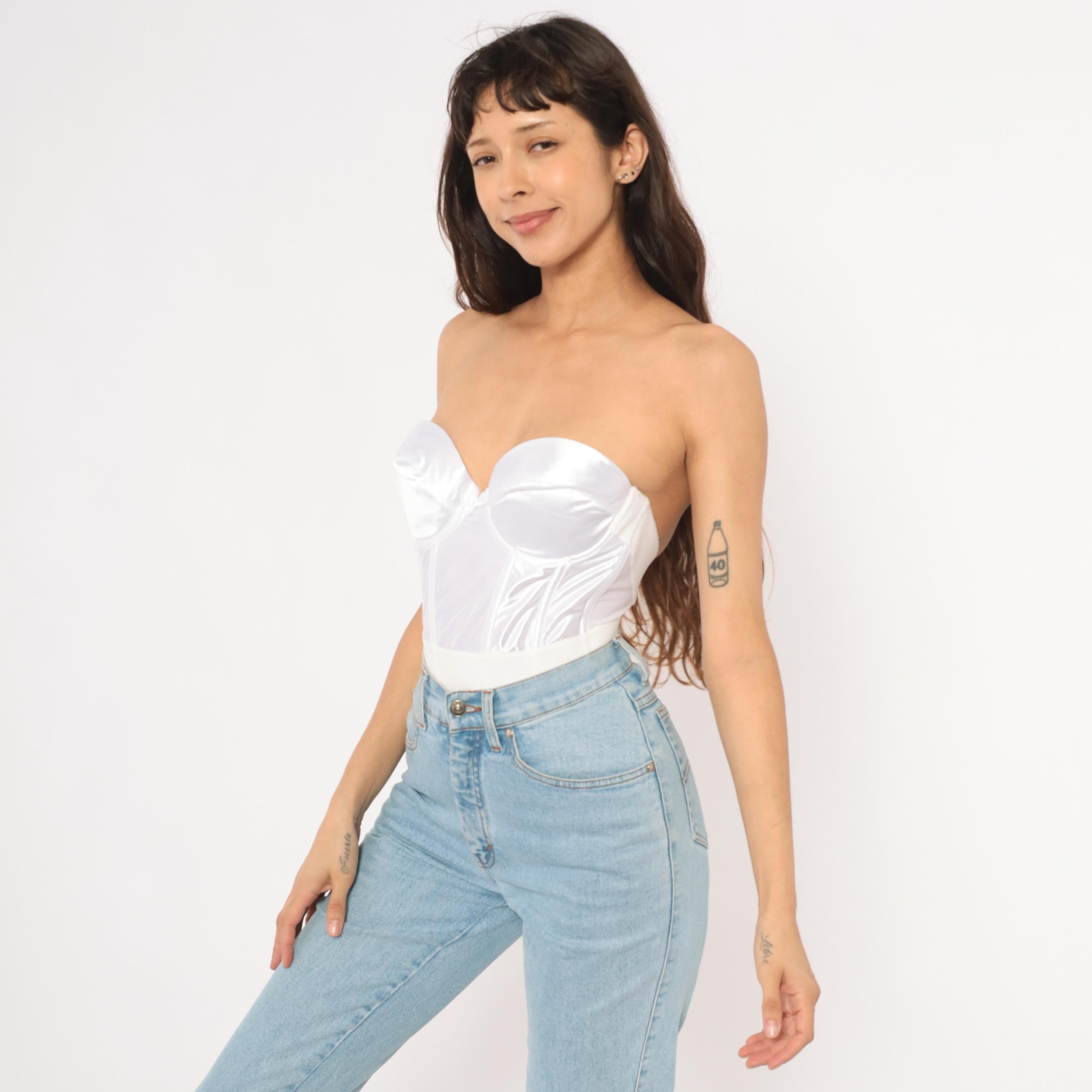 90s white satin bustier from Wonderbra with molded sweetheart cups and a small bow detail at center front. Boned construction with vertical seaming throughout the bodice and a wide elastic band at the hem. Hook and eye back closure, strapless silhouette, and cropped length hitting above the waist.
