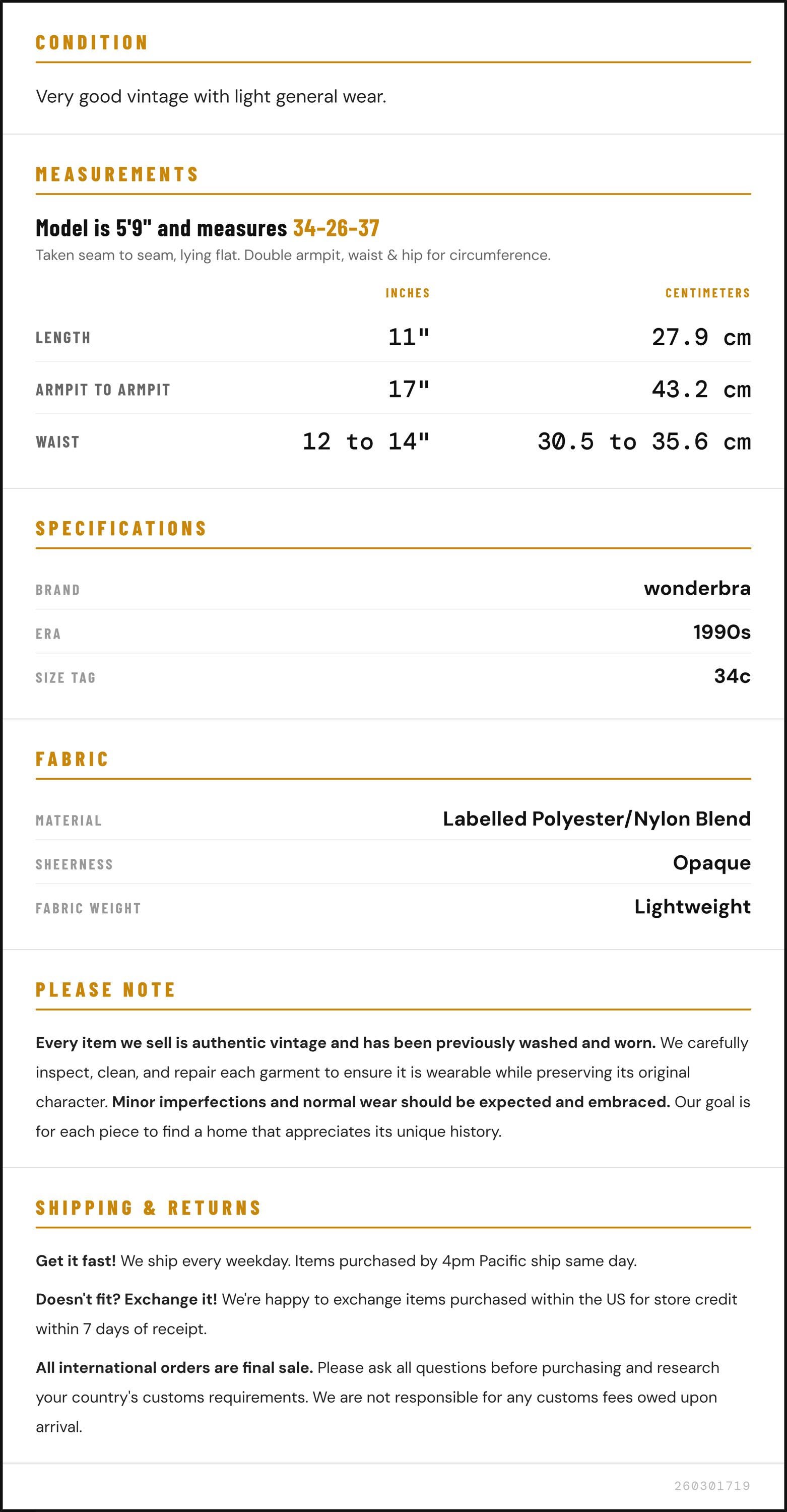 Vintage denim was usually made without any stretch, unlike modern jeans. Check the measurements to ensure proper fit, and remember to give yourself a little wiggle room in the waist and hips, depending on your preferred fit.