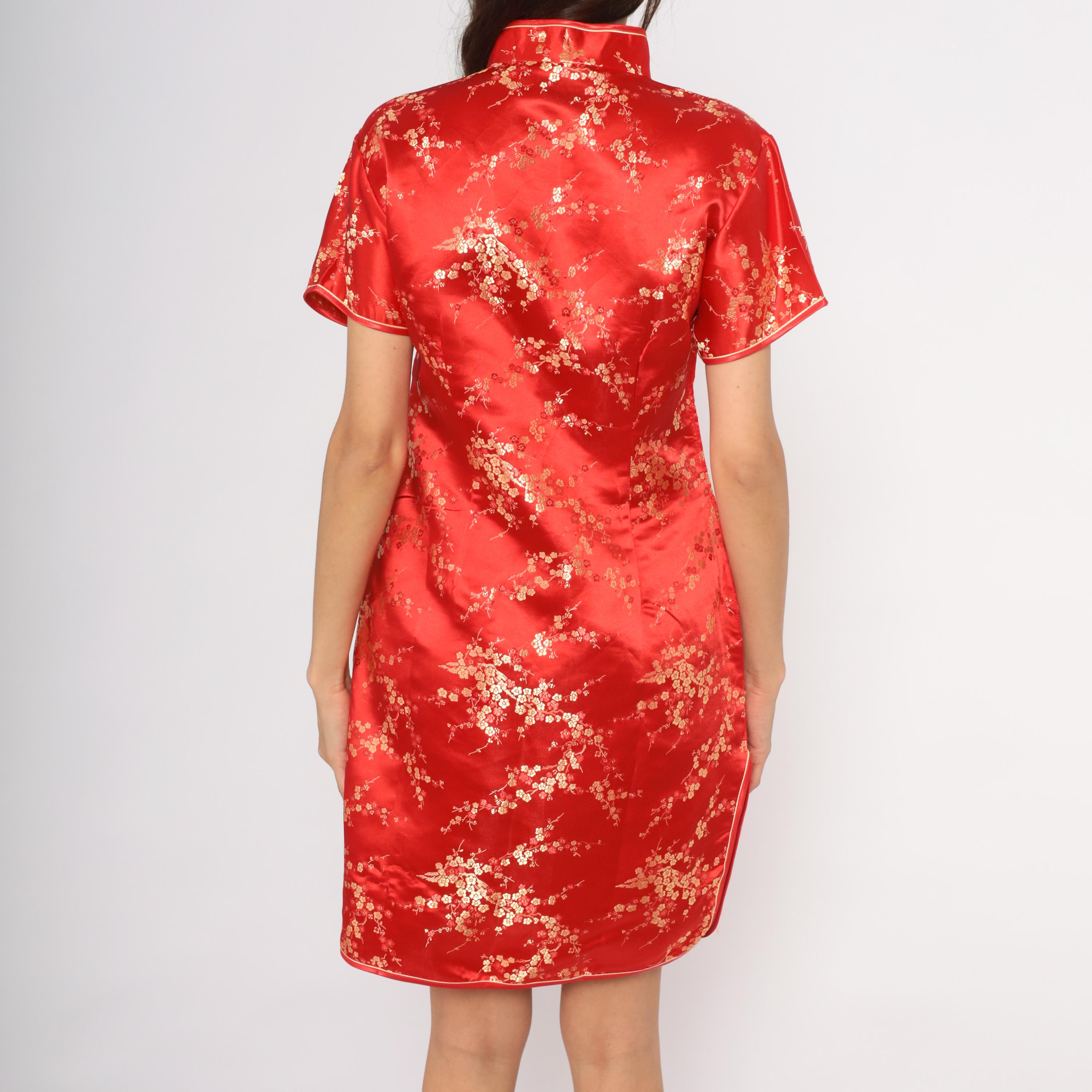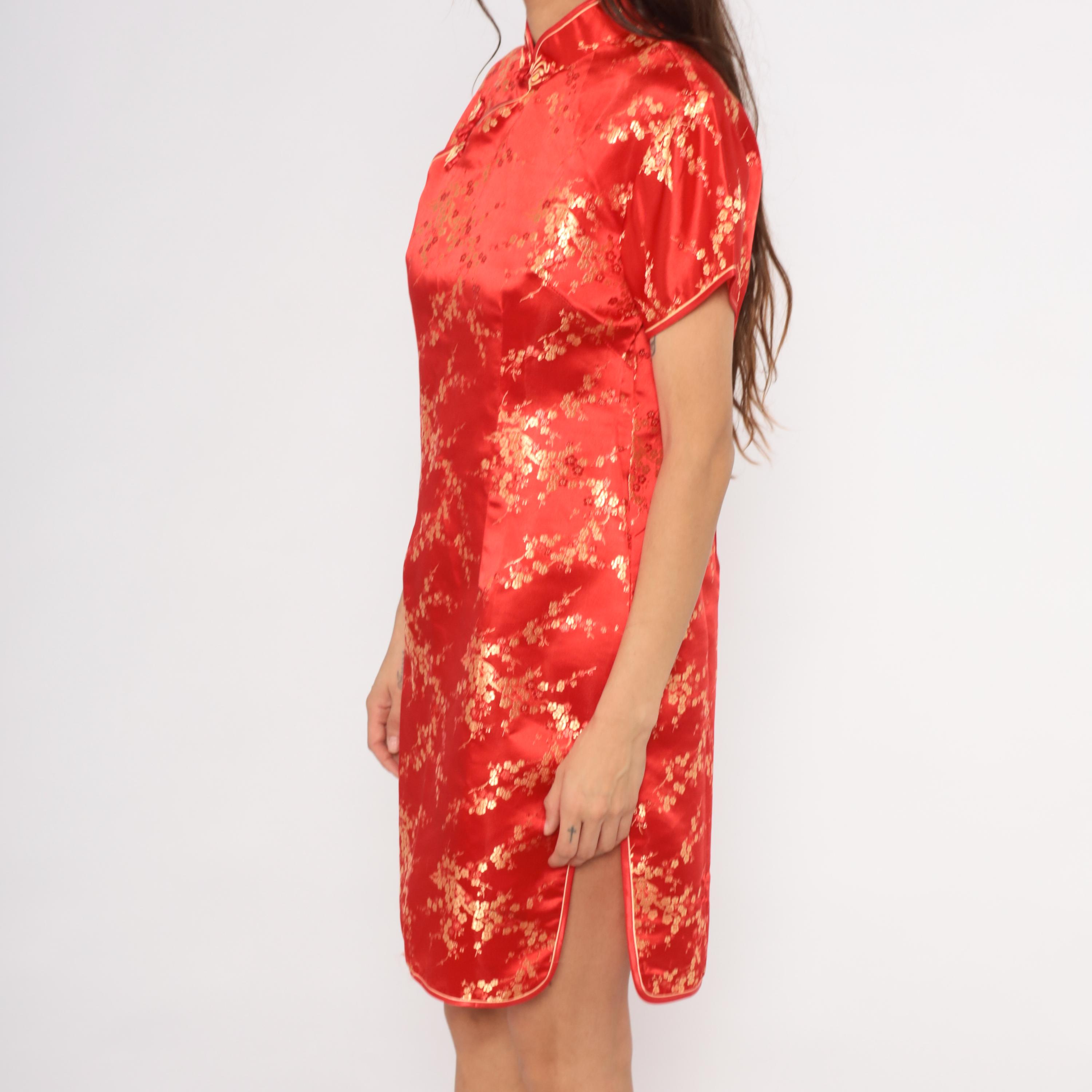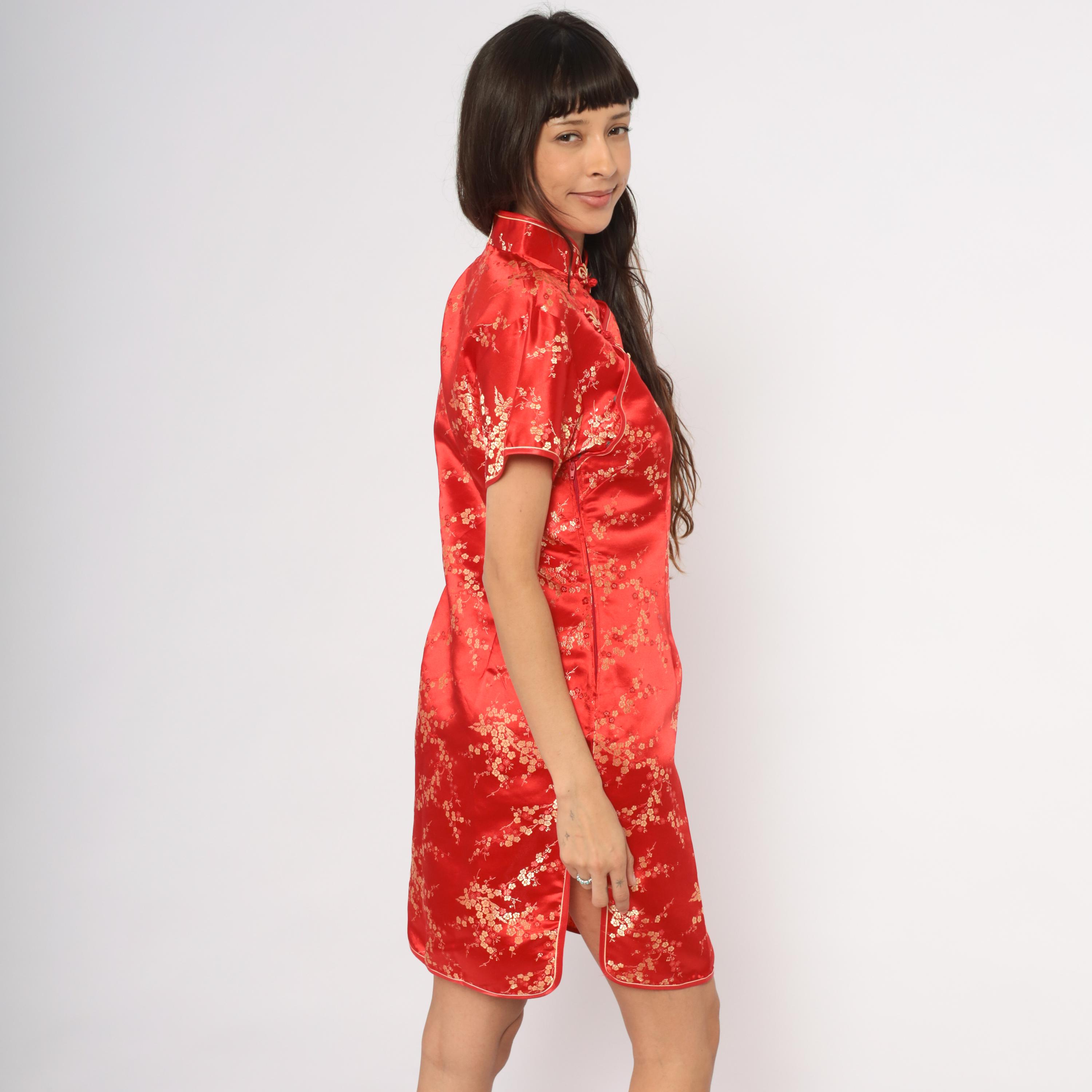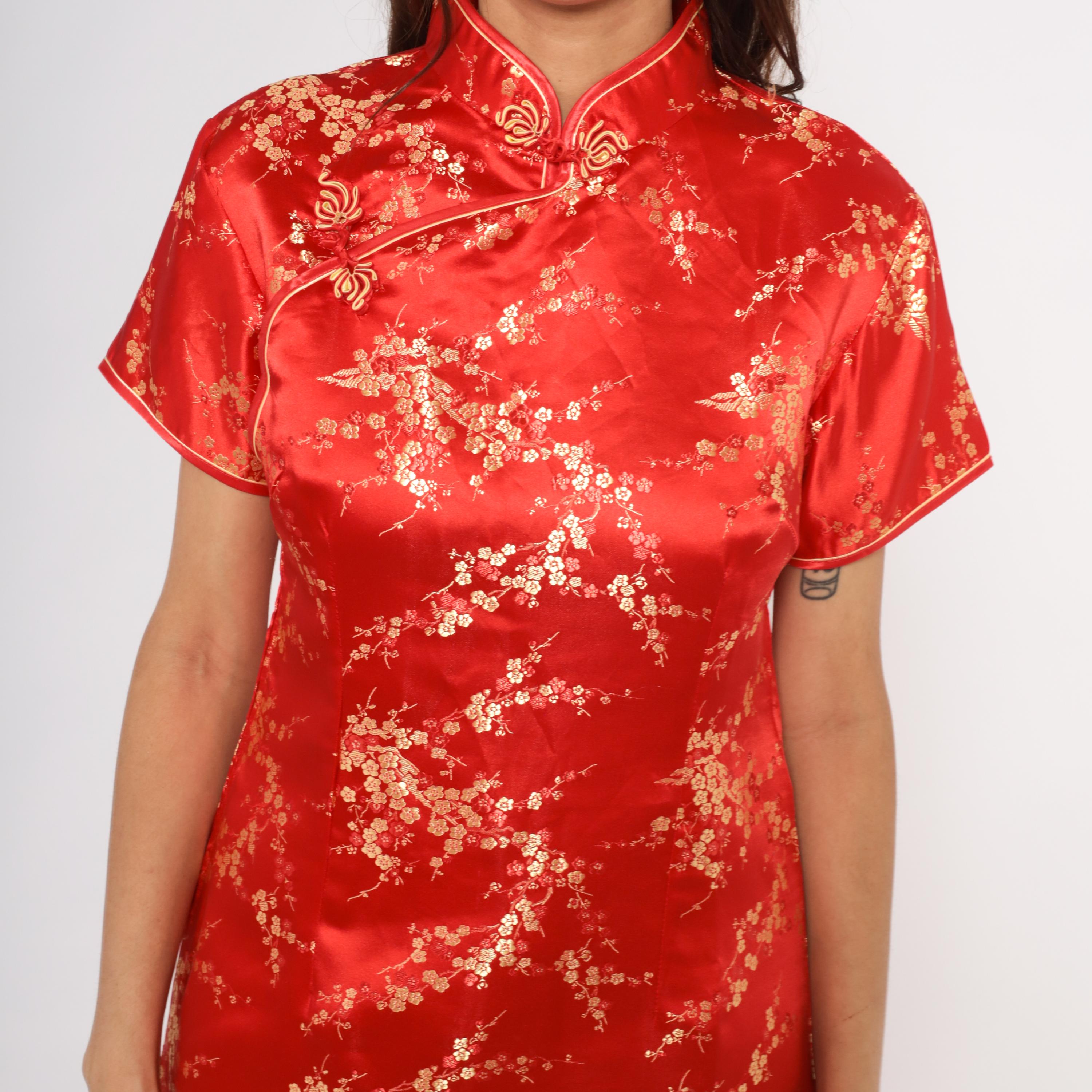 80s red cheongsam dress from Xuan Tang with gold cherry blossom brocade pattern throughout. Mandarin collar with asymmetrical front closure secured by decorative frog knot buttons, hook and eye, and snap closures. Short cap sleeves with piped gold trim along the edges, collar, and hem. Fitted silhouette with side slits at the lower hem.