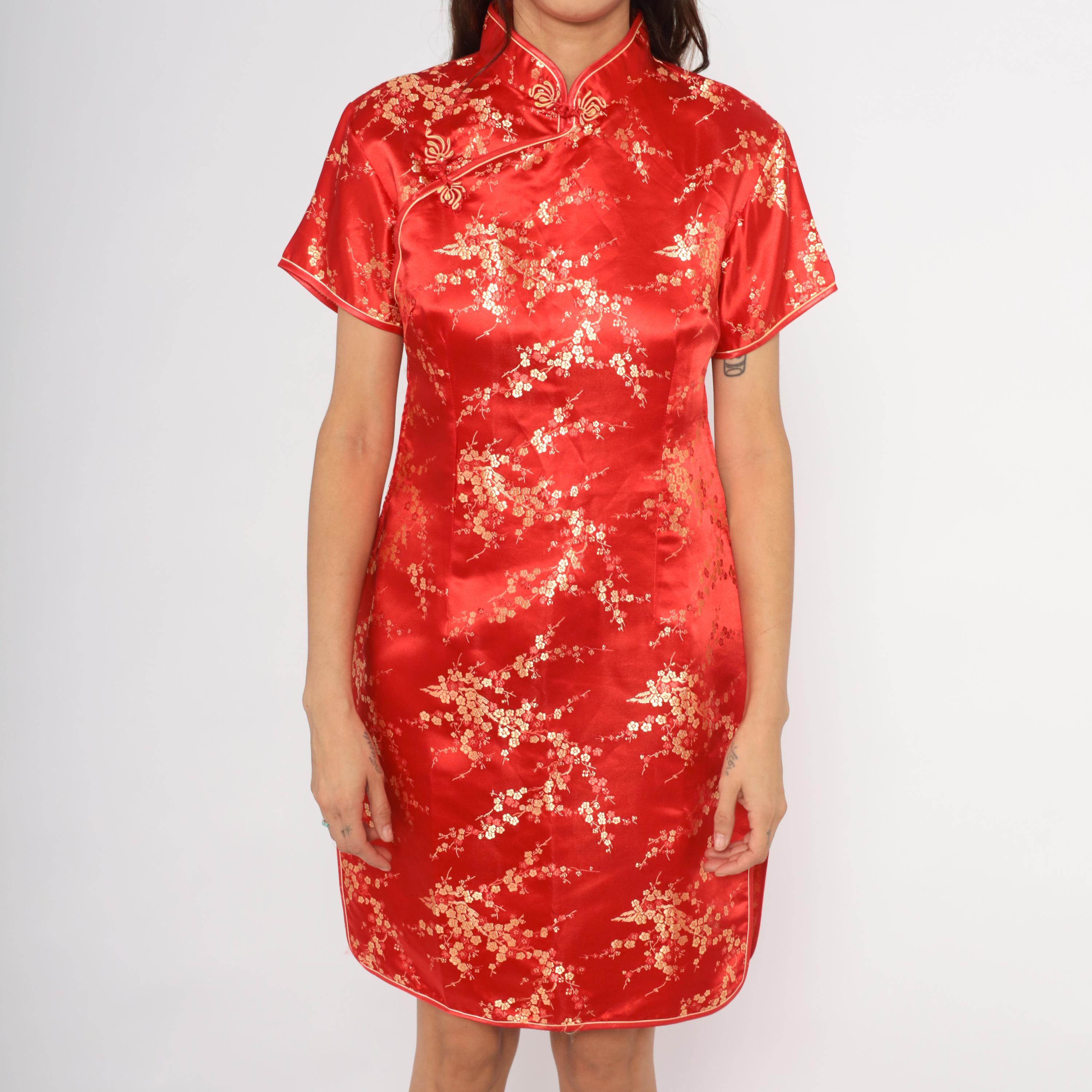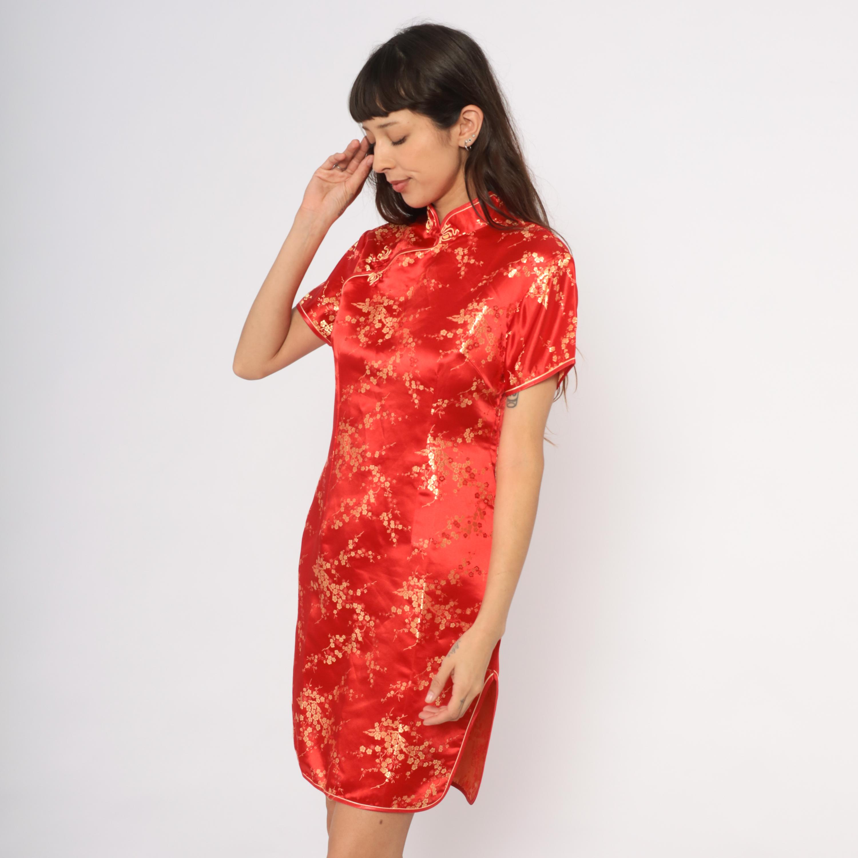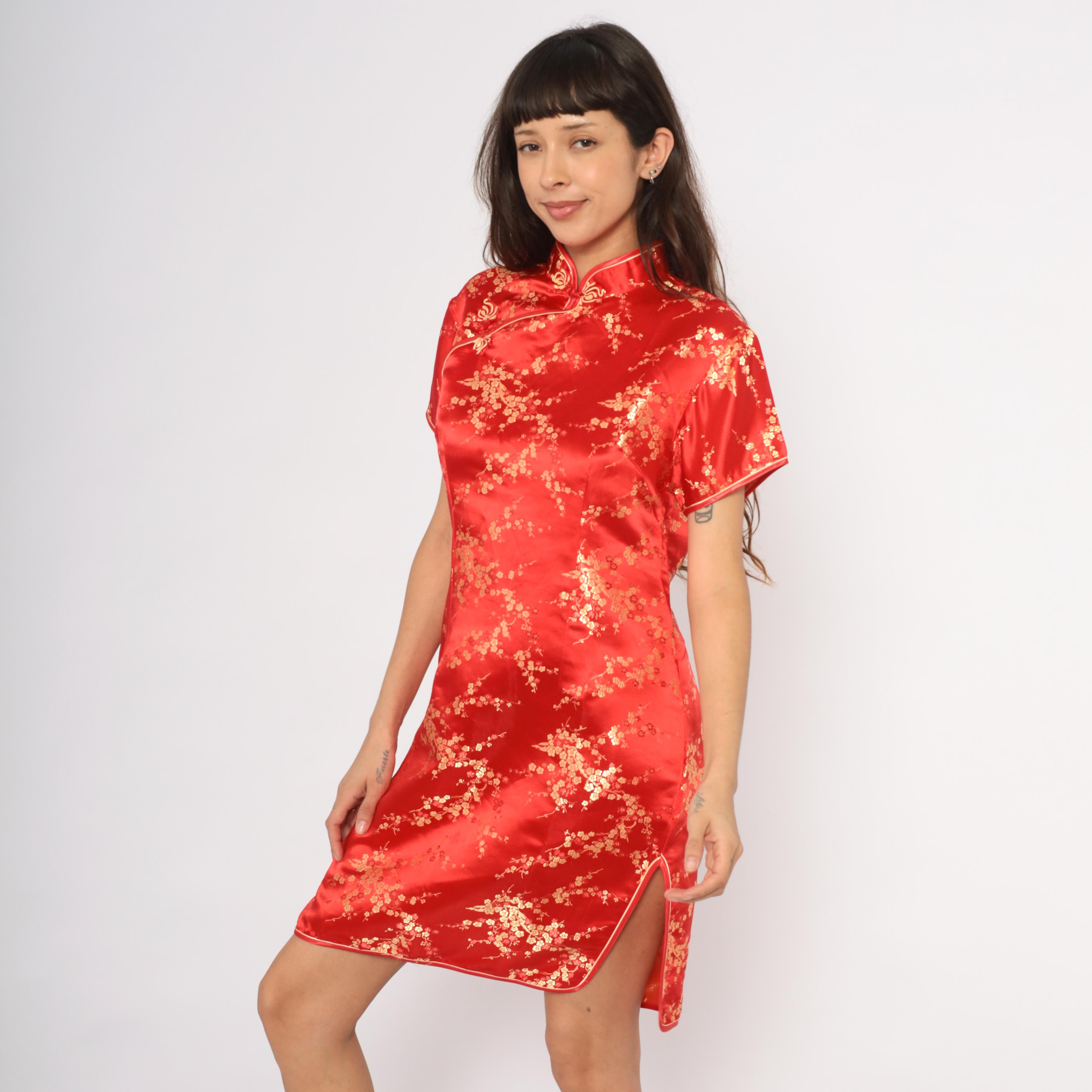 80s red cheongsam dress from Xuan Tang with gold cherry blossom brocade pattern throughout. Mandarin collar with asymmetrical front closure secured by decorative frog knot buttons, hook and eye, and snap closures. Short cap sleeves with piped gold trim along the edges, collar, and hem. Fitted silhouette with side slits at the lower hem.