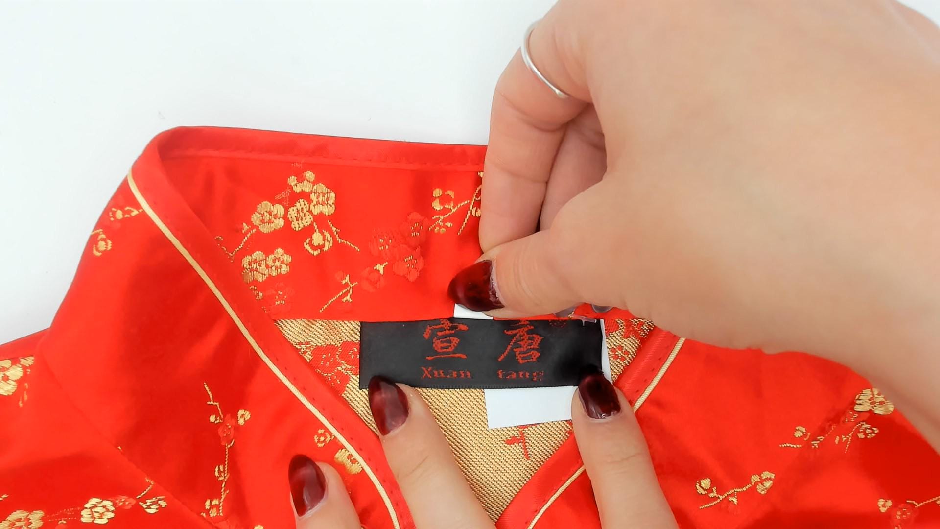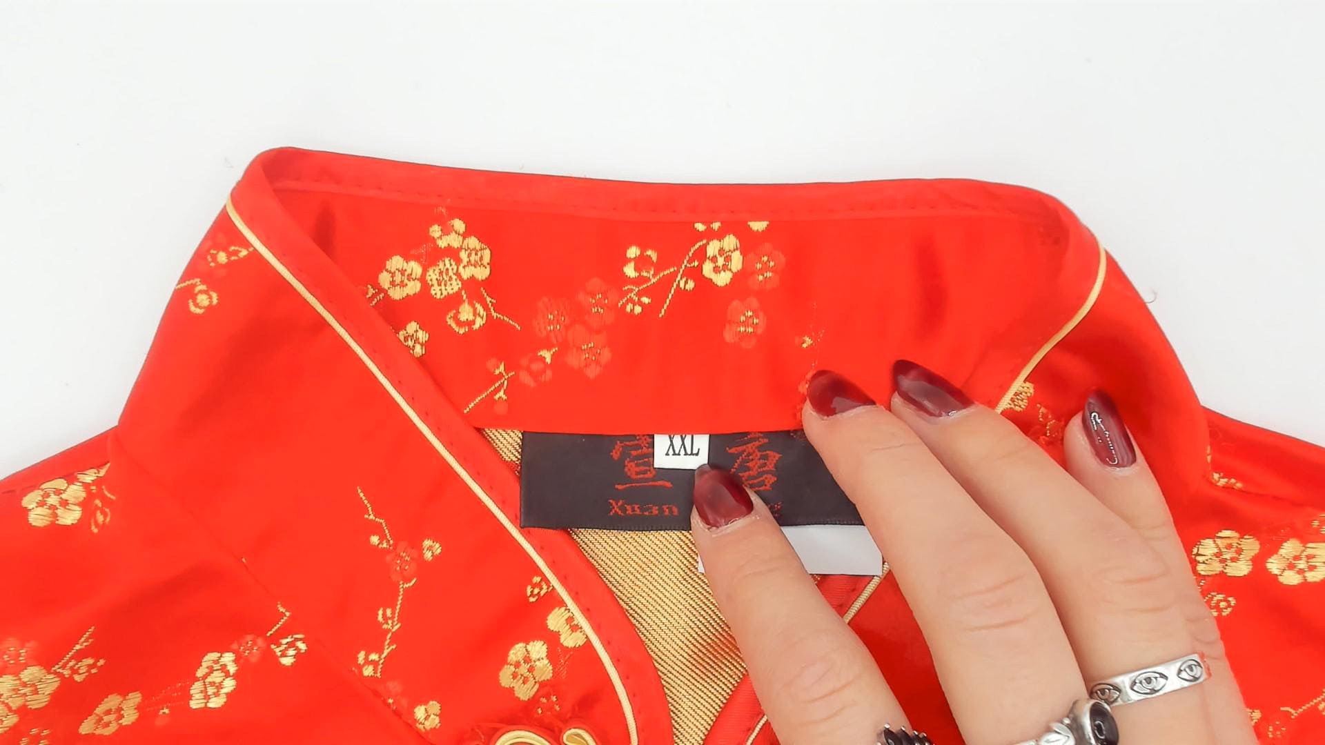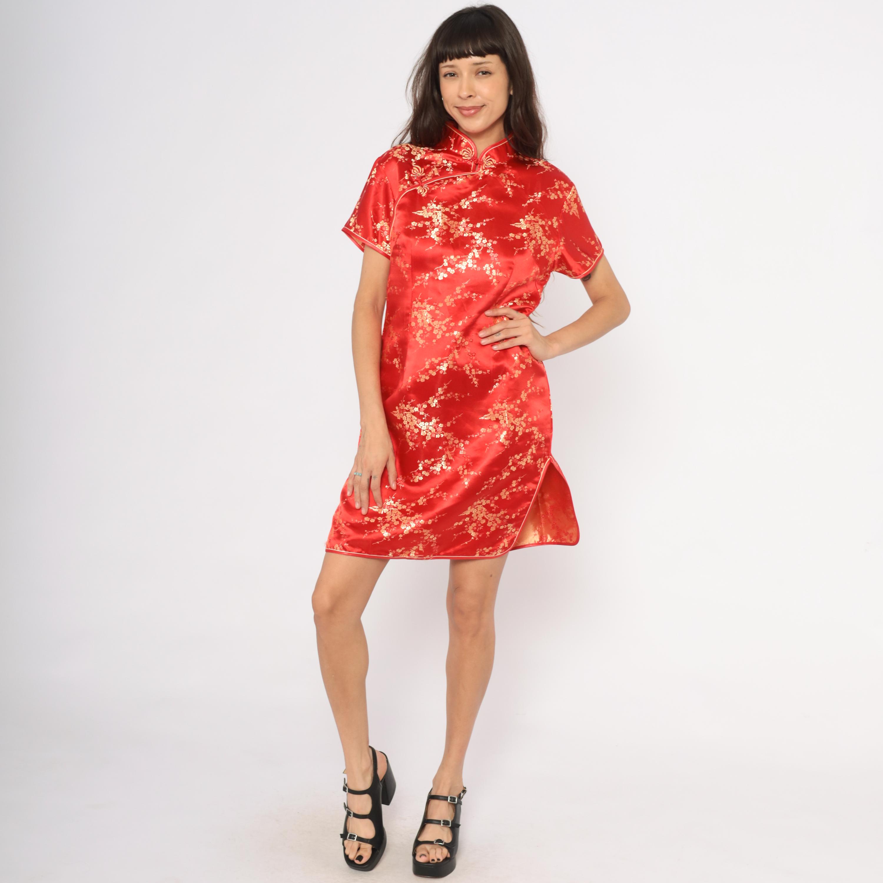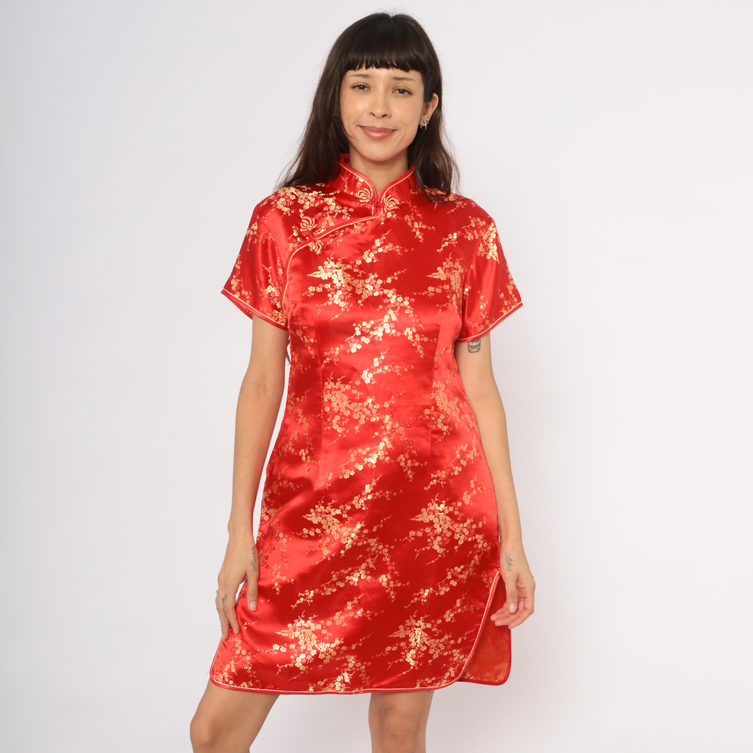 80s red cheongsam dress from Xuan Tang with gold cherry blossom brocade pattern throughout. Mandarin collar with asymmetrical front closure secured by decorative frog knot buttons, hook and eye, and snap closures. Short cap sleeves with piped gold trim along the edges, collar, and hem. Fitted silhouette with side slits at the lower hem.