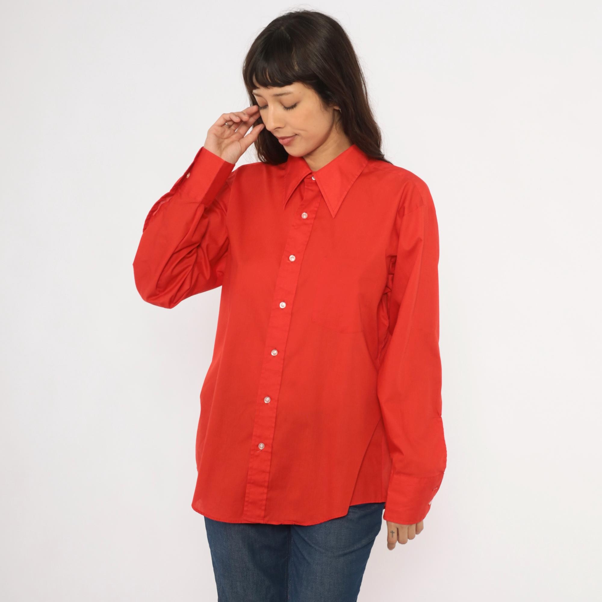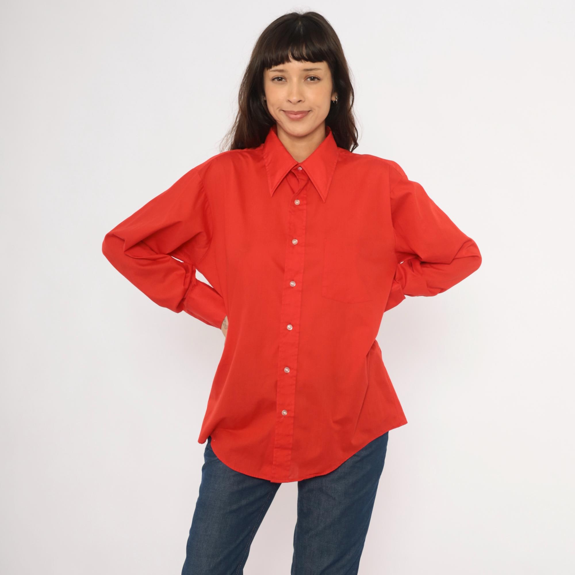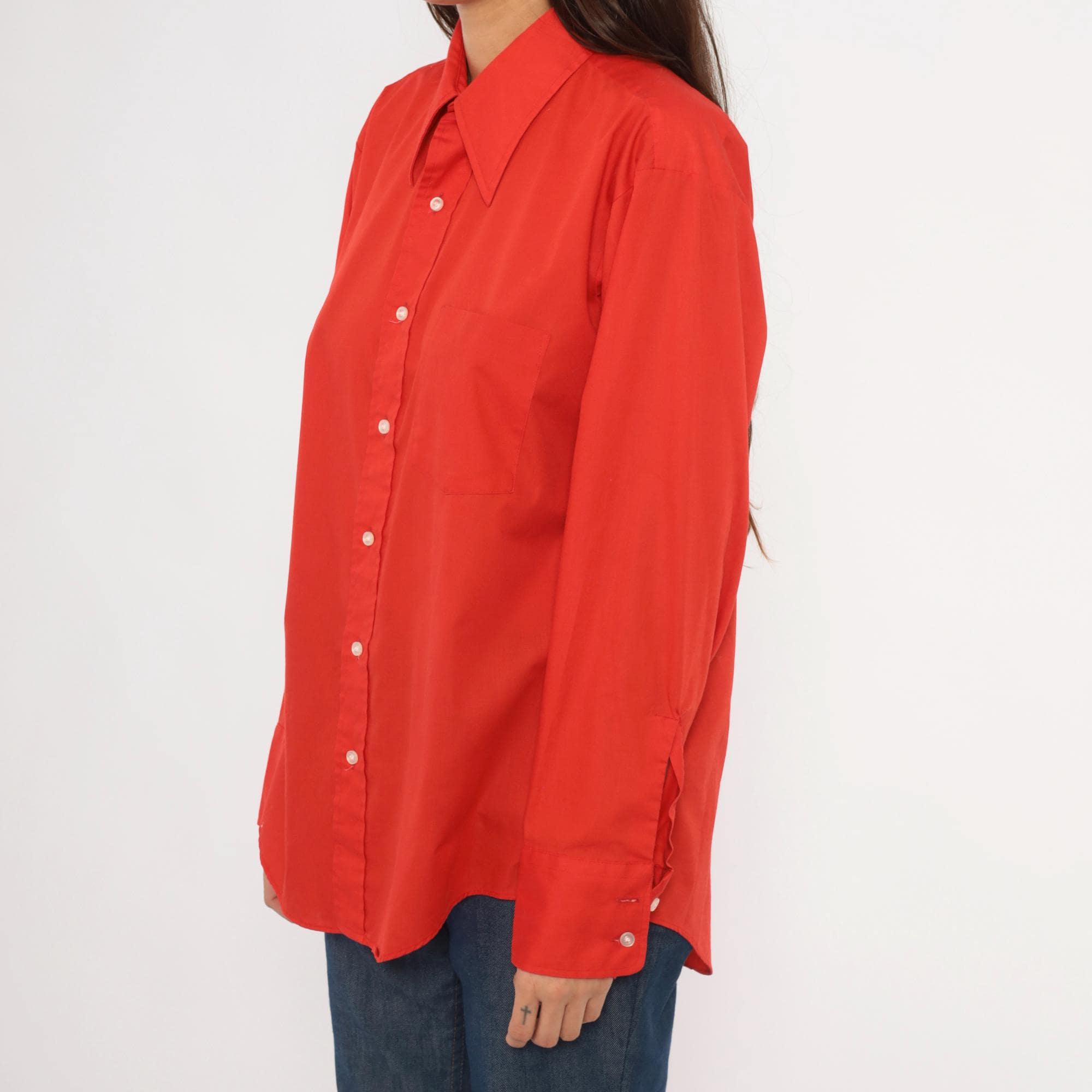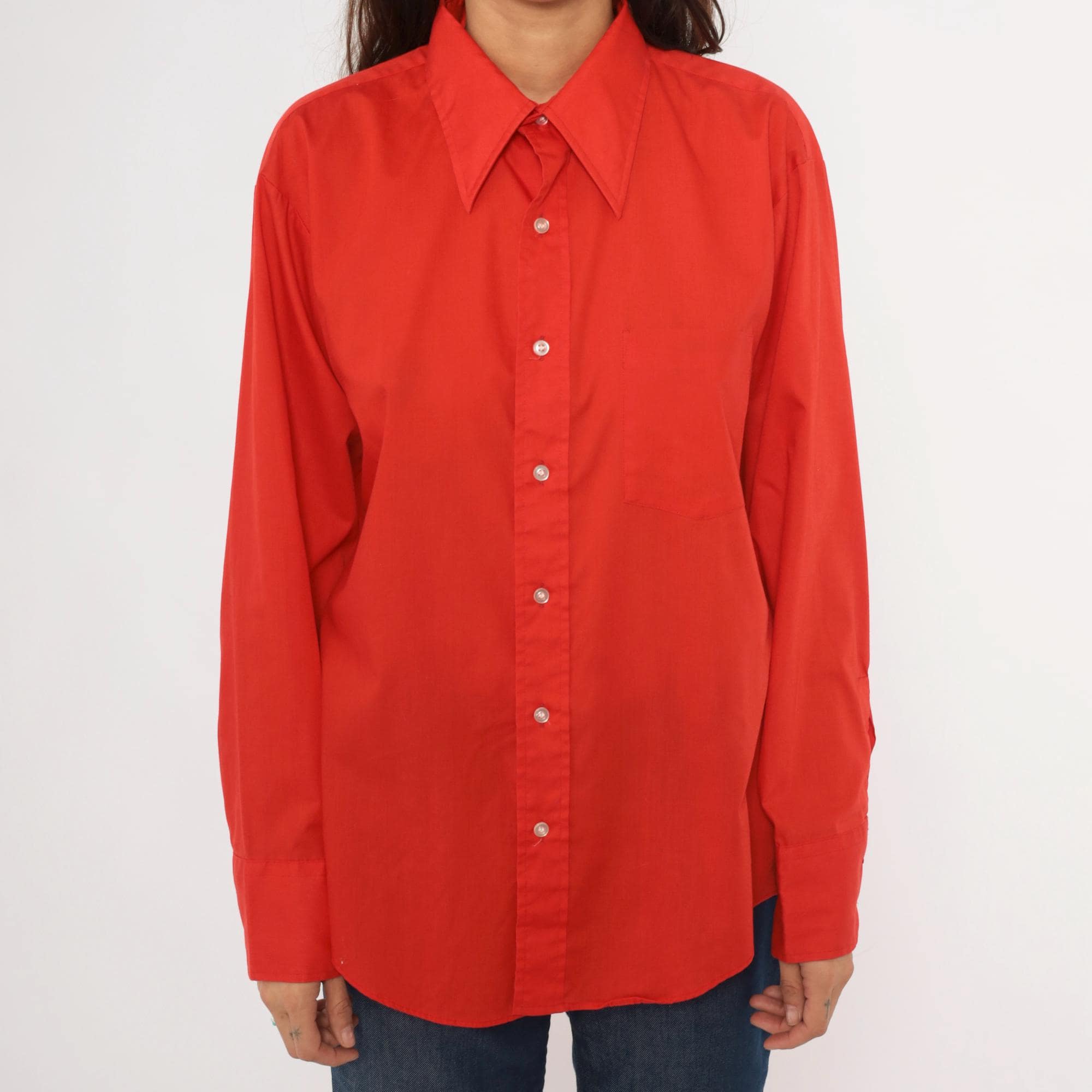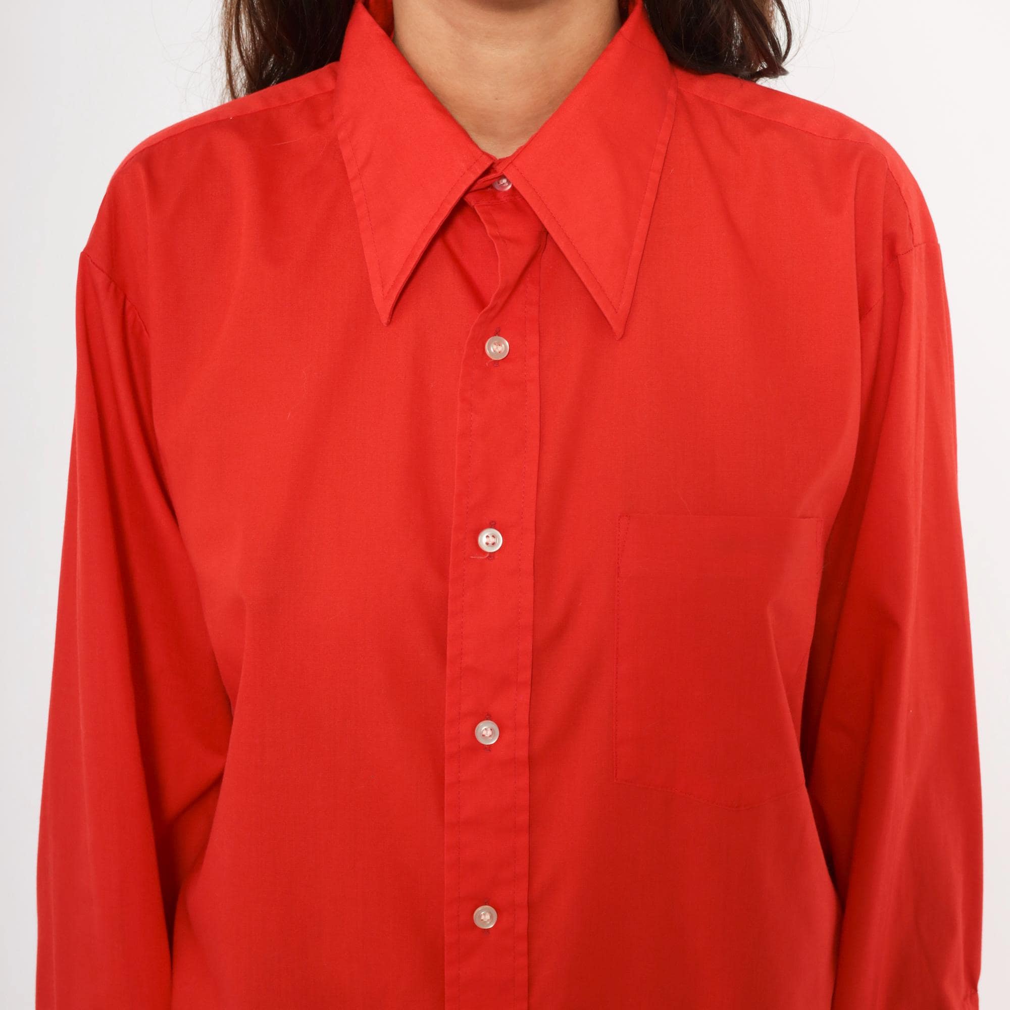 70s red button front shirt from Golden Vee with a pointed collar and full button placket with clear buttons. Long sleeves with single-button barrel cuffs, a front patch pocket on the left chest, and a back yoke with a center box pleat.