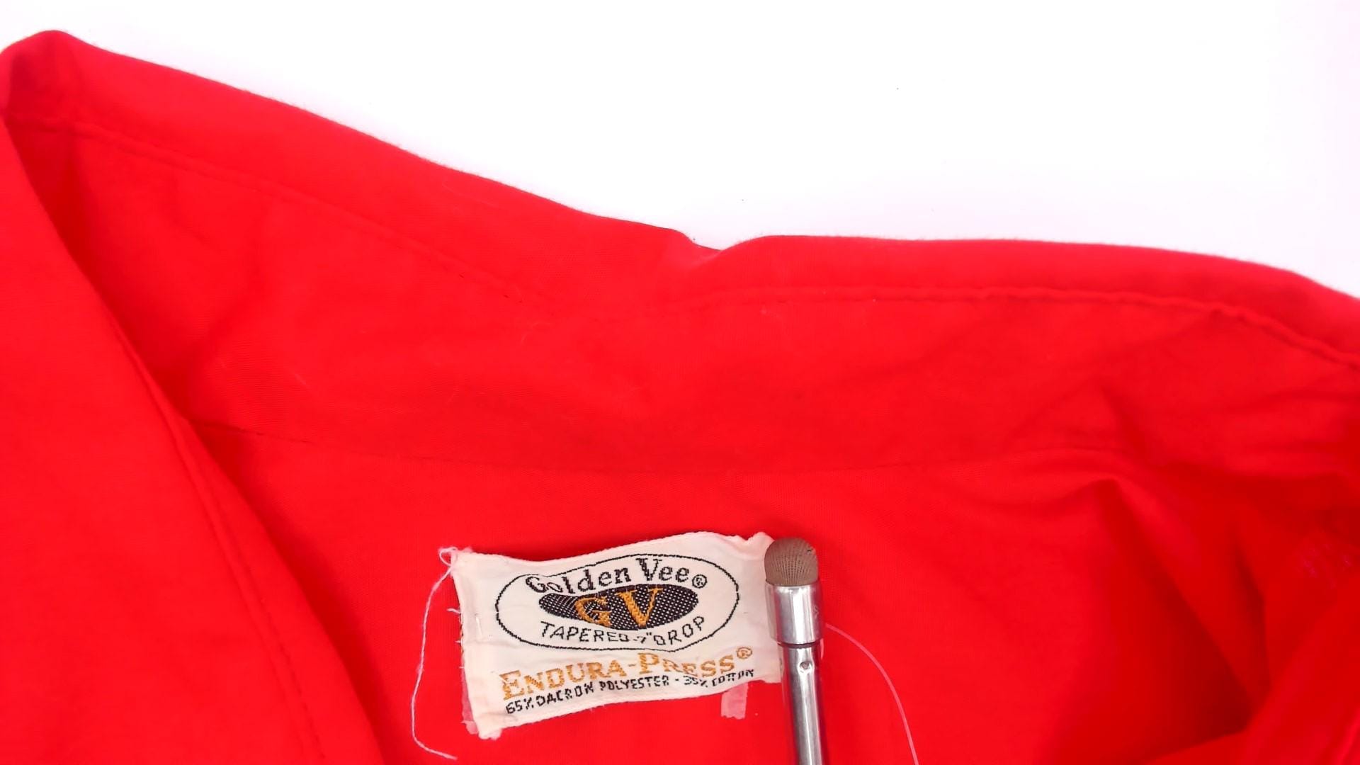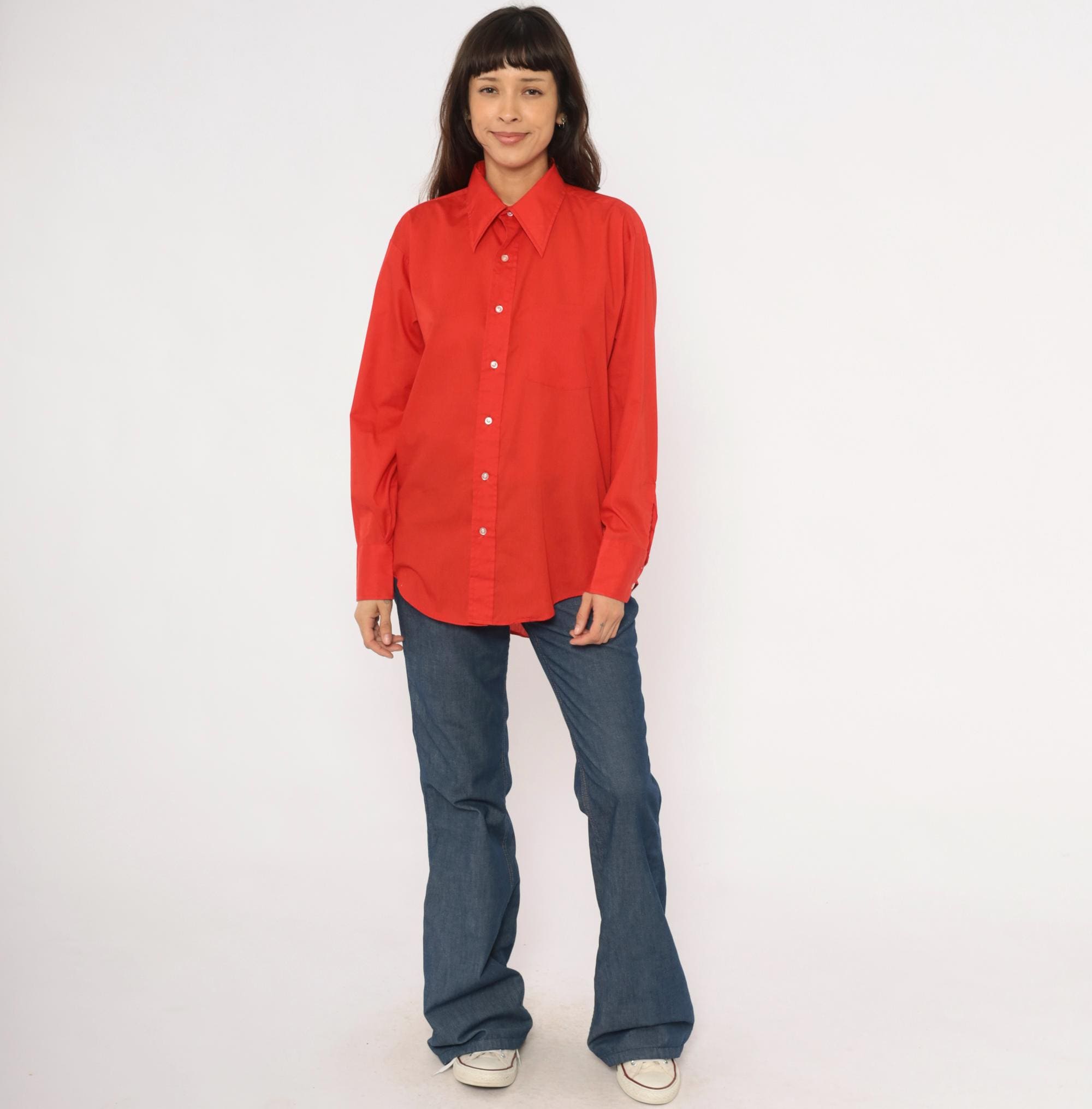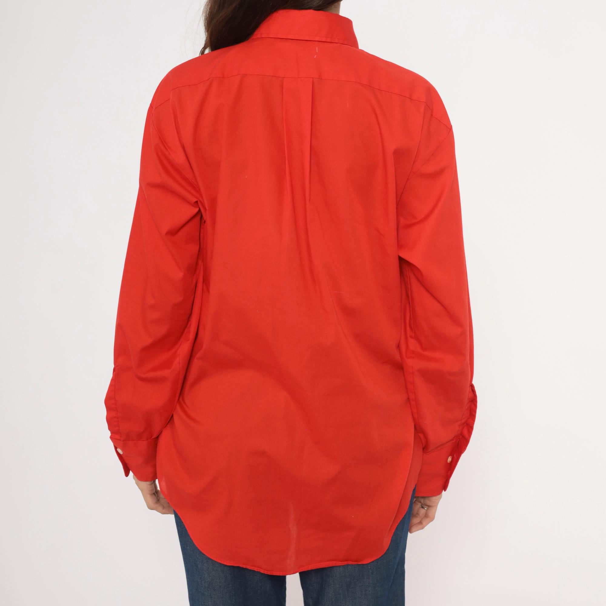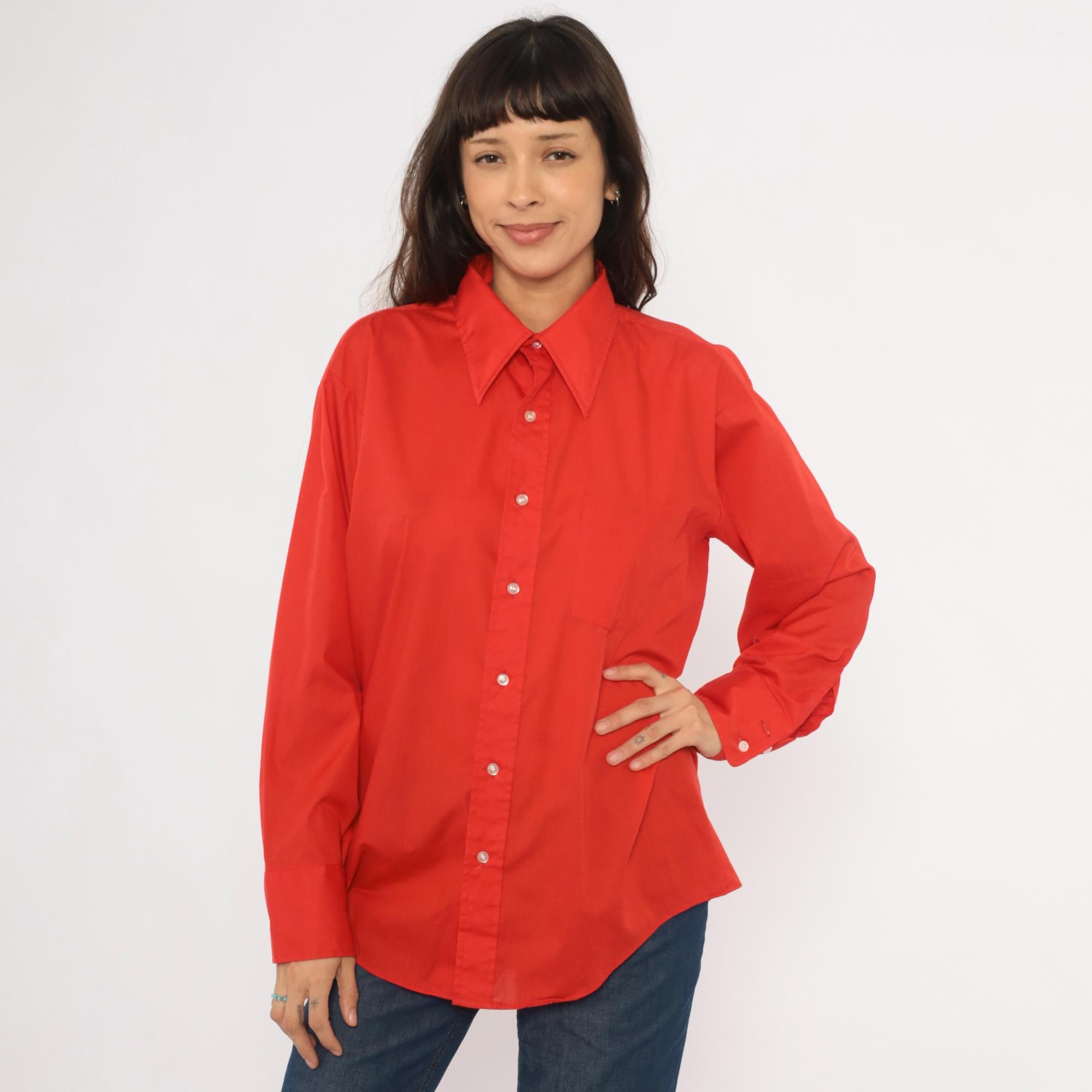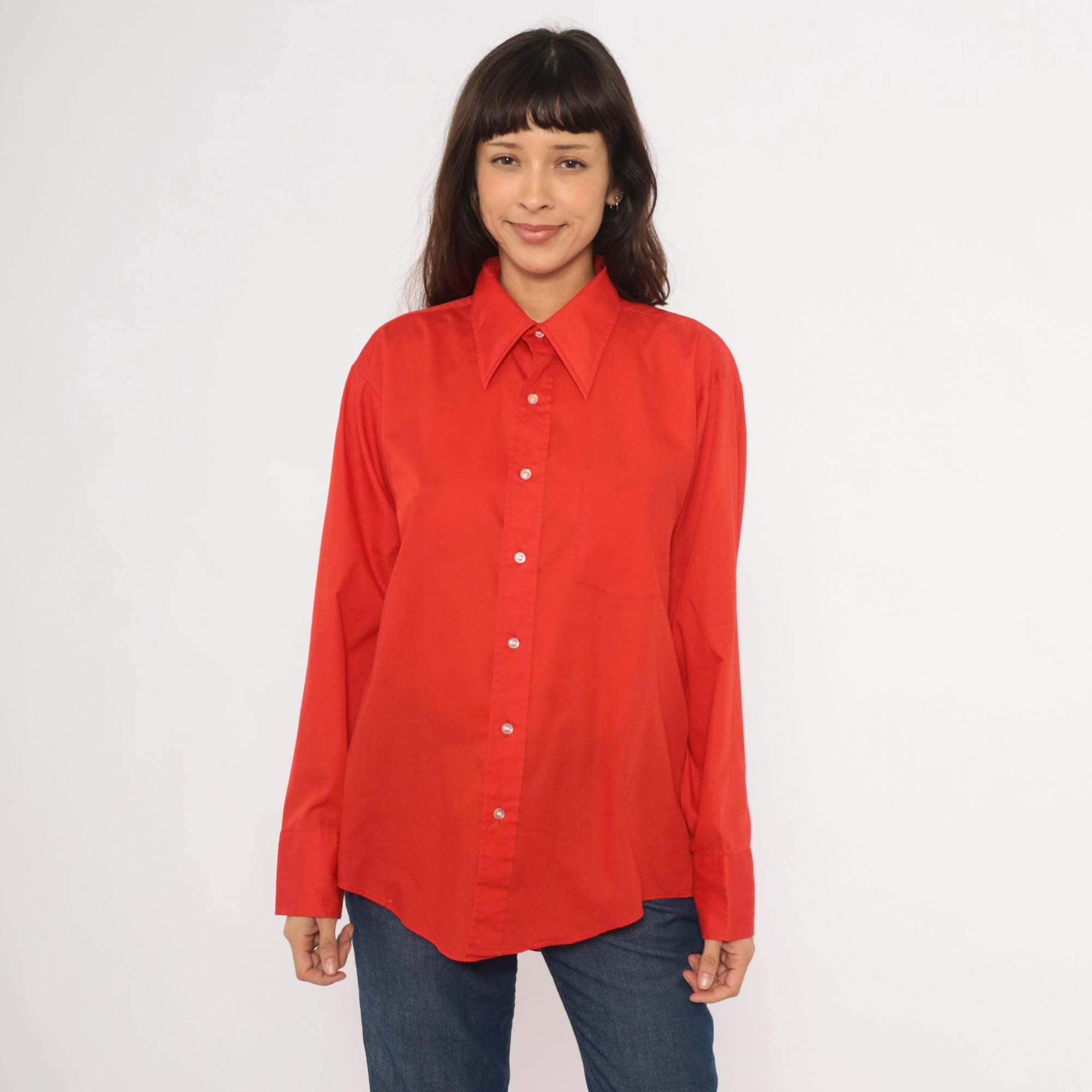 70s red button front shirt from Golden Vee with a pointed collar and full button placket with clear buttons. Long sleeves with single-button barrel cuffs, a front patch pocket on the left chest, and a back yoke with a center box pleat.
