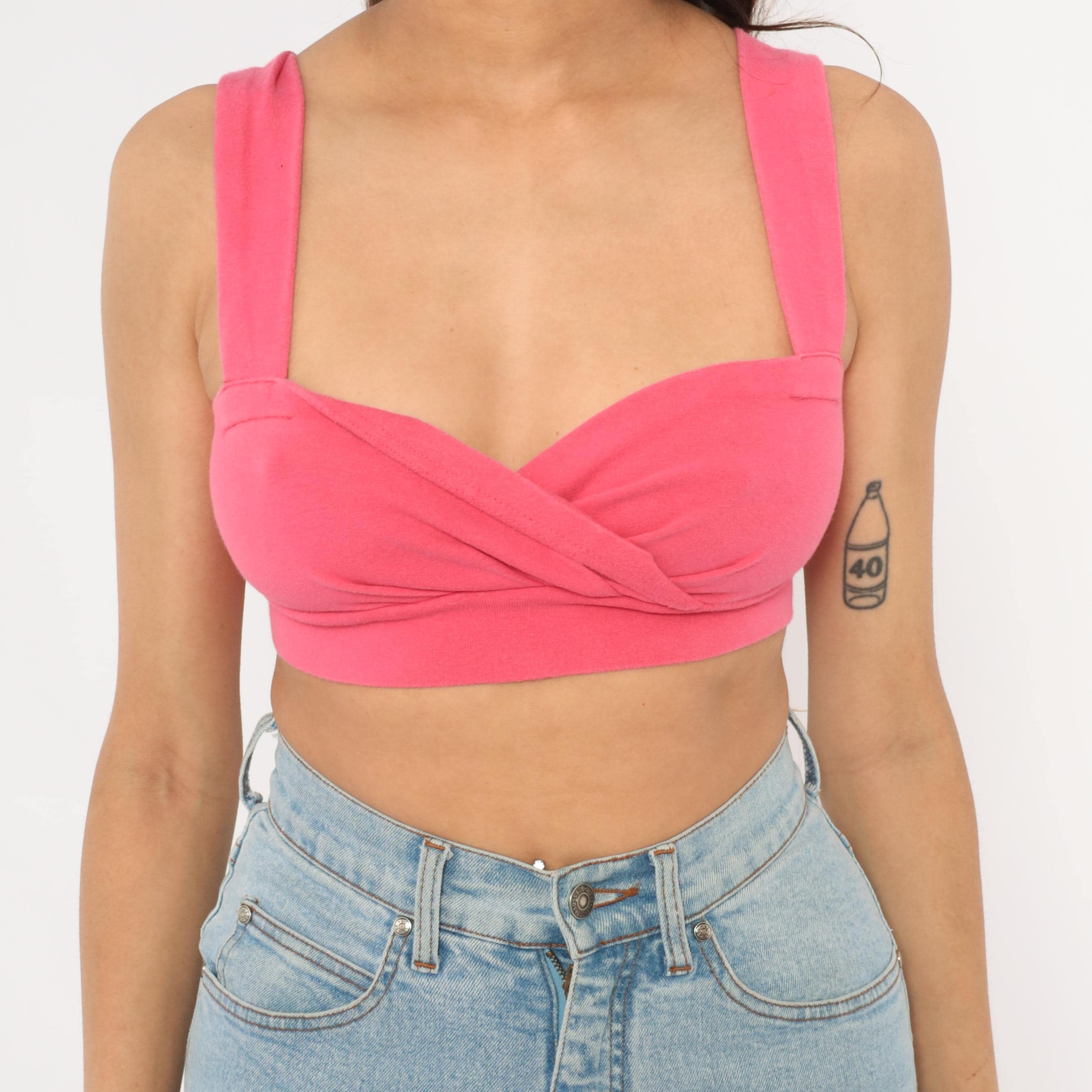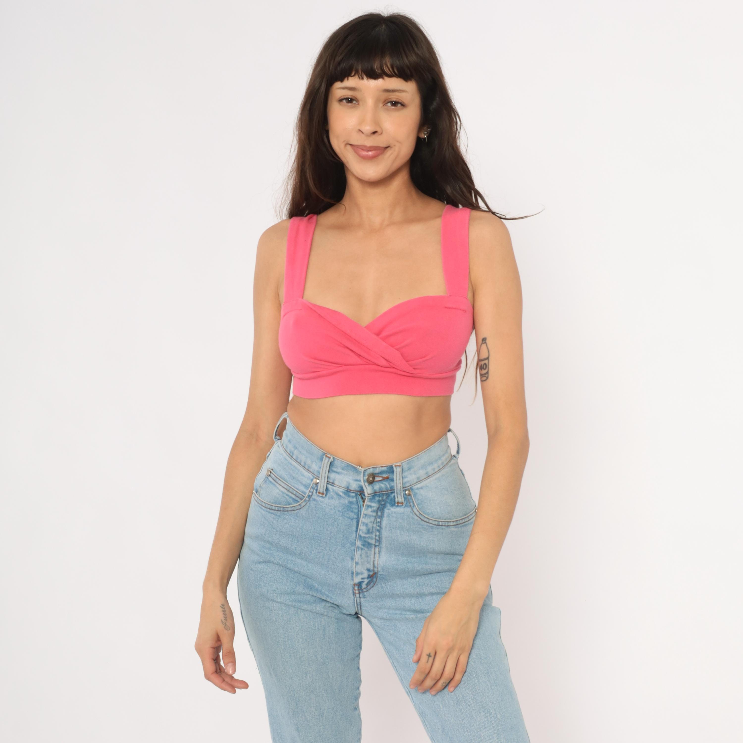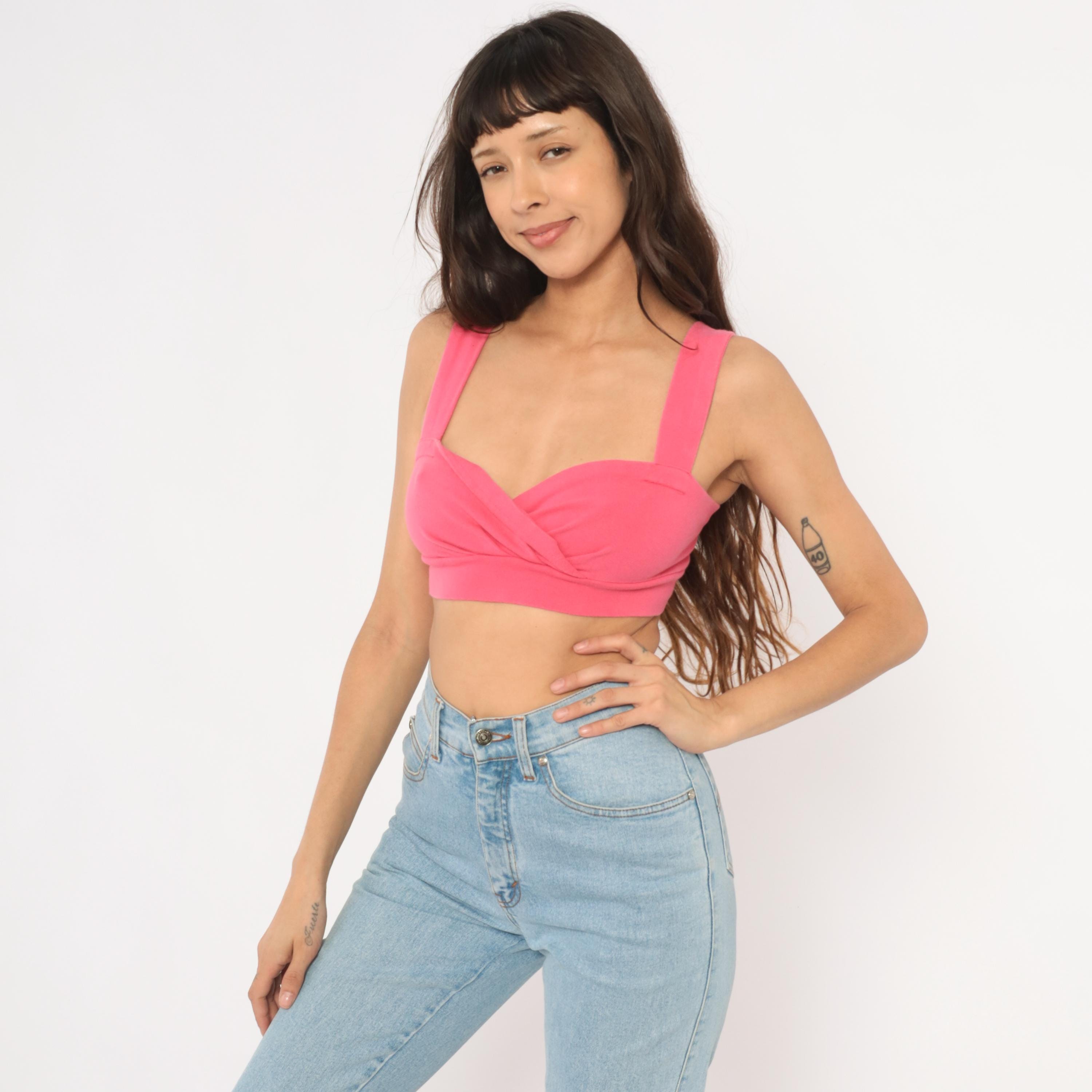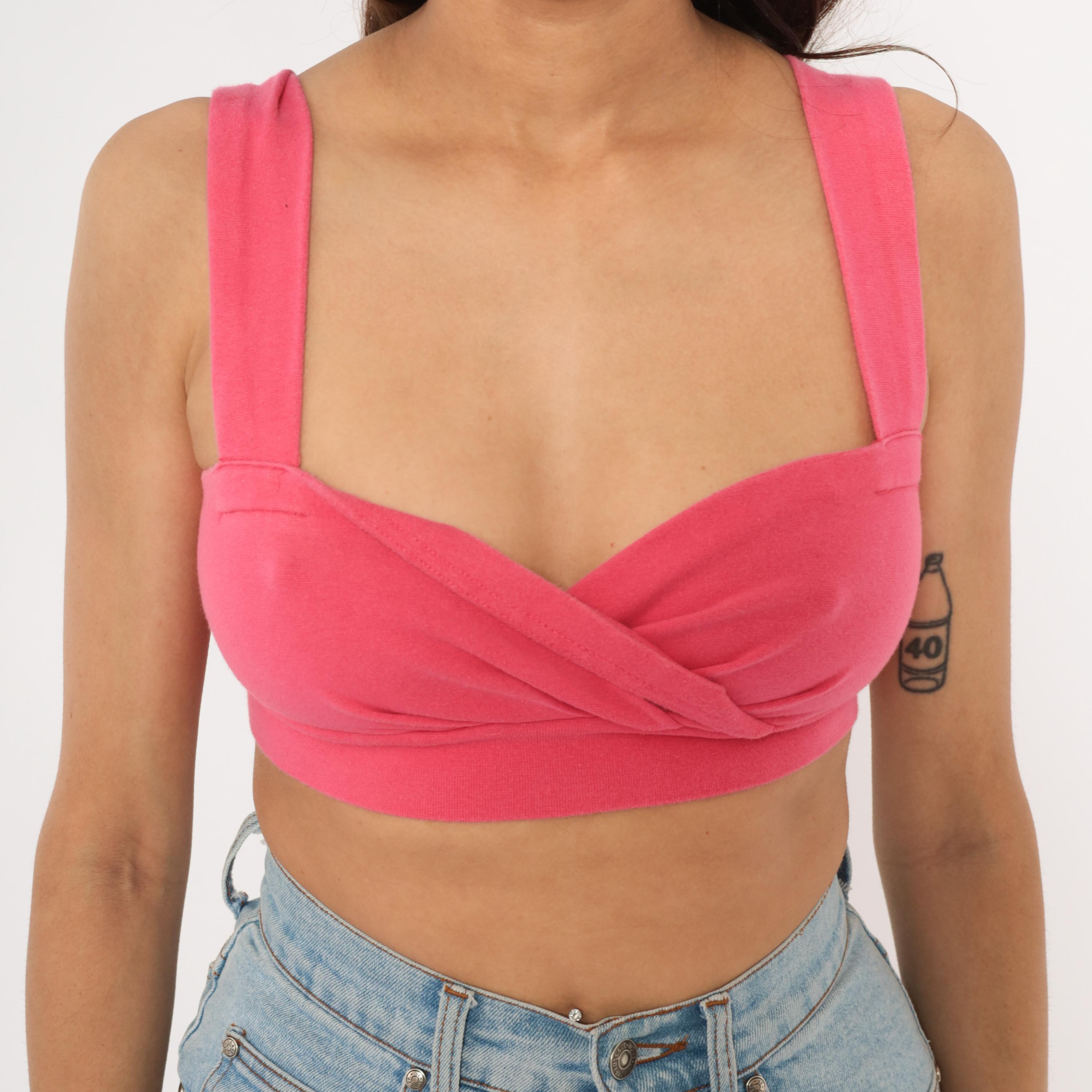 90s hot pink twist-front crop top from Express Tricot with a sweetheart neckline and wide shoulder straps. Crossover bandeau-style bodice with structured cups and a fitted band at the underbust.