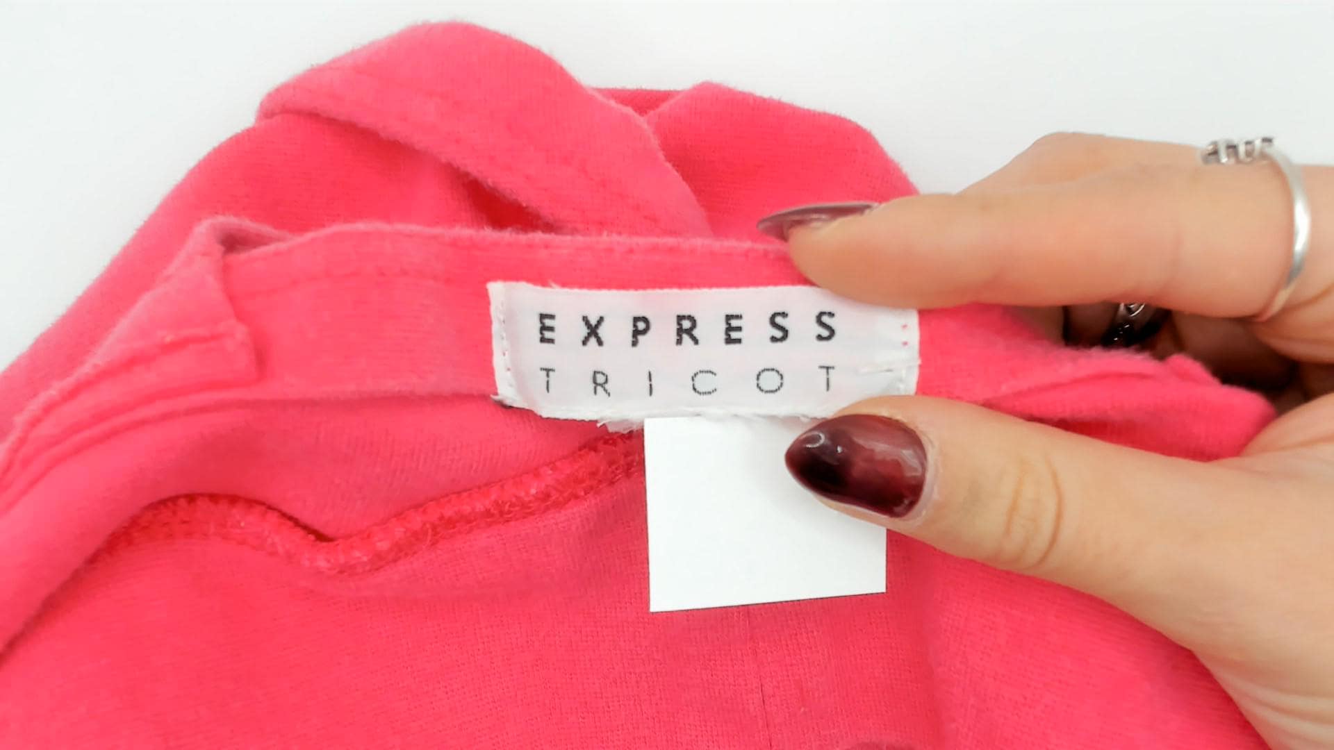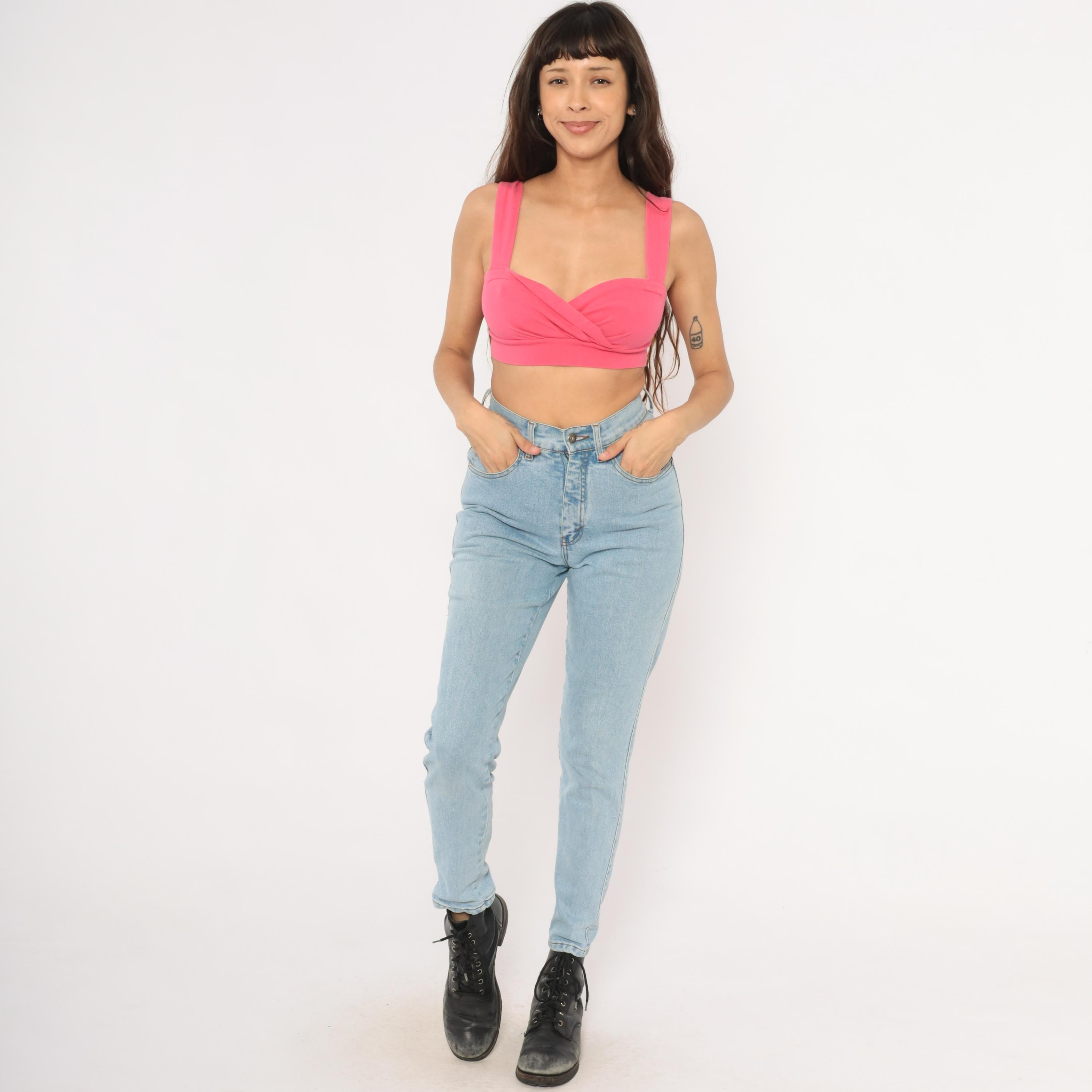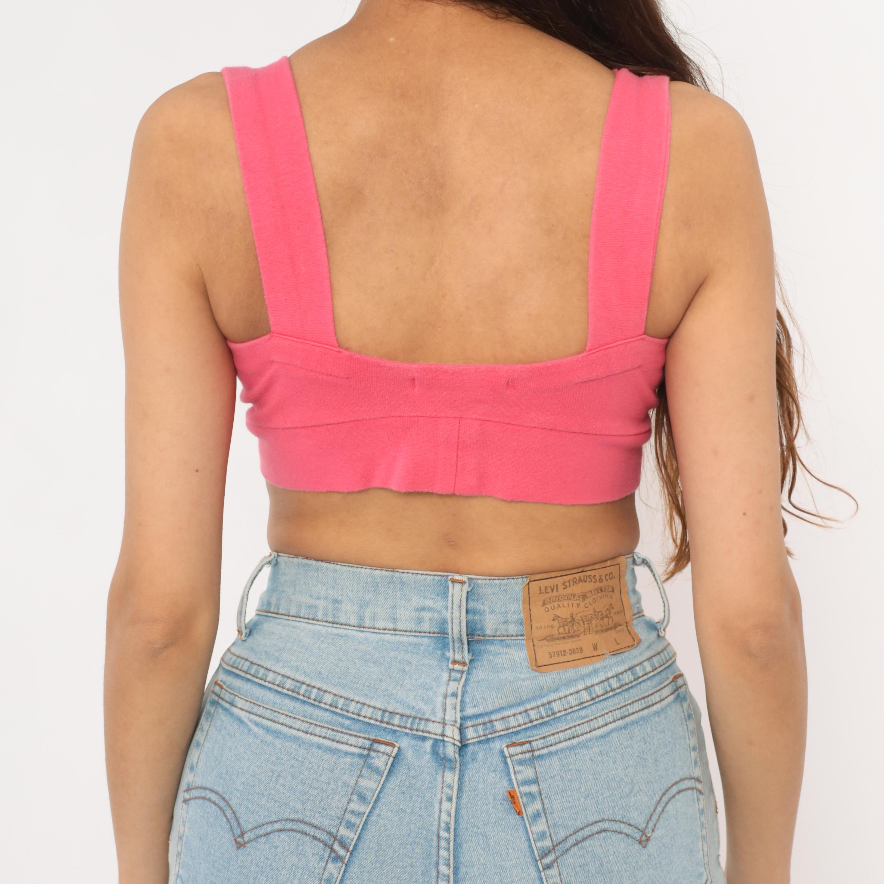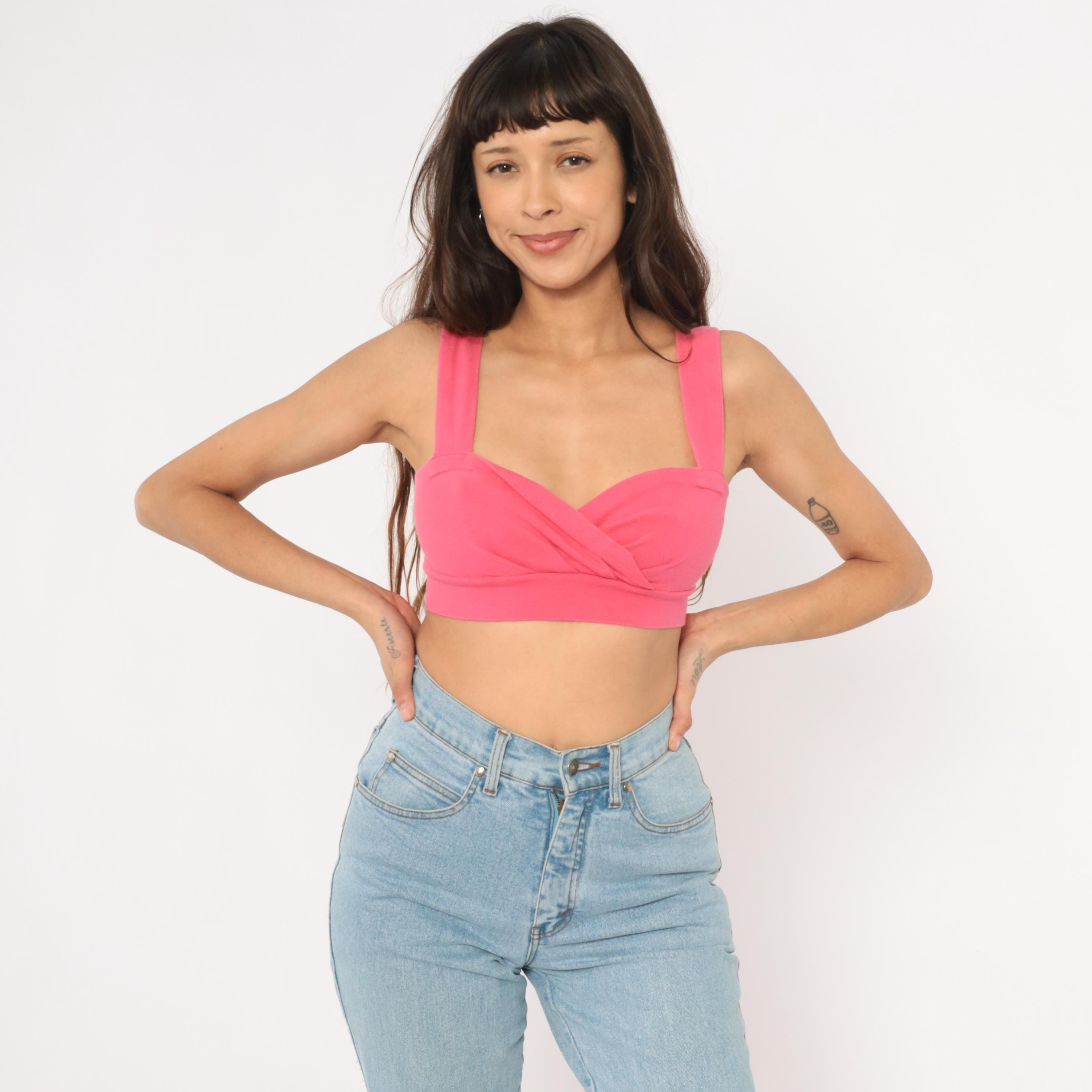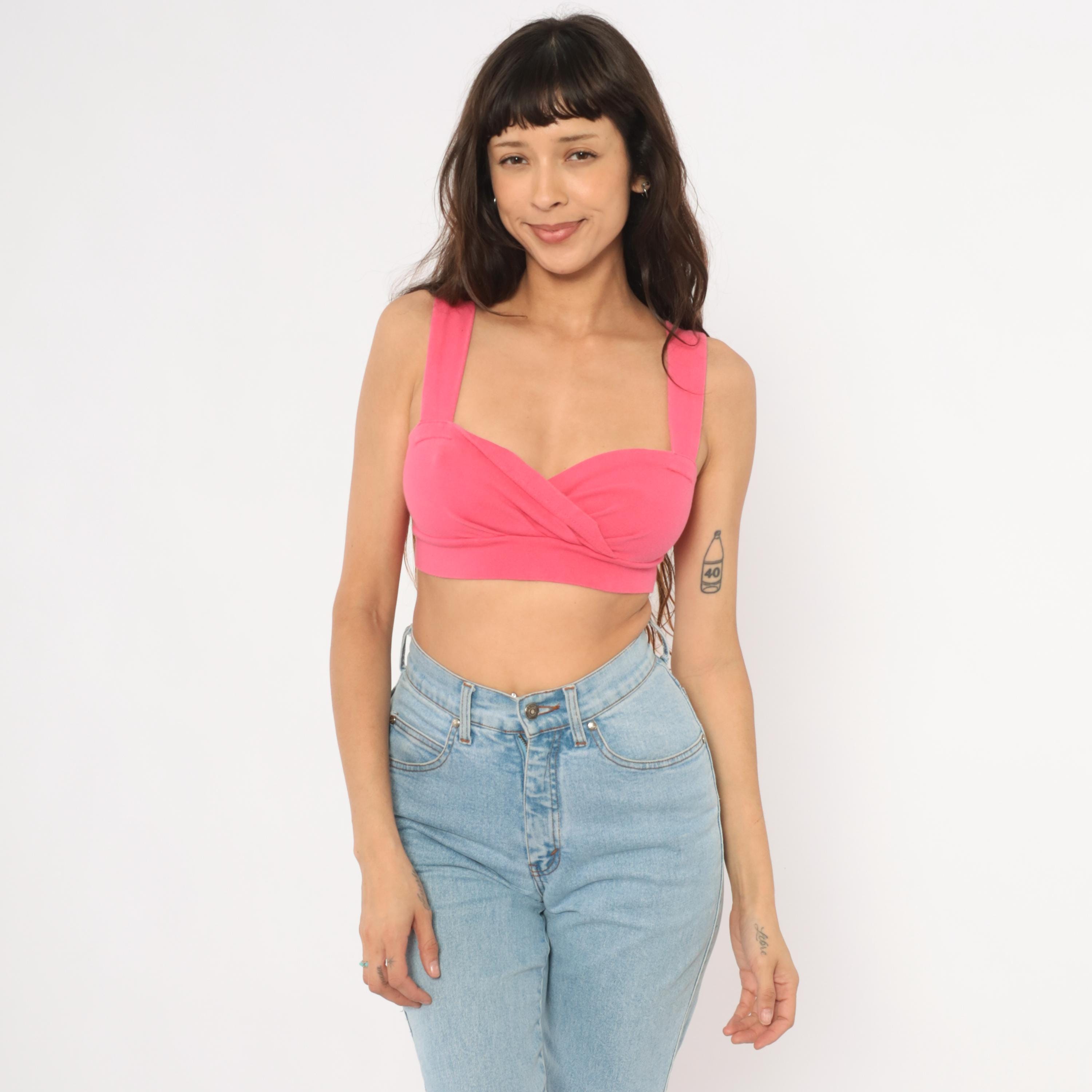 90s hot pink twist-front crop top from Express Tricot with a sweetheart neckline and wide shoulder straps. Crossover bandeau-style bodice with structured cups and a fitted band at the underbust.