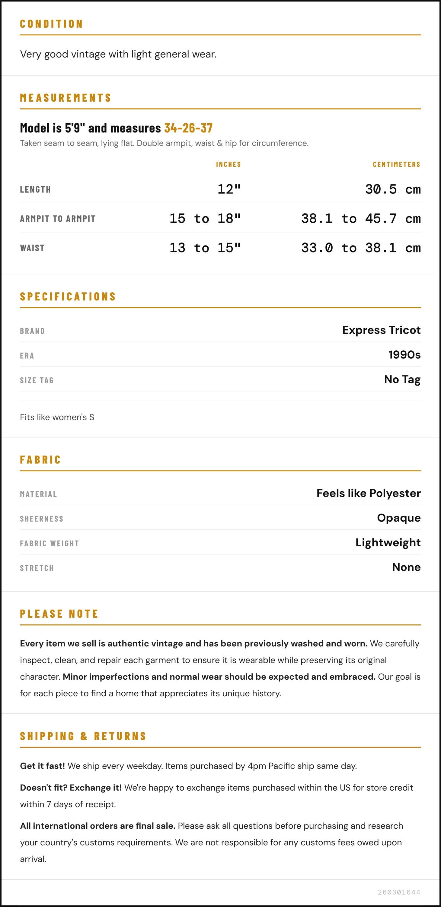 Vintage denim was usually made without any stretch, unlike modern jeans. Check the measurements to ensure proper fit, and remember to give yourself a little wiggle room in the waist and hips, depending on your preferred fit.