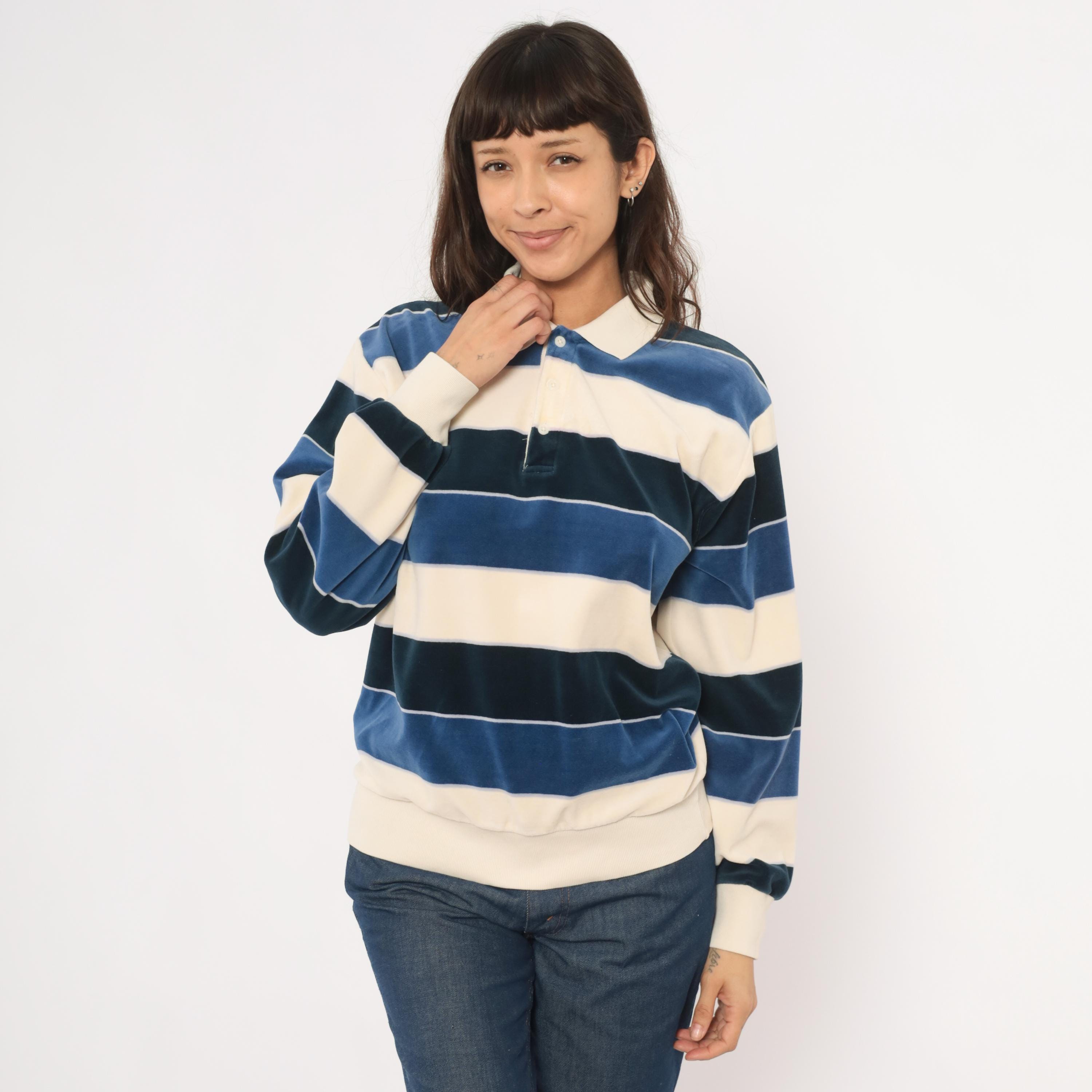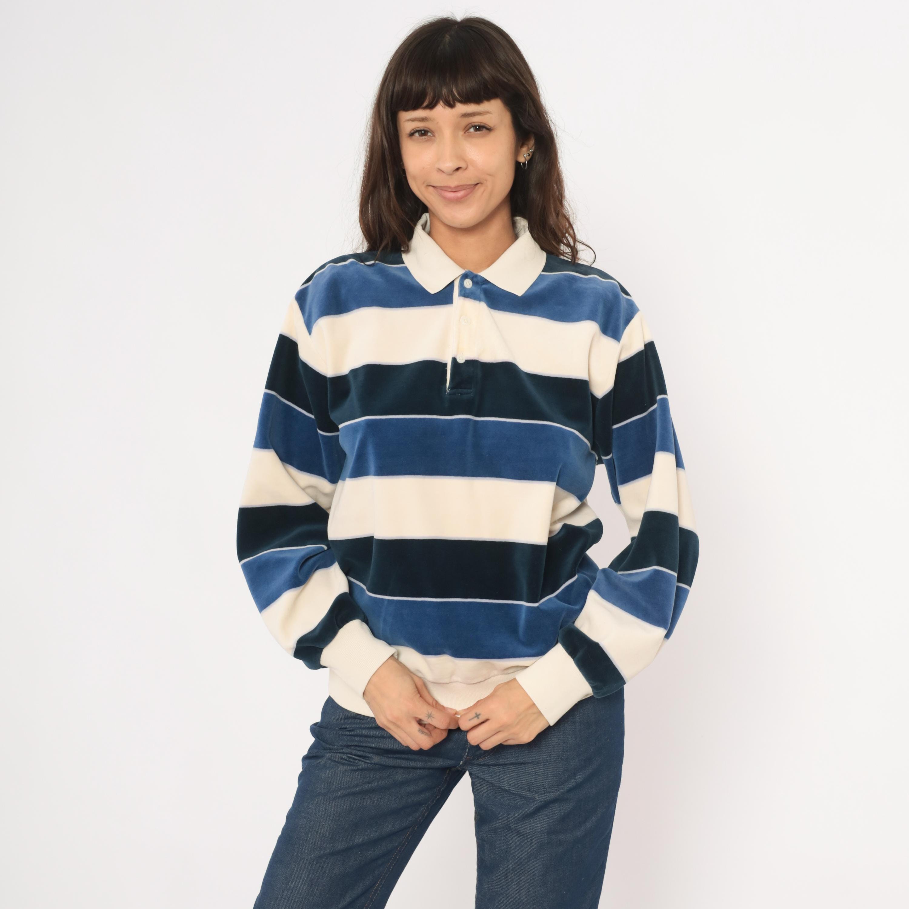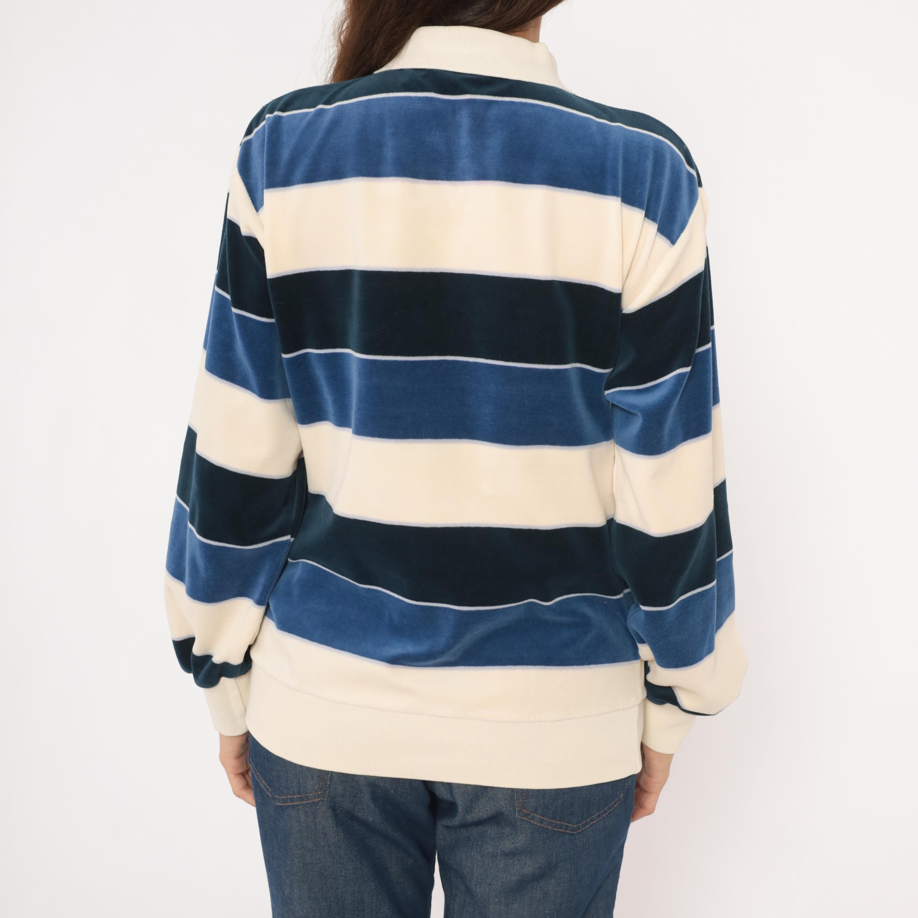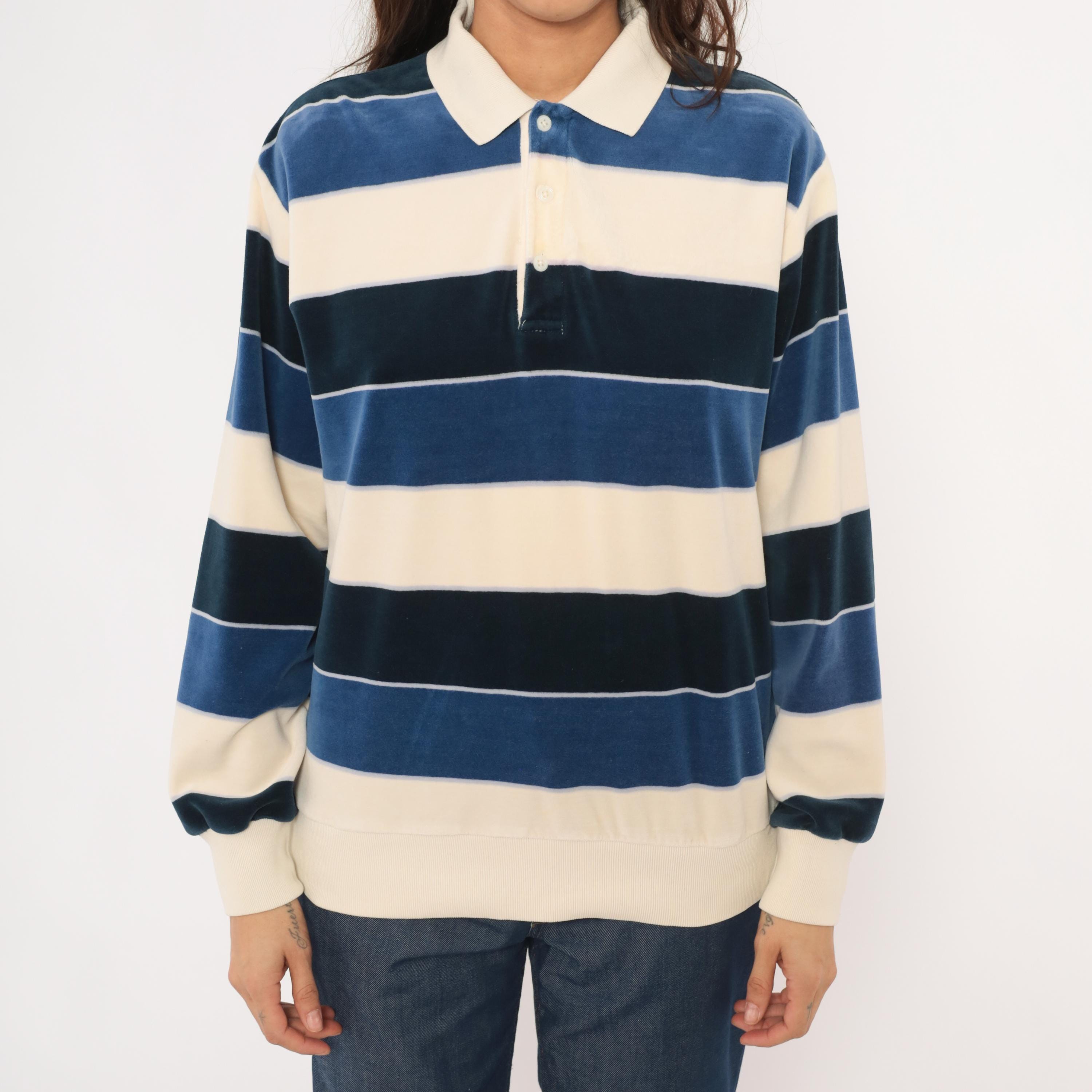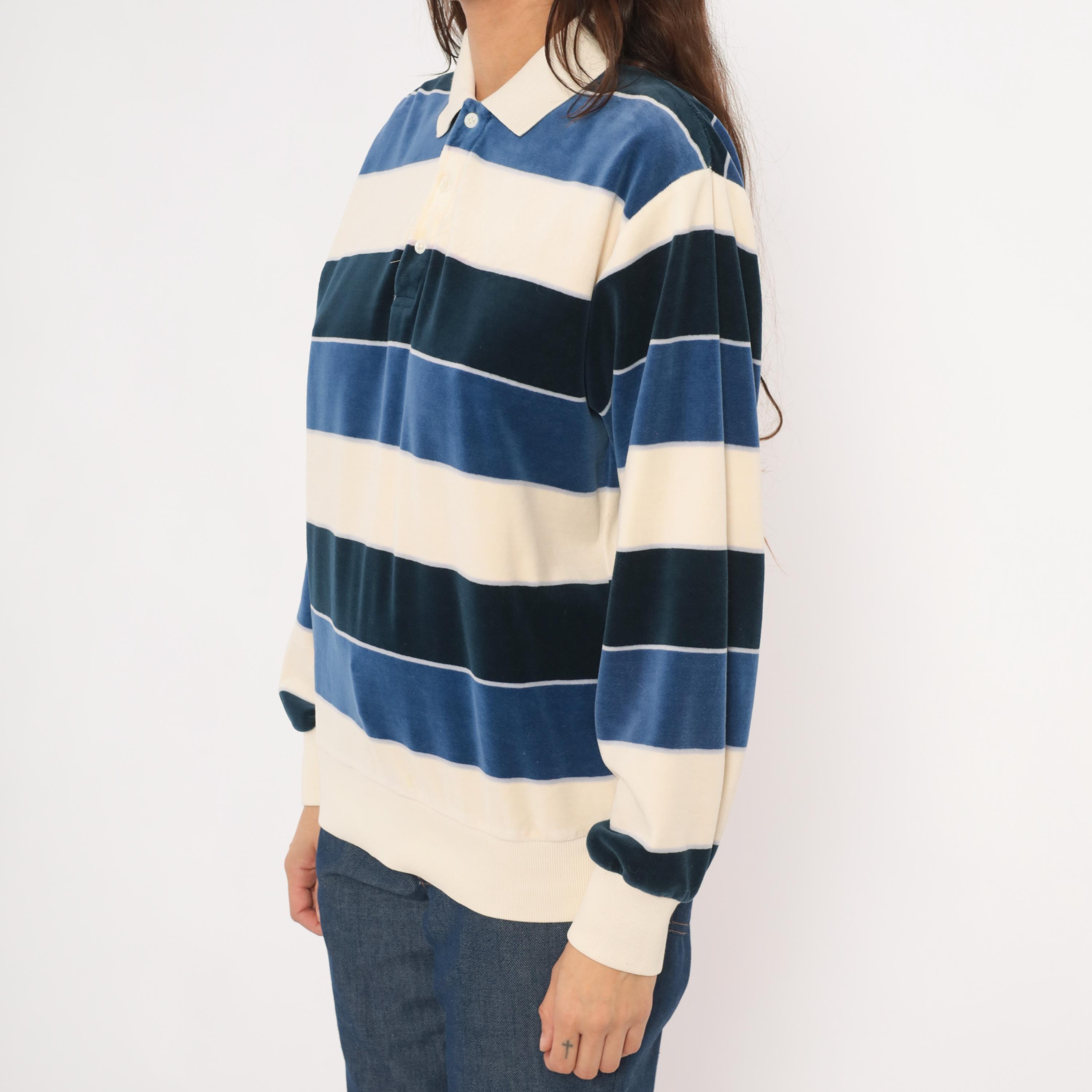 80s striped rugby polo from Damon in cream, navy, and slate blue horizontal stripes with a contrasting white ribbed collar. Two-button placket, long sleeves with ribbed cuffs, and a ribbed waistband hem. Velour fabric with a soft napped surface throughout, and a small tonal logo patch on the left chest.