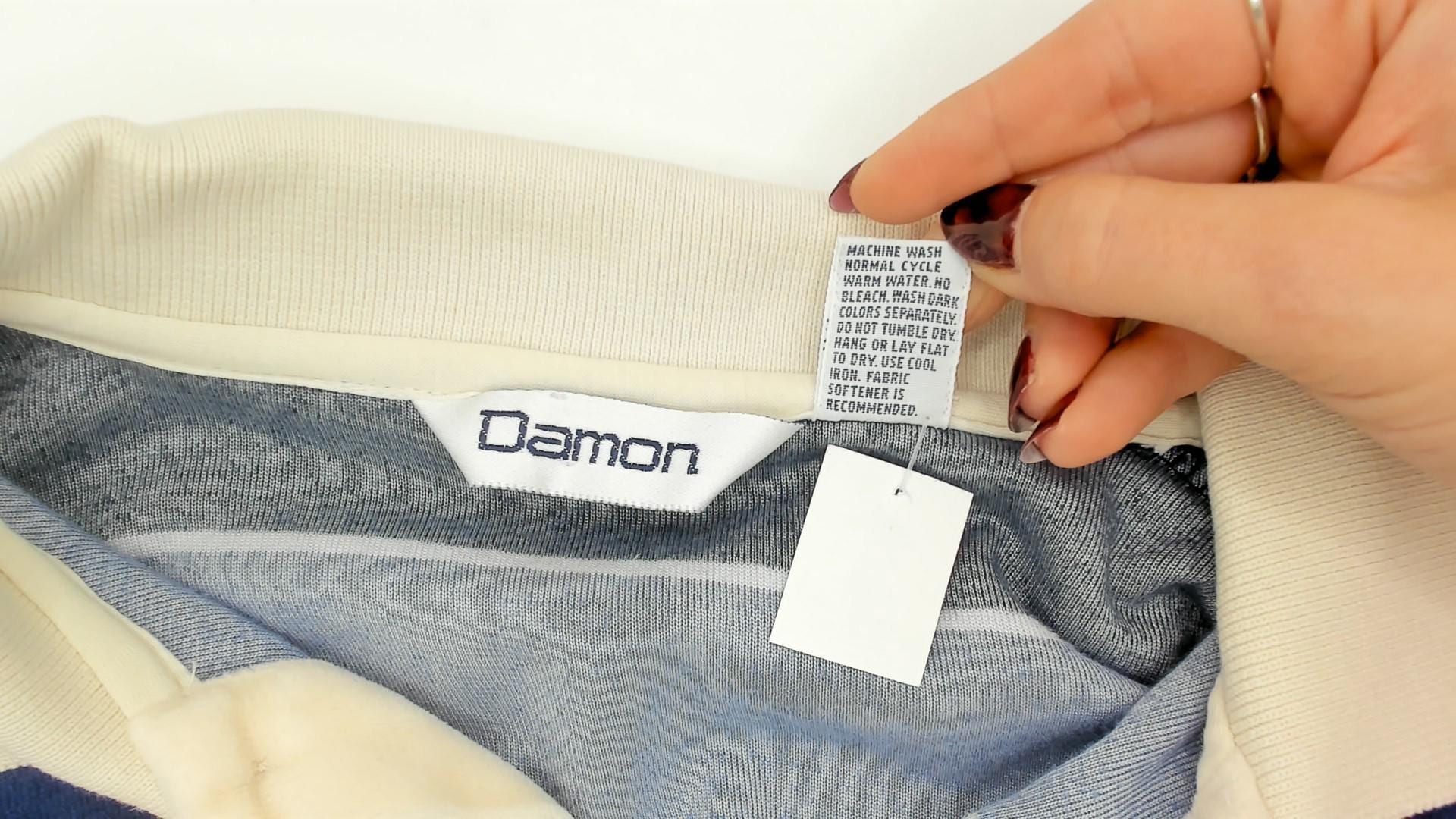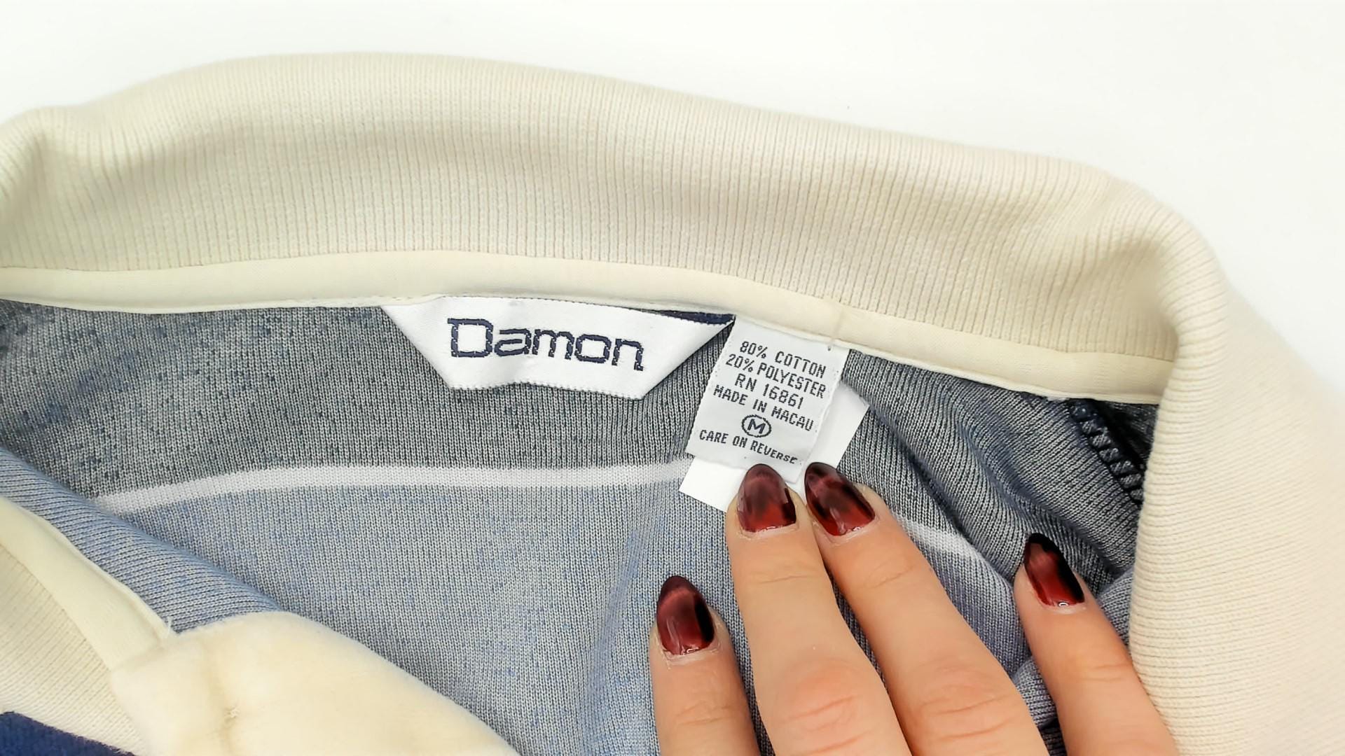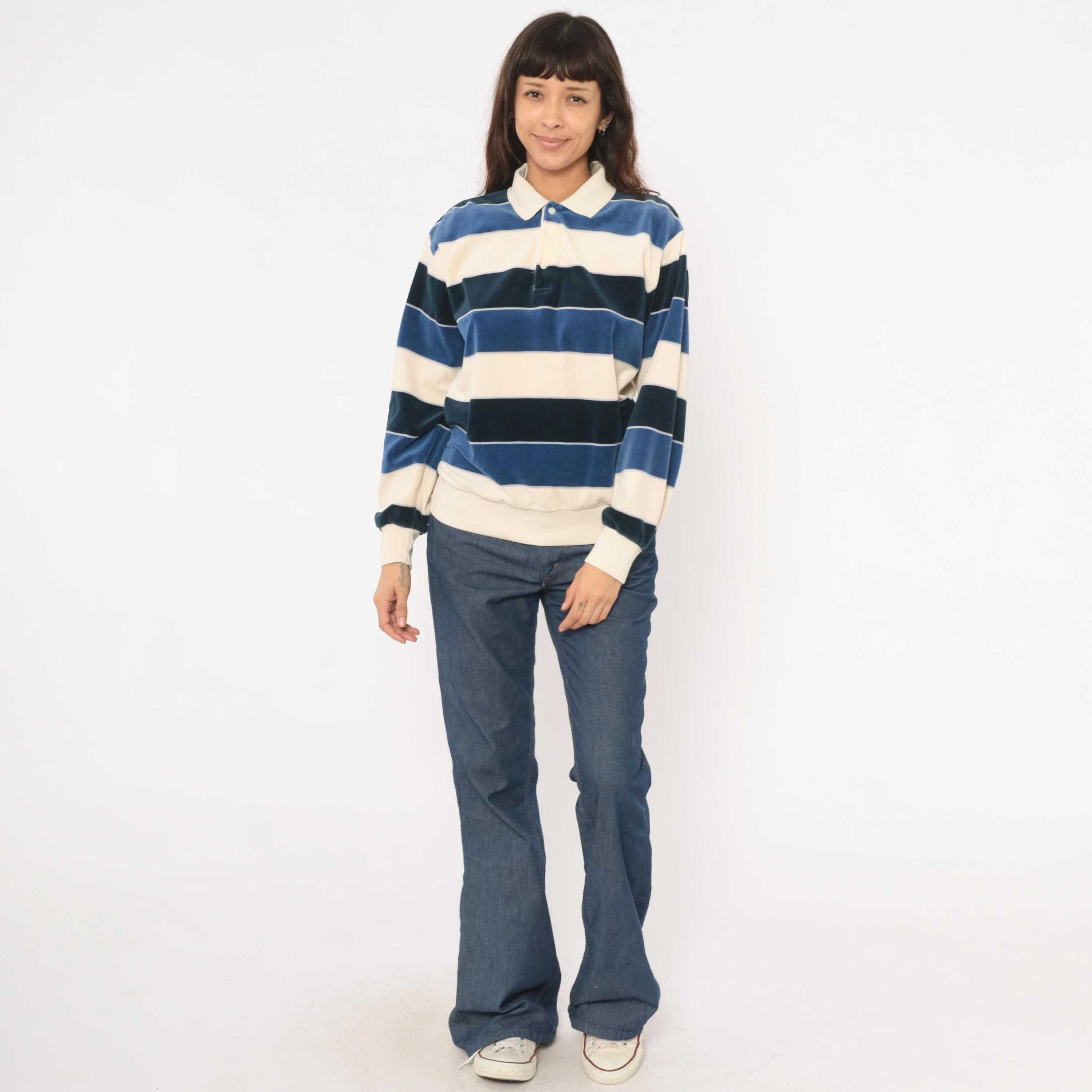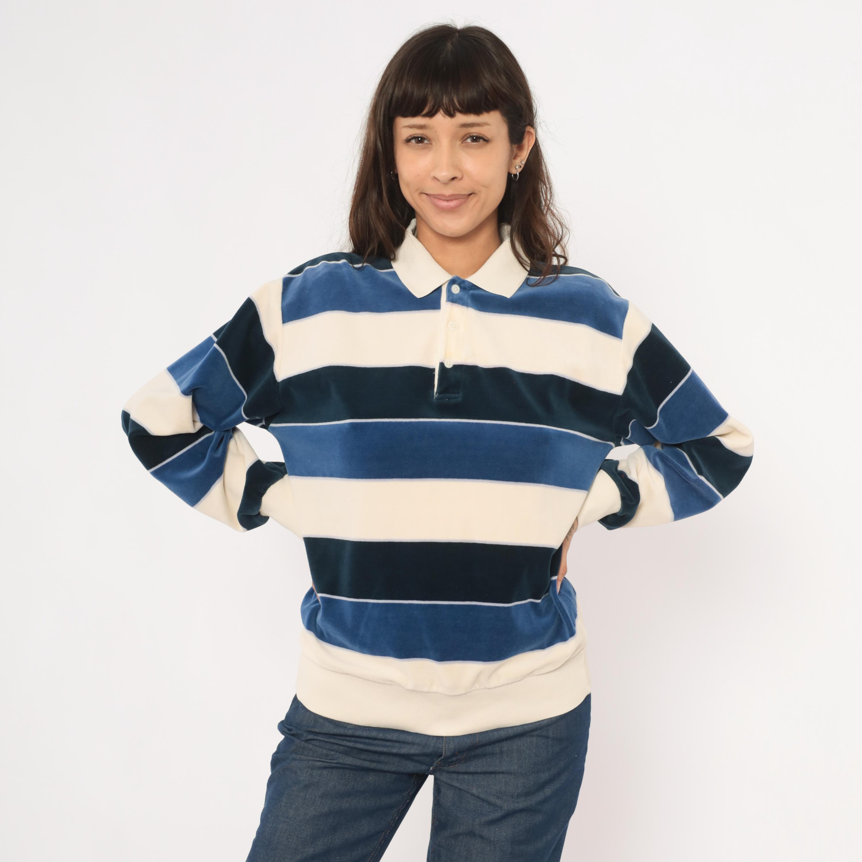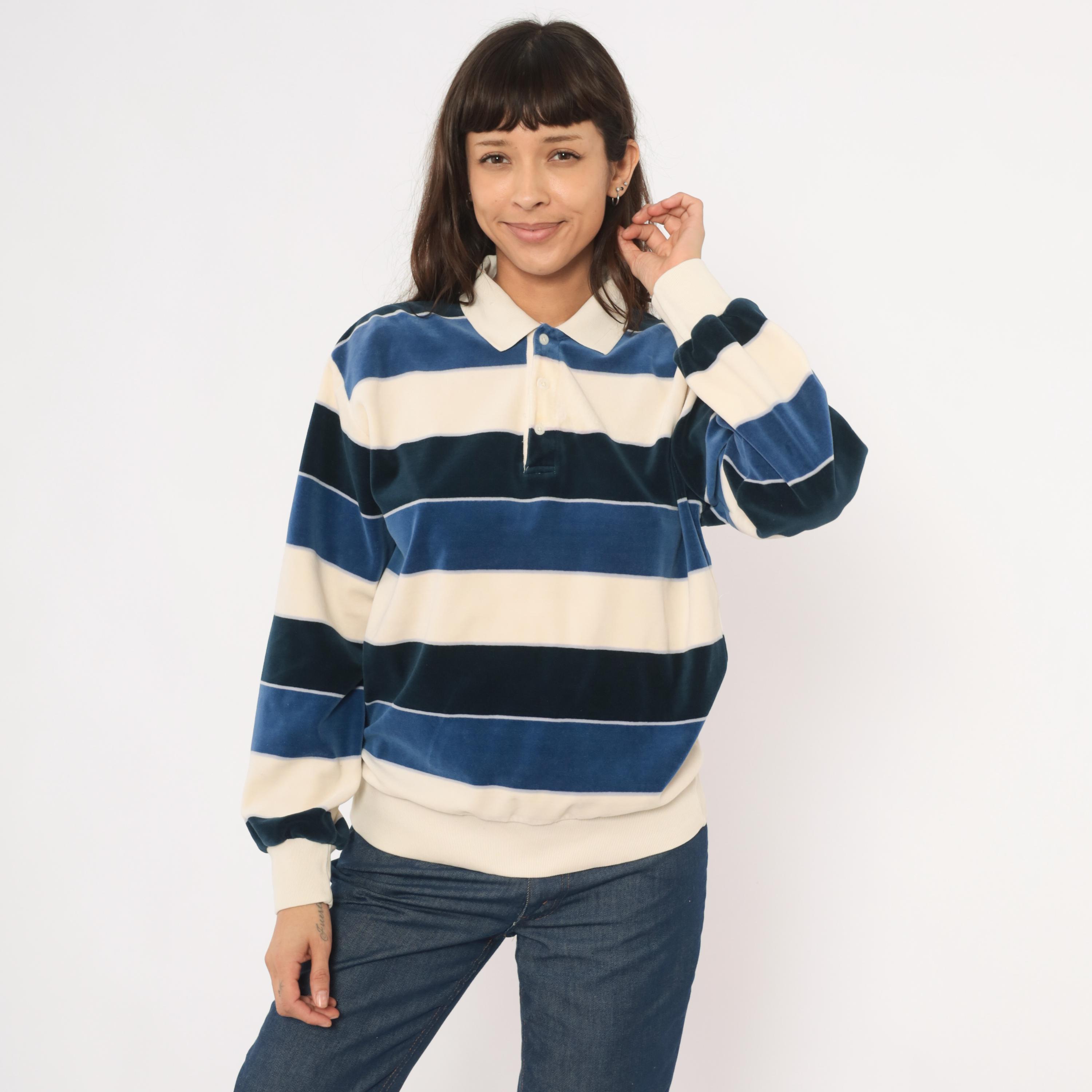 80s striped rugby polo from Damon in cream, navy, and slate blue horizontal stripes with a contrasting white ribbed collar. Two-button placket, long sleeves with ribbed cuffs, and a ribbed waistband hem. Velour fabric with a soft napped surface throughout, and a small tonal logo patch on the left chest.