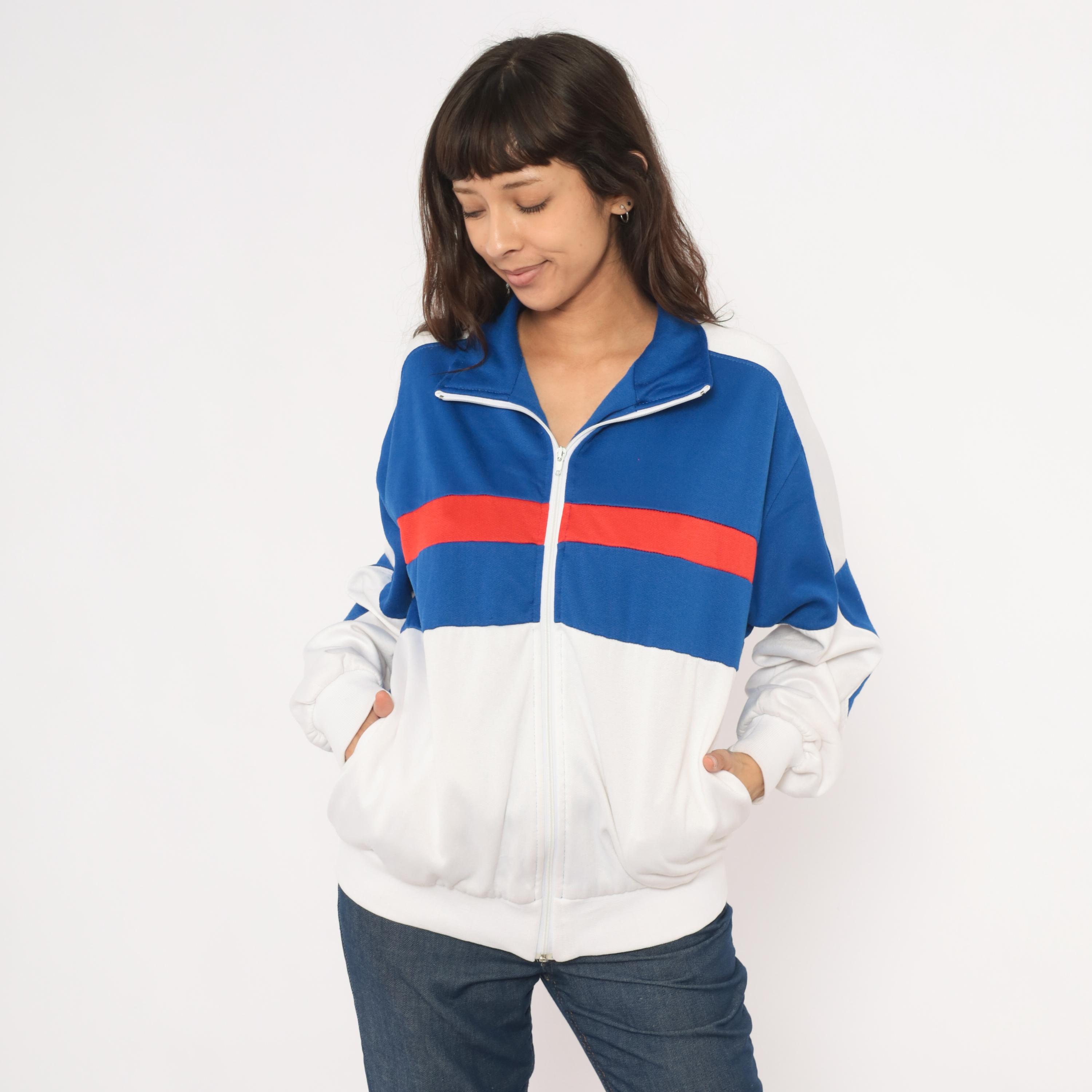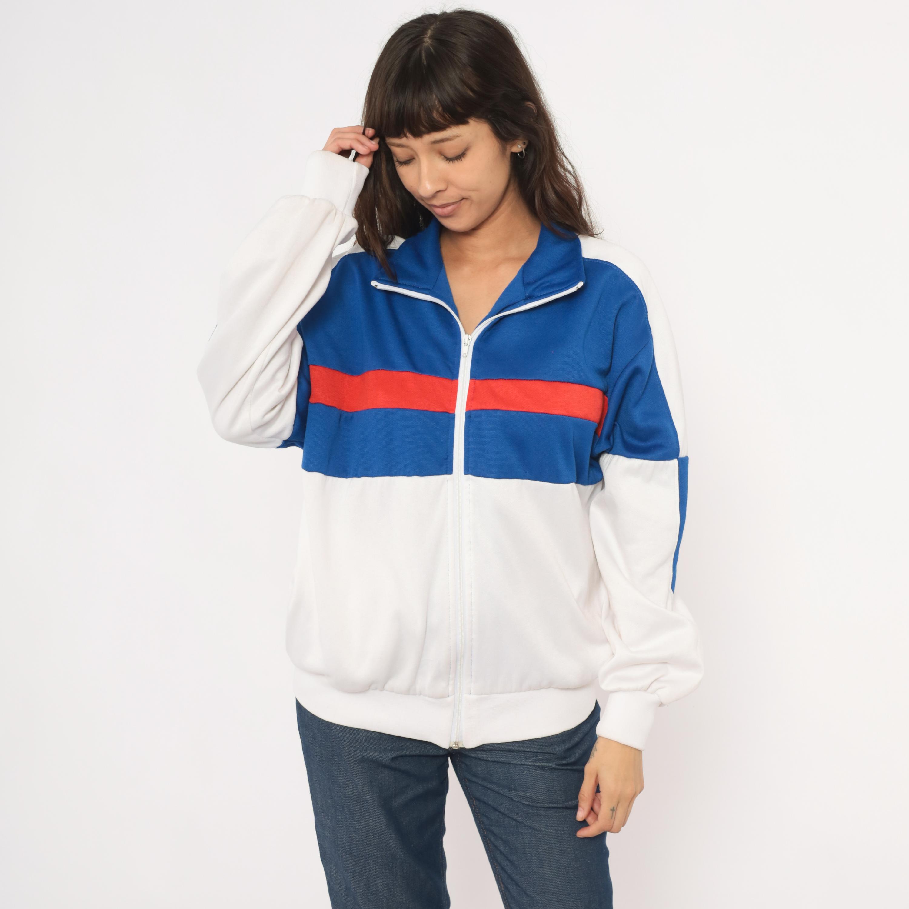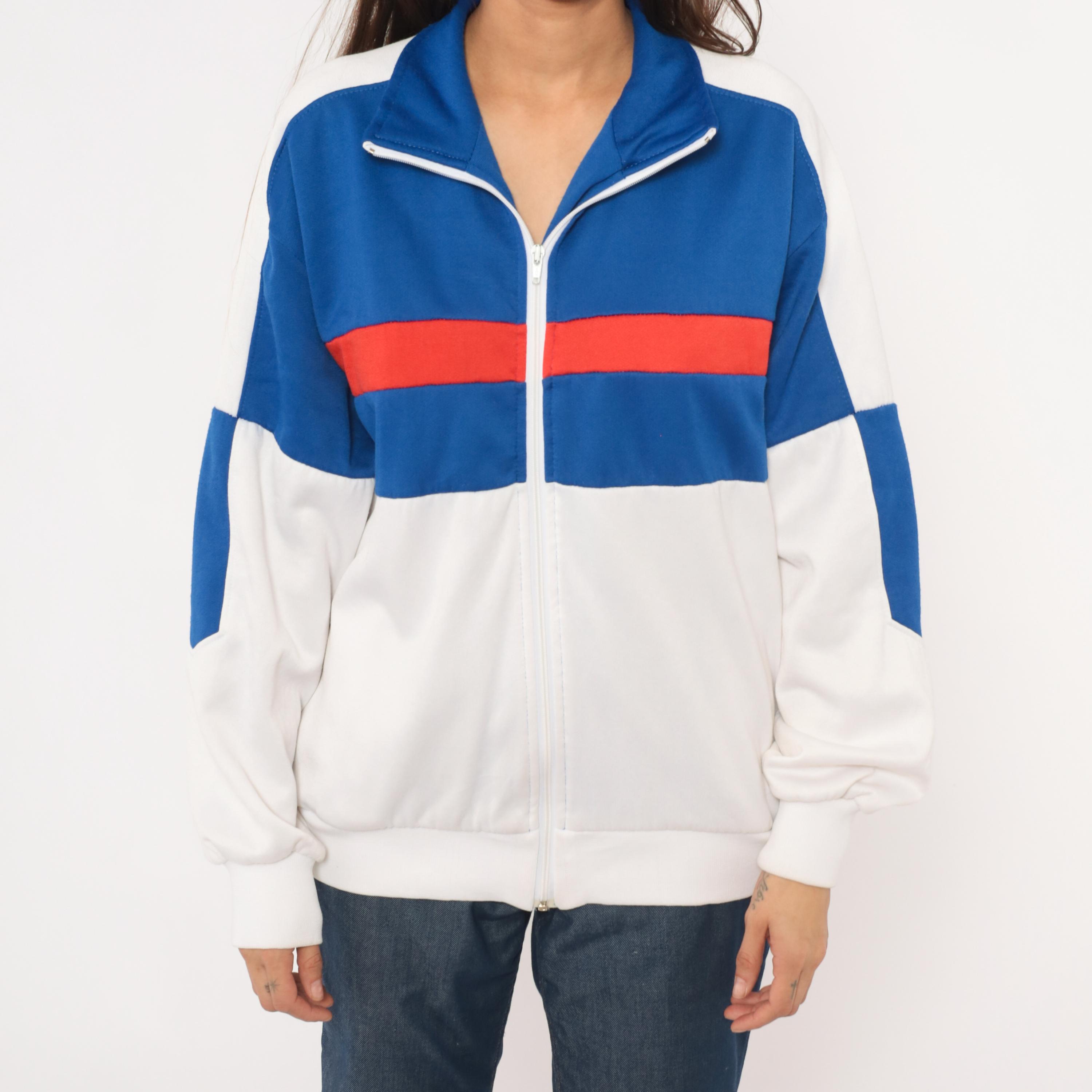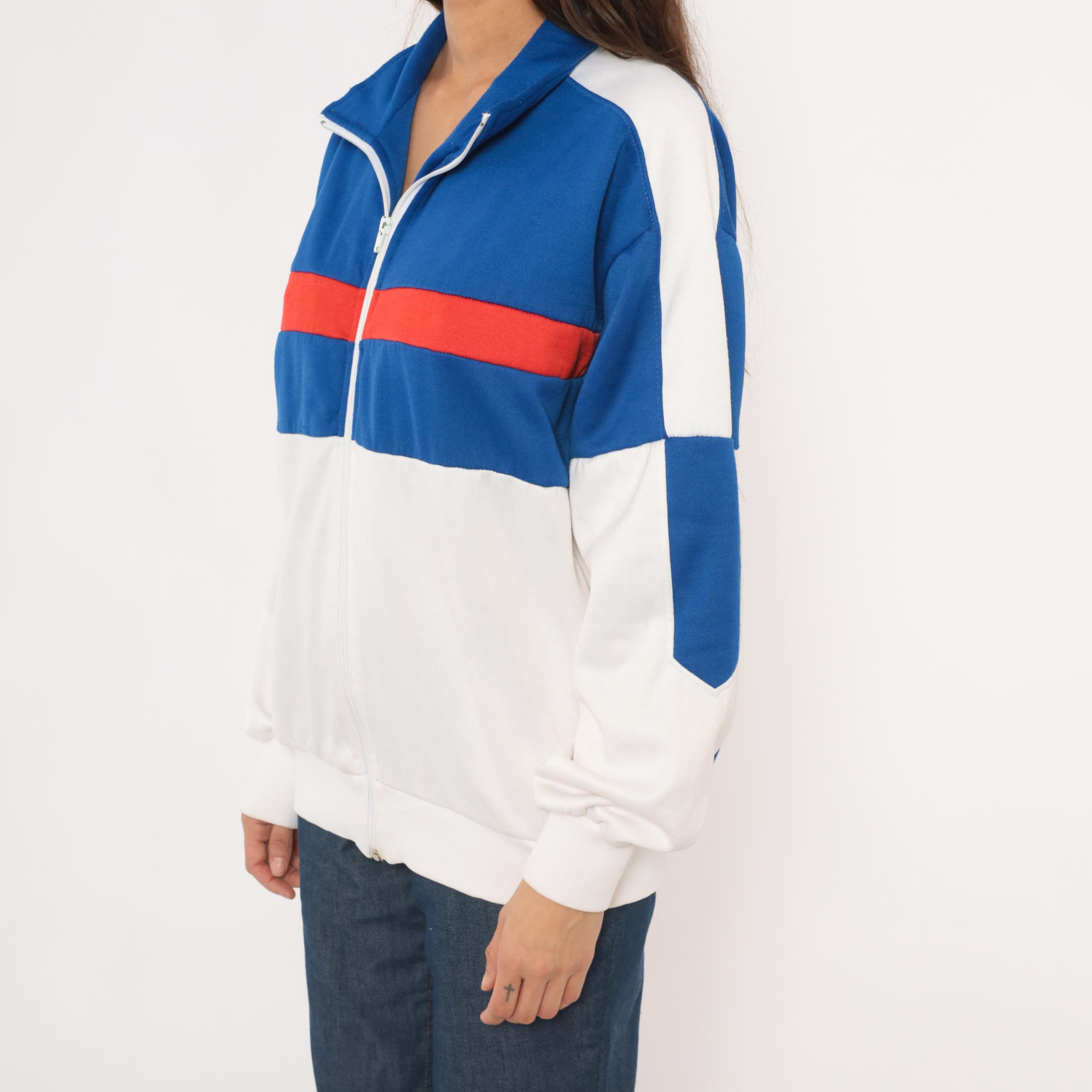 80s color block track jacket from Pro Spirit with a royal blue upper chest, red horizontal stripe, and white lower half. Full front zipper closure with a fold-over collar and side seam pockets. White panels run along the shoulders and sleeves with blue diamond-shaped insets at the elbows. Elastic gathering at the back hem and ribbed cuffs at the wrists.