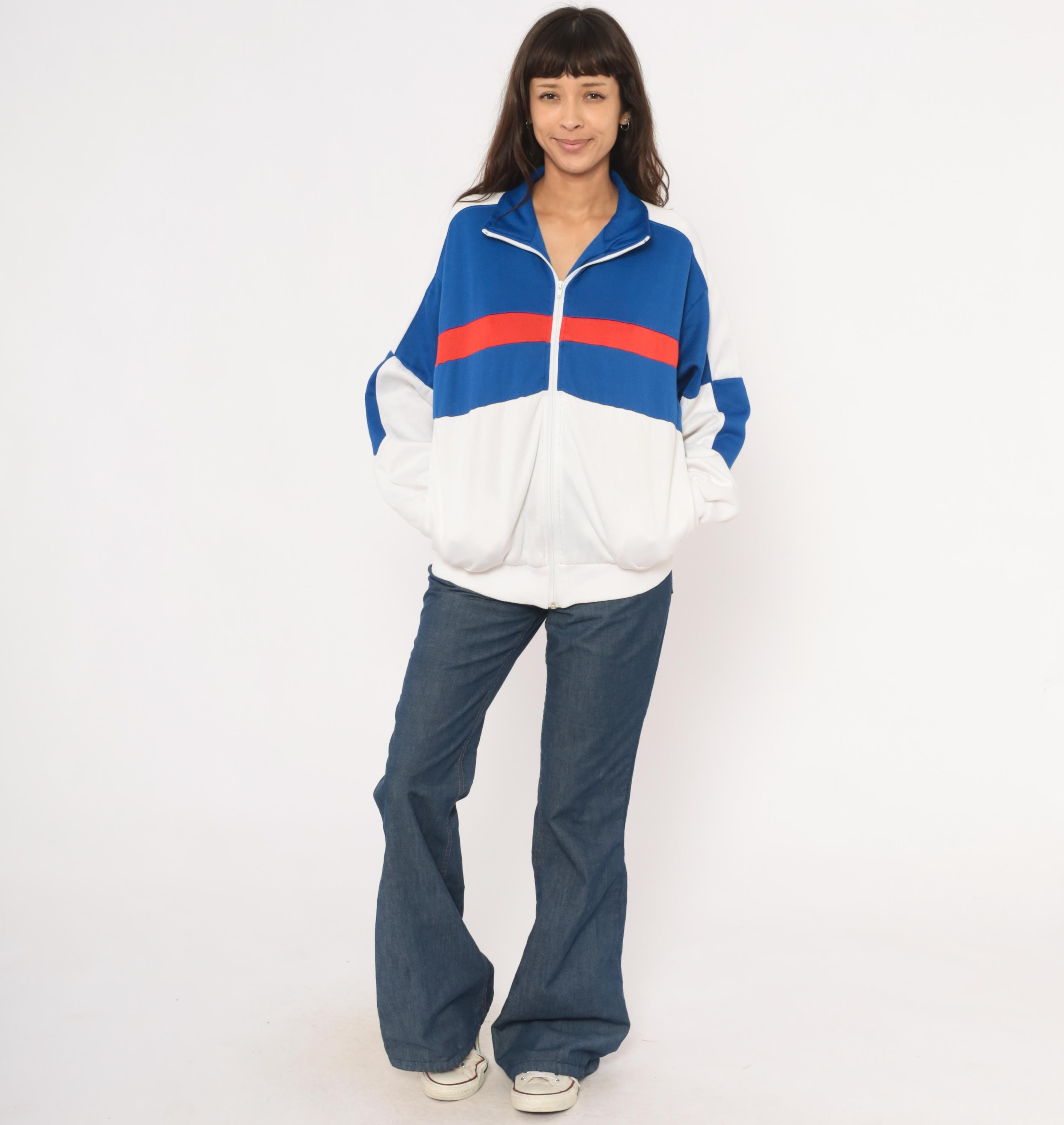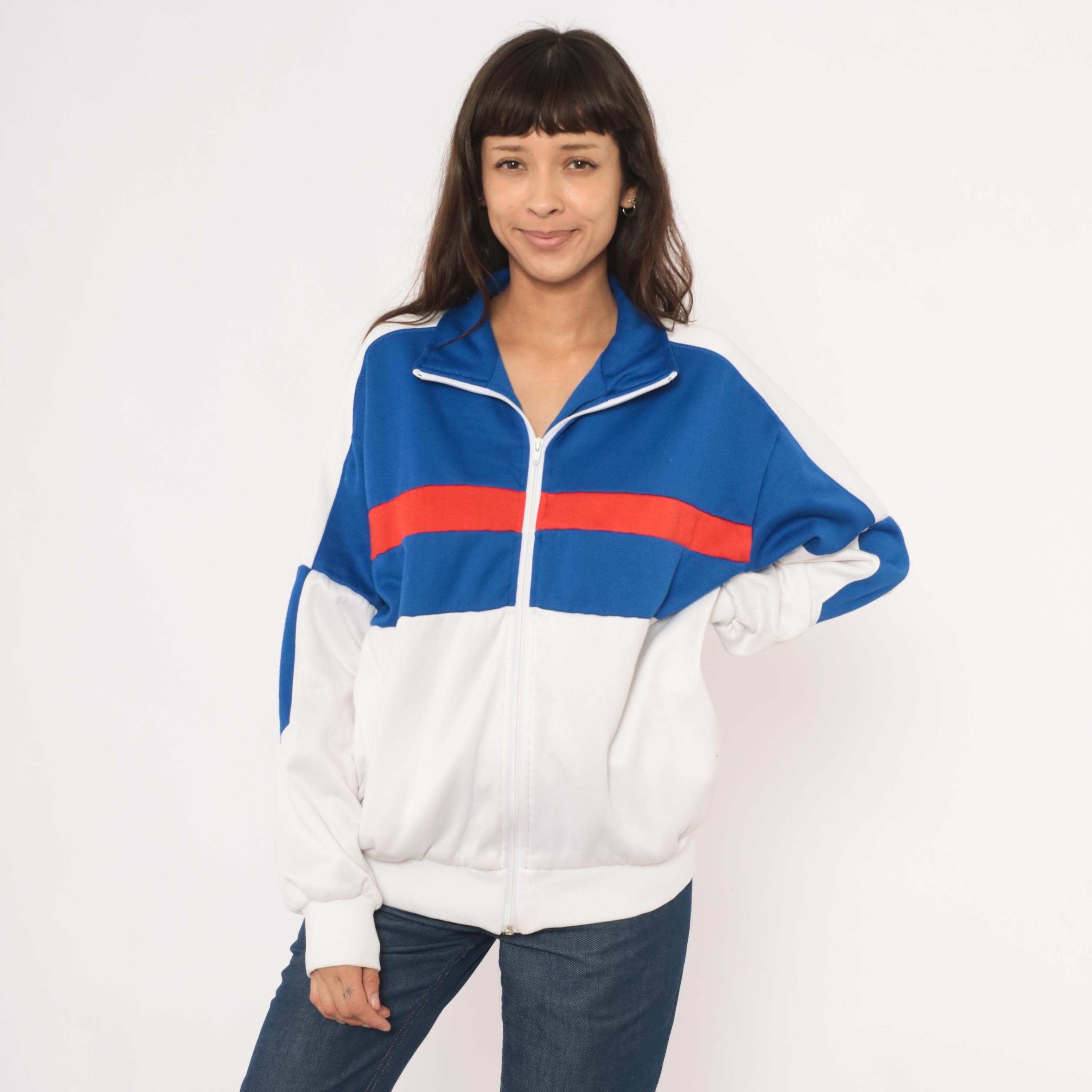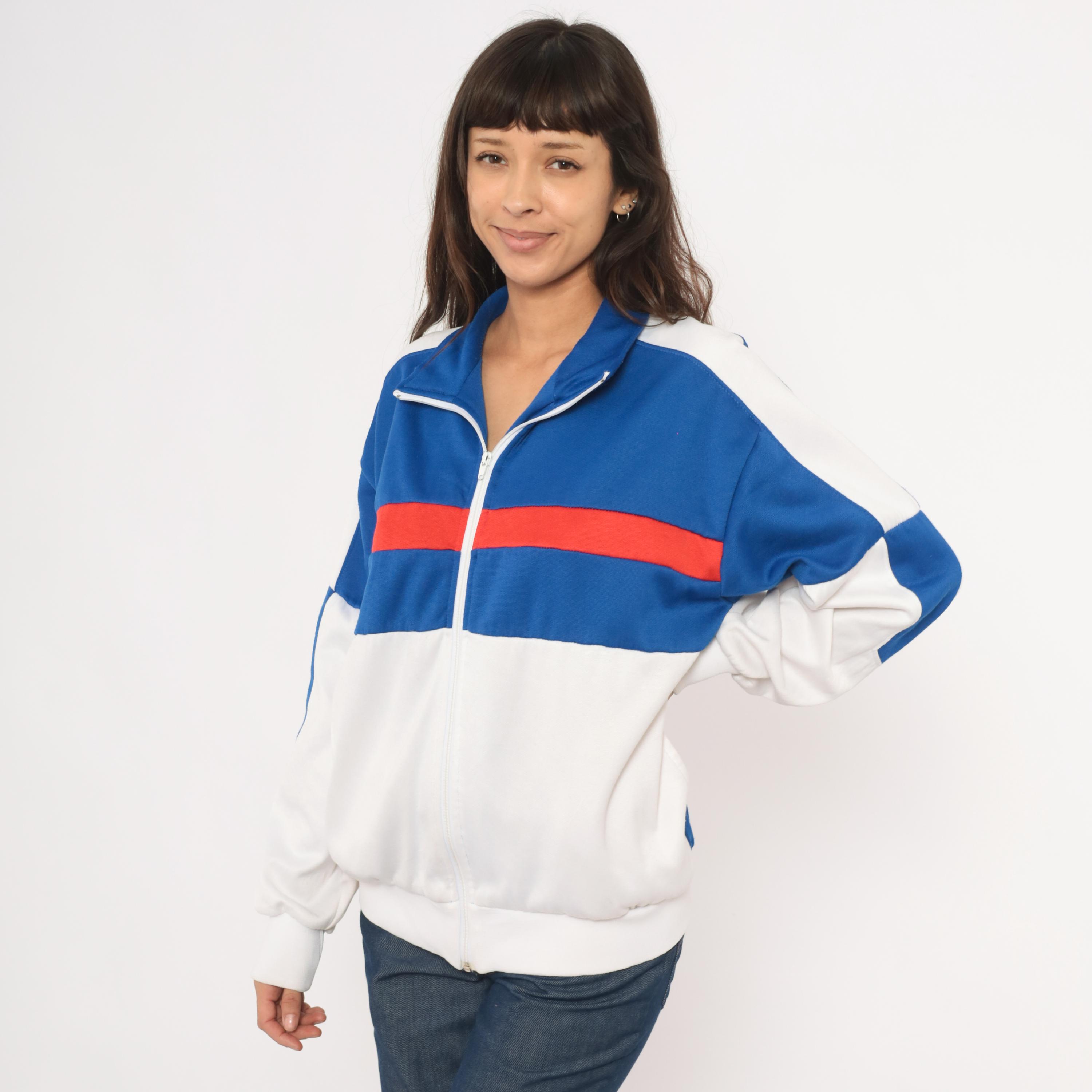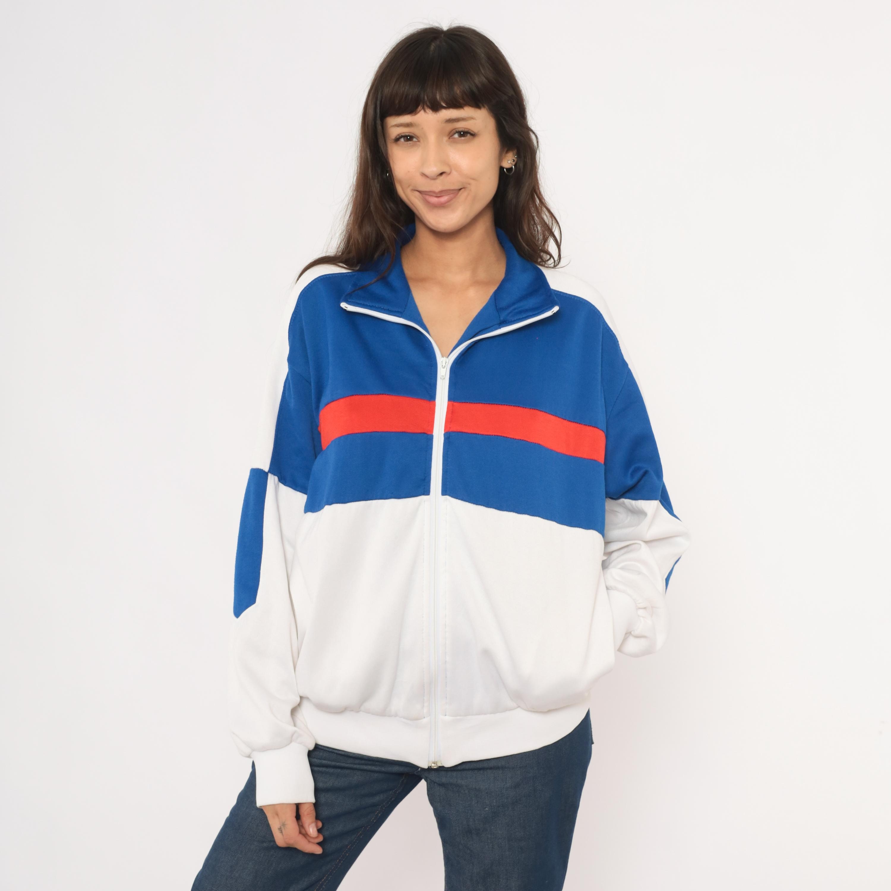 80s color block track jacket from Pro Spirit with a royal blue upper chest, red horizontal stripe, and white lower half. Full front zipper closure with a fold-over collar and side seam pockets. White panels run along the shoulders and sleeves with blue diamond-shaped insets at the elbows. Elastic gathering at the back hem and ribbed cuffs at the wrists.