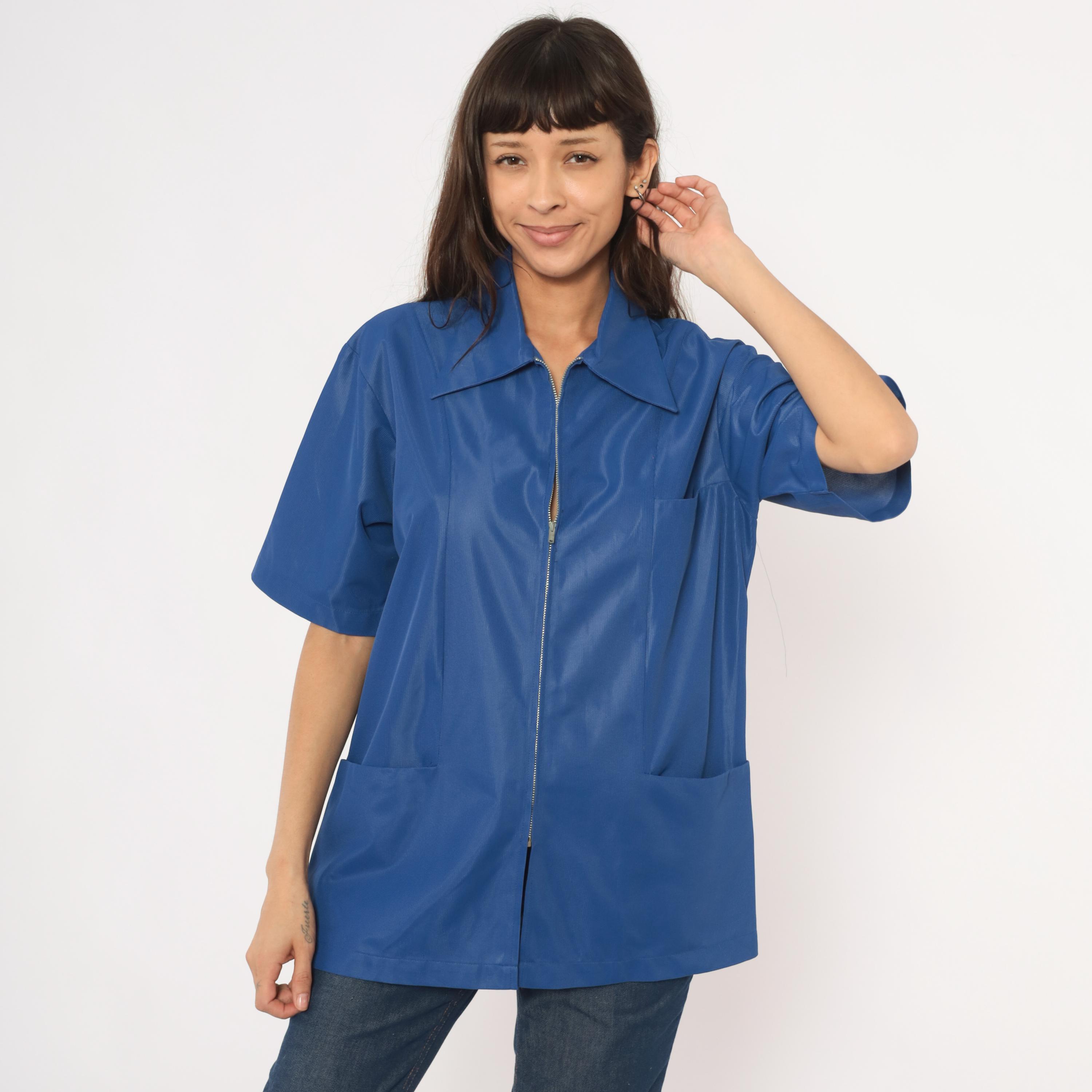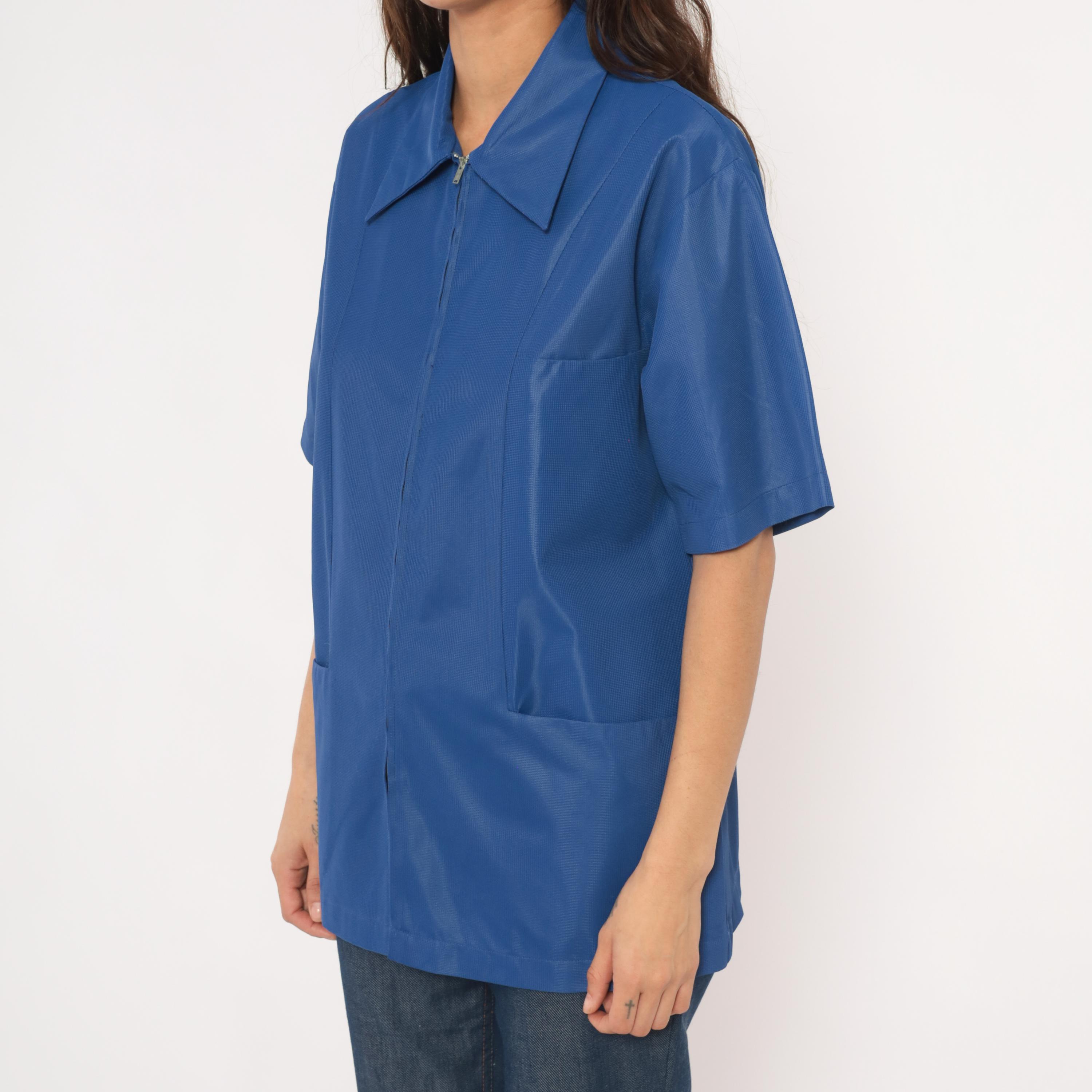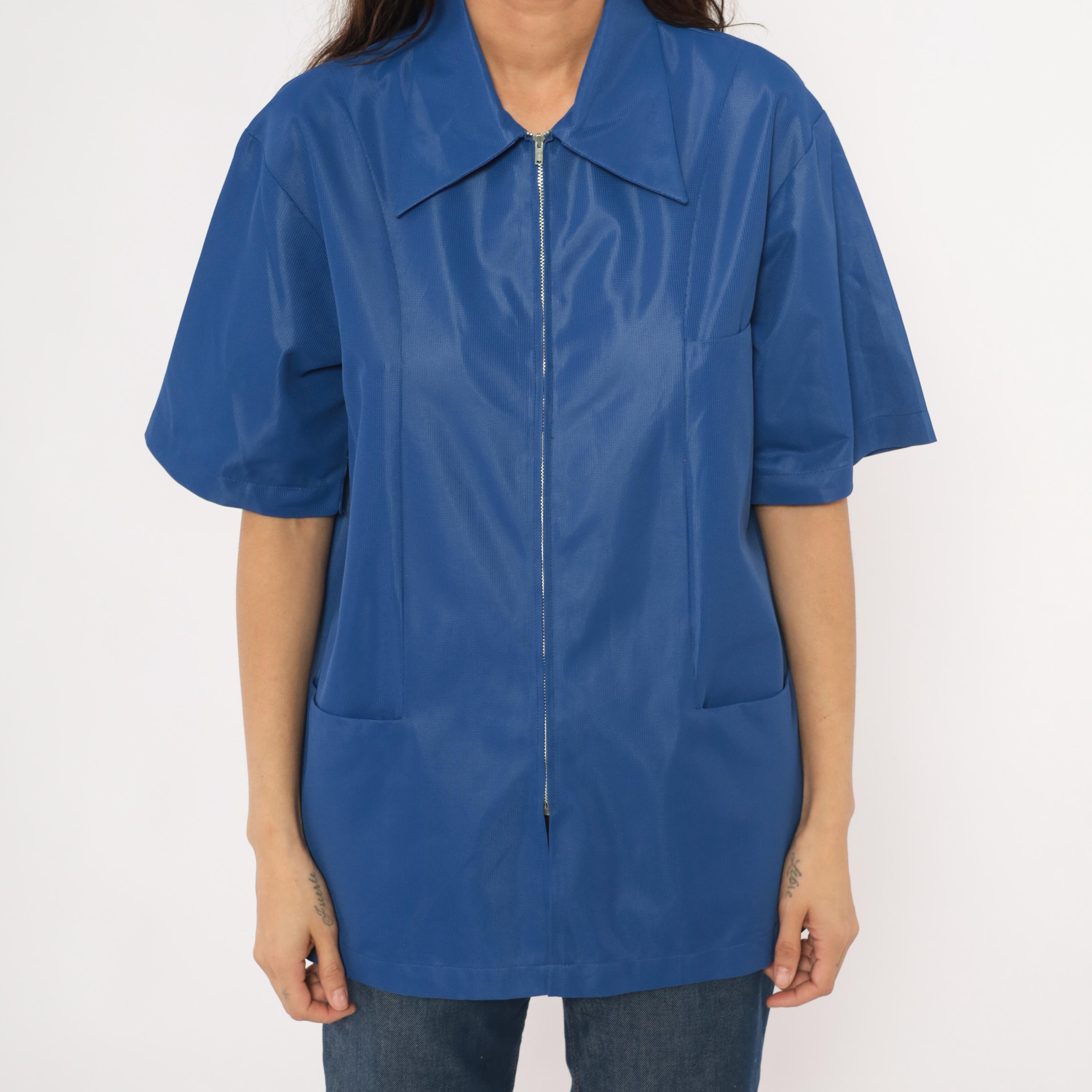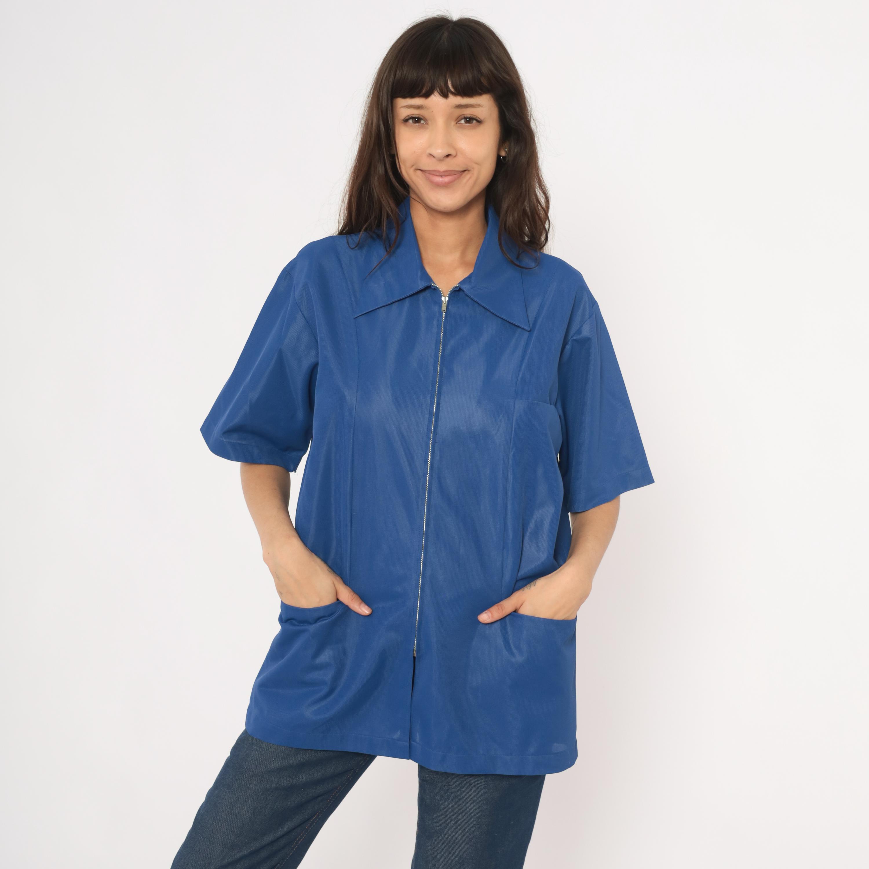70s cobalt blue zip-front jacket from Sears Professional Apparel with a pointed spread collar and short sleeves. Full-length silver-tone front zipper closure with two lower front patch pockets. Relaxed, boxy silhouette with a tunic-length hem and back yoke seam.